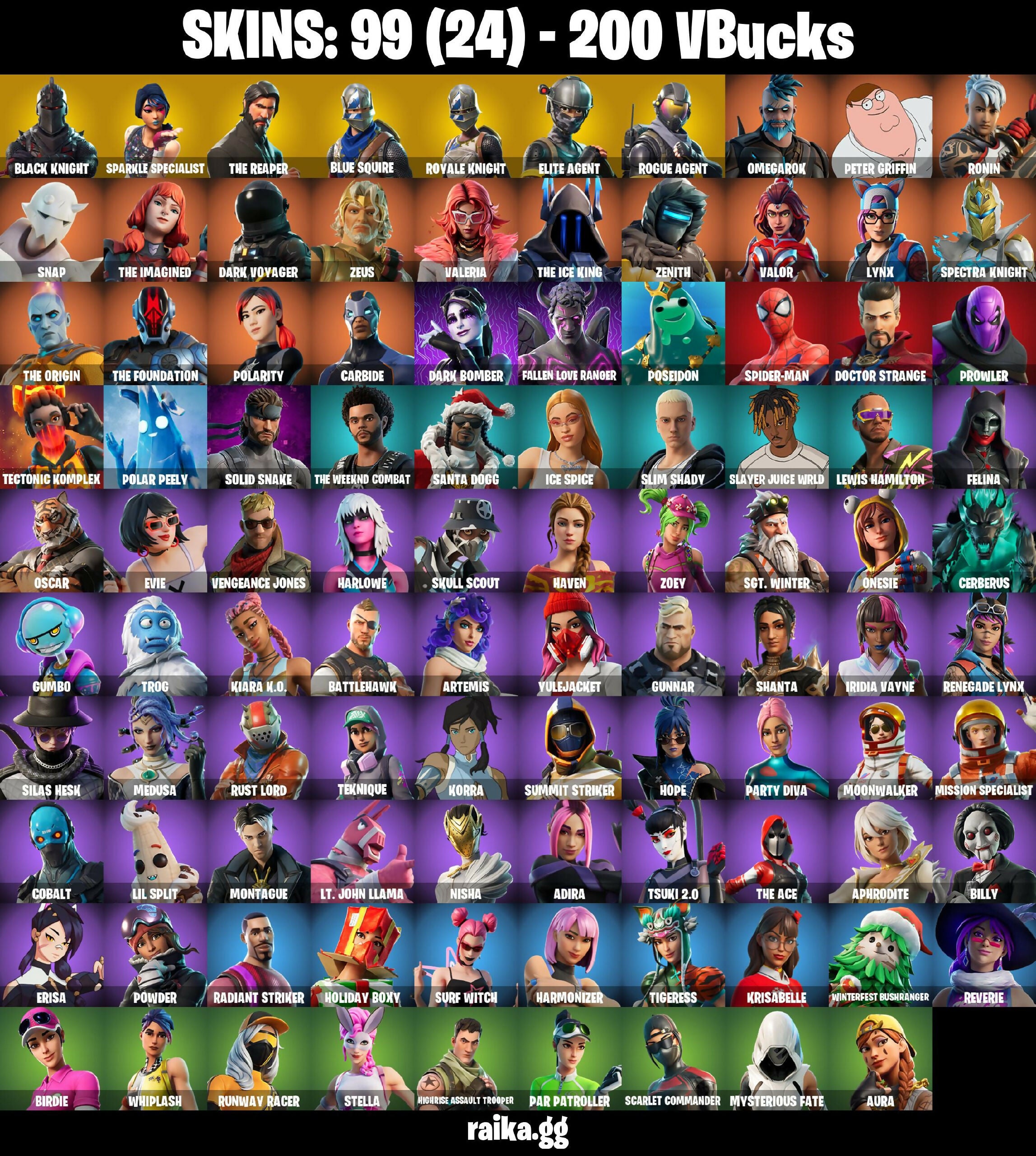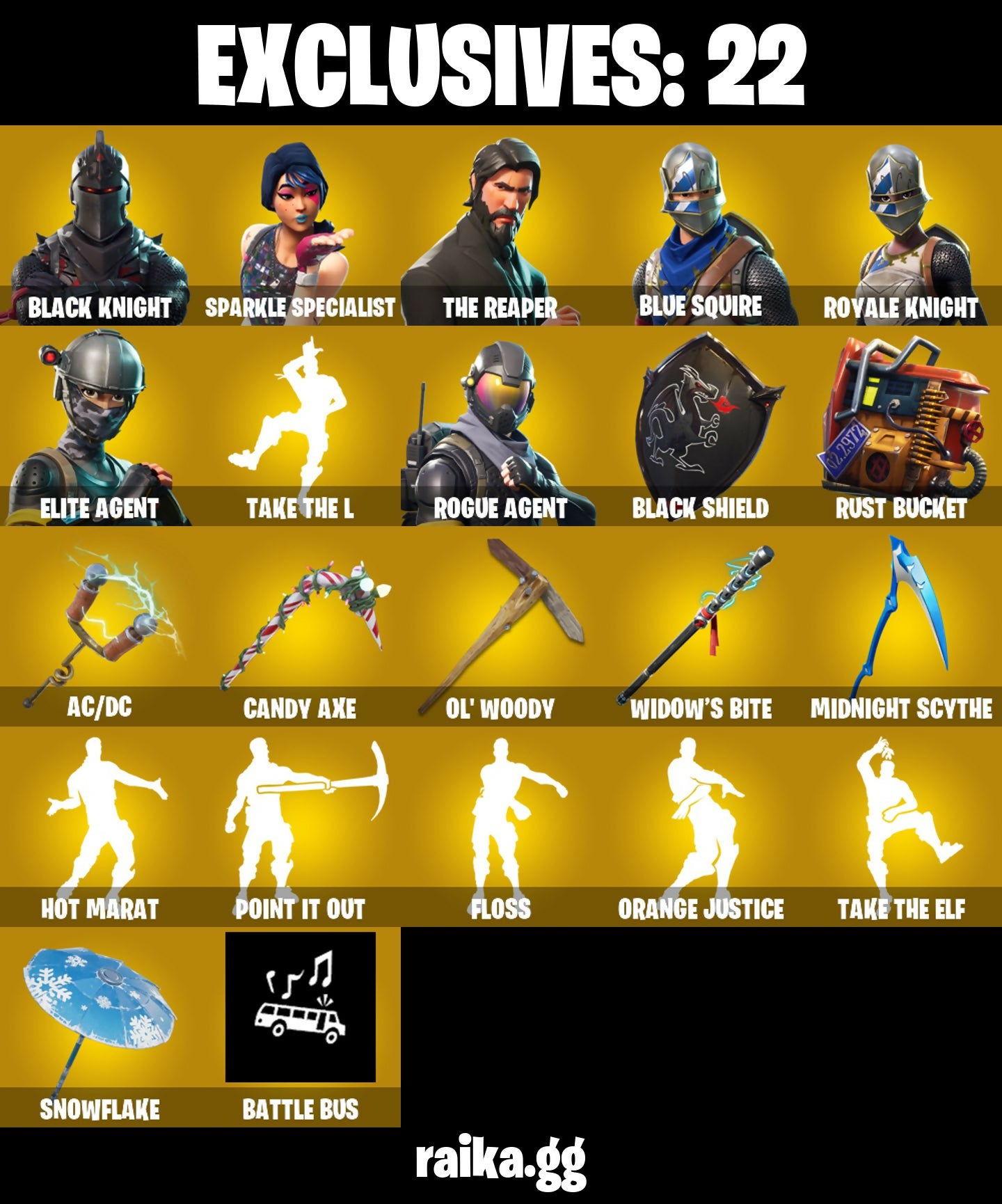 99 skins ✅ Black Knight ✅ Sparkle Specialist ✅ The Reaper ✅ Blue Squire ✅ Royale Knight ✅ Elite Agent ✅ Take The L ✅ Rogue Agent ✅ Black Shield ✅ 200 VB