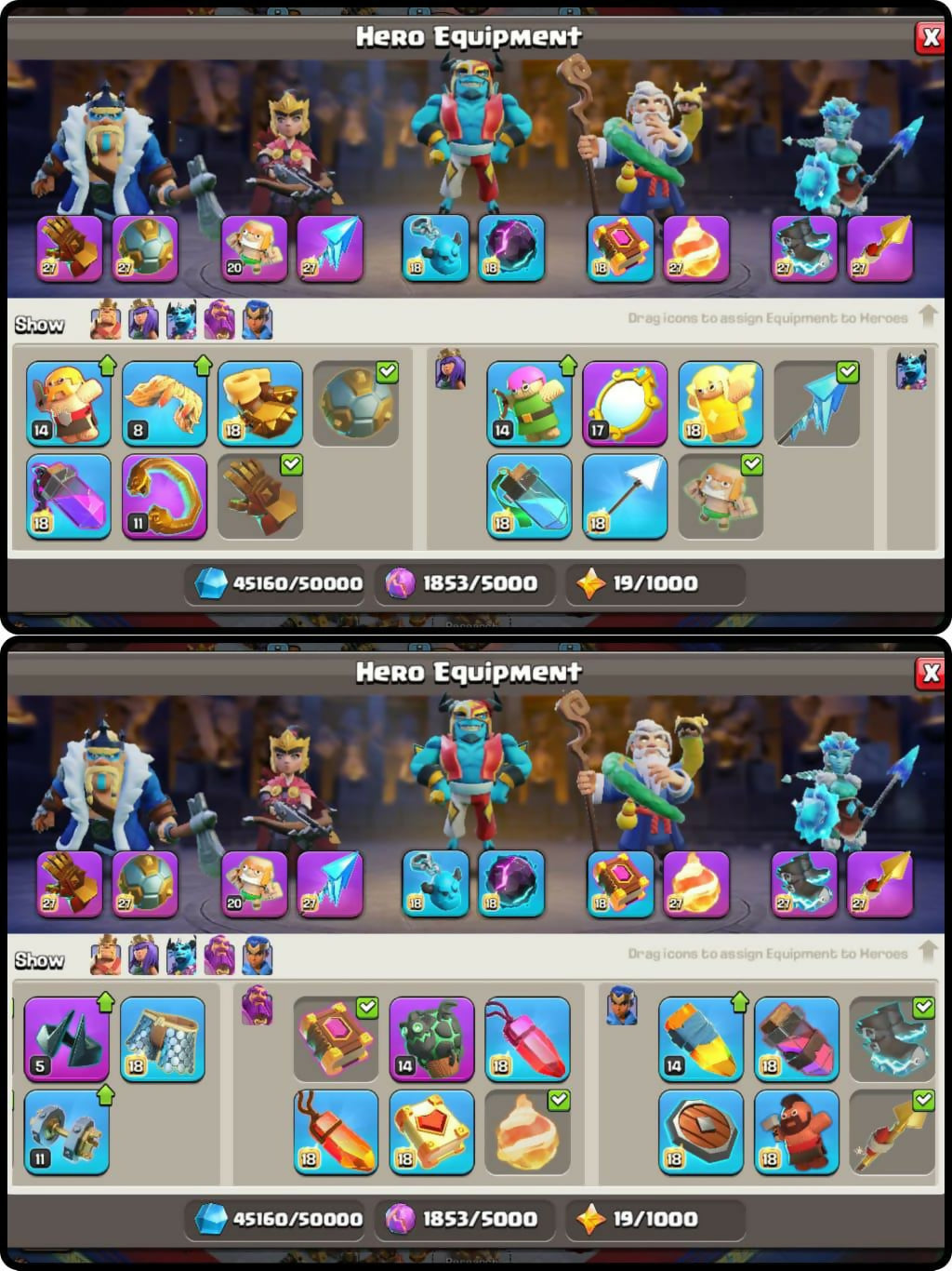 6 MAXED EPIC EQUIPMENTS || HIGH HEROES AND LAB TH17 MAX XP 256 || CLASHAMANIA SCENERY 16 SKINS, 11/11 EPICS // GAUNTLET 27, ARROW 27, FIREBALL 27, ROCKET SPEAR 27, SPIKY BALL 27, MAGIC MIRROR 17, LAVALOON PUPPET 14, ELECTRO BOOST 27, SNAKE BRACELET 11, ACTION FIGURE 20, DARK CROWN 5 //
