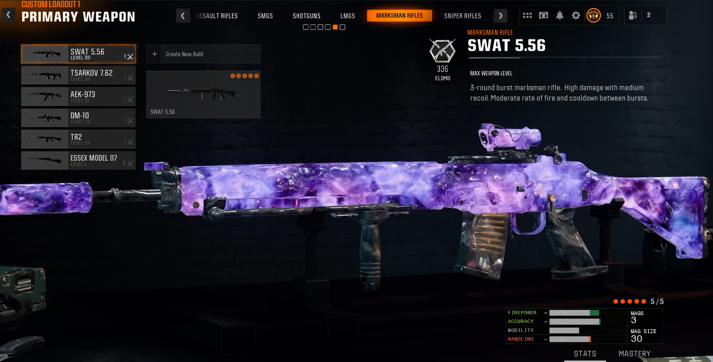 All ARs, SMGs, LMGs, 5 Marksman Rifles and 2 Shotguns