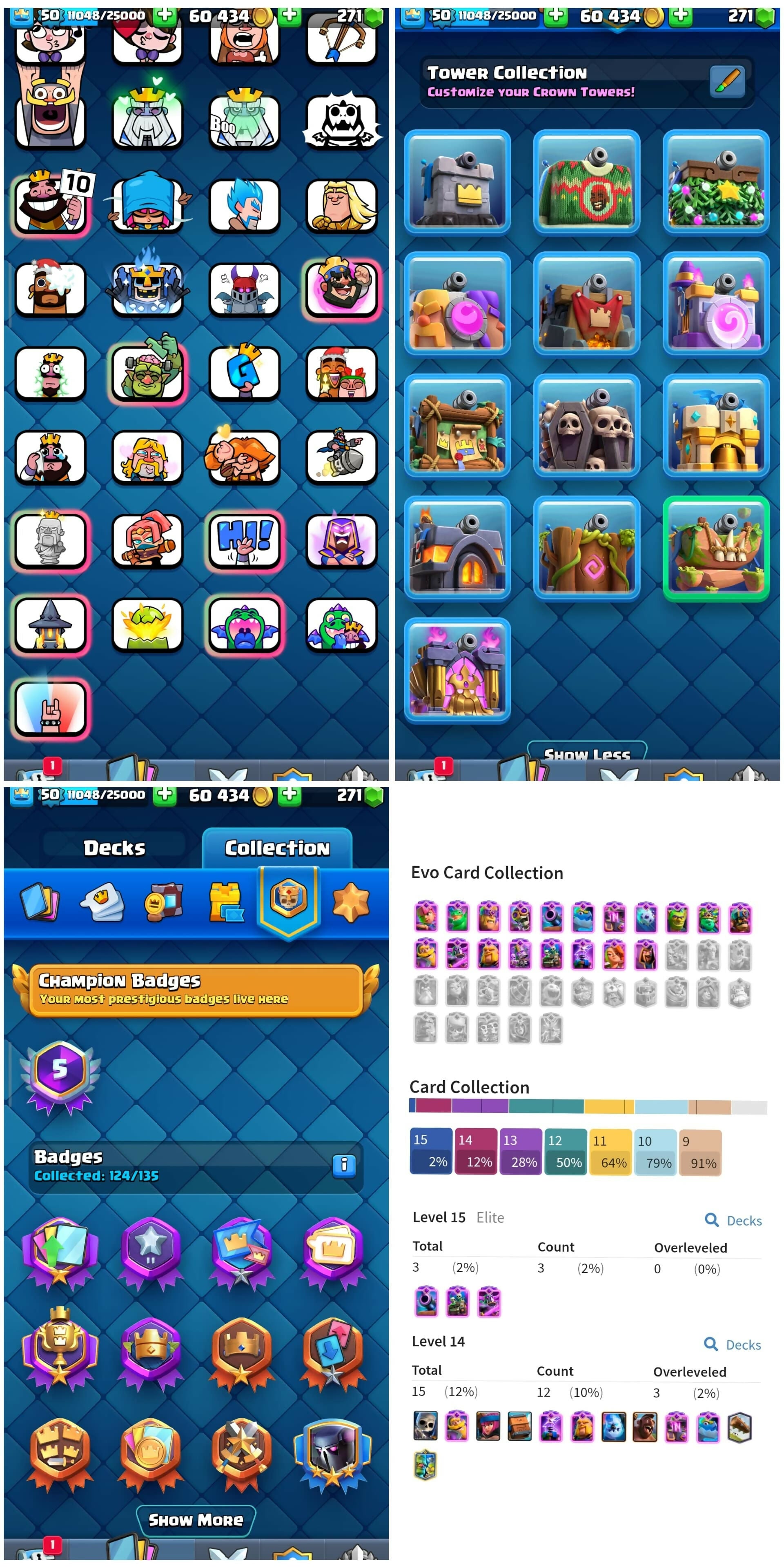 KT 14 | 9204 Trophy | 121 CARDS | 19 EVOLUTION CARDS | 15 MAX CARDS | 68 EMOTES | 13 TOWER SKINS | 60K GOLD | 50 LVL | INSTANT DELIVERY