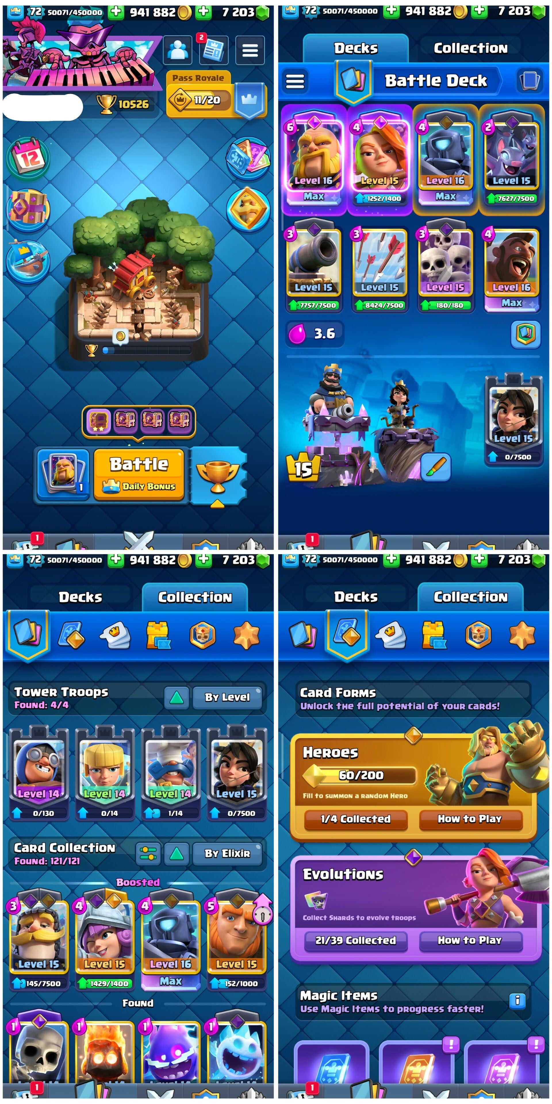 KT 15 | Level 72 | 121 Cards level 14 | 66 Elite Cards | 21 Evo Cards | 10000 Trophies | 138 Emotes | Arena 25 | Instant Delivery