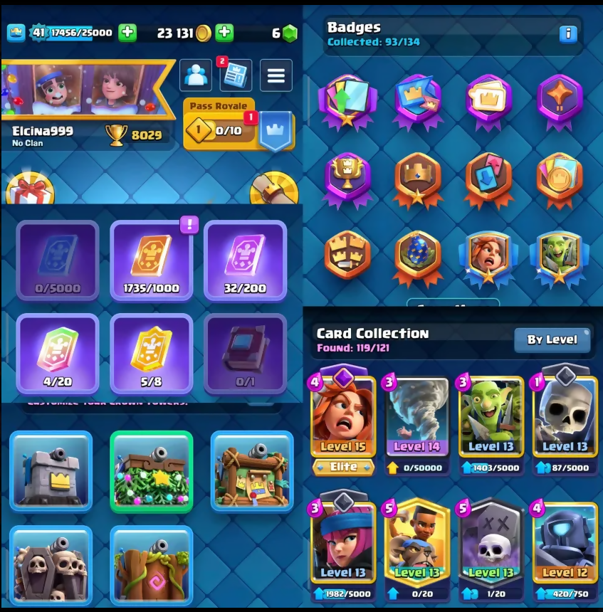 KT14 - Level 41- 8029 Trophy Arena 21 - 27 Emotes - Evolution 5 - 4 Skin Tower - [119/121 Card ] - FULL ACCESS