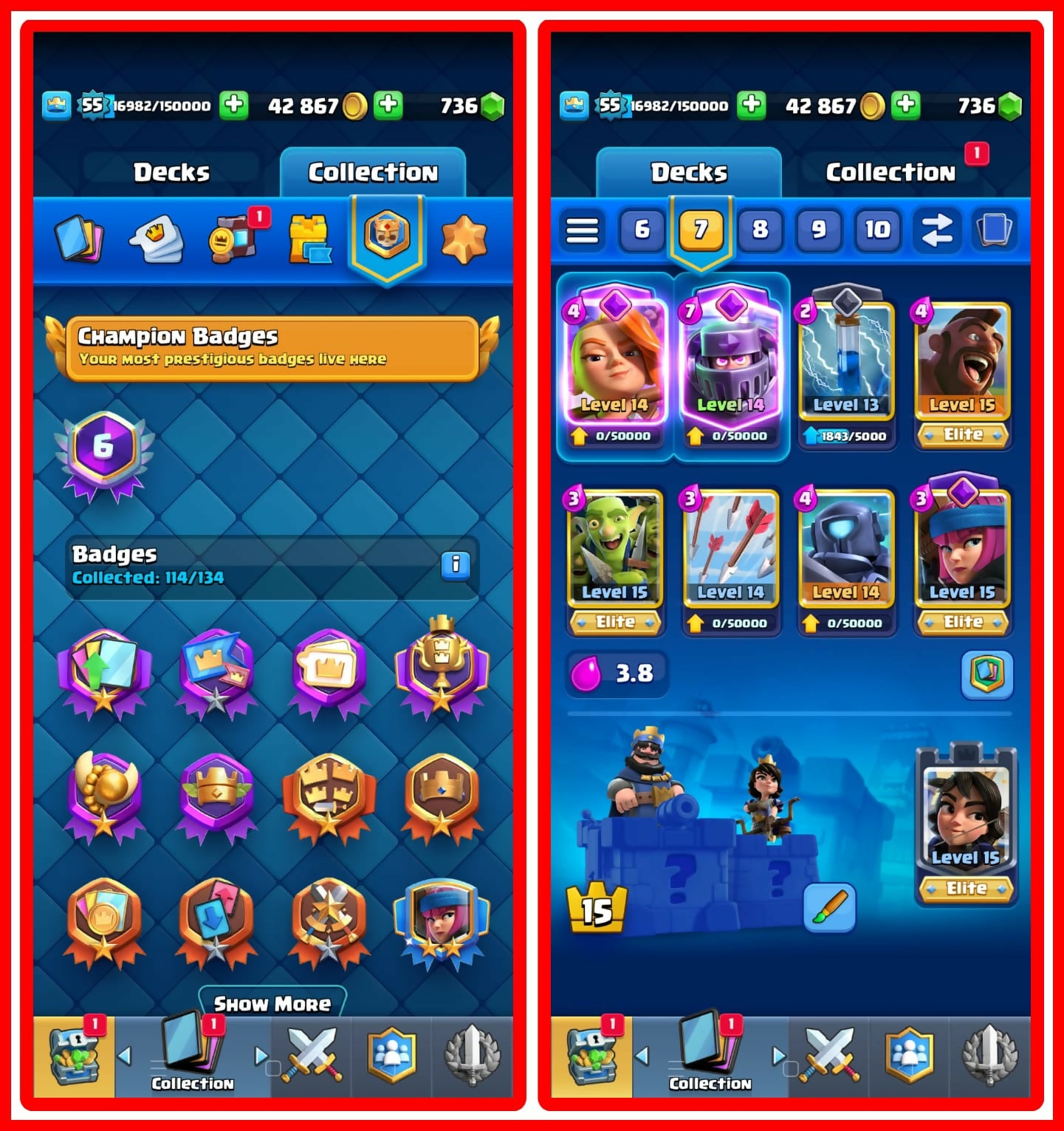 LEVEL 55 ?? 9504 TROPHIES ? ARENA LEVEL 24 ❤ KT LEVEL 15 ☠ 13 EVOLUTION CARDS ? 8 ELITE CARDS ? 35 MAX CARDS ☠? NAME CHANGE 500 GEMS ?☠ CHEAP PRICE ? INSTANT DELIVERY ☑? ANDROID & IOS ☑?