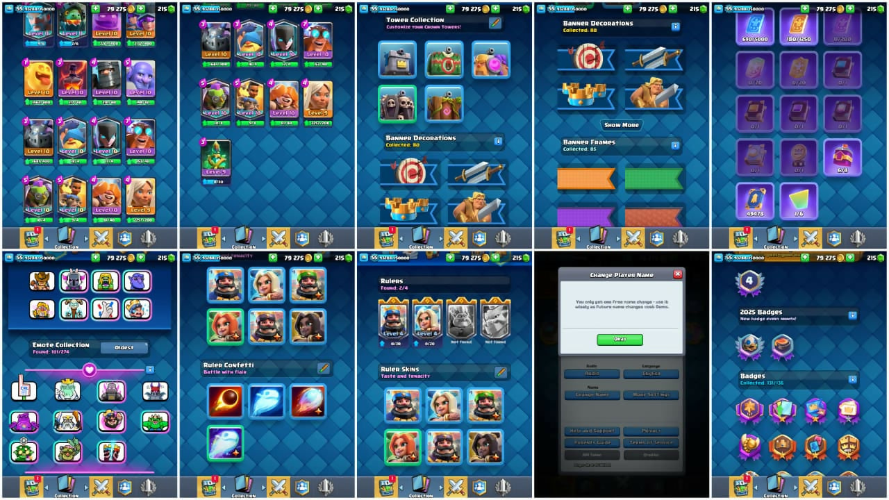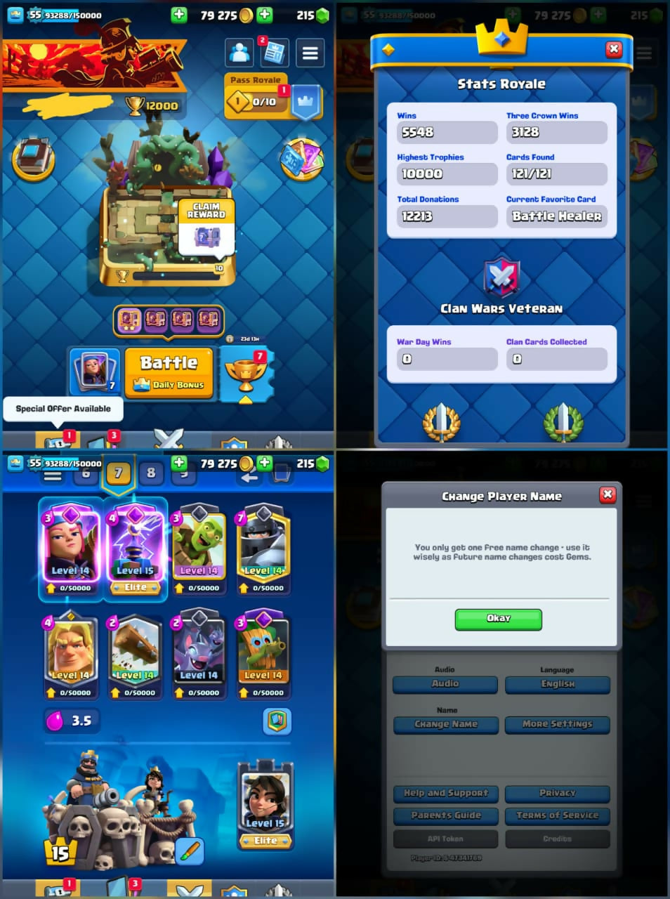 ? Level 55 + ? KT 15 | ? 130 Emotes | ? 12,000 Trophies | β 53 Max Cards {7 Elites} + β¨ 14 Evos | β Name Changable | ? 80 Banners + ? 85 Frames | β‘ Instant Delivery