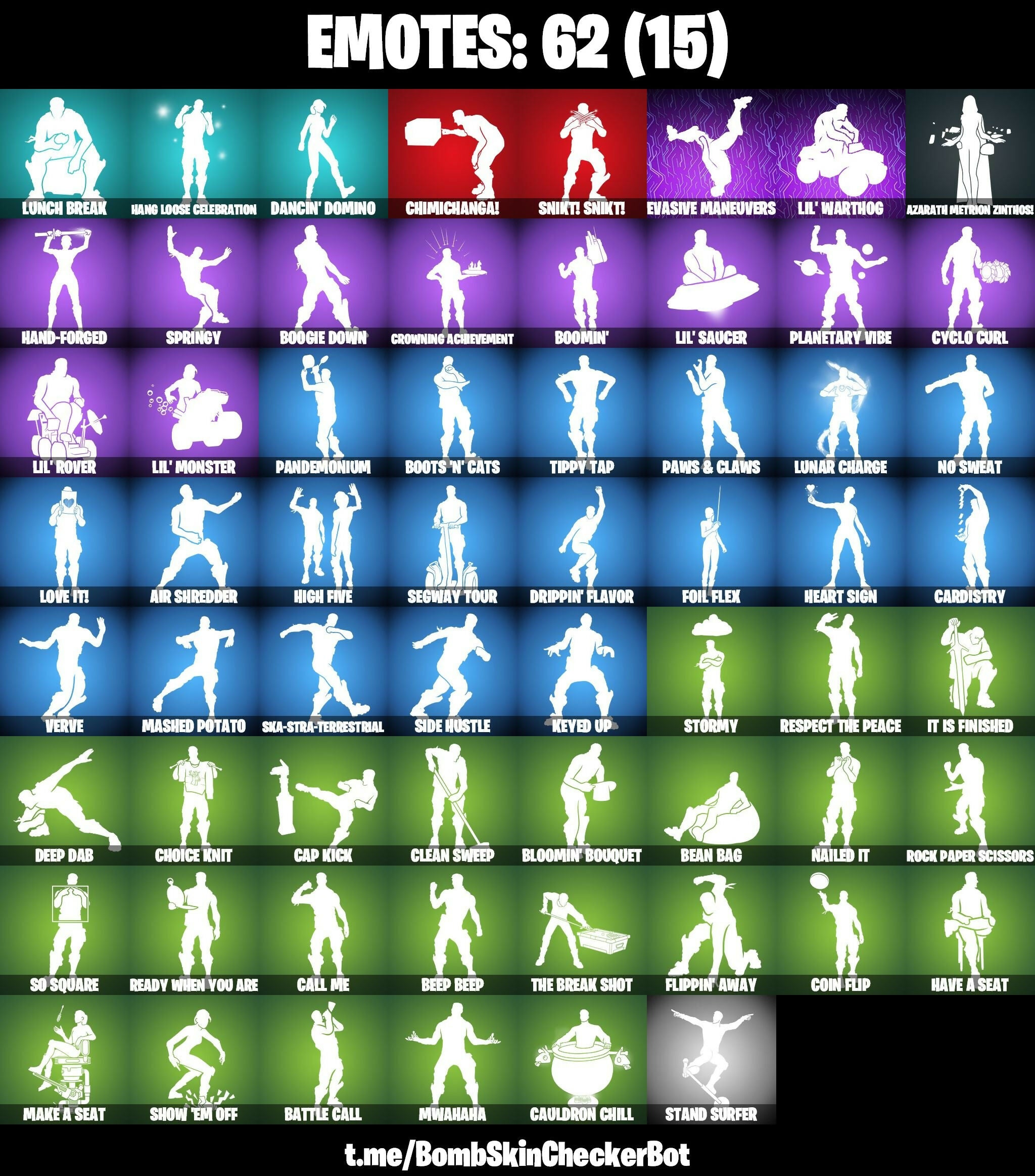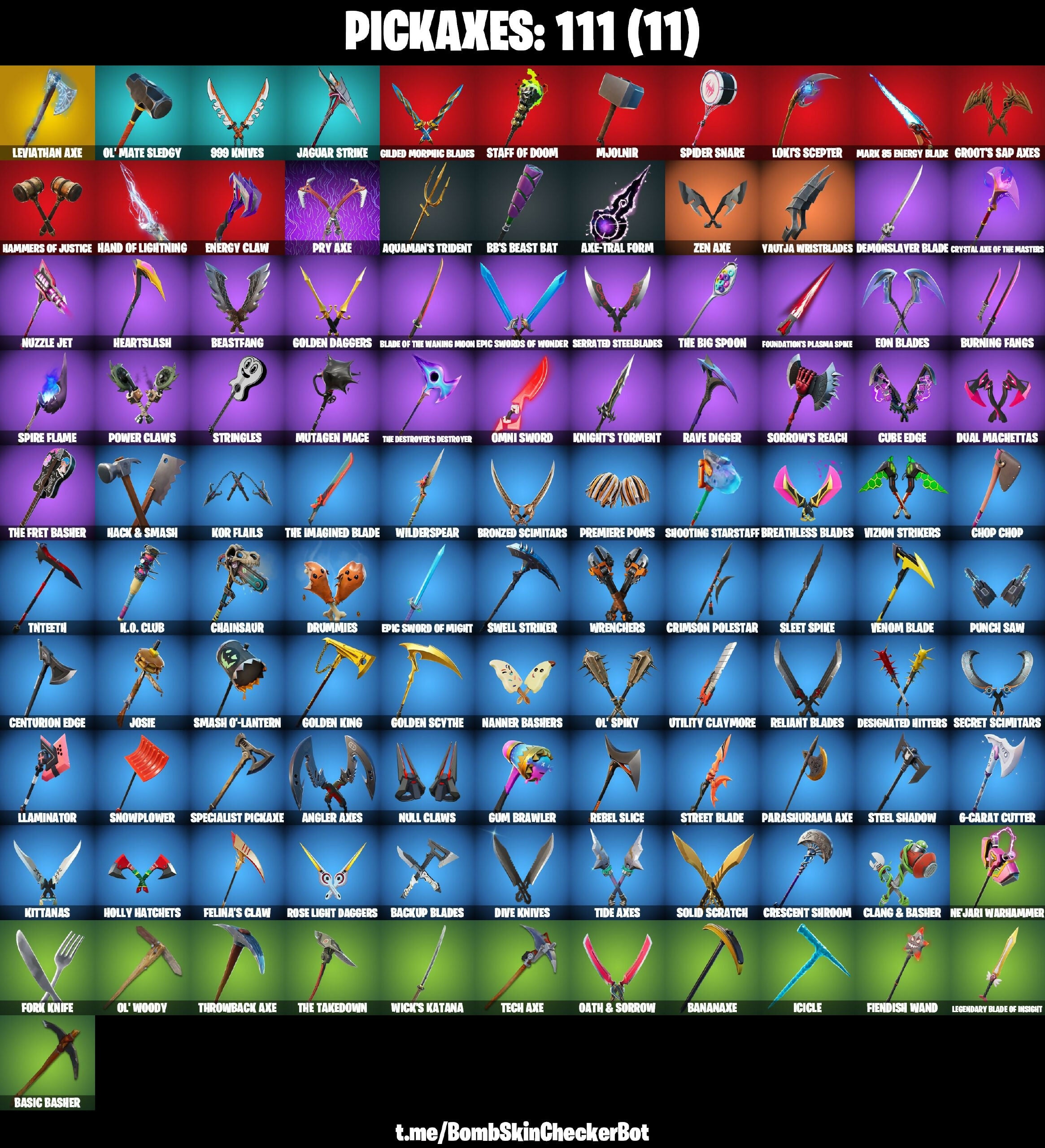 6-Carat Cutter, 999 Knives, Aftermath, Agent Jones, Agent Peely, Air Shredder, Angler Axes, Aquaman, Aquaman's Trident, Aura, Axe-trail Form, Azarath Metrion Zinthos!, BB's Beast Bat, Backup Blades, Bananaxe, Basic Basher, Battle Call, Bean Bag, Beast Boy, Beastfang, Beep Beep, Blade of the Waning Moon, Bloomin' Bouquet, Boogie Down, Boomin', Boots 'N' Cats, Breathless Blades, Bronzed Scimitars, Brutus, Burning Fangs, Call Me, Cap Kick, Cardistry, Cauldron Chill, Centurion, Centurion Edge, Chainsaur, Chaos Double Agent, Chaos Origins, Charlotte, Chimichanga!, Choice Knit, Chop Chop, Chrome Punk, Clang & Basher, Clean Sweep, Cluck, Coin Flip, Contract Giller, Crescent Shroom, Crimson Polestar, Crowning Achievement, Crystal Axe of the Masters, Cube Assassin, Cube Edge, Cyclo Curl, Dancin' Domino, Deadpool, Deep Dab, Deimos, Demonslayer Blade, Designated Hitters, Diamond Diva, Dive Knives, Dizzie, Doctor Doom, Double Agent Hush, Double Agent Wildcard, Dream, Drippin' Flavor, Drummies, Dual Machettas, El Chapulin Colorado, Energy Claw, Eon Blades, Epic Sword of Might, Epic Swords of Wonder, Eternal Knight, Evasive Maneuvers, Fabio Sparklemane, Fade, Felina, Felina's Claw, Fiendish Wand, Fishstick, Flippin' Away, Foil Flex, Fork Knife, Foundation's Plasma Spike, Gear Specialist Maya, Gilded Morphic Blades, Gingerbread Raider, Golden Daggers, Golden King, Golden Scythe, Groot, Groot's Sap Axes, Guggimon, Gum Brawler, Gumbo, Gunnar, Hack & Smash, Hammers of Justice, Hand of Lightning, Hand-Forged, Hang Loose Celebration, Have A Seat, Haven, Heart Sign, Heartslash, High Five, Holiday Boxy, Holly Hatchets, Icicle, It Is Finished, Jack Sparrow, Jaguar Strike, Jennifer Walters, Joey, John Wick, Josie, Journey Vs Hazard, Jules, K.O. Club, Keyed Up, Kiara K.O., Kit, Kittanas, Knight's Torment, Kondor, Kor, Kor Flails, Krisabelle, Kymera, Laguna, Lara Croft, Lazarbeam, Legendary Blade of Insight, Leviathan Axe, Lexa, Lil' Monster, Lil' Rover, Lil' Saucer, Lil' Warthog, Llaminator, Loki Laufeyson, Loki's Scepter, Love It!, Lt. John Llama, Lunar Charge, Lunch Break, Make A Seat, Mancake, Mandalorian, Marigold, Mark 85 Energy Blade, Mashed Potato, Mave, Mecha Cuddle Master, Meowscles, Midas, Mjolnir, Mutagen Mace, Mwahaha, Mystique, Nailed It, Nanner Bashers, Ne'jari Warhammer, Neymar Jr, No Sweat, Null Claws, Nuzzle Jet, Oath & Sorrow, Ocean, Ol' Mate Sledge, Ol' Spiky, Ol' Woody, Omega Knight, Omni Sword, Pandemonium, Parashurama Axe, Paws & Claws, Planetary Vibe, Polar Peely, Power Claws, Predator, Premiere Poms, Prowler, Pry Axe, Punch Saw, Rave Digger, Raz, Ready When You Are, Rebel Slice, Rebirth Raven, Red Strike, Reese, Reliant Blades, Respect The Peace, Rippley Vs Sludge, Rock Paper Scissors, Ronin, Rose Light Daggers, Sanctum, Sayara, Scuba Jonesy, Secret Scimitars, Seeker, Segway Tour, Serrated Steelblades, Shanta, Shooting Starstaff, Show 'Em Off, Side Hustle, Sierra, Siona, Ska-Stra-Terrestrial, Skye, Slayer Juice Wrld, Sleet Spike, Smash O'-Lantern, Snik! Snikt!, Snow Stealth Slone, Snowplower, So Square, Solid Scratch, Sorrow's Reach, Specialist Pickaxe, Spider Snare, Spider-Man (No Way Home), Spire Assassin, Spire Flame, Springy, Staff of Doom, Stand Surfer, Steel Shadow, Storm, Stormy, Street Blade, Stringles, Summer Skye, Sunny, Swell Striker, TNTina, Tarana, Tech Axe, The Big Spoon, The Break Shot, The Burning Wolf, The Cube Queen, The Destroyer's Destroyer, The Flash, The Foundation, The Fret Basher, The Imagined, The Imagined Blade, The Takedown, Thor, Throwback Axe, Tide Axes, Tippy Tap, Tnteeth, Tony Stark, Toona Fish, Tracy Trouble, Tsuki 2.0, Turk Vs Riptide, Utility Claymore, Venom Blade, Verve, Vizion Strikers, Wavebreaker, Whiteout, Wick's Katana, Wilderspear, Winterfest Bushranger, Wolverine, Wrenchers, Yautja Wristblades, Yellowjacket, Zen Axe