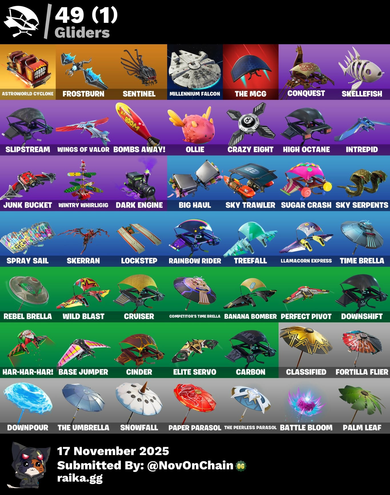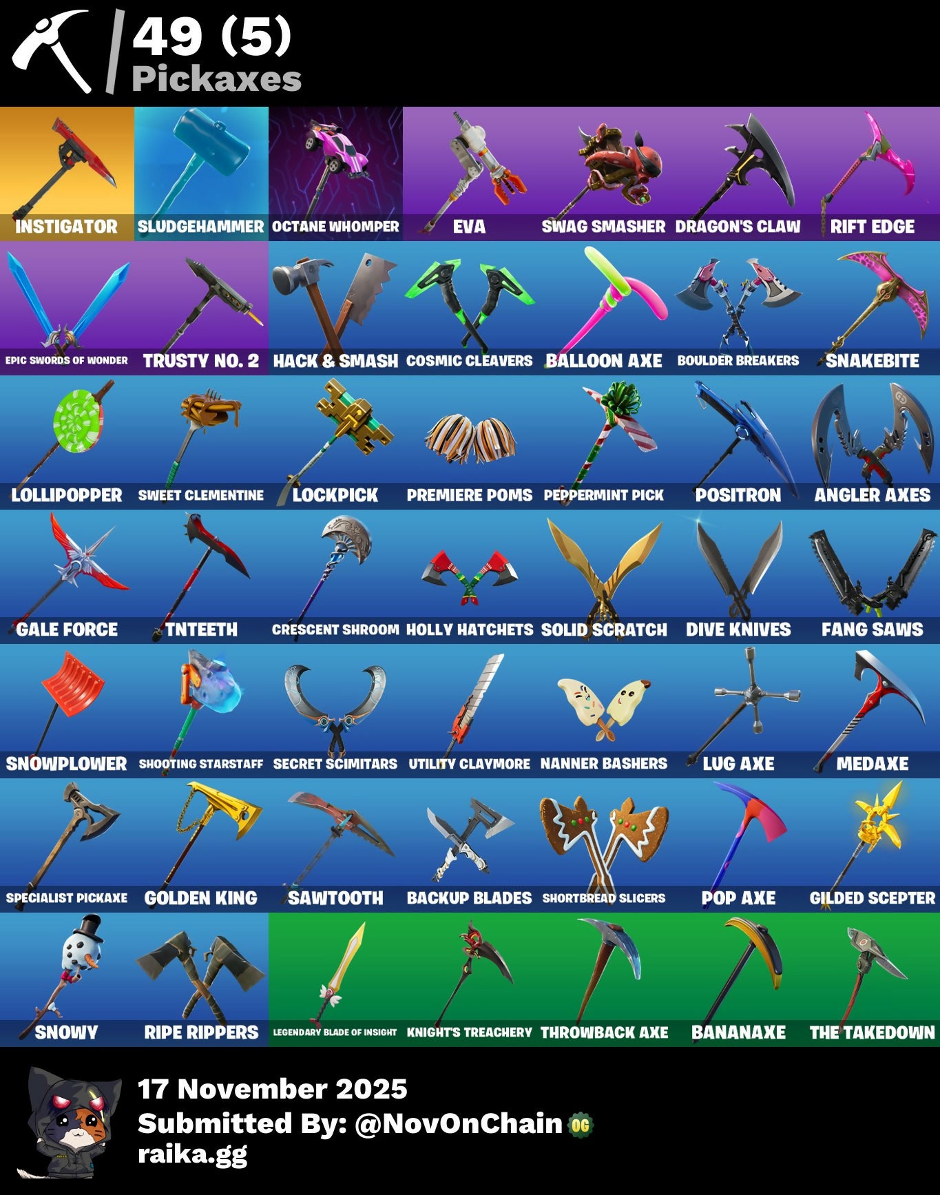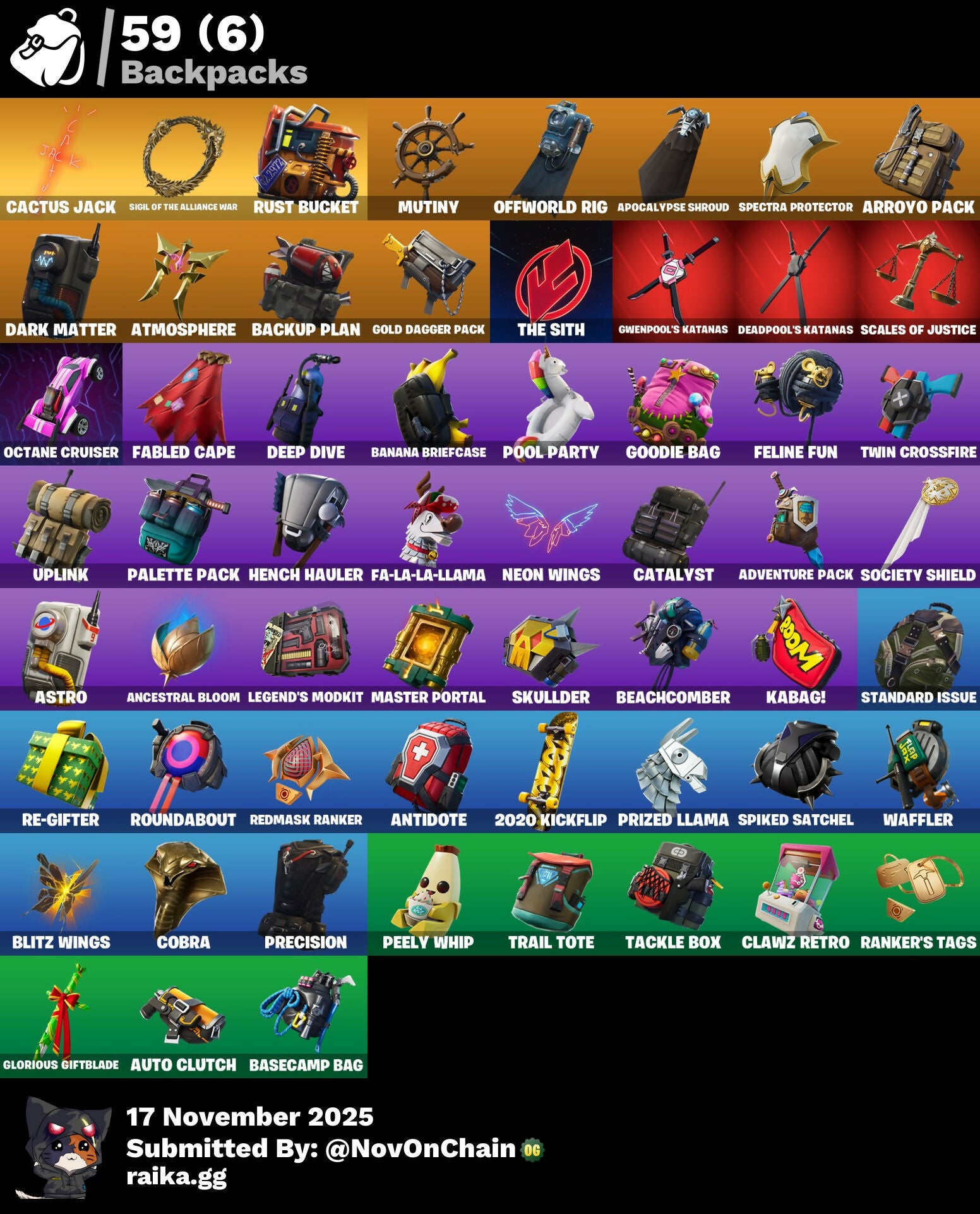 2020 Kickflip, Adventure Pack, Agent Peely, Ancestral Bloom, Angler Axes, Antidote, Apocalypse Shroud, Arroyo Pack, Astro, Astroworld Cyclone, Atmosphere, Auto Clutch, Backup Blades, Backup Plan, Balloon Axe, Banana Bomber, Banana Briefcase, Bananaxe, Base Jumper, Basecamp Bag, Battle Bloom, Battlehawk, Beachcomber, Beep Beep, Best Mates, Big Haul, Blackheart, Blitz Wings, Bombs Away!, Boogie Down, Boulder Breakers, Cactus Jack, Call Me, Carbide, Carbon, Catalyst, Chimichanga!, Choice Knit, Cinder, Classified, Clawz Retro, Cobra, Coin Flip, Competitor's Time Brella, Conga, Conquest, Cosmic Cleavers, Crazy Eight, Crescent Shroom, Crowning Achievement, Cruiser, Dabstand, Dark Engine, Dark Matter, Dark Voyager, Deadpool, Deadpool's Katanas, Deep Dive, Dive Knives, Downpour, Downshift, Doze Dab, Dragon Stance, Dragon's Claw, Drift, Droop, Elite Agent, Elite Servo, Ember, Epic Swords Of Wonder, Eva, Fa-La-La-Llama, Fabled Cape, Fang Saws, Feline Fun, Flippin' Away, Fortilla Flier, Frostburn, Gale Force, Gear Specialist Maya, Gentleman's Dab, Gilded Scepter, Glorious Giftblade, Gold Brutus, Gold Dagger Pack, Gold Midas, Golden King, Golf Clap, Goodie Bag, Gwenpool's Katanas, Hack & Smash, Har-Har-Har!, Havoc, Hello Friend, Hench Hauler, High Five, High Octane, Holiday Boxy, Holly Hatchets, Hula Hoopin', Huntress, Hybrid, Hype, Instigator, Intrepid, Iris, Jabba Switchway, Jaywalking, Journey Vs Hazard, Junk Bucket, Kabag!, Knight's Treachery, Legend's Modkit, Legendary Blade Of Insight, Lil' Prancer, Liteshow, Lllamacorn Express, Lockpick, Lockstep, Lollipopper, Lt. Evergreen, Lug Axe, Master Portal, Medaxe, Meowscles, Millennium Falcon, Mission Specialist, Moonwalker, Mutiny, Nana Nana, Nanner Bashers, Neon Wings, Octane Cruiser, Octane Whomper, Offworld Rig, Ollie, Orange Justice, Palette Pack, Palm Leaf, Pandemonium, Paper Parasol, Paws & Claws, Peace Out, Peely, Peely Whip, Peppermint Pick, Perfect Pivot, Pony Up, Pool Party, Pop Axe, Popcorn, Positron, Precision, Premiere Poms, Prized Llama, Rainbow Rider, Ranker's Tags, Re-Gifter, Rebel Brella, Redline, Redmask Ranker, Regal Wave, Remedy Vs Toxin, Respect, Respect The Peace, Ride The Pony, Rift Edge, Ripe Rippers, Rippley Vs Sludge, Rogue Agent, Roundabout, Rox, Runway Racer, Rust Bucket, Rust Lord, Salute, Sawtooth, Scales Of Justice, Secret Scimitars, Sentinel, Shaolin Sip, Shooting Starstaff, Shortbread Slicers, Side Hustle, Sidewinder, Sigil Of The Alliance War, Skellefish, Skerran, Skullder, Sky Serpents, Sky Trawler, Skye, Slipstream, Sludgehammer, Snakebite, Snoozefest, Snowfall, Snowplower, Snowshaker, Snowy, So Square, Society Shield, Solid Scratch, Specialist Pickaxe, Spectra Protector, Spiked Satchel, Spray Sail, Springy, Squad Leader, Squat Kick, Standard Issue, Sub Commander, Sugar Crash, Swag Smasher, Sweet Clementine, Tackle Box, Take The L, Teknique, The McG, The Peerless Parasol, The Reaper, The Robot, The Sith, The Takedown, The Umbrella, The Visitor, Throwback Axe, Tilted Teknique, Time Brella, Tnteeth, Tntina, Toosie Slide, Tra La La, Trail Tote, Travis Scott, Treefall, Trusty No. 2, Turk Vs Riptide, Twin Crossfire, Uplink, Utility Claymore, Valor, Waffler, Wave, Wavy T, Wild Blast, Wilde, Wings Of Valor, Winterfest Bushranger, Wintry Whirligig, Wooly Warrior, X-Lord, You're Awesome, Zoey