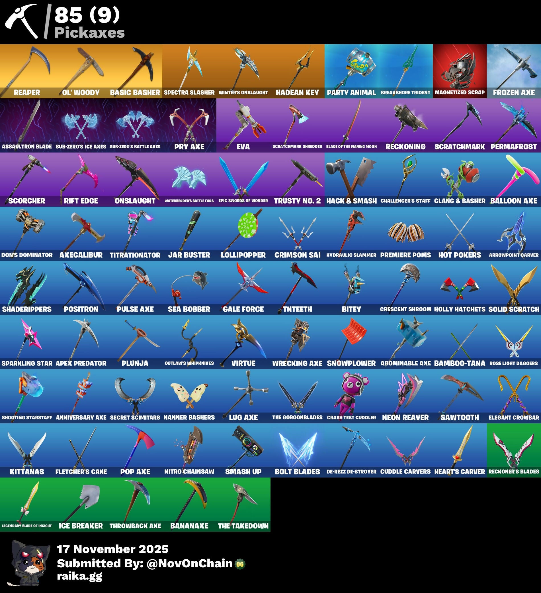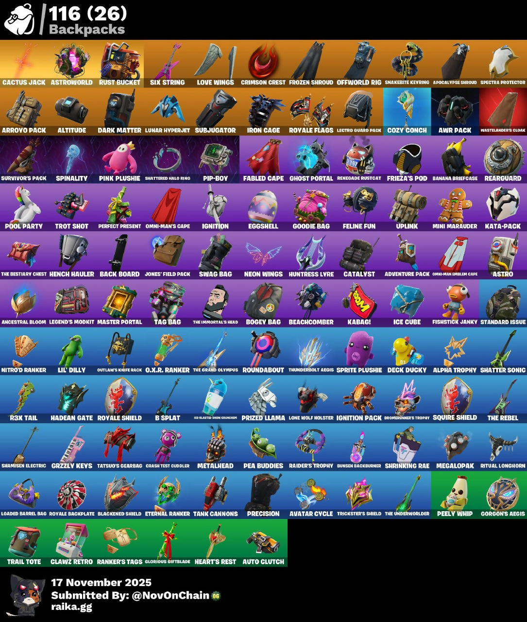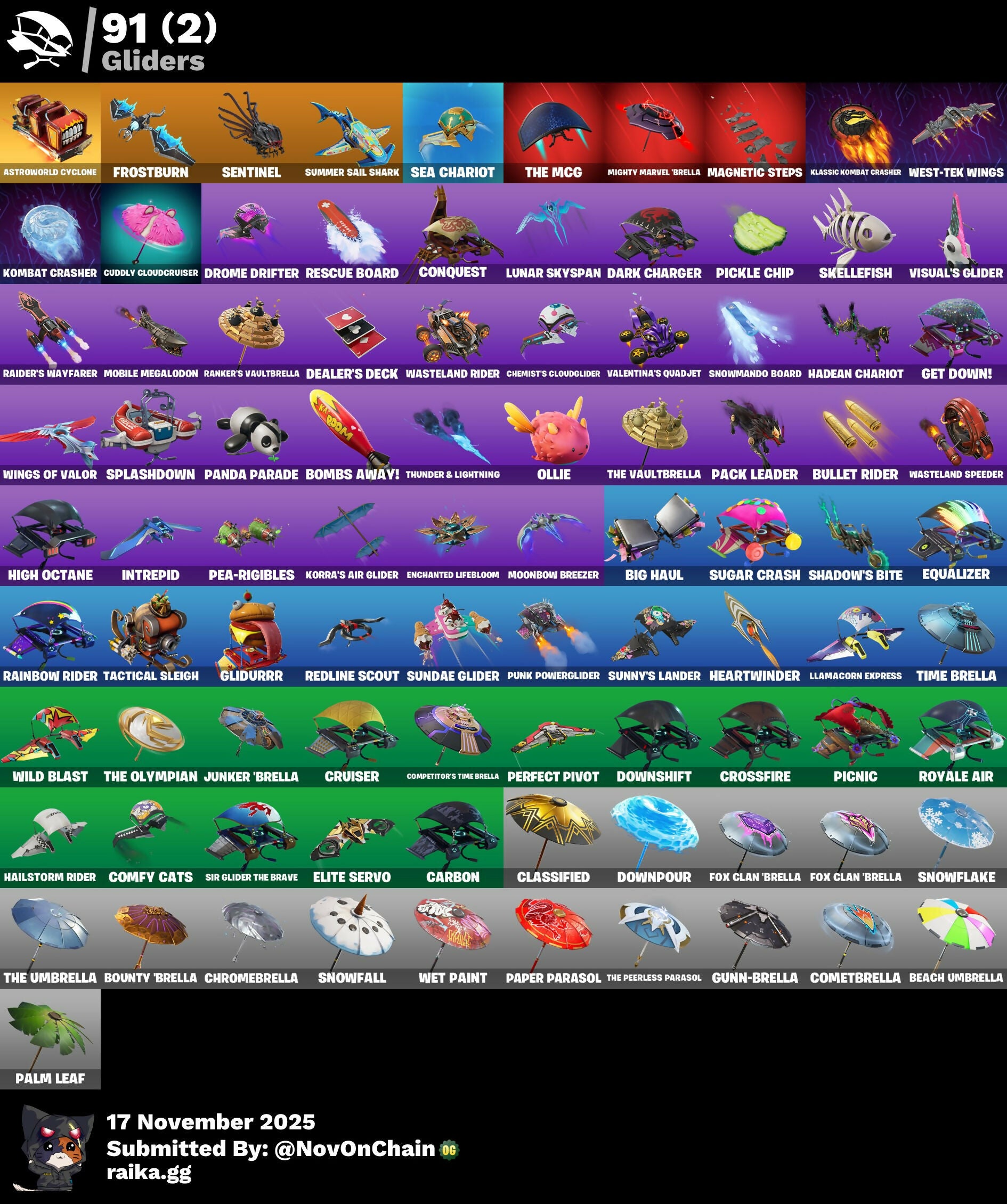 AWR Pack, Abominable Axe, Abstrakt, Adventure Pack, Agent Jones, Agent Peely, Alpha Trophy, Altitude, Ancestral Bloom, Anniversary Axe, Apex Predator, Aphrodite, Apocalypse Shroud, Arrowpoint Carver, Arroyo Pack, Artemis, Assaultron Blade, Astro, Astro Jack, Astroworld, Astroworld Cyclone, Auto Clutch, Avatar Cycle, Avatar's Flourish, Axecalibur, B Splat, Back Board, Balloon Axe, Bamboo-Tana, Banana Briefcase, Bananaxe, Baron's Hoard, Basic Basher, Battlehawk, Beach Umbrella, Beachcomber, Beep Beep, Best Mates, Big Dill, Big Haul, Bike To Go, Billy Bounce, Bitey, Blackened Shield, Blade Of The Waning Moon, Blue Squire, Bogey Bag, Bolt Blades, Bombs Away!, Boogie Down, Bounty 'Brella, Breakdown, Breakshore Trident, Brite Moves, Brite Raider, Brush Your Shoulders, Brutus, Bullet Rider, Bunny Brawler, Bunsen Backburner, Cactus Jack, Calamity, Calculated, Call Me, Carbide, Carbon, Cassidy Quinn, Cat Flip, Catalyst, Cerberus, Challenger's Staff, Chemist's Cloudglider, Choice Knit, Chromebrella, Clang & Basher, Classified, Clawz Retro, Clean Sweep, Codsworth's Cleanup, Cometbrella, Comfy Cats, Competitor's Time Brella, Conch Call, Conquest, Cozy Conch, Crash Test Cuddler, Crescent Shroom, Crimson Crest, Crimson Sai, Crossfire, Crowning Achievement, Cruiser, Cuddle Carvers, Cuddly Cloudcruiser, Dab, Dark Charger, Dark Matter, Dark Voyager, De-Rezz De-Stroyer, Deadpool, Dealer's Deck, Deck Ducky, Dj Yonder, Do The 'Split, Don's Dominator, Downpour, Downshift, Doze Dab, Drift, Drome Drifter, Dromerunner's Trophy, Duelist's Card Trick, Eggshell, Electro Shuffle, Elegant Crowbar, Elite Agent, Elite Servo, Enchanted Lifebloom, Enforcer, Epic Swords Of Wonder, Equalizer, Eternal Ranker, Eva, Fabled Cape, Feline Fun, Fire Show, Fishstick Janky, Flapper, Flashback Breakdown, Fletcher Kane, Fletcher's Cane, Flippin' Away, Flippin' Sexy, Fox Clan 'Brella, Frieza, Frieza's Pod, Frostburn, Frozen Axe, Frozen Shroud, Frozen Treat Cart, Gale Force, Gear Specialist Maya, Gentleman's Dab, Get Down!, Get Lost, Get Schwifty, Ghost Portal, Giddy-Up, Glidurrr, Glorious Giftblade, Golf Clap, Goodie Bag, Gorgon's Aegis, Groove Jam, Grzzly Keys, Gunn-Brella, Hack & Smash, Hadean Chariot, Hadean Gate, Hadean Key, Hades, Hailstorm Rider, Heart's Carver, Heart's Rest, Heartwinder, Hello Friend, Hench Hauler, High Octane, Holiday Boxy, Holly Hatchets, Hot Marat, Hot Pokers, Huntress, Huntress Lyre, Hydraulic Slammer, Hype, Ice Breaker, Ice Cube, Ice-Blasted Snow Cruncher, Ignition, Ignition Pack, Intrepid, Iris, Iron Cage, It's Chemistry!, Jar Buster, Jones' Field Pack, Joss, Junker 'Brella, Kabag!, Kata-Pack, Keep It Mello, Keisha Cross, Kittanas, Klassic Kombat Crasher, Kombat Crasher, Korra, Korra's Air Glider, Krisabelle, Lara Croft, Lectro Guard Pack, Legend's Modkit, Legendary Blade Of Insight, Lil Split, Lil' Dilly, Lil' Longboat, Llamacorn Express, Loaded Barrel Bag, Lollipopper, Lone Wolf Holster, Love Ranger, Love Wings, Lug Axe, Lunar Hyperjet, Lunar Skyspan, Lynx, Magnetic Steps, Magnetized Scrap, Make A Seat, Master Portal, Medusa, Megalo Don, Megalopak, Meowscles, Merry Marauder, Metalhead, Mic Drop, Mighty Marvel 'Brella, Mini Marauder, Mission Specialist, Mobile Megalodon, Moonbow Breezer, Moonlit Mystery, Moonwalker, My World, Nanner Bashers, Neon Reaver, Neon Wings, Nitro Chainsaw, Nitro'd Ranker, O.X.R. Ranker, Offworld Rig, Ol' Woody, Ollie, Omega, Omegarok, Omni-Man, Omni-Man Emblem Cape, Omni-Man's Cape, Onslaught, Orange Justice, Outlaw Midas, Outlaw's Knife Rack, Outlaw's Mugshot, Outlaw's Strut, Outlaw's Whipknives, Pack Leader, Palm Leaf, Panda Parade, Pandemonium, Paper Parasol, Party Animal, Paws & Claws, Pea Buddies, Pea Part Harmony, Pea-Rigibles, Peabody, Peely Whip, Perfect Pivot, Perfect Present, Permafrost, Pickle Chip, Picnic, Pink Plushie, Pip-Boy, Plunja, Polar Peely, Pony Up, Pool Party, Pop Axe, Popcorn, Poseidon, Positron, Powder, Power Chord, Precision, Premiere Poms, Prized Llama, Pry Axe, Pulse Axe, Pumpernickel, Punk Powerglider, R3X Tail, Rage, Ragnarok, Raider's Trophy, Raider's Wayfarer, Rainbow Rider, Ranker's Tags, Ranker's Vaultbrella, Raven, Raven's Legion, Reaper, Rearguard, Reckoner's Blades, Reckoning, Red Jade, Redline, Redline Scout, Regal Wave, Renegade Lynx, Renegade Rustcat, Rescue Board, Respect, Respect The Peace, Ride The Pony, Rift Edge, Ringmaster Scarr, Ritual Longhorn, Rock Out, Rogue Agent, Rook, Rose Light Daggers, Roundabout, Roundhouse, Royale Air, Royale Backplate, Royale Flags, Royale Knight, Royale Shield, Runway Racer, Rust, Rust Bucket, Rust Lord, Salute, Sawtooth, Scorcher, Scratchmark, Scratchmark Shredder, Sea Bobber, Sea Chariot, Secret Scimitars, Sentinel, Serpentine Summoning, Sgt. Winter, Shadebox, Shaderippers, Shadow's Bite, Shamisen Electric, Shanta, Shatter Sonic, Shattered Halo Ring, Shimmer, Shooting Starstaff, Shrinking Rae, Side Hustle, Sir Glider The Brave, Six String, Skellefish, Skull Trooper, Sledgehammer, Smash Up, Snakebite Keyring, Snowfall, Snowflake, Snowmando Board, Snowplower, Snowshaker, Solid Scratch, Sparkling Star, Spectra Knight, Spectra Protector, Spectra Slasher, Spinality, Splashdown, Sprite Plushie, Squad Leader, Squire Shield, Standard Issue, Sub-Zero (Mk3), Sub-Zero's Battle Axes, Sub-Zero's Ice Axes, Subjugator, Sugar Crash, Summer Sail Shark, Sun Strider, Sundae Glider, Sunny's Lander, Survivor's Pack, Swag Bag, Sweet Swing, Swipe It, T-60 Power Armor, T-Pose, Tactical Sleigh, Tag Bag, Take The Elf, Take The L, Tank Cannons, Tatsuo, Tatsuo's Gearbag, Teknique, Tempest Flight, The Ace, The Bestiary Chest, The Break, The Gorgonblades, The Grand Olympus, The Immortal's Head, The Machinist, The Mcg, The Olympian, The Peerless Parasol, The Reaper, The Rebel, The Robot, The Takedown, The Umbrella, The Underworlder, The Vaultbrella, The Visitor, The Worm, Throwback Axe, Thunder & Lightning, Thunderbolt Aegis, Time Brella, Titrationator, Tnteeth, Tntina, Trail Tote, Travis Scott, Trickster's Shield, Trot Shot, Trusty