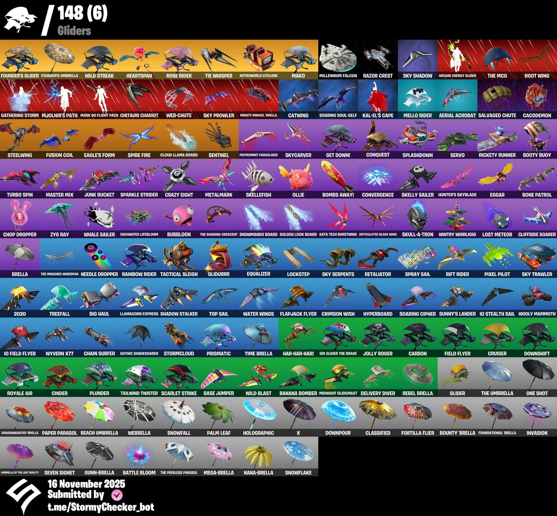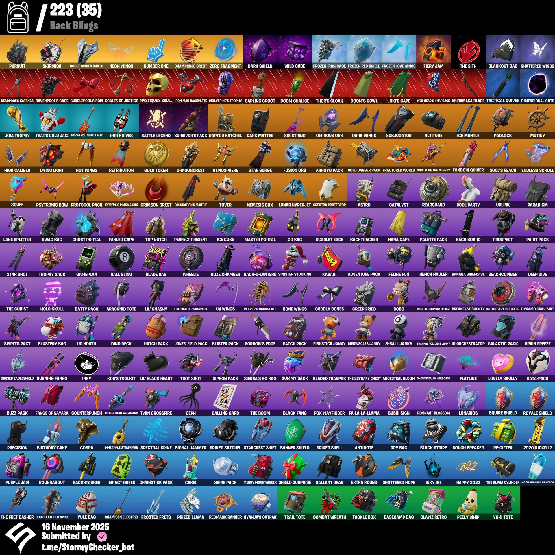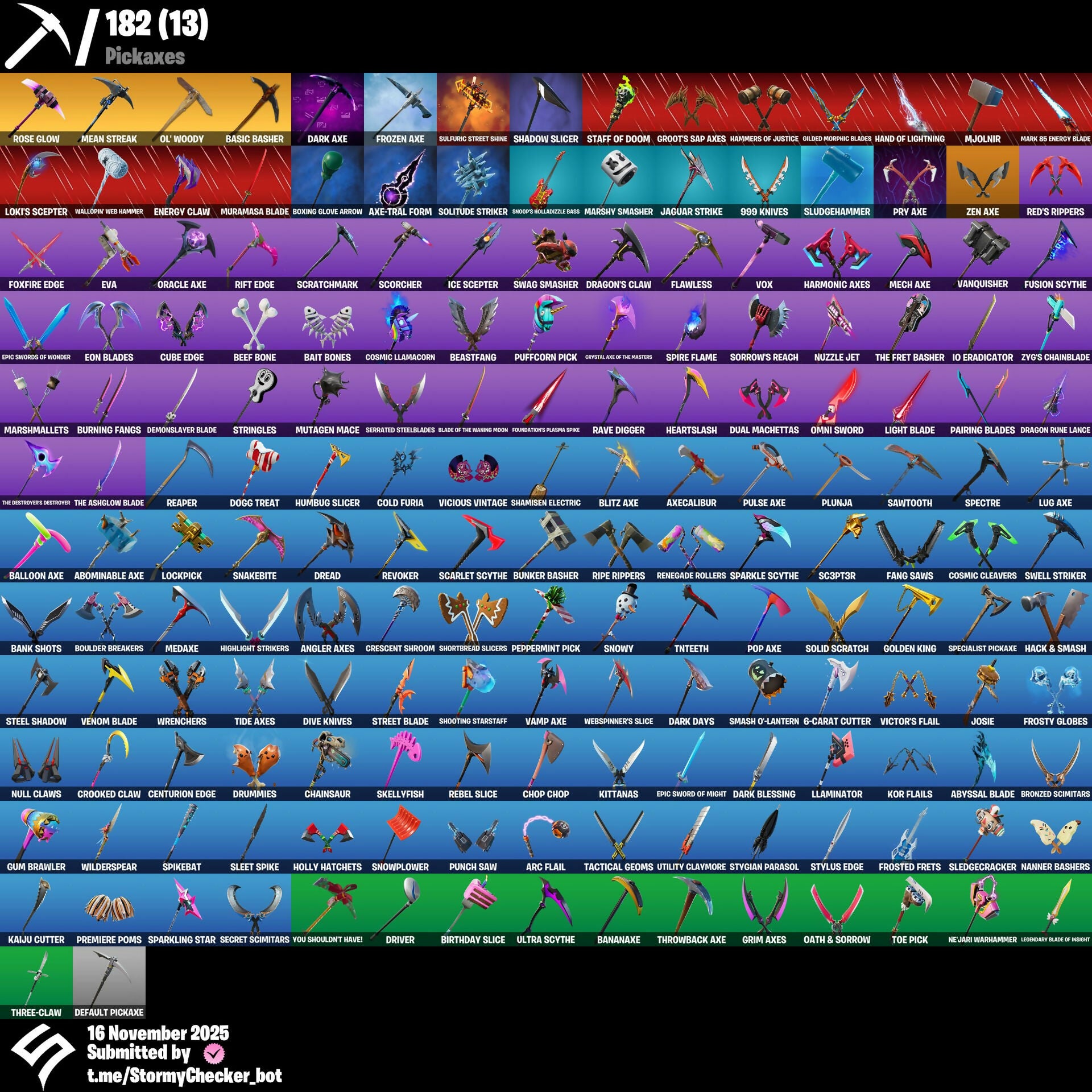 2020, 2020 Kickflip, 6-Carat Cutter, 8-Ball Janky, 8-Ball vs Scratch, 999 Knives, A Warrior Prepares, Abominable Axe, Absenz, Abyssal Blade, Adira, Adventure Pack, Aerial Acrobat, Aftermath, Agent Jones, Agent Peely, Air Shredder, Alli, Altitude, Ancestral Bloom, Angler Axes, Antidote, Arachne Couture, Arachnid Tote, Arc Flail, Arcane Energy Glider, Archetype, Arctic Adeline, Arroyo Pack, Articulated Blade Wing, Astro, Astroworld Cyclone, Atmosphere, Axe-Tral Form, Axecalibur, Azariah Metrion Zinthos!, BRSeason1, Back Board, Back-o-Lantern, Backstabber, Backstroke, Backtracker, Bait Bones, Ball Bling, Balloon Axe, Banana Bomber, Banana Briefcase, Bananaxe, Bank Shots, Banner Shield, Base Jumper, Basecamp Bag, Basic Basher, Battle Bloom, Battle Legend, Batty Pack, Beach Umbrella, Beachcomber, Bean Bag, Bear Hug, Beastfang, Beef Bone, Beep Beep, Best Mates, Big Haul, Billy Bounce, Birthday Cake, Birthday Slice, Black Fang, Black Knight, Black Stripe, Blackheart, Blackout Bag, Blade Bag, Blade of the Waning Moon, Bladed Travpak, Blinding Lights, Blister Pack, Blitz Axe, Blowin' Up, Blowing Bubbles, Blue Squire, Blustery Bag, Bobo, Boing!, Bold Stance, Bombs Away!, Bone Boss, Bone Patrol, Bone Ravage, Bone Wings, Boogie Down, Boomin', Boots 'N' Cats, Booty Buoy, Bough Breaker, Boulder Breakers, Bounty Brella, Boxing Glove Arrow, Boxy, Brain Freeze, Breakdown, Breakfast Bounty, Breakin', Breakneck, Breakpoint, Brella, Bronzed Scimitars, Brush Your Shoulders, Brutus, Bubbloon, Bulletproof, Bullseye, Bunker Basher, Bunker Jonesy, Bunnymoon, Burning Fangs, Burnout, Buzz Pack, Cacodemon, Cake!, Calculated, Call Me, Calling Card, Cameo vs Chic, Carbon, Cardistry, Cat Flip, Catalyst, Catwing, Centurion, Centurion Edge, Ceph, Chain Surfer, Chainsaur, Chainstick Pack, Champion's Crest, Championship 2021, Chaos Agent, Chaos Origins, Charlotte, Chef's Special, Chitauri Chariot, Choice Knit, Chop Chop, Chop Dropper, Cinder, Classified, Clawz Retro, Clean Sweep, Cliffside Soarer, Cloud Llama Board, Cluck, Cluck Strut, Clutch, Cobra, Coin Flip, Cold Furia, Combat Wreath, Commando, Conga, Conquest, Convergence, Cosmic Cleavers, Cosmic Llamacorn, Counterpunch, Crazy Eight, Creep Fried, Crescent Shroom, Crimson Crest, Crimson Elite, Crimson Wish, Criss Cross, Crooked Claw, Crowning Achievement, Cruiser, Cryptic, Crystal, Crystal Axe of the Masters, Cube Assassin, Cube Edge, Cuddle Hearts, Cuddle Team Winner, Cuddlepool, Cuddlepool's Bow, Cuddly Bones, Curling Iron, Cursed Eagleshield, Cyclo Curl, D'Ark, Dabstand, Dance Monkey, Dance Moves, Dark Axe, Dark Blessing, Dark Days, Dark Jonesy, Dark Matter, Dark Red Knight, Dark Shield, Dark Voyager, Dark Wild Card, Dark Wings, Deadpool, Deadpool's Katanas, Deep Dive, Default Pickaxe, Deimos, Delivery Diver, Demi, Demonslayer Blade, Desert Dominator, Diamond Diva, Dimensional Gate, Dino Deck, Dive Knives, Dizzie, Doctor Doom, Doctor Slone, Dogg Treat, Dolph, Don't Start Now, Doom Chalice, Doom's Cowl, Downpour, Downshift, Dragon Rune Lance, Dragon Stance, Dragon's Claw, Dragoncrest, Dragonhearted Brella, Dread, Dream Feet, Drift, Driver, Droop, Drum Major, Drummies, Dry Bag, Dual Machettas, Dying Light, Dynamo Grav-Suit, Eagle's Form, Eggar, Electro Shuffle, Ember, Enchanted Lifebloom, Endless Scroll, Energy Claw, Enforcer, Eon Blades, Epic Sword of Might, Epic Swords of Wonder, Equalizer, Eternal Voyager, Eva, Evasive Maneuvers, Everybody Loves Me, Evie, Expressionism, Extra Round, Extraterrestrial, FNCS 2:4, Fa-La-La-Llama, Fabled Cape, Fade, Fang Saws, Fangs of Sayara, Fashion Accident Janky, Fate, Featherweight, Feline Fun, Field Flyer, Fierce, Fiery Jam, Firebreather's Daypack, Fishin', Fishskull, Fishstick Janky, Flapjack Flyer, Flatline, Flawless, Flippin' Away, Fortilla Flier, Fortune, Foundation's Mantle, Foundation's Plasma Spike, Foundational 'Brella, Founder's Glider, Founder's Umbrella, Fox Wayfinder, Foxbow Quiver, Foxfire Edge, Fractured World, Free Flow, Frosted Frets, Frosty Globes, Frozen Axe, Frozen Iron Cage, Frozen Love Ranger, Frozen Love Wings, Frozen Raven, Frozen Red Knight, Frozen Red Shield, Fusion, Fusion Coil, Fusion Orb, Fusion Scythe, Galactic Pack, Galaxia, Gallant Gear, Gameplan, Gathering Storm, Gear Specialist Maya, Gentleman's Dab, Get Down!, Get Funky, Get Griddy, Get Loose, Ghost Portal, Gilded Morphic Blades, Glider, Glidurrr, Gnash, Go Bag, Godzilla's Exo-Spine, Gold Dagger Pack, Gold Token, Golden King, Golden Look Board, Golf Clap, Gothic Shadesoarer, Grave, Green Arrow, Grim Axes, Grimoire, Grind, Grit, Groot, Groot's Sap Axes, Guff Gringle, Guggimon, Gum Brawler, Gumbo, Gummy Sack, Gunn-Brella, Gunnar, Hack & Smash, Hammers of Justice, Hand of Lightning, Hand-Forged, Hang Loose Celebration, Happy 2022, Har-Har-Har!, Harlowe, Harmonic Axes, Hatch Pack, Haven, Headbanger, Heartslash, Heartspan, Hello Friend, Hench Hauler, Hey Now!, High Caliber, High Five, Highlight Strikers, Hit It, Holly Hatchets, Holo-Skull, Holographic, Hoop Master, Hot Marat, Hot Wings, Hula Hoopin', Humbug Slicer, Hunter's Skyblade, Huntress, Hush, Hybrid, Hyperboard, I Declare!, IO Eradicator, IO Field Flyer, IO Orchestrator, IO Stealth Sail, Ice Cube, Ice Mantle, Ice Scepter, Ice-Blasted Snow Cruncher, Imani, Impact Green, Infinite Dab, Inky, Inky Ire, Intensity, Invasion, Iris, Iron Man Backplate, It's Complicated, It's... You?, Jabba Switchway, Jaguar Strike, Jaywalking, Jennifer Walters, Joey, Joia Trophy, Jolly Roger, Joltara, Jones' Field Pack, Josie, Journey vs Hazard, Jules, Jump Jets, Junk Bucket, Kabag!, Kaiju Cutter, Kal-El's Cape, Karve, Kata Tech Burstwing, Kata-Pack, Keep It Mello, Kittanas, Komplex, Kondor, Kor, Kor Flails, Kor's Toolkit, Krisabelle, Kymera, Kymera's Plasma Pak, Kyra, Laguna, Laid Back Shuffle, Lane Splitter, Lara Croft, Last Forever, Laugh It Up, Lazer Blast, Lazy Shuffle, Legendary Blade of Insight, Lexa, Light Blade, Lil' Black Heart, Lil' Bounce, Lil' Gnashy, Lil' Monster, Lil' Prancer, Lil' Saucer, Lil' Treat, Lla