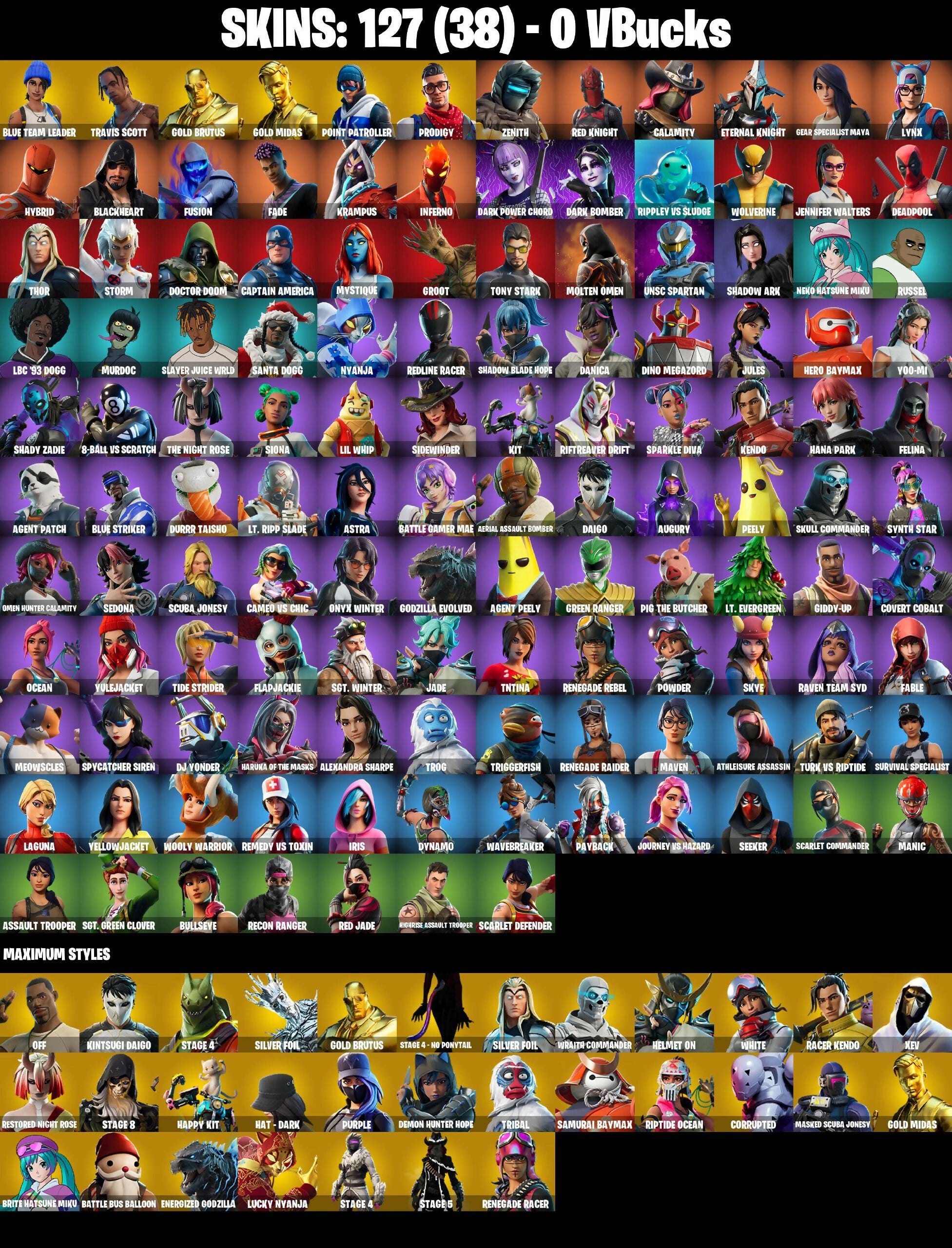 (PC) 0 VB) 127 skins | Renegade Raider | Blue Team Leader | Travis Scott | Gold Brutus | Gold Midas | Point Patroller | Prodigy | Zenith