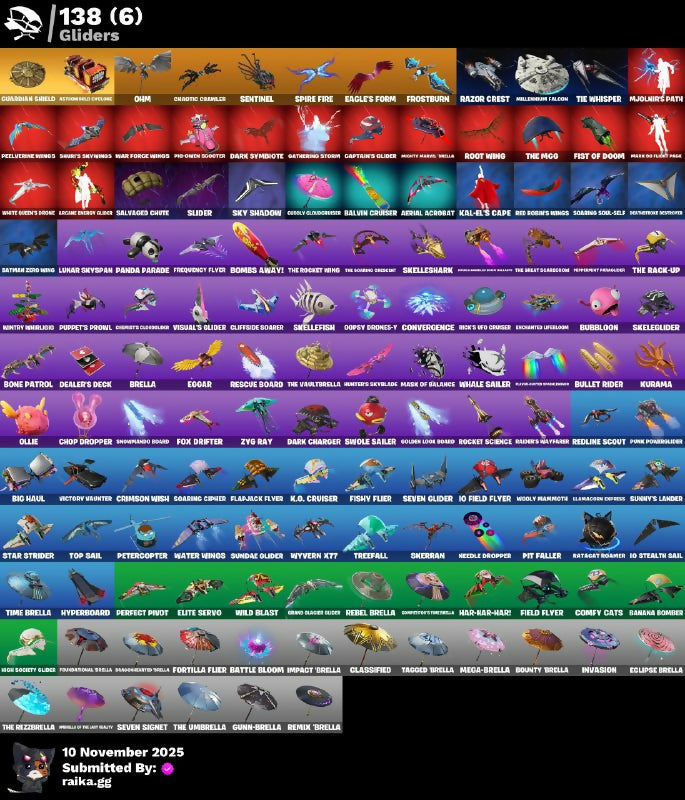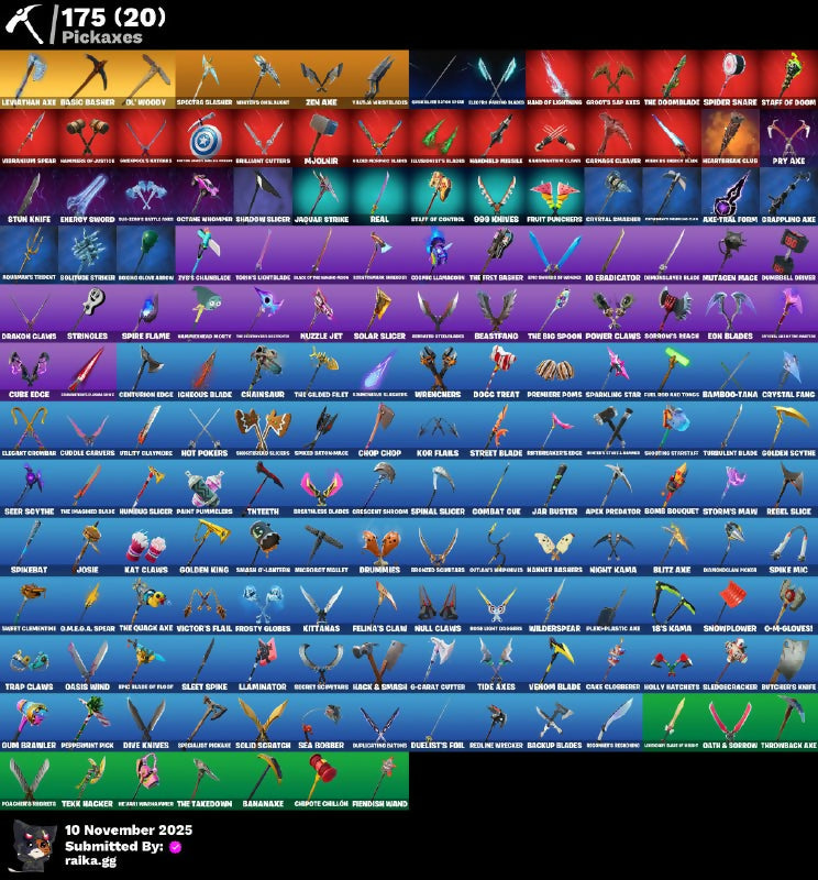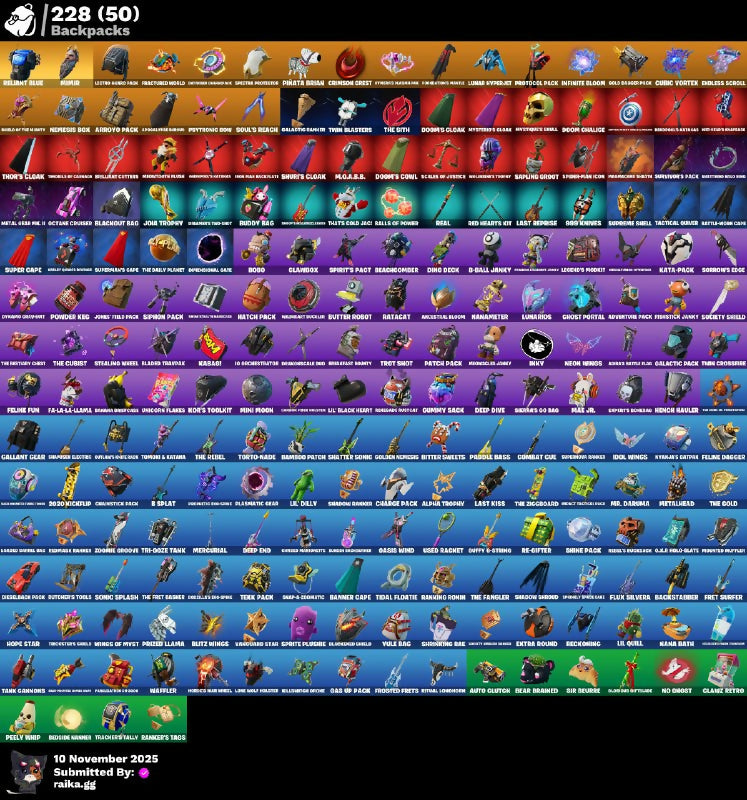 (Sight), 1-Ball, 10 Field Flyer, 10 Ghost Status, 10 Stealth Sail, 18's Kama, 2020 Kickflup, 6-Carat Cutter, 989 Wings, 999 Knives, Adventure Pack, Aerial Acrobat, Agent Jones, Agent Patch, Agent Pely, Alexander Christ, Alpha Trodway, Ancestral Bloom, Ancient Tactical Pack, Anti-Venom Cane, Apex Predator, Aquaman, Arcane Energy Cloak, Armorford Steelfang, Ascend!, Aspen, Astromech Cyclone, Augury, Aura, Auto Glitch, Aw, Shucks., Axe-Tral Form, B Splash, B.R.U.T.E Gunner, Back On 74, Backstabbber, Backup Blades, Balletic, Balls of Power, Balvin Cruiser, Bamboo Patch, Bamboo-Tana, Banana Bomber, Bananaxe, Band Of Lightning, Banner Cape, Barb Shredder, Baron's Hoard, Basic Basher, Batman Zero, Batman Zero Wing, Battle Bloom Impact Brella, Beach Jules, Beachcomber, Bean Bag, Bear Brained, Bear Hug, Beastfang, Beek-Up-The-Beatiful, Beep Beep, Bernie, Biella, Big Haul, Bike To Go, Bill-Bill Black Heart, Bitter Sweets, Blackout Bag, Blade Tatsmak, Bleachback Reaper, Blinding Lights, Blitz Axe, Blitz Wings, Blood Glove Arrow, Bluerglass Gold, Bluzzabelle, Bobo Lost Crossers, Bogo, Bomb Bouquet, Bombs Away!, Bone Patrol, Boogie Down, Boomin, Bootsin' Cats, Bounceberry, Bounty Brella, Breakfast Bunny, Breathless Blades, Brella Of The Rich Beauty, Brilliant Cutters, Brimstone's Lariat, Brutus, Bubloon, Buddy Bag, Bullet Rider, Bulma, Butcher's Knife, Butcher's Tools, Butter Robot, Cake Clobberer, Call Me, Candy Cane, Captain Camperosa, Captain Jones, Captain's Glider, Cardistry, Carnage, Carnage Cleaver, Catwoman Zero, Cauldron Chill, Centurion, Centurion Edge, Cerid Harpoons, Chainsaur, Chaos Director, Chaos Origins, Chaotic Crawler, Charge Pack, Charlotte, Chipotle Chillón, Choice Knit, Chop Chop, Chop Dropper, Chromatic Cloudglider, Clance Retro, Clark Kent, Clawbox, Clean Sweep, Cliffside Soarer, Cluck, Coin Flip, Combat Cue, Combat Que, Comfy Cats, Compoter's Fosterers, Controller Crew, Convergence, Coolly Cloudchaser, Crimson Crest, Crimson Wish, Crossbound Scissors, Crystal Fang, Crystal Smasher, Cube Assassin, Cube Edge, Cubic Vortex, Cuddle Carvers, Customatch Pack, Cyclo-Curl, D-Ball Junky, Danica, Dark Charger, Dark Crystal En-Listine, Dark Ice Hook Backplate, Dark Symbiote, Daz, Deadpool, Dealer's Deck, Deep Dive, Deep End, Deinos, Delilious Do-Spins, Demogorgon Smith, Demon Style Wyld, Demonscale Dino, Diamond Diva, Diamond Throne, Diamonds Twig, Die With A Smile, Diesleback Pack, Dimensional Gate, Dino Deck, Dive Knives, Dizzie, Do The Split, Doctor Doom, Doctor Slone, Dogc Treat, Don't Stare Now, Doom, Doom Chalice, Doom's Cloak, Doom's Cowl, Doom's Domain, Doomslayer Blade, Doppel Cleaverhorn, Doze Dab, Drag No Panda & Cockoo, Dragonclaw Ninja, Drakon Claws, Dramatic Gear, Drummies, Duelist's Foil, Duffy G-String, Dumbbell Driver, Duplicating Batons, Dusk Knight, Dynamo Grappler, Dynamo Tina, Eagle's Form, Eclipse Brella, El Loco Romero's Lashes, Electric Plasma Blades, Elegant Crowbar, Elite Servo, Elmacaron Express, Embalmer's Ice Axe, Emma Frost, Empyrean Razorstrike, Enchanted Lifeglow, Endless Scroll, Energy Sword, Entwined Champions, Eogar, Eon Blades, Epic Blade Of Floof, Esports Bonzai, Evasive Maneuvers, Extra Round, Fa-Ha-La Lama, Fade, Fanged Sparklings, Felina, Felina's Claw, Feline Dagger, Feline Fun, Field Flyer, Fiendish Wand, Finishist Junky, Fire Rod And Torch, Fireworks Salvo, Fishy Flyer, Fist Bump, Fist Of Doom, Fixer, Flapjack Flyer, Flippin Away, Flux Rivera, Foil Flex, Fortilla Flyer, Fox Drifter, Fractured World, Freedom Wheels, Frequency Flyer, Fret Surfer, Front Man, Frostburn, Frosted Frets, Frosty Globes, Fruit Punchers, Full Tilt, Fundamental Brella, Galactic Earth, Galactic Pack, Galaxia, Gallant Gear, Gamer Billy, Gathering Storm, Gg, Ghost Portal, Ghoul Trooper, Gierra, Givenpool, Glassified, Gnarblestar Reiper, Goal Folio-Glatt, Gold Bishop Pick, Gold Kratos, Golden King, Golden Loop Board, Golden Nergess, Golden Scythe, Gone Sight Fortnite, Good Guy, Gorynacova, Grand Glider Rider, Grappling Axe, Green Arrow, Greenpol's Knickers, Groot, Groot's Sap Axes, Grumpy Sack, Guardian Cloakets, Guardian Shield, Guggimon, Guide To The Dark Underworld, Gum Brawler, Gumbo, Gunn-Brella, Gwen-Step, Hack & Smash, Hammer, Hand-Forged, Handswell Missile, Hanematsu Claws, Har-Har-Har!, Harlowe, Harness Of Justice, Hatch Pack, Haunted Muffin, Have A Seat, Heartbreak Club, Heartwarmer, Heavy Smith Hammer, Hellfire Dance, Hench Hauler, Heroes' Nah Metal, Holiday Roxy, Holly Hatchets, Holt Society Glider, Hope, Hope Star, Hot Pokers, Hunebug Slicer, Hunter's Skylide, Hydroid Huskman, Hype!, Hyperboard, I Like To Move It, I'm A Mystery, Icnheous Blade, Idol Wings, Ignited Scimitars, Illusionsit's Blades, In Da Party, Incipient Paraslicer, Infinite Bloom, Initial Longhorn, Inky, Integrity Skull, Invasion, Inverted Bow, Io Eradicator, Irie's Chainblade, Ironbreaker's Axe, Ironik, It's... You?, J Balvin, JRL Chipmunkki, Jackie, Jaguar Strike, Jar Buster, Jet Signals, Joey, John Wick, Josie, Juju Trophy, Jules, K.O. Cruiser, Kal-El's Cape, Kasabi, Kat Claws, Kata-Pack, Khasar's Battle Plan, Kick Back, Kidnap's Reaper, Killestone Gloves, Kit, Kittanas, Kitty Claws, Kondor, Kor, Kor Flails, Korb's Toolkit, Krisabelle, Krylan Aryk, Kurama, Kymera, Lara Croft, Last Embrace, Last Kiss, Lazer Blast, Legends Rocket, Leviathan Axe, Lexa, Lil Quill, Lil Spurt, Lil' Delly, Lil' Ducky Train, Lil' Ghost, Lil' Longboat, Lil' Monster, Lil' Prancer, Lil' Rover, Lil' Saucer, Lil' Shredder, Lil' Warthog, Lime Skate Flights, Lina Scorch, Llaminator, Loaded Gauntlets of Rage, Loglefrukt, Lose It!, Lotto Bird Pack, Lt. Evergreen, Lt. John Llama, Luna Rios, Lunar Charge, Lunar Skyspan, Lunar Voyager, M.O.J.O.B.B., Majesty's Celebrant, Major Mangake, Make A Seat, Mana Bath, Mandalorian, Mander Bashers, Mangake, Manifested Moth, Mark 80 Flight Pack, Mashed Potato, Mask Of Balance, Max Jr., Meat Hook Pickle, Meatgrinder, Mechparamsular, Mega-Brella, Members Only, Menace, Meowdas, Meowscles, Mercuri