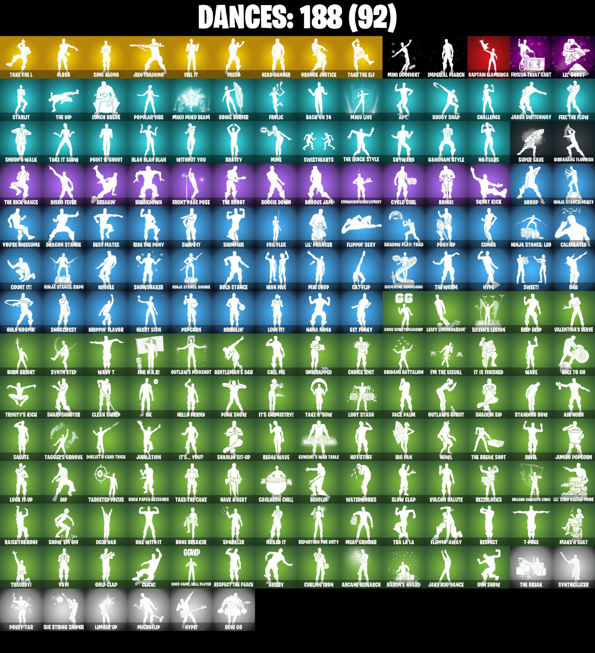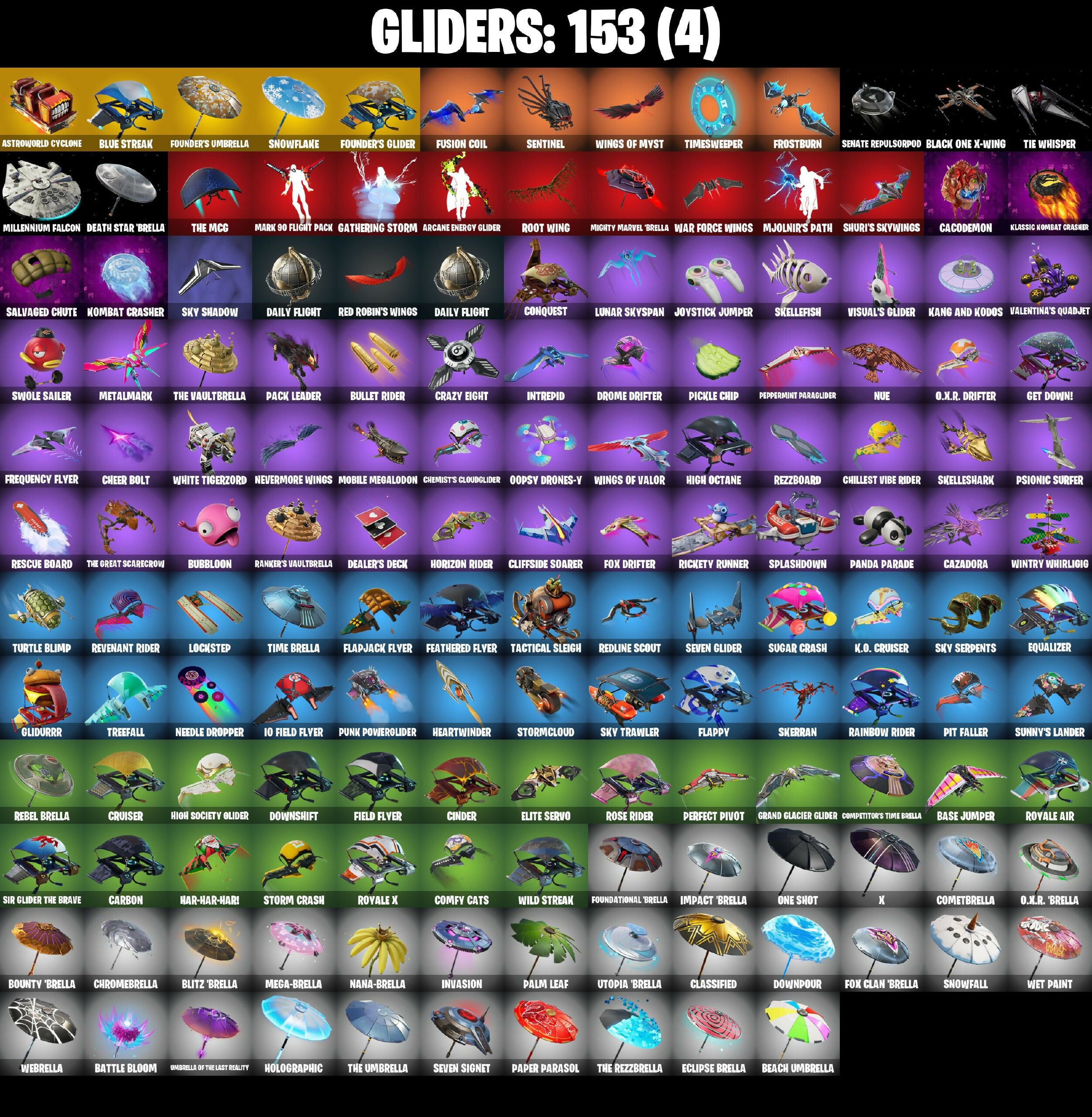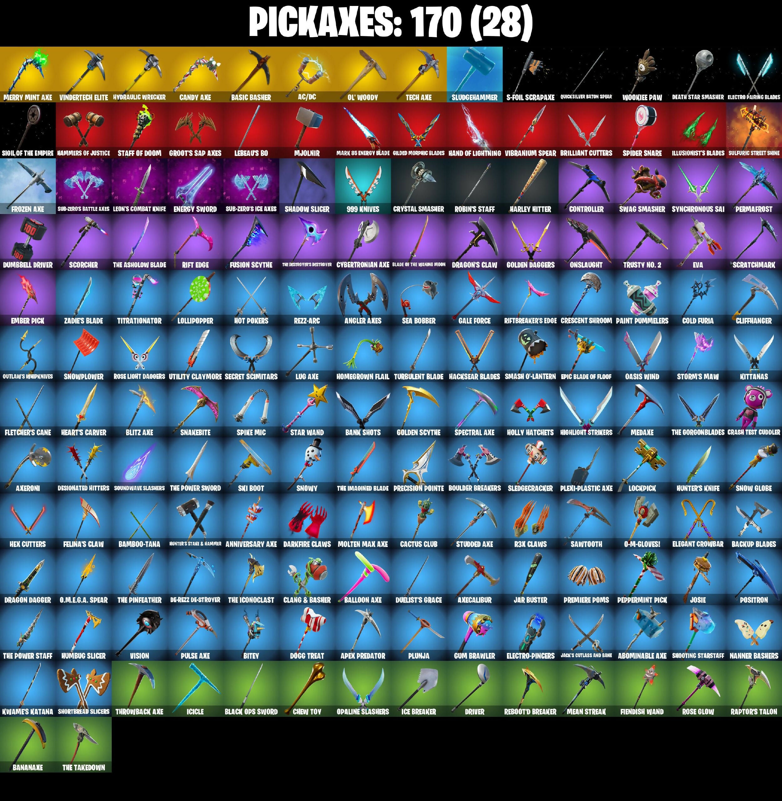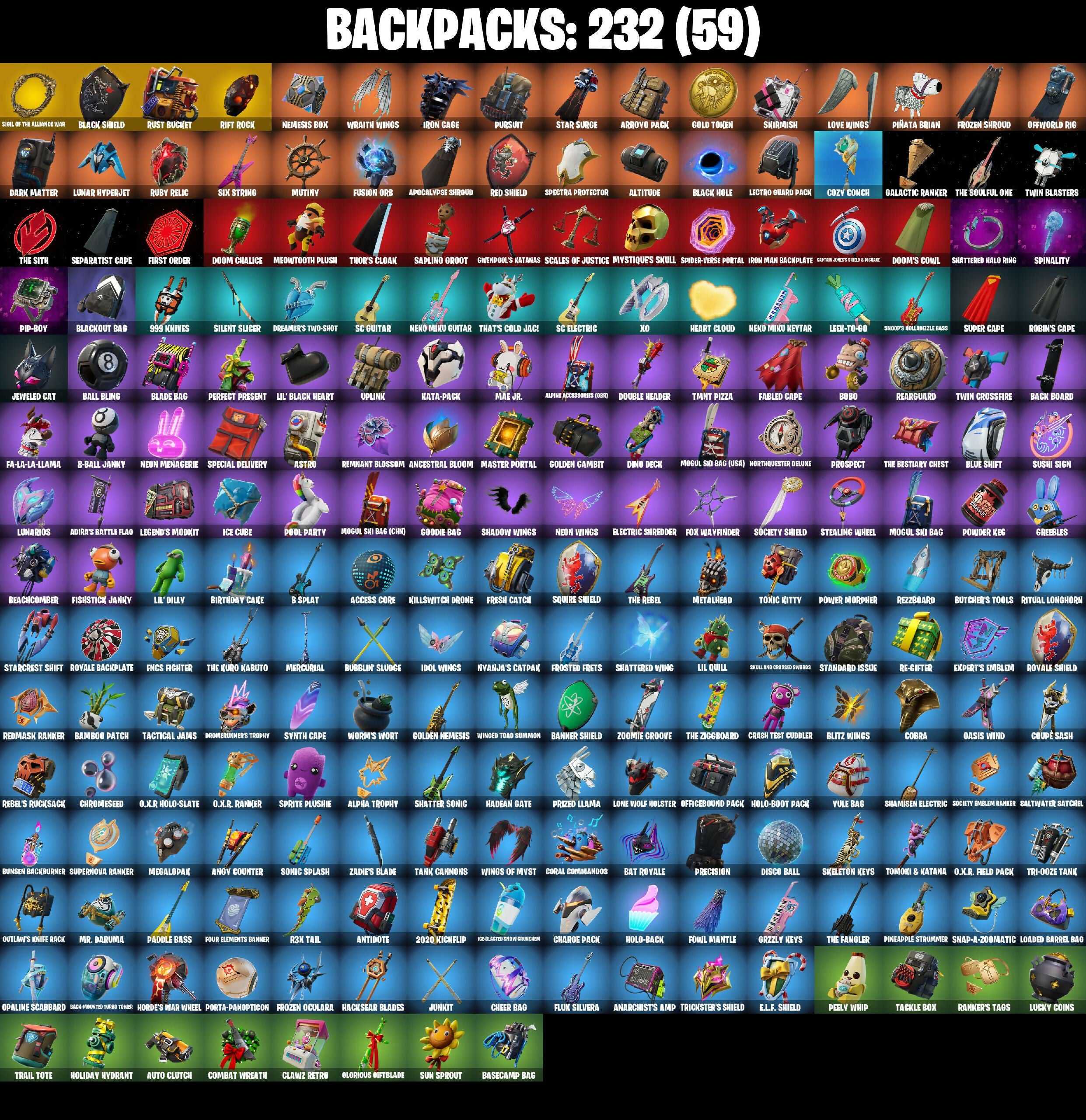 2020 Kickflip, 8-Ball Janky, 8-Ball Vs Scratch, 999 Knives, AC/DC, Abominable Axe, Access Core, Adira's Battle Flag, Agent Patch, Air Horn, Alpha Trophy, Alpine Accessories (OBR), Alpine Ace (Gbr), Altitude, Anarchist's Amp, Ancestral Bloom, Angler Axes, Angy Counter, Anniversary Axe, Antidote, Apex Predator, Apocalypse Shroud, Apt., Arcane Energy Glider, Arcane Research, Arctic Adeline, Arroyo Pack, Astro, Astroworld Cyclone, Auto Clutch, Axecalibur, Axeroni, B Splat, Back Board, Back On 74, Backup Blades, Ball Bling, Balloon Axe, Bamboo Patch, Bamboo-Tana, Bananaxe, Bank Shots, Banner Shield, Baron's Hoard, Base Jumper, Basecamp Bag, Basic Basher, Bat Royale, Battle Bloom, Battle Bus Balloon, Battle Gamer Mae, Battlehawk, Beach Umbrella, Beachcomber, Beep Beep, Behold!, Best Mates, Bi-Han, Big Dill, Big Fan, Bike To Go, Birdarang Flourish, Birthday Cake, Bitey, Black Hole, Black Knight, Black One X-Wing, Black Ops Sword, Black Shield, Blackheart, Blackout Bag, Blade Bag, Blade Of The Waning Moon, Blah Blah Blah, Blitz 'Brella, Blitz Axe, Blitz Wings, Blizzabelle, Blue Shift, Blue Squire, Blue Streak, Blue Striker, Blue Team Leader, Bobo, Boing!, Bold Stance, Bone Breaker, Boogie Down, Boulder Breakers, Bounty 'Brella, Bow Go, Bratty, Breakdown, Breakin', Breezy, Brilliant Cutters, Brilliant Striker, Brite Bomber, Brite Hatsune Miku, Bubblin' Sludge, Bubbloon, Bug Punk Sunny, Bullet Rider, Bunsen Backburner, Burn Bright, Burnoff, Butcher's Tools, Cacodemon, Cactus Club, Calculated, Call Me, Cameo Vs Chic, Candy Axe, Captain America's Shield & Backpack, Captain Clamerica, Carbide, Carbon, Carmine Rosso, Cassidy Quinn, Cat Flip, Catastrophe, Catwoman Comic Book Outfit, Cauldron Chill, Cazadora, Challenge, Champion Kyra, Champion Siren, Charge Pack, Cheer Bag, Cheer Bolt, Chemist's Cloudglider, Chew Toy, Chillest Vibe Rider, Choice Knit, Chromebrella, Chromeseed, Cinder, Clang & Basher, Clara, Classified, Clawz Retro, Clean Sweep, Click!, Cliffhanger, Cliffside Soarer, Cloaked Shadow, Cobra, Codename E.L.F., Cold Furia, Combat Tech Jules, Combat Wreath, Cometbrella, Comfy Cats, Competitor's Time Brella, Conga, Conquest, Controller, Coral Commandos, Corrupted, Count It!, Coupé Sash, Cozy Conch, Crash Test Cuddler, Crazy Eight, Crescent Shroom, Crown, Crowning Achievement, Cruiser, Crystal Smasher, Curling Iron, Cybertronian Axe, Cyclo Curl, Dab, Daily Flight, Dark Matter, Dark Voyager, Darkfire Claws, De-Rezz De-Stroyer, Dealer's Deck, Dealtin Cassidy Quinn, Death Star 'Brella, Death Star Smasher, Designated Hitters, Dill With It, Dillinger The Oherk, Dino Deck, Dino Megazord, Dip, Disco Ball, Disco Diva, Disco Fever, Doctor Doom, Dogg Treat, Doom Chalice, Doom's Cowl, Double Header, Downpour, Downshift, Doze Dab, Dragon Dagger, Dragon Daggers Song, Dragon Stance, Dragon's Claw, Dream, Dreamer's Two-Shot, Dribblin', Drift, Drippin' Flavor, Driver, Drome Drifter, Dromerunner's Trophy, Droop, Duelist's Card Trick, Duelist's Grace, Dumbbell Driver, Dusk Knight, E.L.F. Shield, Eclipse Brella, Electric Shredder, Electro Pairing Blades, Electro-Pincers, Elegant Crowbar, Elite Agent, Elite Servo, Ember Pick, Energy Sword, Envoy, Epic Blade Of Floof, Equalizer, Eva, Expert's Emblem, Explorer Emilie, FNCS Fighter, Fa-La-La-Llama, Fabled Cape, Face Palm, Feathered Flyer, Feel It, Feel The Flow, Felina, Felina's Claw, Field Flyer, Fiendish Wand, First Order, First Order Stormtrooper, Fishstick Janky, Flapjack Flyer, Flappy, Fletcher Kane, Fletcher's Cane, Flippin' Away, Flippin' Sexy, Floss, Flux Silvera, Foil Flex, For O.M.R!, Foundational Brella, Founder's Glider, Founder's Umbrella, Four Elements Banner, Fowl Mantle, Fox Clan 'Brella, Fox Drifter, Fox Wayfinder, Frequency Flyer, Fresh, Fresh Catch, Frolic, Front Page Pose, Frostburn, Frosted Frets, Frozen Axe, Frozen Oculara, Frozen Shroud, Frozen Treat Cart, Full Moon Fletcher Kane, Fusion, Fusion Coil, Fusion Orb, Fusion Scythe, Galactic Ranker, Gale Force, Gangnam Style, Gathering Storm, General's War Table, Gentleman's Dab, Get Down!, Get Funky, Gilded Morphic Blades, Glidrrr, Glorious Giftblade, Gold Token, Golden Daggers, Golden Gambit, Golden Nemesis, Golden Scythe, Golf Clap, Good Game, Well Played, Good Sportsmanship, Goodie Bag, Grand Glacier Glider, Greebles, Green Ranger, Grizzly Keys, Groot, Groot's Sap Axes, Groove Jam, Guff Gringle, Gum Brawler, Gun Show, Gwenpool's Katanas, Hacksear Blades, Hacksgear Blades, Hadean Gate, Hammers Of Justice, Hand Of Lightning, Har-Har-Har!, Harley Hitter, Have A Seat, Haylee Skye, Head Banger, Heart Cloud, Heart Sign, Heart's Carver, Heartwinder, Hello Friend, Hex Cutters, High Five, High Octane, High Society Glider, Highlight Strikers, Holiday Boxy, Holiday Hydrant, Holly Hatchets, Holo-Back, Holo-Boot Pack, Holographic, Homegrown Flail, Horde's War Wheel, Horizon Rider, Hot Pokers, Hot Stuff, Howl, Hula Hoopin', Humbug Slicer, Hunter's Knife, Hunter's Stache & Hammer, Huntress, Hybrid, Hydraulic Wrecker, Hype, Hyperion, I'm The Visual, IO Field Flyer, Ice Breaker, Ice Cube, Ice-Blasted Snow Grinshroom, Icicle, Idol Wings, Illusionist's Blades, Impact Brella, Imperial March, Intrepid, Invasion, Iridia Vayne, Iron Cage, Iron Man Backplate, It Is Finished, It's Chemistry!, It's... You?, Jabba Switchway, Jack's Cutlass And Bale, Jake Bug Dance, Jar Buster, Jedi Training, Jennifer Walters, Jeweled Cat, Jolly Jammer, Joltara, Josie, Joss, Journey Vs Hazard, Joystick Jumper, Jubilation, Jumbo Popcorn, Jungle, Junkit, K.O. Cruiser, Kang and Kodos, Kata-Pack, Keisha Cross, Killian, Killswitch, Killswitch Drone, Kittanas, Klassic Kombat Crasher, Kombat Crasher, Krisabelle, Kwame, Kwame's Katana, Laguna, Leafy Longboardin', Lebeau's Bo, Lectro Guard Pack, Leek-To-Go, Legend's Mod Kit, Leon's Combat Knife, Lightrider, Lil Ghost, Lil Quill, Lil' Black Heart, Lil' Dilly, Lil' Prancer, Lil' Zord Battle Mode, Limber Up, Loaded Barrel Bag, Lock It Up, Lockpick, Lockstep, Lollipopper, Lone Wolf Holster, Loot Stash,