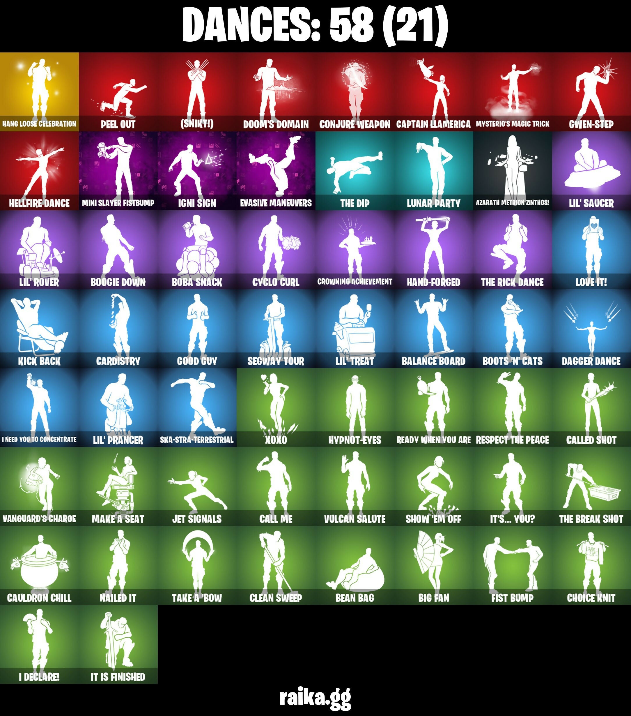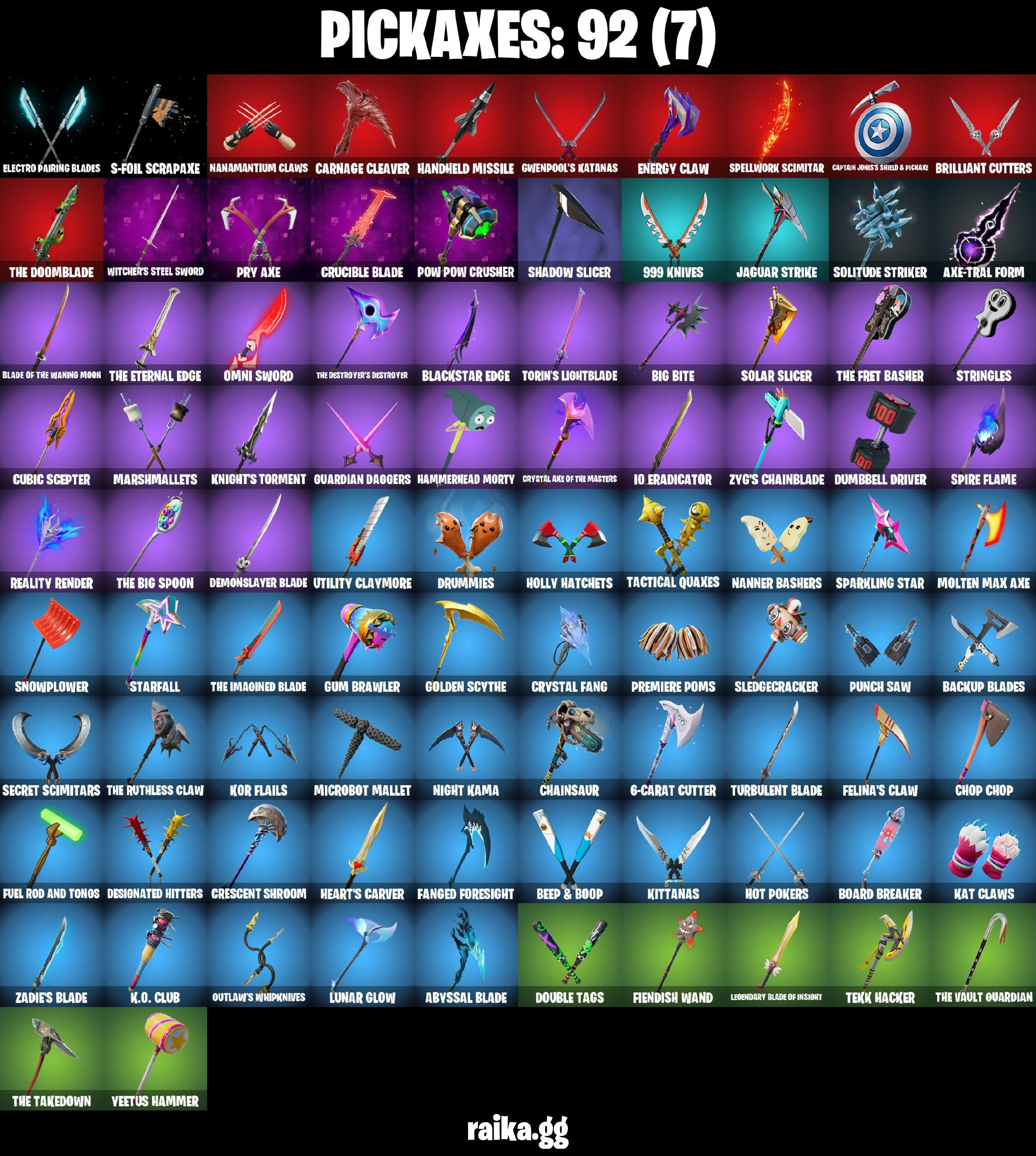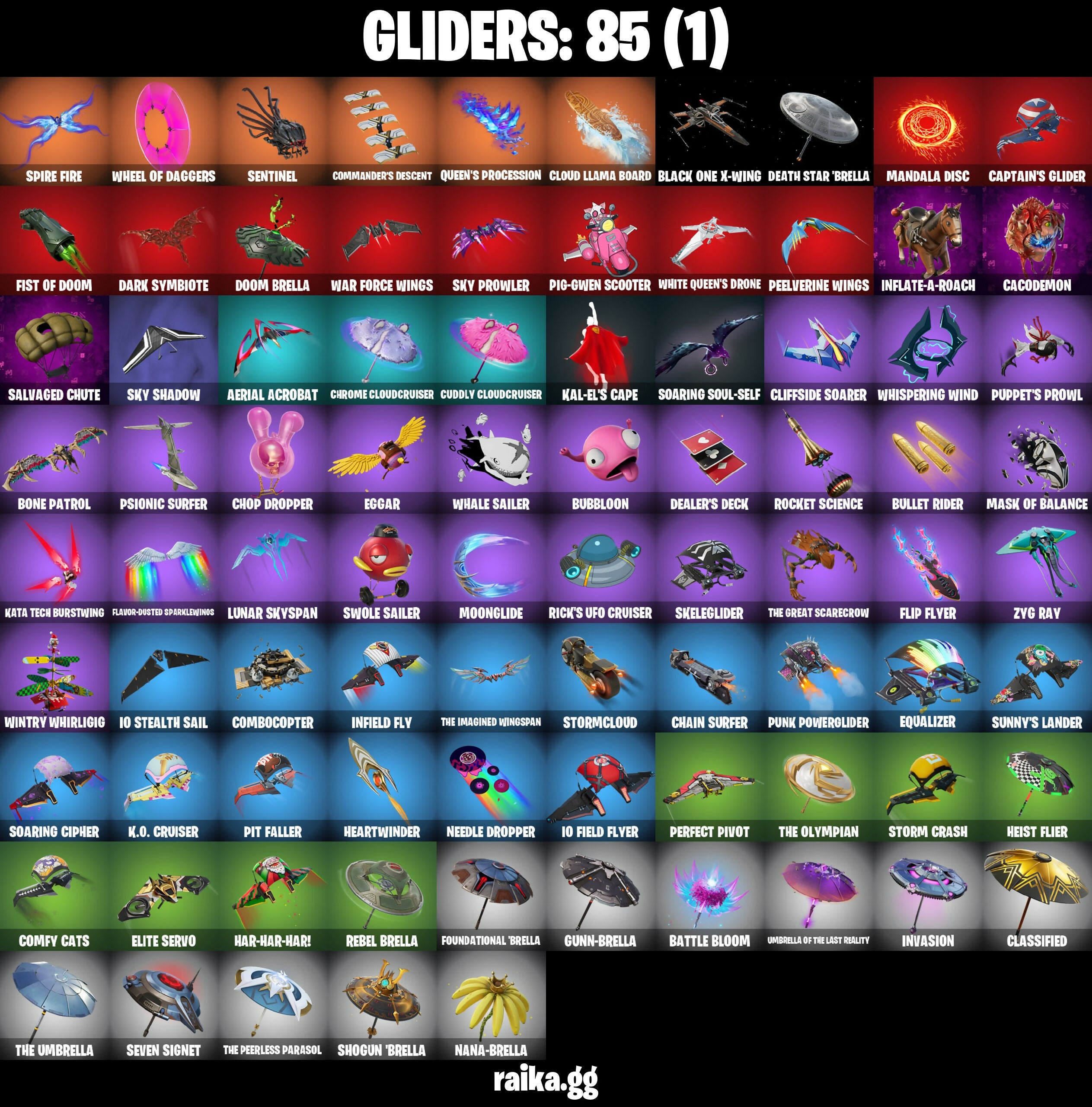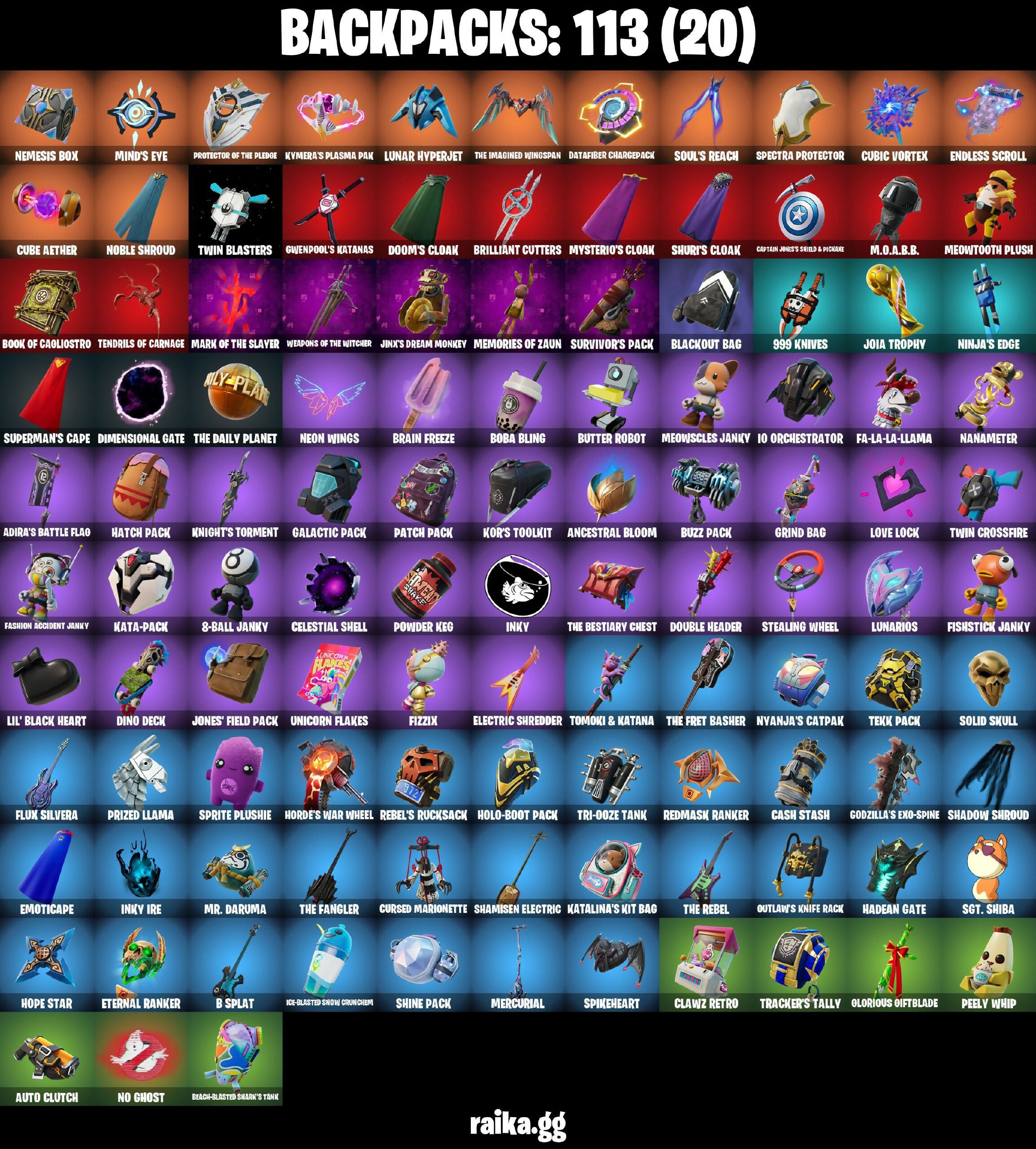 (Snikt!), 6-Carat Cutter, 8-Ball Janky, 999 Knives, Absenz, Abyssal Blade, Adira's Battle Flag, Aerial Acrobat, Agent Jones (Jump 31), Ancestral Bloom, Arcane Jinx, Arcane Vi, Arctic Adeline, Ascension Nezumi, Astro Armor, Aurum Eques, Auto Clutch, Axe-Tral Form, Azarath Metron Zinthos!, B Splat, Backup Blades, Balance Board, Battle Bloom, Beach-Blasted Shark's Tank, Bean Bag, Beep & Boop, Big Bite, Big Fan, Black One X-Wing, Blackout Bag, Blackstar Edge, Blade of the Waning Moon, Board Breaker, Boba Bling, Boba Snack, Bone Patrol, Boogie Down, Book Of Cagliostro, Boots 'N' Cats, Brain Freeze, Brilliant Cutters, Bubloon, Bullet Rider, Bullpen Brawler Dusty, Butter Robot, Buzz Pack, Cacodemon, Call Me, Called Shot, Camo War Machine, Captain Jones, Captain Jones's Shield & Pickaxe, Captain Llamerica, Captain's Glider, Cardistry, Carnage Cleaver, Cash Stash, Cauldron Chill, Celestial Shell, Chain Surfer, Chainsaur, Charged, Charlotte, Choice Knit, Chop Chop, Chop Dropper, Chrome Cloudcruiser, Classified, Clawz Retro, Clean Sweep, Cliffside Soarer, Cloud Llama Board, Club President Helsie, Cluck (Slurpy), Cold Blooded Ace, Combat Elite, Combocopter, Comfy Cats, Commander's Descent, Conjure Weapon, Crescent Shroom, Crowning Achievement, Crucible Blade, Crystal Axe of the Masters, Crystal Fang, Cube Aether, Cubic Scepter, Cubic Vortex, Cuddly Cloudcruiser, Cursed Marionette, Cyclo Curl, Dagger Dance, Dark Gwenpool, Dark Symbiote, Datafiber Chargepack, Dealer's Deck, Death Star 'Brella, Demonslayer Blade, Designated Hitters, Diamond Diva, Dimensional Gate, Dino Deck, Doctor Slone, Doctor Strange, Doom Brella, Doom's Cloak, Doom's Domain, Double Header, Double Tags, Droopy, Drummies, Dumbbell Driver, Eggar, Electric Shredder, Electro Pairing Blades, Elite Servo, Emma Frost, Emoticape, Endless Scroll, Energy Claw, Equalizer, Eternal Ranker, Evasive Maneuvers, Fa-La-La-Llama, Fabio Sparklemane, Fanged Foresight, Fashion Accident Janky, Felina, Felina's Claw, Fiendish Wand, Fishstick Janky, Fist Bump, Fist Of Doom, Fizzix, Flavor-Dusted Sparklewings, Flip Flyer, Flux Silvera, Foundational 'Brella, Fuel Rod and Tongs, Galactic Pack, Glorious Giftblade, Godzilla's Exo-Spine, Golden Scythe, Good Guy, Grind Bag, Guardian Daggers, Guff Gringle, Guggimon, Gum Brawler, Gunn-Brella, Gunnar, Gwen-Step, Gwenpool's Katanas, Hadean Gate, Hammerhead Morty, Hand-Forged, Handheld Missile, Hang Loose Celebration, Har-Har-Har!, Hatch Pack, Heart's Carver, Heartwinder, Heist Flier, Hellfire Dance, Holiday Boxy, Holly Hatchets, Holo-Boot Pack, Hope Star, Horde's War Wheel, Hot Pokers, Hypnot-Eyes, I Declare!, I Need You To Concentrate, IO Eradicator, IO Field Flyer, IO Orchestrator, IO Stealth Sail, Ice-Blasted Snow Crunch'em, Igni Sign, Infield Fly, Inflate-A-Roach, Inky, Inky Ire, Invasion, It Is Finished, It's... You?, Jaguar Strike, Jet Signals, Jinx's Dream Monkey, Joia Trophy, Jones' Field Pack, K.O. Club, K.O. Cruiser, Kal-El's Cape, Kat Claws, Kata Tech Burstwing, Kata-Pack, Katalina, Katalina's Kit Bag, Kick Back, Kittanas, Knight's Torment, Knights Torment, Kor Flails, Kor's Toolkit, Krisabelle, Kymera's Plasma Pak, Lara Croft (Gold Anniversary), Legendary Blade of Insight, Lil' Black Heart, Lil' Prancer, Lil' Rover, Lil' Saucer, Lil' Treat, Love It!, Love Lock, Lunar Glow, Lunar Hyperjet, Lunar Party, Lunar Skyspan, Lunarios, M.O.A.B.B., Make A Seat, Mandala Disc, Mark Of The Slayer, Marshmallets, Mask Of Balance, Maximum Carnage, Memories Of Zaun, Meowscles Janky, Meowtooth Plush, Mercurial, Microbot Mallet, Mina Park, Mind's Eye, Mini Slayer Fistbump, Molten Max Axe, Moonglide, Mr. Daruma, Mysterio's Cloak, Mysterio's Magic Trick, Nailed It, Nana-Brella, Nanameter, Nanner Bashers, Nanomantium Claws, Needle Dropper, Nemesis Box, Neon Wings, Neymar Jr (Exhibition), Night Kama, Ninja, Ninja's Edge, No Ghost, Noble Shroud, Nyanja's Catpak, Omni Sword, On, Outlaw's Knife Rack, Outlaw's Whipknives, Pandora's Armor Doom, Patch Pack, Peel Out, Peelverine, Peelverine Wings, Peely Whip, Perfect Pivot, Pig-Gwen Scooter, Pit Faller, Polar Peely, Pow Pow Crusher, Powder Keg, Premiere Poms, Prized Llama, Protector Of The Pledge, Prowler, Pry Axe, Psionic Surfer, Punch Saw, Punk Powerglider, Puppet's Prowl, Queen's Procession, Rachel Roth, Raz, Ready When You Are, Reality Render, Rebel Brella, Rebel's Rucksack, Redmask Ranker, Respect The Peace, Rick Sanchez, Rick's UFO Cruiser, Rocket Science, Ruby Shadows, S-Foil Scrapaxe, Salvaged Chute, Sandstone Joey, Secret Scimitars, Segway Tour, Sentinel, Seven Signet, Sgt. Shiba, Shadow Shroud, Shadow Slicer, Shamisen Electric, Shine Pack, Shogun 'Brella, Show 'Em Off, Shuri's Cloak, Sideways Warrior, Ska-Stra-Terrestrial, Skeleglider, Sky Prowler, Sky Shadow, Slayer Juice Wrld, Sled Ready Guff, Sledgecracker, Snowplower, Soaring Cipher, Soaring Soul-Self, Solar Slicer, Solid Skull, Solitude Striker, Soul's Reach, Soundwave Series - Emicida, Sparkling Star, Spectra Protector, Spellwork Scimitar, Spikeheart, Spire Assassin, Spire Fire, Spire Flame, Sprite Plushie, Starfall, Stealing Wheel, Stealth Silver, Storm Crash, Stormcloud, Stringles, Sunglasses, Sunlit Selene, Sunny, Sunny's Lander, Superman, Superman's Cape, Survivor’s Pack, Swole Sailer, Tactical Quakes, Take A Bow, Tarana (X-Tinction Armor), Tekk Hacker, Tekk Pack, Tendrils Of Carnage, The Ageless Champion, The Bestiary Chest, The Big Spoon, The Break Shot, The Cube Queen (Islandbane), The Daily Planet, The Destroyer's Destroyer, The Dip, The Doomblade, The Eternal Edge, The Fangler, The Fret Basher, The Great Scarecrow, The Imagined Blade, The Imagined Wingspan, The Olympian, The Peerless Parasol, The Rebel, The Rick Dance, The Ruthless Claw, The Takedown, The Umbrella, The Vault Guardian, Thrasher Massai, Tomoki & Katana, Toona Fish, Torin's Lightblade, Tracker's Tally, Trenchcoat, Tri-Ooze Tank, Tsuki 2.0, Turbulent Blade, Twin Blasters, Twin Crossfire, Umbrella Of The Last Reality, Unicorn Flakes, Utility Claymo