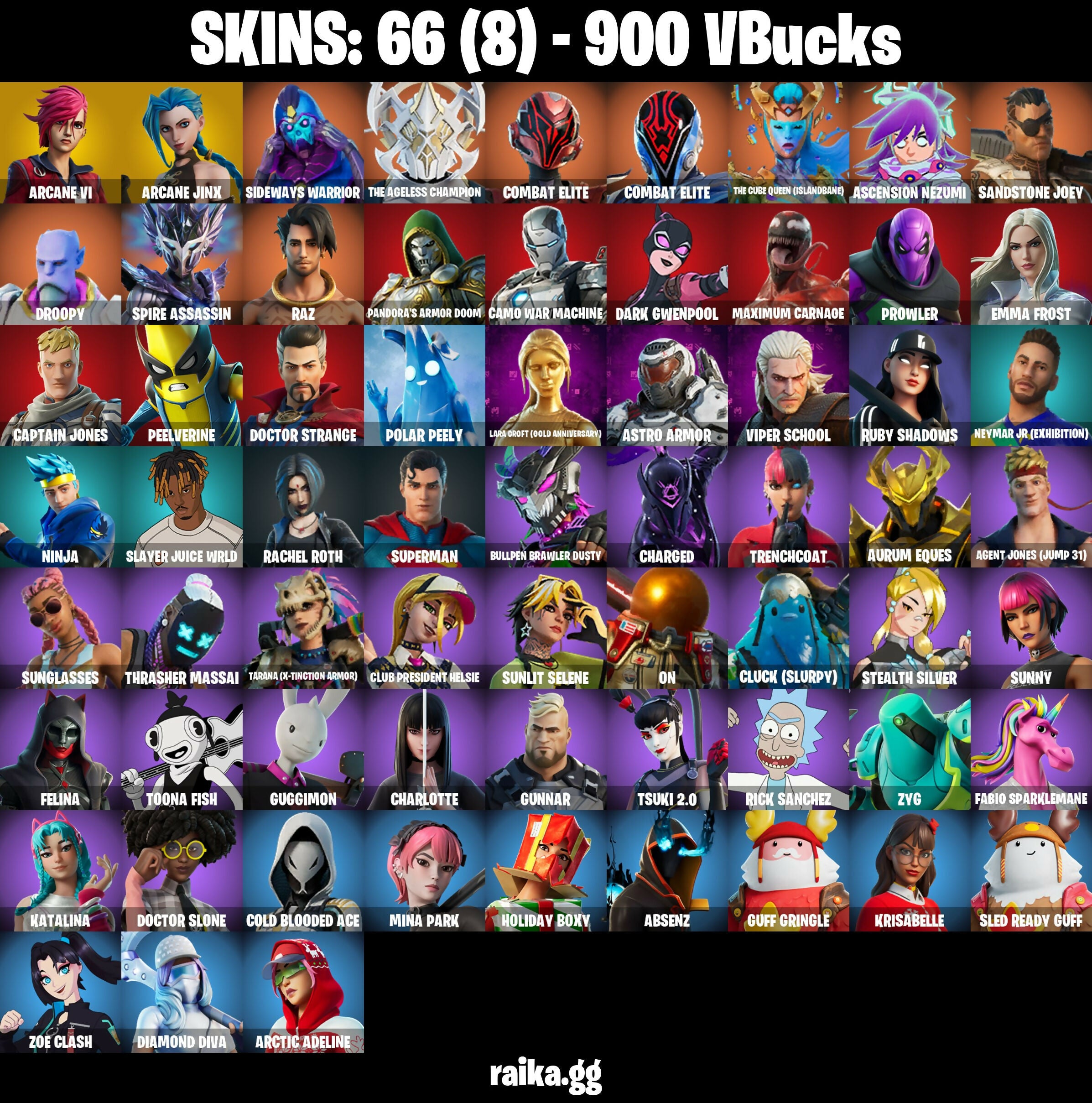 [PC/PS/XB/NIN] 66 OG Skins | Arcane Vi | Arcane Jinx | Lara Croft (Gold) | Kor | The Ageless Champion | Combat Elite | Droopy | 900 VB