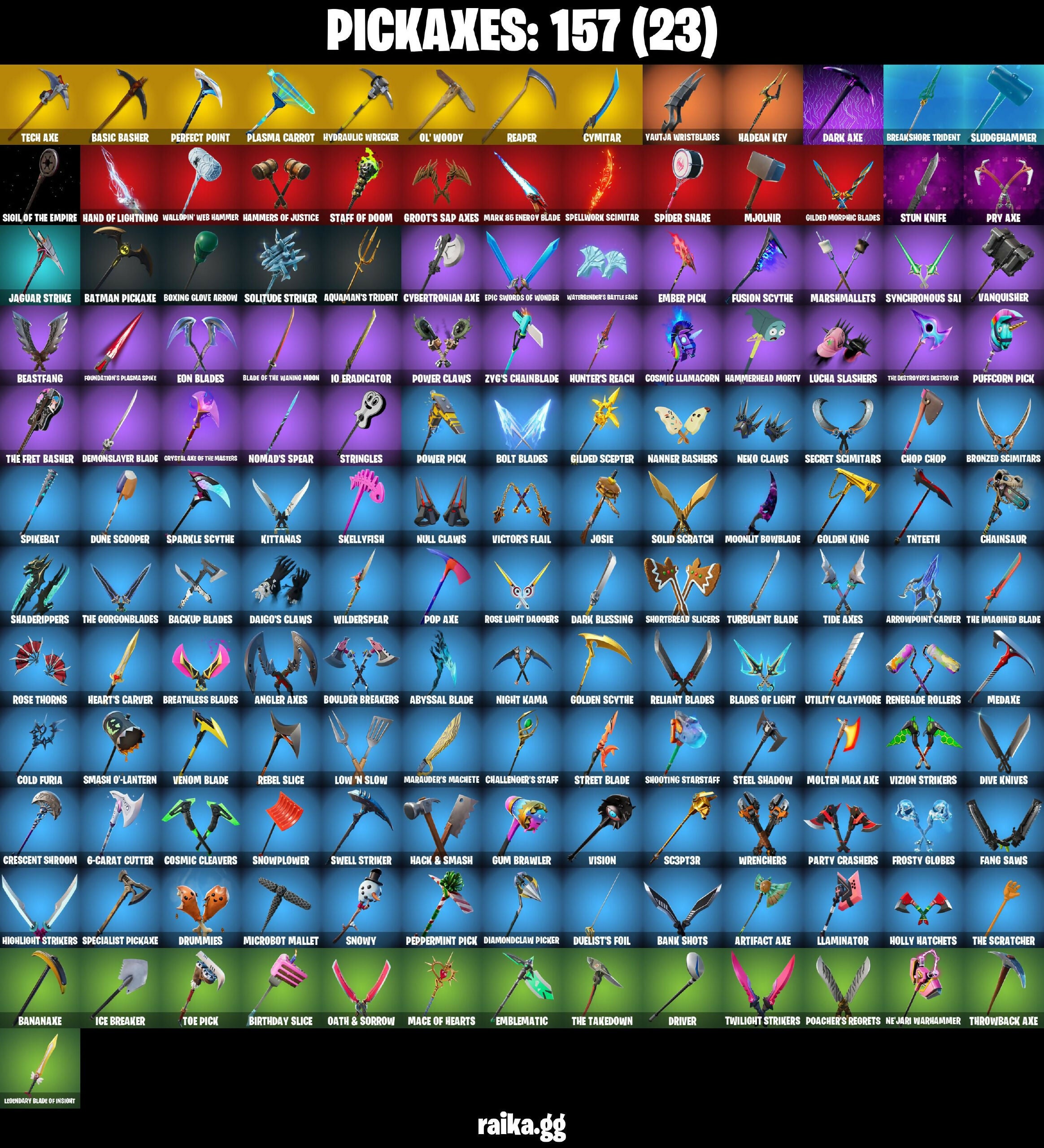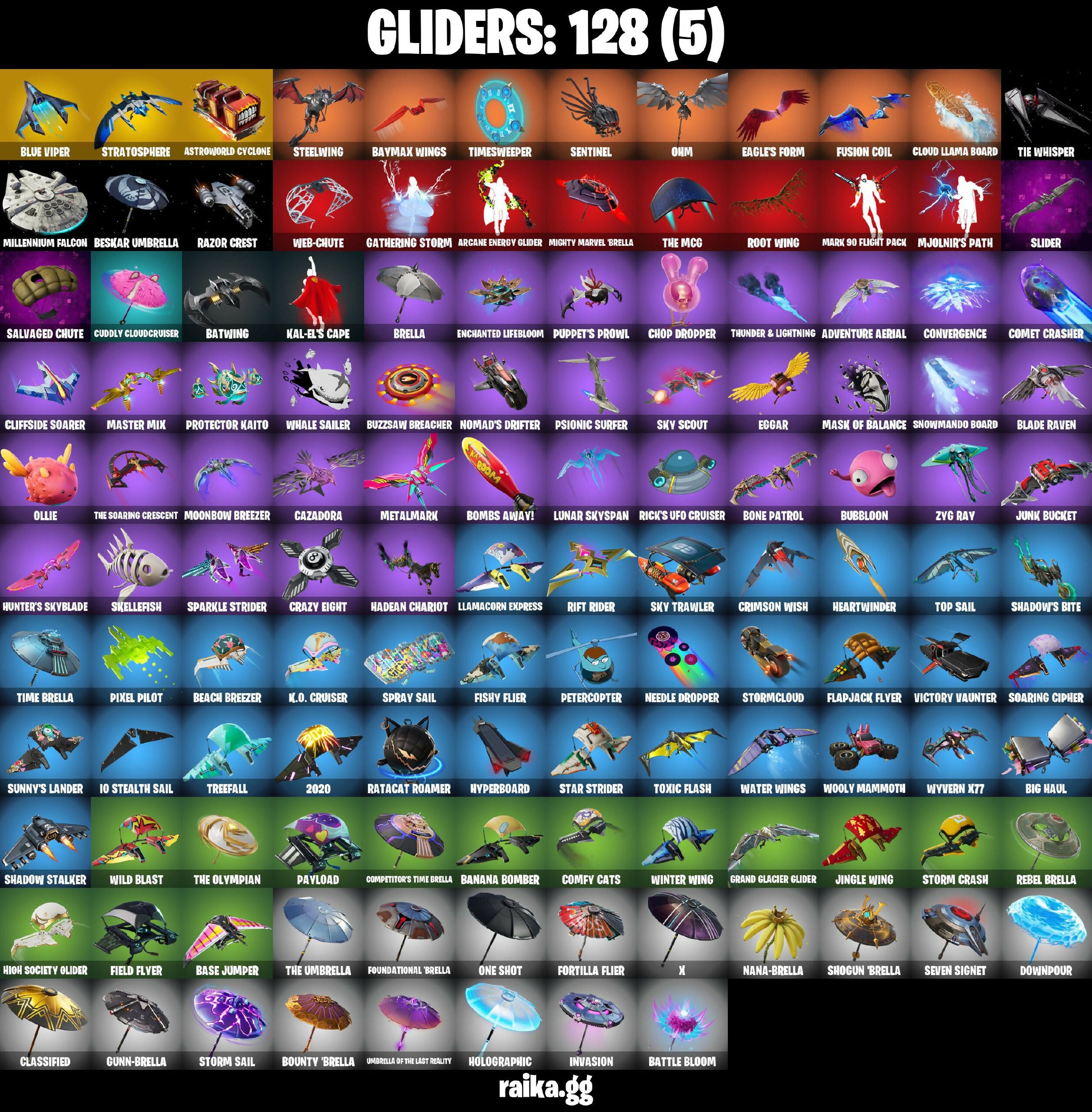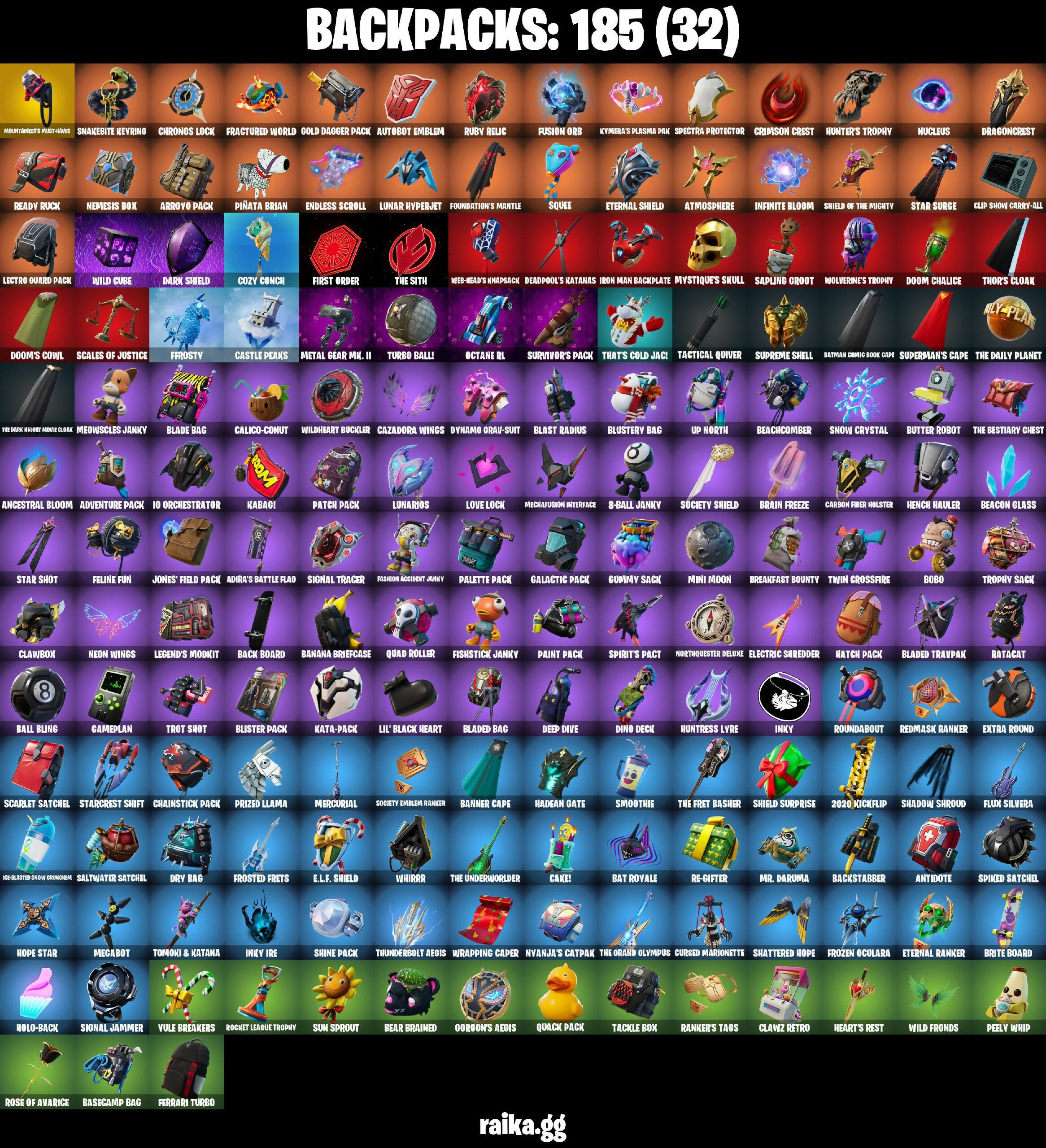 10 Stealth Sail, 2020, 2020 Kickflip, 6-Carat Cutter, 8-Ball Janky, A Goat, A Warrior Prepares, AbseNz, Abyssal Blade, Adira's Battle Flag, Adventure Aerial, Adventure Pack, Agent Jones (Jump 31), Agent Peely, Air Shredder, Alli, Ancestral Bloom, Angler Axes, Antidote, Aphrodite, Aquaman's Trident, Arcane Energy Glider, Arrowpoint Carver, Arroyo Pack, Artemis, Arthur Curry, Artifact Axe, Assault Trooper, Astro Antidote, Astro Jack, Astroworld Cyclone, Atmosphere, Autobot Emblem, Avatar's Flourish, B.R.U.T.E. Gunner, Back Board, Backstabber, Backup Blades, Ball Bling, Banana Bomber, Banana Briefcase, Bananaxe, Bank Shots, Banner, Banner Cape, Banner Trooper, Base Jumper, Basecamp Bag, Basic Basher, Bat Royale, Batman Comic Book Cape, Batman Comic Book Outfit, Batman Pickaxe, Battle Bloom, Battle-Tested, Batwing, Baymax Wings, Beach Bomber, Beach Breezer, Beachcomber, Beacon Glass, Bean Bag, Bear Brained, Bear Hug, Beastfang, Beep Beep, Beskar, Beskar Umbrella, Big Haul, Birthday Slice, Black Eternal Knight, Blade Bag, Blade Of The Waning Moon, Blade Raven, Bladed Bag, Bladed Travpak, Blades Of Light, Blast Radius, Blister Pack, Blizzard Bomber, Blowing Bubbles, Blue Viper, Blustery Bag, Bob Cut, Bobo, Boing!, Bolt Blades, Bombs Away!, Bone Patrol, Boogie Down, Boomin', Boop!, Boots 'N' Cats, Boulder Breakers, Bounty 'Brella, Boxing Glove Arrow, Brain Freeze, Breakfast Bounty, Breakneck, Breakpoint, Breakshore Trident, Breathless Blades, Brella, Brite Board, Bronzed Scimitars, Bubloon, Bullseye, Burnable Meowscles, Burning Ambition Valeria, Burpee, Burst Case Scenario, Butter Robot, Buzzsaw Breacher, Cake!, Calico-Conut, Call Me, Cap Kick, Carbon Fiber Holster, Card Drop, Cardistry, Castle Peaks, Cazadora, Cazadora Wings, Cerberus, Chainsaur, Chainstick Pack, Challenger Menace - Flame, Challenger's Staff, Charlotte, Chicken Wing It, Choice Knit, Chop Chop, Chop Dropper, Chronos Lock, Classic Wolverine, Classified, Clawbox, Clawz Retro, Clean Sweep, Cliffside Soarer, Clip Show Carry-All, Cloud Llama Board, Cluck, Cobra Kai, Codename E.L.F., Coin Flip, Cold Furia, Comet Crasher, Comfy Cats, Competitor's Time Brella, Conch Call, Convergence, Corrupted, Cosmic Cleavers, Cosmic Llamacorn, Count It!, Cozy Commander, Cozy Conch, Crazy Eight, Crescent Shroom, Crimson Crest, Crimson Wish, Crowned, Crowning Achievement, Crystal Axe Of The Masters, Cuddly Cloudcruiser, Cursed Marionette, Cybertronian Axe, Cyclo Curl, Cymitar, D'Ark, Dabstand, Dagger Dance, Daigo's Claws, Dance Monkey, Dark Axe, Dark Blessing, Dark Jonesy, Dark Red Knight, Dark Shield, Dark Side, Dark Wild Card, Dawn Duelist Nisha, Deadpool's Katanas, Deep Dab, Deep Dive, Deep End, Demonslayer Blade, Derby Dynamo, Diamond Diva, Diamond Throne, Diamondclaw Picker, Dino Deck, Dive Knives, Dizzie, Doctor Slone, Doom Chalice, Doom's Cowl, Downpour, Dragoncrest, Dramatic Flares, Driver, Droop, Droopy V, Drummies, Dry Bag, Duelist's Foil, Dune Scooper, Dynamo Grav-Suit, E.L.F. Shield, Eagle, Eagle's Form, Eggar, Electric Shredder, Electro Shuffle, Ember Pick, Emblematic, Enchanted Lifebloom, Endless Scroll, Eon Blades, Epic Swords Of Wonder, Eternal, Eternal Ranker, Eternal Shield, Evasive Maneuvers, Extra Round, Face Palm, Fade, Fancy Footwork, Fancy Peter Griffin, Fang Dance, Fang Saws, Fashion Accident Janky, Featherweight, Feline Fun, Ferrari Turbo, Ffrosty, Field Flyer, First Order, Fishstick Janky, Fishy Flier, Fist Bump, Flapjack Flyer, Flippin' Away, Flux Silvera, Fncs Fit, Foil Flex, Fortilla Flier, Foundation's Mantle, Foundation's Plasma Spike, Foundational 'Brella, Fractured World, Frost Squad, Frosted Frets, Frosty Globes, Frozen Fishstick, Frozen Nog Ops, Frozen Oculara, Fusion Coil, Fusion Orb, Fusion Scythe, Galactic Pack, Galaxia, Galaxy Scout, Gameplan, Gangnam Style, Gathering Storm, Gear Specialist Maya, Get Loose, Get Out Of Your Mind, Ghoul Trooper, Gilded Morphic Blades, Gilded Reality, Gilded Scepter, Gold Brutos, Gold Brutus, Gold Dagger Pack, Gold Meowscles, Gold Midas, Gold Skye, Gold Tntina, Golden King, Golden Scythe, Good Guy, Gorgon's Aegis, Grand Glacier Glider, Green Arrow, Grey, Groots Sap Axes, Guggimon, Gum Brawler, Gummy Sack, Gunn-Brella, Hack & Smash, Hadean Chariot, Hadean Gate, Hadean Key, Hammerhead Morty, Hammers Of Justice, Hand Of Lightning, Hand-Forged, Happy Kit, Hatch Pack, Have A Seat, Hazard, Headpiece, Heart Sign, Heart's Carver, Heart's Rest, Heartwinder, Helmet, Helmet On, Hench Hauler, High Five, High Society Glider, Highlight Strikers, Holly Hatchets, Holo Foil, Holo-Back, Holographic, Hoodie, Hope, Hope Star, Hot Stuff, Hula Hoopin', Hunter's Reach, Hunter's Skyblade, Hunter's Trophy, Huntress Lyre, Hydraulic Wrecker, Hyperboard, I Declare!, I'm A Mystery, IDK, IO Eradicator, IO Orchestrator, Ice Breaker, Ice-Blasted Snow Gronokami, Immortal Form, Imperial March, Imperial Stormtrooper, Infinite Bloom, Inky, Inky Ire, Introducing..., Invasion, Invisible Cut, Iris, Iron Man Backplate, It Is Finished, It's... You?, Jaguar Strike, Jaywalking, Jedi Training, Jennifer Walters, Jingle Wing, Jones' Field Pack, Josie, Junk Bucket, K.O. Cruiser, Kabagi!, Kal-El's Cape, Kata-Pack, Kendo, Keyed Up, Kick Back, Kintsugi Daigo, Kittanas, Knife Sharpener, Kondor, Korra, Krisabelle, Kymera's Plasma Pak, Lara Croft, Leapin', Lectro Guard Pack, Legend's Modkit, Legendary Blade Of Insight, Lil' Black Heart, Lil' Monster, Lil' Saucer, Lil' Treat, Lil' Warthog, Llamacorn Express, Llambro, Llaminator, Lock It Up, Lorenzo The Reckless, Love It!, Love Lock, Low 'n Slow, Lt. Evergreen, Lucha Slashers, Lucky Nyanja, Lunar Charge, Lunar Hyperjet, Lunar Skyspan, Lunarios, Lunch Break, Mace Of Hearts, Mancake, Maranello Racer, Marauder's Machete, Mariposa, Mark 86 Energy Blade, Mark 90 Flight Pack, Marshmallets, Mashed Potato, Mask Of Balance, Mask Off, Masked Scuba Jonesy, Master Mix, Mechafusion Interface, Medaxe, Medusa, Megabot, Members Only, Meowscles Janky, Mercurial, Metal Gear Mk. II, Metalmark, Microbot Ma