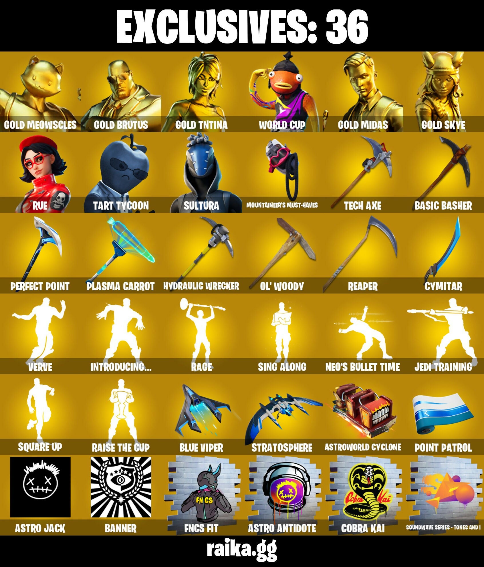 [PC/PS/XB/NIN] STACKED 159 OG Skins | OG RUE | Gold Meowscles | Gold Brutus | Gold TNTina | FishStick WORLD CUP | Gold Midas | Gold Skye | Lara Croft| Tart Tycoon | Rage | Galaxia | Codename E.L.F