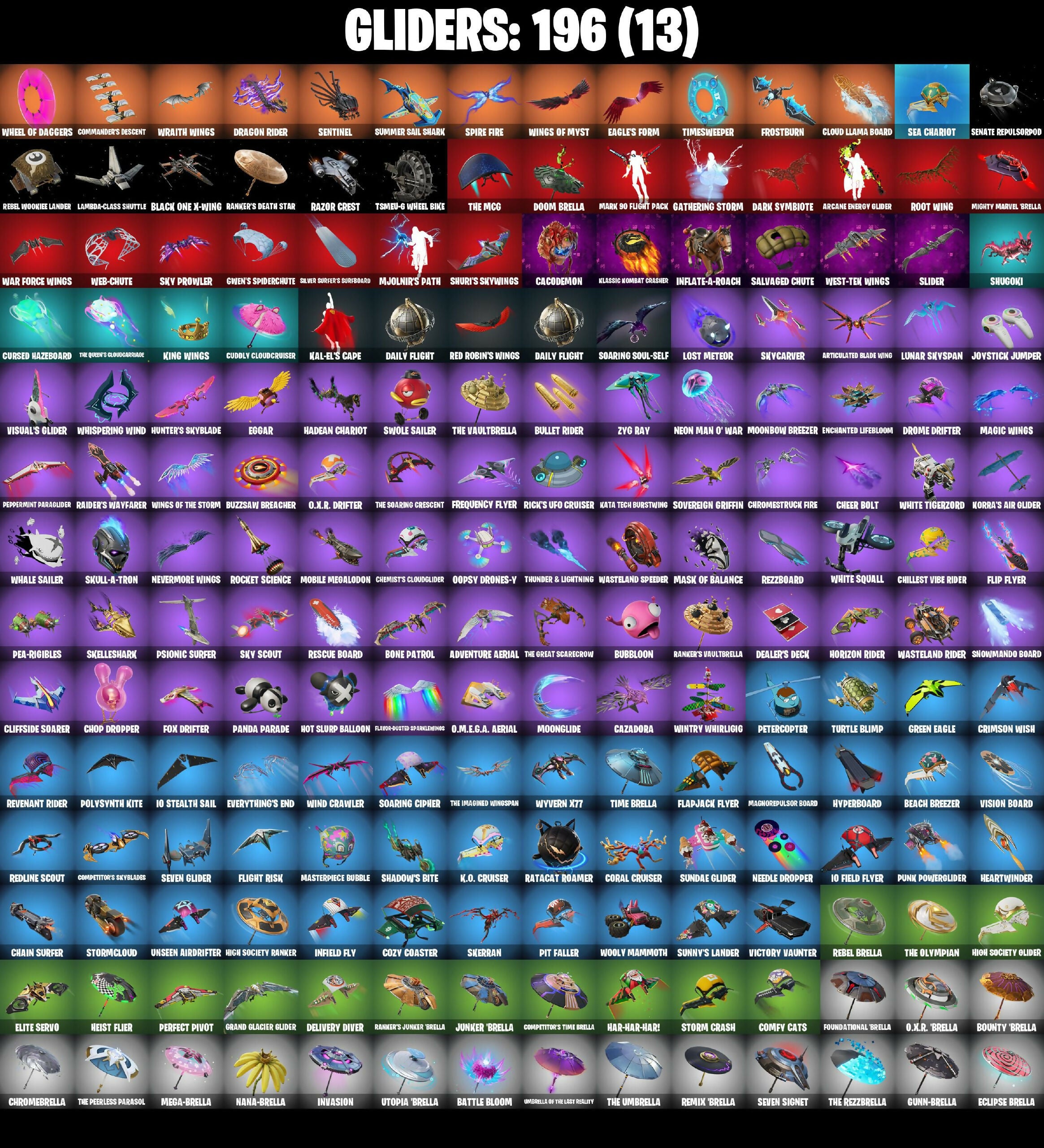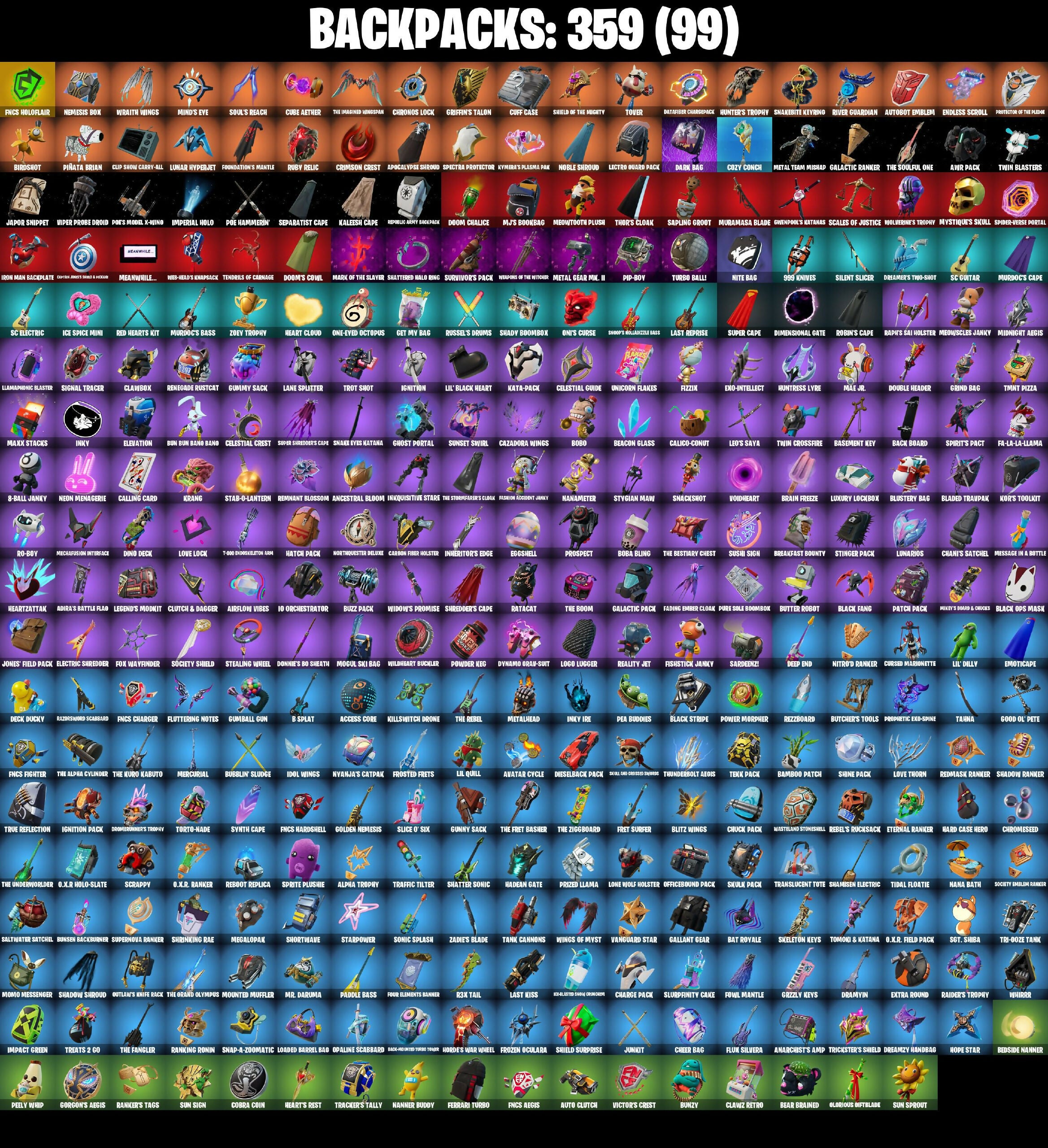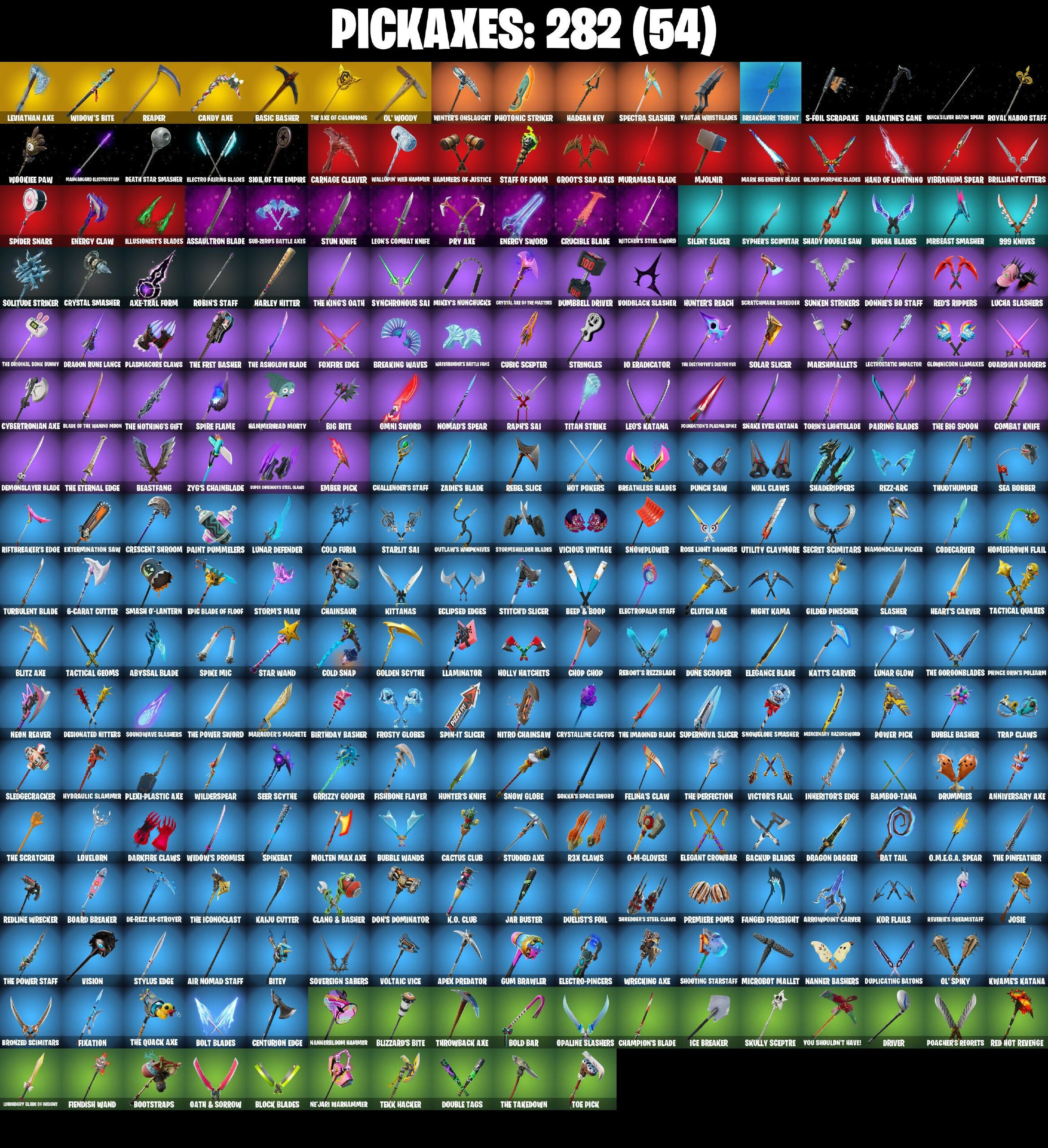 10 Orchestrator, 4Da, 6-Carat Cutter, 8 Splat, 8-Ball Janky, 999 Knives, A Warrior Prepares, Aang, Aang's Air Sphere, Absinz, Abyssal Blade, Access Core, Accurate Melody Zenith 2K20, Adira, Adira's Battle Flag, Adventure Aerial, Afterfest Busdriver, Agent Jones, Agent Jones (Jump 3D), Agent Patch, Air Nomad Staff, Airflow Vibes, Alpha Trophy, Always Fantabulous, Anarchist's Amp, Ancestral Bloom, Anniversary Axe, Antonia, Apex Predator, Aphrodite, Apocalypse Sirupod, Apprentice Ivin, AraChrobatics, Arcane Energy Glider, Arcane Research, Arctic Adeline, Arise, Arm The Pumpkin!, Armored Stage Knight Lunar, Arrowpoint Carver, Artemis, Articulated Blade Wing, Ascension Nizumi, Assault Trooper, Assaultron Blade, Astrea, Astro Armor, Asuka Tano, Augury, Aura, Aurelian, Auto Clutch, Autobot Emblem, Avatar Cycle, Avatar State Aang, Avatar's Flourish, Avir Pack, Aw, Shucks., Axe-Tral Form, Ayla Winn, Back Board, Back Ice The Flash, Backlash, Backstroke, Backup Blades, Balance Board, Balanced, Bamboo Patch, Bamboo-Tana, Baron’s Hoard, Basement Key, Basic Basher, Bat Royale, Battle Bloom, Battle Bomber Max, Battle Prep, Battle Prep: Super, Battle-Tested, Be Seeing You, Beach Breezer, Beacon Glass, Bean Bag, Bear Brained, Bear Hug, Beast Blastin', Beastfang, Beatzbunny, Beep & Boop, Benzo The Destroyer, Bernie, Beside Nanner, Beskar, Bhangra Boogie, Big Bite, Bike To Go, Billy Bounce, Bim Bam Boom, Birdarang Flourish, Birdshot, Birthday Basher, Bitey, Black Fang, Black One X-Wing, Black Ops Mask, Black Stripe, Blade of the Shrouded Moon, Bladed Travpak, Blazing Burst Tiger Thorn, Blazing For Cerebus, Blitz Axe, Blitz Wings, Blizzard's Bite, Block Blades, Blooming Bouquet, Blowin' Up, Blustery Bag, Board Breaker, Boardwalk Ruby, Boba Bling, Boba Snack, Bobo, Bold Bar, Bolt Blades, Bone Breaker, Bone Patrol, Boogie Down, Boomin', Boots 'N Cats, Bootstraps, Bounce Wit It, Bounty Brella, Bow Go, Bracer, Brain Freeze, Breakfast Bounty, Breaking Point, Breaking Waves, Breakshore Trident, Breathless Blades, Brezabelle, Brilliant Cutters, Bring It, Bring It Around, Brite Moves, Brite Raider, Bronzed Scimitars, Bubble Basher, Bubble Wands, Bubblegum Ninja, Bubblin' Sludge, Bubbloon, Bugha, Bugha Blades, Bullet Bramble Dusty, Bullet Rider, Bulletproof, Bullseye, Bun Bun Bang Bang, Bunny Brawler, Bunsen Backburner, Bunzy, Burn Bright, Burnoff, Butcher's Tools, Butter Robot, Buzz Beat, Buzz Pack, Buzzsaw Breacher, Bytes, Cacodemon, Cactus Club, Calico-Conut, Called Shot, Calling Card, Camille, Candy Axe, Captain Elamerica, Captain Plasma, Carbon Fiber Holster, Card Drop, Cardistry, Carnage, Carnage Cleaver, Cauldron Chill, Cazadora, Cazadora Wings, Celestial Crest, Celestial Guide, Centurion, Centurion Edge, Cerberus, Chain Surfer, Chainsaur, Challenger's Staff, Champion Kyra, Champion Stash'd, Champion's Blade, Champion's Celebration, Chani, Chani's Satchel, Charge Pack, Charlotte, Cheer Bag, Cheer Bolt, Chef's Special, Chemist's Cloudglider, Chicken Wing It, Chillest Vibe Rider, Choice Knit, Chop Chop, Chop Dropper, Chrome Punk, Chromebrella, Chromeseed, Chromestruck Fire, Chronos Lock, Chuck Pack, Chugga-Chugga, Clang & Basher, Clawbox, Clawz Retro, Clean Sweep, Cliff Case, Cliffside Soarer, Clinical Crosser, Clip Show Carry-All, Cloud Llama Board, Cloud Striker, Club President Lexa, Cluck, Cluck (Slurpy), Clutch & Dagger, Clutch Axe, Cobra Coin, Codecaver, Codsworth's Cleanup, Cold Furia, Cold Snap, Collector Clio Tango, Combat Elite, Combat Knife, Comfy Cats, Commander's Descent, Competitor's Skyblades, Competitor's Time Brella, Conch Call, Controller Crew, Coral Cruiser, Count It!, Cozy Coaster, Cozy Commander, Cozy Conch, Crack It, Crackdown, Crackshot, Craganabella, Crescent Shroom, Crimson Crest, Crimson Wish, Crowning Achievement, Crucible Blade, Crystal, Crystal Axe of the Masters, Crystal Smasher, Crystalline Cactus, Cube Aether, Cubic Scepter, Cuddly Cloudcruiser, Curling Iron, Cursed Hazeboard, Cursed Marionette, Cybertronian Axe, Cyclo Curl, Daba, Dagger Dance, Dahlia, Daily Flight, Dance Monkey, Dancin' Domino, Danica, Dark Bag, Dark Bomber, Dark Side, Dark Symbiote, Darkfire Claws, Darklands Birth Raider, Darth Vader, Datasurf Charger, Dawn Dusket Ninja, Daywalker's Kata, De-Rezz De-Stroyer, Deadpool's Sidekick, Dealer's Deck, Death Star Smasher, Deck Ducky, Deep End, Delivery Diver, Demonslayer Blade, Desert Dawn Lyric, Detonated Hitters, Diamond Diva, Diamond Throne, Diamondclaw Picker, Dice Roll, Die With A Smile, Dieselback Pack, Dimensional Gate, Dino Deck, Dino Megazord, Dirtbike Challenge, Do The Split, Doctor Doom, Doctor Slone, Don's Dominator, Donatello, Donnie's Bo Sheath, Donnie's Bo Staff, Doom Brella, Doom Chalice, Doom Slayer, Doom's Cowl, Dormaerunner's Trophy, Double Header, Double Tags, Doze Dab, Dragon Dagger, Dragon Mages Song, Dragon Rider, Dragon Rune Lance, Dramatic Flares, Dramyin, Dreamer's Two-Shot, Dreamzy Handbag, Dribblin', Drippin' Flavor, Driver, Drome Drifter, Droopy, Drummies, Duelist's Foil, Dumbbell Driver, Dumbo, Dune Scooper, Dunk Storm, Duplicates, Duplicating Batons, Dusk Knight, Dusty, Dusty Daredevil, Dynamic Dribbler, Dynamo Grav-Suit, Eagle, Eagle's Form, Echo, Eclipse Brella, Eclipsed Edges, Eggar, Eggshell, Electric Shredder, Electro Pairing Blades, Electro Shuffle, Electro-Pincers, Electropalm Staff, Electrostatic Impactor, Elegance Blade, Elegant Crowbar, Elevation, Elite Servo, Ember Pick, Emoticape, Emperor Palpatine, Empress Fan Dance, Enchanted Lifebloom, Endless Scroll, Energy Claw, Energy Sword, Epic Blade of Floof, Era, Eren Jaeger, Erisa, Eternal Ranker, Evasive Maneuvers, Everything's End, Evie, Ex, Exo-Intellect, Expressionism, Extermination Saw, Extra Round, FFC Sparkplug, FNCS Aegis, FNCS Charger, FNCS Fighter, FNCS Hardshell, FNCS Holodial, Fa-la-la-llama, Fable Sparkleflame, Fading Ember Cloak, Fancy Feet, Fancy Peter Griffin, Fang Dance, Fanged Foresight, Fashion Accident Janky, Feel The Force, Felina, Felina's Claw, Ferrari Turbo, 