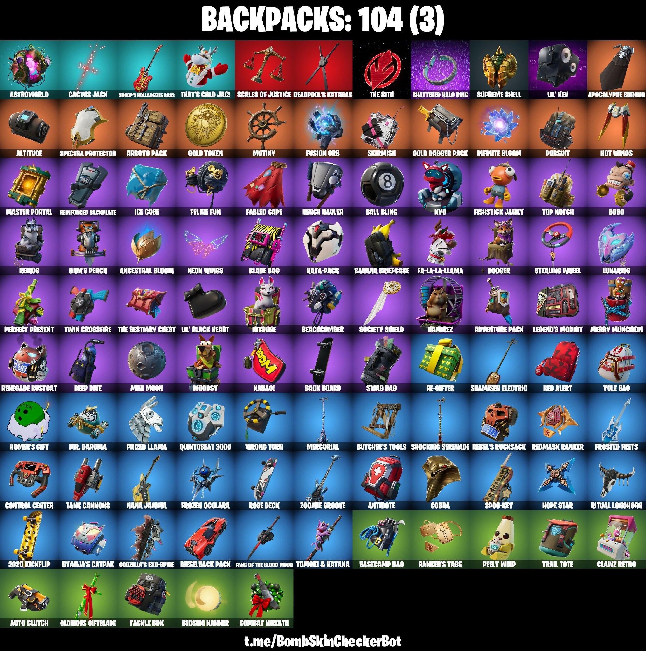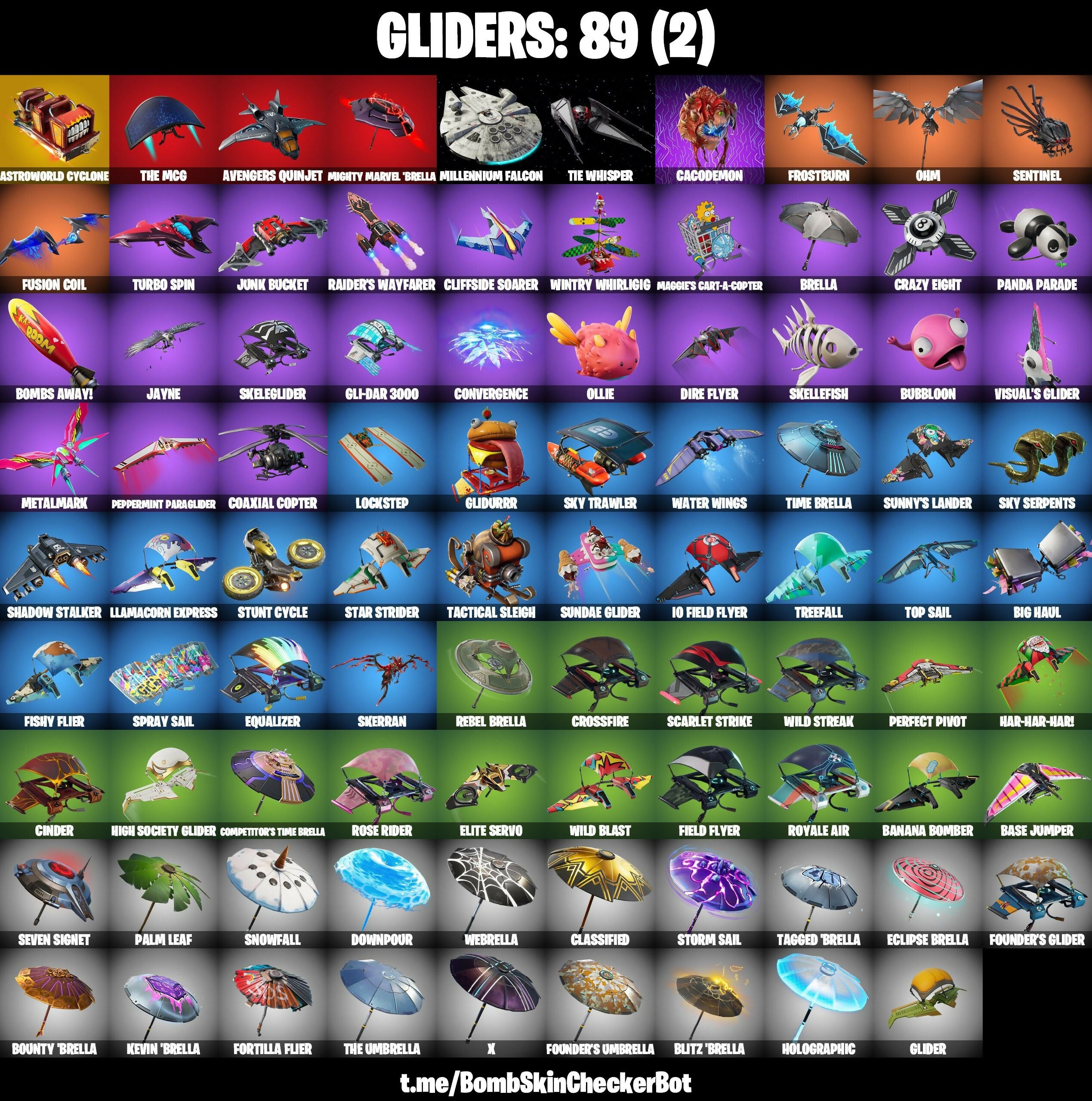 1-Ball, 6-Carat Cutter, 999 Knives, A Warrior Prepares, Access Core, Adventure Aerial, Adventure Pack, Agent Jones, Agent Peely, Ahsoka Tano, Ahsoka'S Staff, Air Horn, Air Shredder, Ancestral Bloom, Antonia, Apocalypse Shroud, Aquaman, Aquaman'S Trident, Arachrobatics, Arcane Energy Glider, Arctic Adeline, Arroyo Pack, Astrea, Astro Jack, Astroworld, Astroworld Cyclone, Auto Clutch, Autobot Emblem, Ayida, B Splat, Back Board, Backstabber, Backup Blades, Balance Board, Banana Bomber, Banana Briefcase, Bananaxe, Basement Key, Bat Royale, Batman Comic Book Cape, Batman Comic Book Outfit, Batman Pickaxe, Battle Call, Battle Prep, Battle Prep: Super, Batwing, Batwing Bonespike, Beach Breezer, Beachcomber, Beacon Glass, Bear Hug, Beastfang, Beep Beep, Big Bite, Big Fan, Big Haul, Bitter Sweets, Black Mounted Bombs Away, Blade Of The Waning Moon, Bladed Traypak, Blitz Axe, Blizzard'S Bite, Blustery Bag, Board Breaker, Boba Bling, Boba Snack, Bobo, Bomb Bouquet, Bombs Away!, Bone Patrol, Boneless, Boogie Down, Boomin', Bounty 'Brella, Boxing Glove Arrow, Breakfast Bounty, Breezabelle, Brella, Bronzed Scimitars, Brutus, Bubble Wands, Bubbloon, Bun Bun Bang Bang, Buzzsaw Breacher, Bytes, Cacodemon, Cactus Jack, Calico-Conut, Call Me, Called Shot, Carbon Fiber Holster, Cardistry, Cazadora, Cazadora Wings, Celestial Crest, Celestial Guide, Chainsaur, Chainstick Pack, Champion Balisong, Chaos Director, Chaotic Crawler, Charge Pack, Chef'S Special, Chess Master, Chili-La-La-Llama, Choice Knit, Chop Dropper, Chrome Punk, Chromebrella, Chromeseed, Chromestruck Fire, Chronos Lock, Clang & Basher, Classified, Clawbox, Clawz Retro, Clean Sweep, Clutch & Dagger, Codecarver, Coin Flip, Cold Furia, Combat Cue, Comfy Cats, Commander's Descent, Competitor'S Time Brella, Convergence, Coral Commandos, Cosmic Llamacorn, Count It!, Crack It, Crescent Shroom, Crimson Crest, Crimson Polestar, Crimson Wish, Crowning Achievement, Crucible Blade, Crystal Axe Of The Masters, Cybertronian Axe, Cyclo Curl, Dagger Dance, Dahlia, Dark Rex, Dark Scaly, Dark Side, Deadpool, Deadpool's Katanas, Deep Dive, Delivery Diver, Designated Hitters, Diamond Diva, Diamond Jack, Diamond Throne, Diamondclaw Picker, Dice Roll, Dino Deck, Dirtbike Challenge, Dive Knives, Do The 'Split, Doctor Doom, Dogg Treat, Doom Brella, Doom Chalice, Doom Slayer, Doom's Cowl, Double Header, Double Up, Double-Dambled Doom Ballasts, Doze Dab, Dragon's Charge, Drakon Claws, Drakon Steel Hybrid, Drakonscale Duo, Dramatic Flares, Dreamer's Two-Shot, Droamrunner's Trophy, Duelist'S Foil, Dumbbell Driver, Dune Scooper, Dusty, Dutch, Dynamo Gravi-Suit, Dynamo Tntina, Eagle's Form, Eclipsed Edges, Electric Shredder, Electro Pairing Blades, Elegance Blade, Elite Servo, Enchanted Lifebloom, Eon Blades, Epic Blade Of Floof, Epic Swords Of Wonder, Epitaph Edge, Era, Evasive Maneuvers, Exo-Intellect, Expert's Bonebag, Explorer Emilie, Expressionism, Fa-La-La-Llama, Fade, Fading Ember Cloak, Fanged Foresight, Fangs Of Hesk, Felina, Felina'S Claw, Feline Dagger, Feline Fun, First Order Tie Fighter, Fish Thicc, Fishbone Flayer, Fishstick Janky, Fishy Flier, Flaky Feast, Flapjack Flyer, Flashback Breakdown, Flight Risk, Flip Flyer, Flippin' Away, Flux Silvera, Foil Flex, Fortilla Flier, Fox Wayfinder, Fractured World, Frigid Foregoer, Frost Squad, Frostburn, Frosted Frets, Frosty Globes, Frozen Iron Cage, Frozen Love Ranger, Frozen Love Wings, Frozen Oculara, Frozen Raven, Frozen Red Knight, Frozen Red Shield, Galaxia, Gathering Storm, Gear Specialist Maya, Geralt Of Rivia, Get Griddy, Get Out Of Your Mind, Ghost Portal, Gildhart, Gilt Glaive, Gingerbread Raider, Glorious Giftblade, Glownicorn Llamaxes, Gold Dagger Pack, Gold Midas, Golden Daggers, Golden Gambit, Golden Guard, Golden King, Golden Nemesis, Golden Scythe, Good Game, Well Played, Gothic Gearpack, Grand Glacier Glider, Grand Salute, Greebles, Green Arrow, Grind Bag, Groaker, Groot, Groot'S Sap Axes, Grriz, Grrizzy Gooper, Guff Gringle, Guffy 6-String, Gum Brawler, Gummy Sack, Gwen's Spiderchute, Gwenpool's Katanas, Hack & Smash, Hadean Gate, Hammers Of Justice, Hand Of Lightning, Har-Har-Har!, Have A Seat, Haven, Heart Of A King, Heartburst, Helsie, Hench Hauler, High Society Glider, Holiday Boxy, Holly Hatchets, Hope, Hot Slurp Balloon, Humbug Slicer, Hunter'S Reach, Hunter's Holdall, Hunter's Skyblade, Hunter's Trophy, Huntress' Duskblade, Hyperboard, Hypnot-Eyes, I'm A Mystery, Icicle, Igni Sign, Imani, Impact 'Brella, Infield Fly, Infinite Bloom, Inflate-A-Roach, Inheritor'S Edge, Invasion, Iris, Jack O'Sassin, Jellie, Jennifer Walters, Jingle Wing, Jones' Field Pack, Joni The Red, Josie, Jules, Jump Around, Junker 'Brella, K.O. Cruiser, Kabag!, Kado Thorne, Kaiju Cutter, Kal-El's Cape, Kata-Pack, Keleritas, Keyed Up, Khaby Lame, King Wings, Kit, Knight'S Treachery, Kondor, Krisabelle, Kylo Ren, Kylo's Cape, Kymera, Kymera's Plasma Pak, Lana Llane, Lara Croft, Laser Focused, Lectro Guard Pack, Lectrostatic Impactor, Legend's Modkit, Legendary Blade Of Insight, Lennox Rose, Lexa, Lil Split, Lil' Black Heart, Lil' Longboat, Lil' Monster, Lil' Prancer, Lil' Saucer, Lil' T-6 Shuttle, Llamacorn Express, Llamaphonic Blaster, Llaminator, Lorenzo, Lost Meteor, Love It!, Love Lock, Lt. John Llama, Lucha Slashers, Lumi Jellie, Lunar Charge, Lunar Defender, Lunar Glow, Lunar Hyperjet, Lunar Party, Lunar Skyspan, Lunarios, Luxury Lockbox, Mae, Mae Jr., Magnorepulsor Board, Make A Seat, Make It Plantain, Mancake, Mandalorian, Marauder'S Machete, Marigold, Mariposa, Mark Of The Slayer, Mashed Potato, Massai, Master Of Puppets, Mave, Meanwhile..., Mechafusion Interface, Mega-Brella, Members Only, Menace, Meow Skulls, Meowdas, Meowscles, Meowtooth Plush, Mercurial, Merry Marauder, Message In A Bottle, Metal Gear Mk. Ii, Metalhead, Midnight Aegis, Mighty Marvel 'Brella, Mind's Eye, Mini Marauder, Mini Moon, Mini Slayer Fistbump, Mjolnir, Mjolnir's Path, Molten Max Axe, Momentum, Montague, Moonglide, Mr. Dappermint, Mwahaha