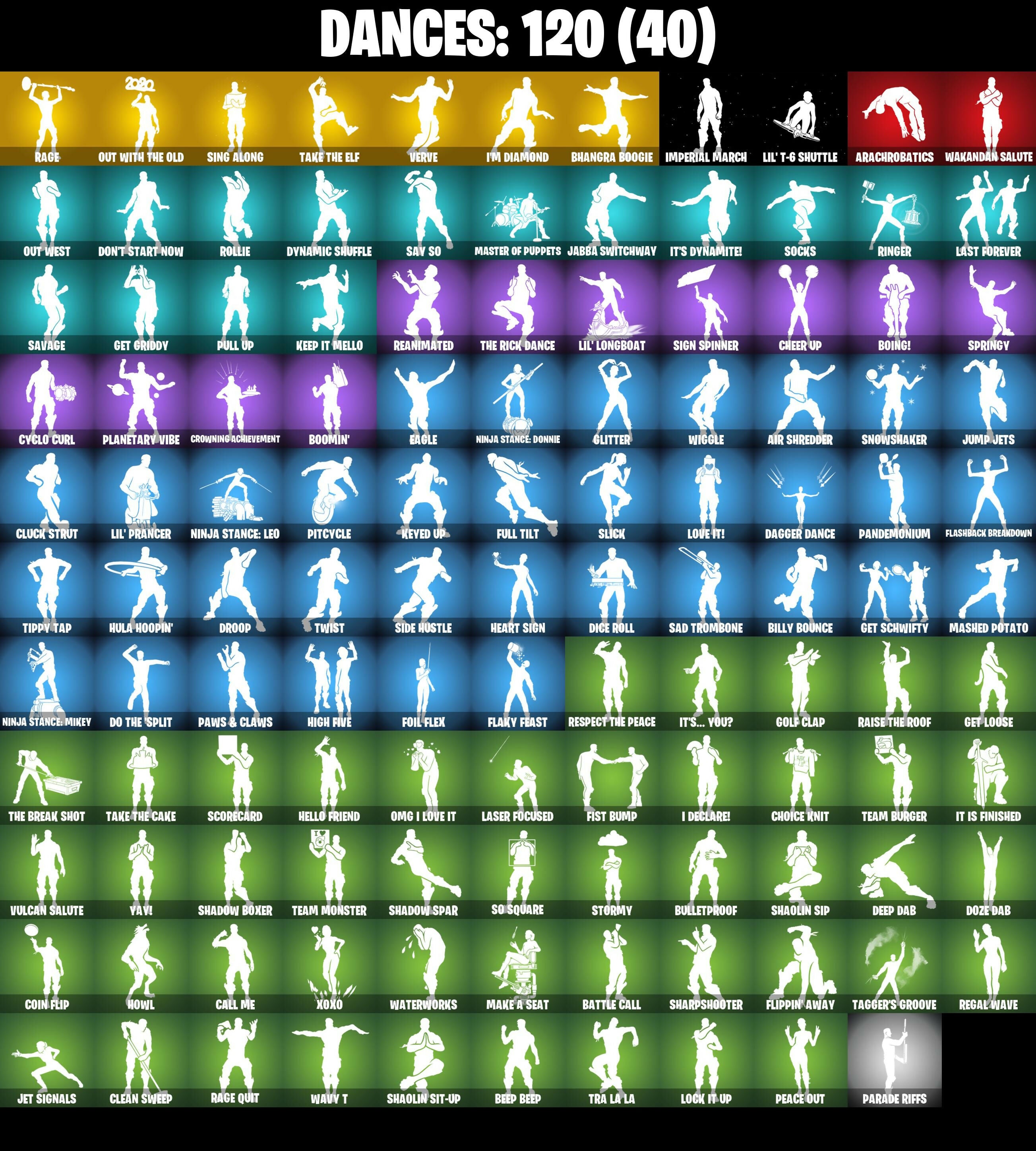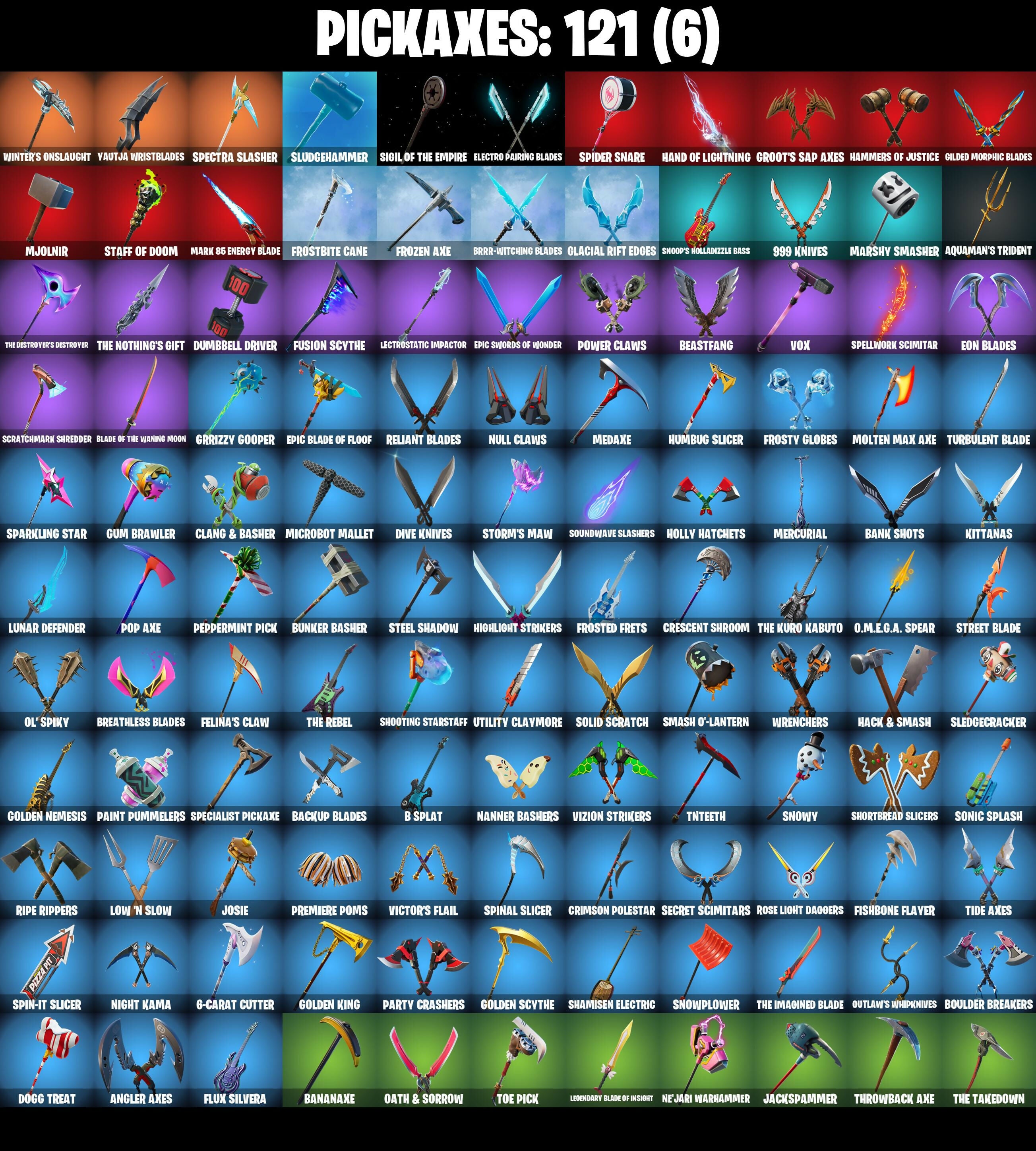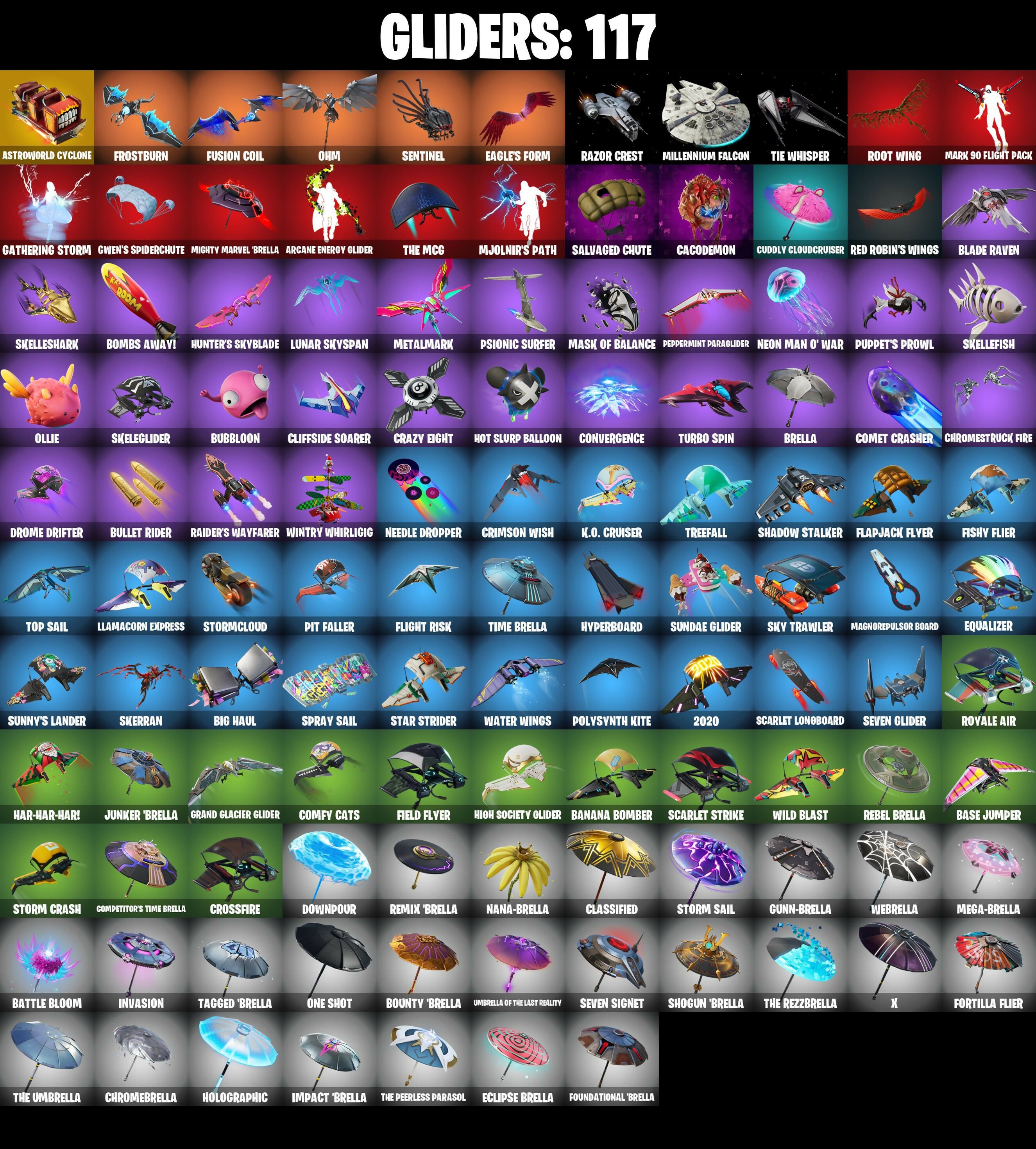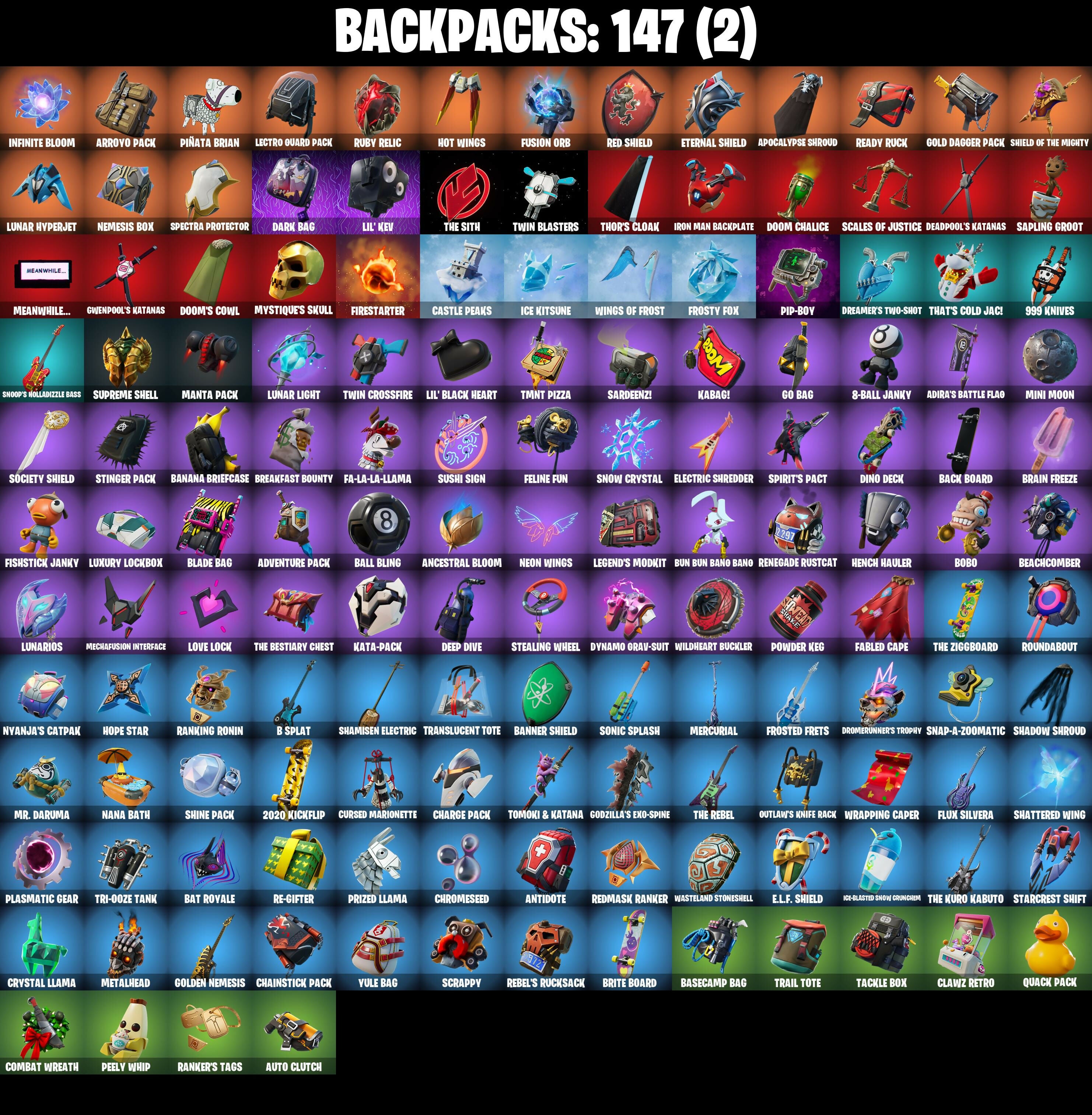 2020, 2020 Kickflip, 6-Carat Cutter, 8-Ball Janky, 8-Ball vs Scratch, 999 Knives, Adira's Battle Flag, Adventure Pack, Agent Peely, Air Shredder, Ancestral Bloom, Angler Axes, Antidote, Apocalypse Shroud, Aquaman, Aquaman's Trident, Arachrobatics, Arcane Energy Glider, Arctic Adeline, Arctic Assassin, Arroyo Pack, Arthur Curry, Astroworld Cyclone, Auto Clutch, B Splat, Back Board, Backup Blades, Ball Bling, Banana Bomber, Banana Briefcase, Bananaxe, Bank Shots, Banner Shield, Base Jumper, Basecamp Bag, Bat Royale, Battle Bloom, Battle Call, Beach Bomber, Beach Jules, Beachcomber, Beastfang, Beep Beep, Bhangra Boogie, Big Haul, Billy Bounce, Black Manta, Blade Bag, Blade Raven, Blade of the Waning Moon, Blaze, Boardwalk Ruby, Bobo, Boing!, Bombs Away!, Boomin', Boulder Breakers, Bounty 'brella, Boxer, Brain Freeze, Breakfast Bounty, Breathless Blades, Brella, Brite Board, Brrr-Witching Blades, Bubbloon, Bullet Rider, Bulletproof, Bun Bun Bang Bang, Bunker Basher, Bunker Jonesy, Bytes, Bytes (Lone Traveler), Cacodemon, Call Me, Cameo vs Chic, Castle Peaks, Chainstick Pack, Charge Pack, Cheer Up, Choice Knit, Chrome Punk, Chromebrella, Chromeseed, Chromestruck Fire, Clang & Basher, Classified, Clawz Retro, Clean Sweep, Cliffside Soarer, Cluck Strut, Codename E.L.F., Coin Flip, Combat Wreath, Comet Crasher, Comfy Cats, Competitor's Time Brella, Convergence, Crazy Eight, Crescent Shroom, Crimson Polestar, Crimson Wish, Crossfire, Crowning Achievement, Crystal Llama, Cuddly Cloudcruiser, Cursed Marionette, Cyclo Curl, Dagger Dance, Dark Bag, Dark Bomber, Deadpool, Deadpool Unmasked, Deadpool's Katanas, Deep Dab, Deep Dive, Diamond Diva, Dice Roll, Dino Deck, Dive Knives, Do The 'Split, Doctor Doom, Doctor Doom (God Emperor), Dogg Treat, Don't Start Now, Doom Chalice, Doom's Cowl, Downpour, Doze Dab, Dream, Dreamer's Two-Shot, Drome Drifter, Dromrunner's Trophy, Droop, Dumbbell Driver, Dusk Knight, Dynamic Shuffle, Dynamo Grav-Suit, E.L.F. Shield, Eagle, Eagle's Form, Eclipse Brella, Electric Shredder, Electro Pairing Blades, Eon Blades, Epic Blade of Floof, Epic Swords of Wonder, Equalizer, Eternal Knight, Eternal Shield, Ex, Fa-La-La-Llama, Fabled Cape, Fade, Felina, Felina's Claw, Feline Fun, Field Flyer, Firestarter, Fish Thicc, Fishbone Flayer, Fishstick Janky, Fishy Flier, Fist Bump, Flaky Feast, Flapjack Flyer, Flashback Breakdown, Flight Risk, Flippin' Away, Flox Silvera, Flux Silvera, Foil Flex, Fortilla Flier, Foundational 'brella, Frost Broker, Frostbite Cane, Frostburn, Frosted Frets, Frosty Fox, Frosty Globes, Frozen Axe, Frozen Fishstick, Frozen Nog Ops, Full Tilt, Fusion, Fusion Coil, Fusion Orb, Fusion Scythe, Gathering Storm, Gear Specialist Maya, Get Griddy, Get Loose, Get Schwifty, Gilded Morphic Blades, Glacial Rift Edges, Glitter, Go Bag, Godzilla's Exo-Spine, Gold Brutus, Gold Dagger Pack, Gold Midas, Golden King, Golden Nemesis, Golden Scythe, Golf Clap, Grand Glacier Glider, Griz, Grizzy Gooper, Groot, Groot (Silver Foil), Groot's Sap Axes, Gum Brawler, Gunn-Brella, Gwen's Spiderchute, Gwenpool's Katanas, Hack & Smash, Hammers of Justice, Hand of Lightning, Har-Har-Har!, Harbinger Armor Omegarok, Hazard, Heart Sign, Hello Friend, Hench Hauler, High Five, High Society Glider, Highlight Strikers, Holly Hatchets, Holographic, Hope Star, Hot Slurp Balloon, Hot Wings, Howl, Hula Hoopin', Humbug Slicer, Hunter's Skyblade, Hyperboard, I Declare!, I'm Diamond, Ice Kitsune, Ice-Blasted Snow Crunchem, Impact 'brella, Imperial March, Infinite Bloom, Invasion, Iris, Iron Man Backplate, It Is Finished, It's Dynamite!, It's... You?, Jabba Switchway, Jackspammer, Jennifer Walters, Jet Signals, Josie, Journey vs Hazard, Jules, Jump Jets, Junker 'brella, K.O. Cruiser, Kabag!, Kata-Pack, Keep It Mello, Kev, Keyed Up, Kit, Kittanas, Kondor, Krisabelle, Lada, Laser Focused, Last Forever, Lectro Guard Pack, Lectrostatic Impactor, Legend's Modkit, Legendary Blade of Insight, Lennox Rose, Lexa, Lil Split, Lil' Black Heart, Lil' Kev, Lil' Longboat, Lil' Prancer, Lil' T-6 Shuttle, Llamacorn Express, Lock It Up, Love It!, Love Lock, Low 'N Slow, Lt. Evergreen, Luminos, Lunar Defender, Lunar Hyperjet, Lunar Light, Lunar Skyspan, Lunarios, Luxury Lockbox, M-Jolnir, Magnorepulsor Board, Make A Seat, Mancake, Mandalorian, Manta Pack, Mark 85 Energy Blade, Mark 90 Flight Pack, Marshy Smasher, Mashed Potato, Mask of Balance, Masked, Master Of Puppets, Mave, Mave (Reactive Hair Off), Meanwhile..., Mechafusion Interface, Medaxe, Mega-Brella, Menace, Meow Skulls, Meowscles, Mercurial, Metalhead, Metalmark, Microbot Mallet, Mighty Marvel 'brella, Millennium Falcon, Mini Moon, Mjolnir's Path, Molten Max Axe, Mr. Daruma, MrBeast, Mystique, Mystique's Skull, Nana Bath, Nana-Brella, Nanner Bashers, Ne'Jari Warhammer, Needle Dropper, Nemesis Box, Neon Man O' War, Neon Wings, Night Kama, Ninja Stance: Donnie, Ninja Stance: Leo, Ninja Stance: Mikey, Nolan Chance, Null Claws, Nyanja's Catpak, O.M.E.G.A. Spear, OMG I Love It, Oath & Sorrow, Ocean, Ohm, Ol' Spiky, Ollie, Omegarok, One Shot, Opal, Out West, Out With The Old, Outlaw's Knife Rack, Outlaw's Whipknives, Paint Pummelers, Pandemonium, Parade Riffs, Paradigm (Aurelian), Paradigm (Reality-559), Party Crashers, Paws & Claws, Peace Out, Peely Whip, Peppermint Paraglider, Peppermint Pick, Pip-Boy, Piper Pace, Pit Faller, Pitycle, Piñata Brian, Planetary Vibe, Plasmatic Gear, Polar Peely, Polysynth Kite, Pop Axe, Powder Keg, Power Claws, Predator, Premiere Poms, Prized Llama, Psionic Surfer, Pull Up, Puppet's Prowl, Quack Pack, Rage, Rage Quit, Raider's Wayfarer, Raise The Roof, Ranker's Tags, Ranking Ronin, Razor Crest, Re-Gifter, Ready Ruck, Reanimated, Rebel Brella, Rebel's Rucksack, Recon Champion, Red Knight, Red Robin's Wings, Red Shield, Redmask Ranker, Reese, Regal Wave, Reliant Blades, Remedy vs Toxin, Remix 'brella, Renegade Lynx, Renegade Rustcat, Respect The Peace, Ringer, Ripe Rippers, Rippley vs Sludge, Riptide, Rollie, Root Wing, Rose Light Dagge