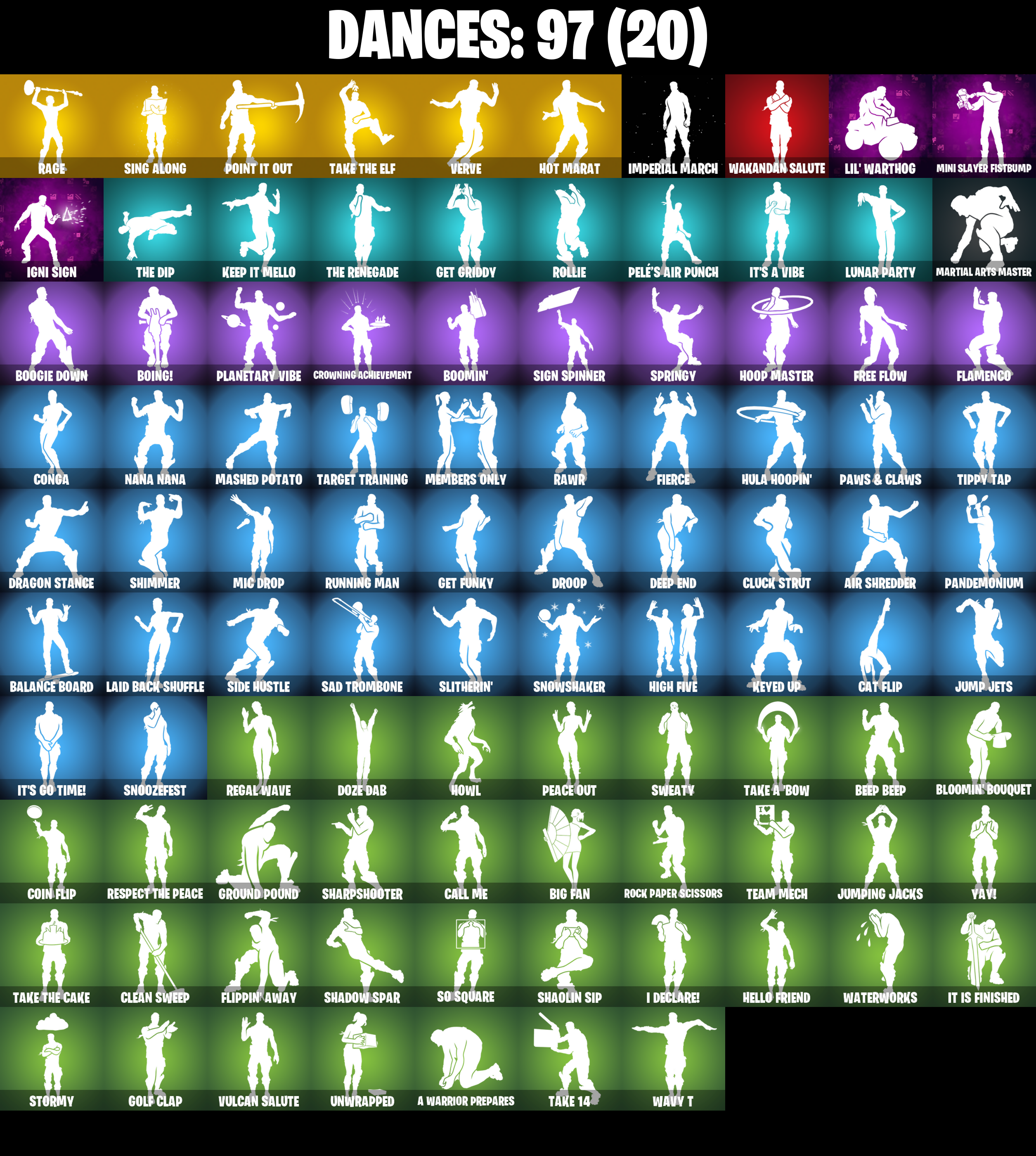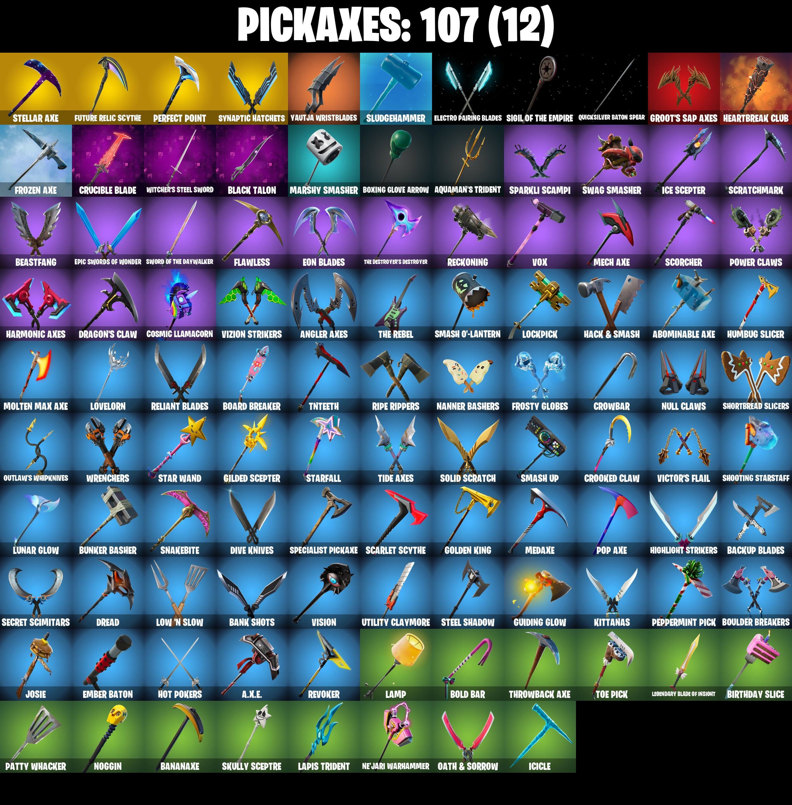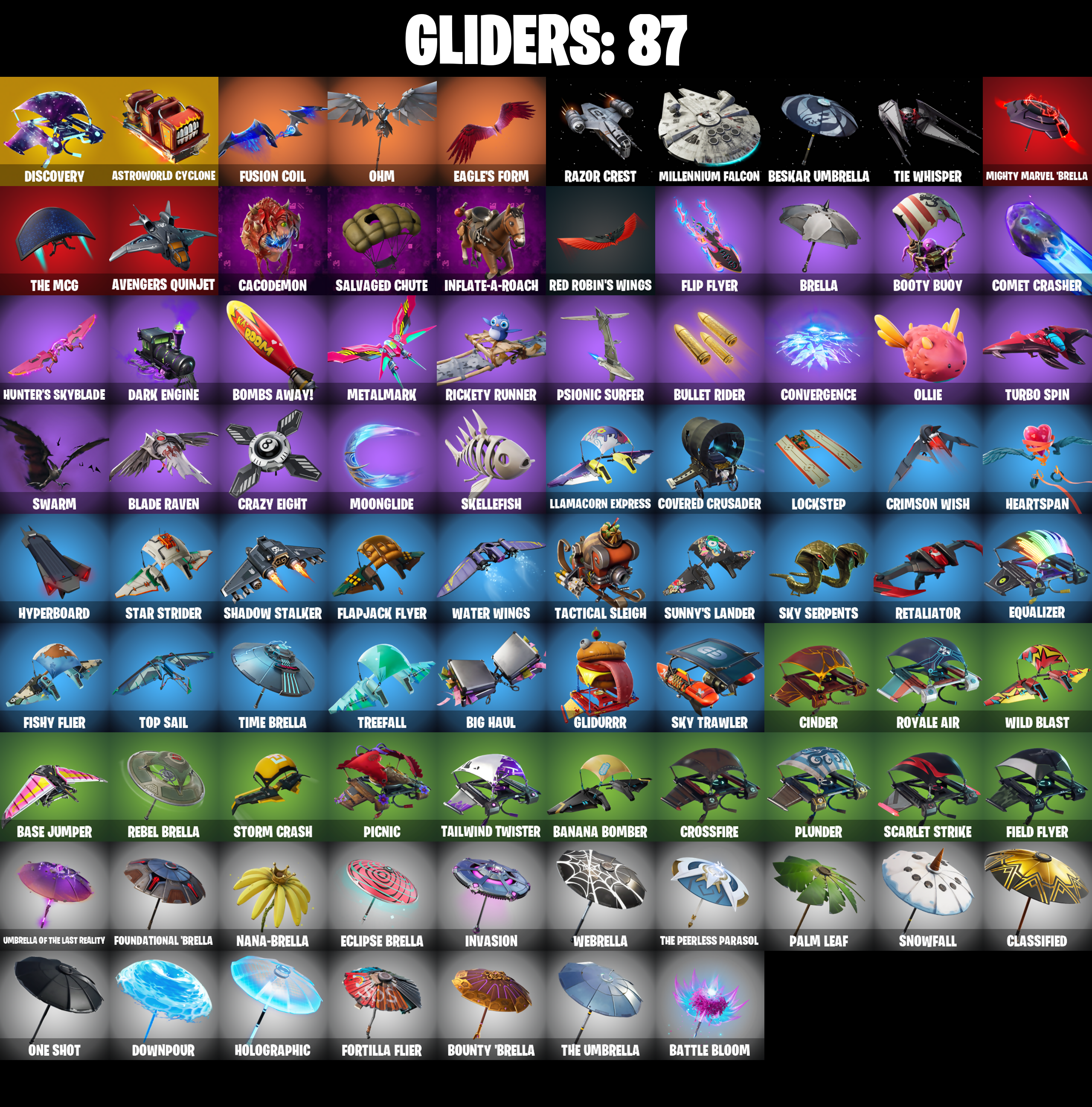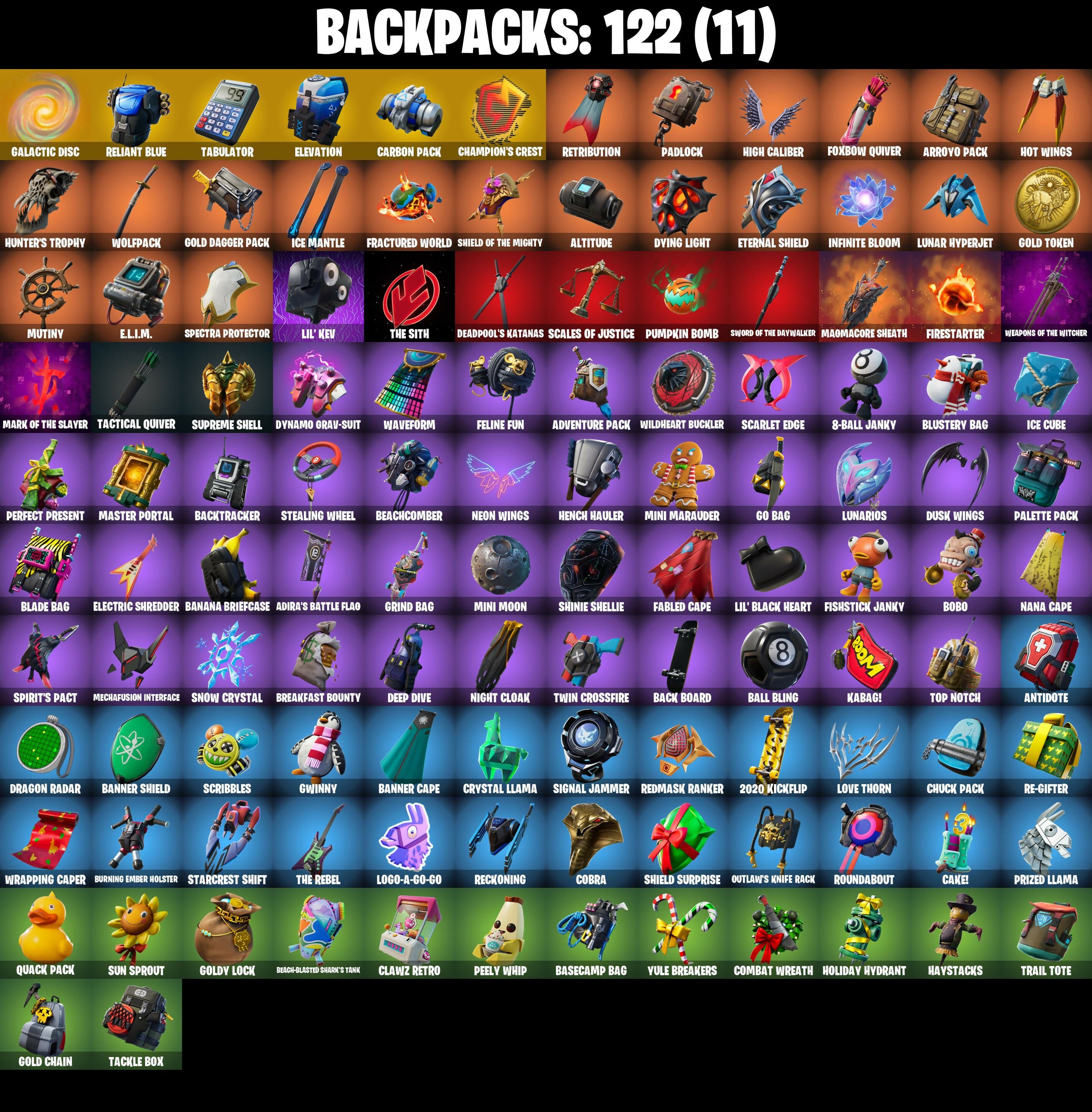 2020 Kickflip, 8-Ball Janky, 8-Ball Vs Scratch, A Warrior Prepares, A.I.M., A.X.E., Abominable Axe, Adira's Battle Flag, Adventure Pack, Agent Peely, Air Shredder, Altitude, Angler Axes, Antidote, Aquaman, Aquaman's Trident, Arroyo Pack, Arthur Curry, Assault Trooper, Astroworld Cyclone, Avengers Quinjet, Back Board, Backtracker, Backup Blades, Balance Board, Ball Bling, Banana Bomber, Banana Briefcase, Bananaxe, Bank Shots, Banner Cape, Banner Shield, Base Jumper, Basecamp Bag, Battle Bloom, Beach-Blasted Shark's Tank, Beachcomber, Beastfang, Beep Beep, Beskar Umbrella, Big Fan, Big Haul, Birthday Slice, Black, Black Talon, Black Werewolf, Blackheart, Blackheart (Stage 8), Blade, Blade Bag, Blade Raven, Blaze, Bloomin' Bouquet, Blustery Bag, Board Breaker, Bobo, Boing!, Bold Bar, Bombs Away!, Boogie Down, Boomin', Booty Buoy, Boulder Breakers, Bounty 'Brella, Boxing Glove Arrow, Breakfast Bounty, Breakpoint, Brella, Brutus, Bullet Rider, Bundles, Bunker Basher, Bunker Jonesy, Burning Ember Holster, Cacodemon, Cake!, Calamity, Calamity Stage 5, Call Me, Cameo Vs Chic, Caper, Caper (Bunny), Carbon Commando, Carbon Pack, Cat Flip, Champion's Crest, Chuck Pack, Cinder, Classified, Clawz Retro, Clean Sweep, Cloud Striker, Cluck Strut, Cobra, Coin Flip, Combat Wreath, Comet Crasher, Conga, Convergence, Cosmic Llamacorn, Covered Crusader, Crazy Eight, Crimson Wish, Crooked Claw, Crossfire, Crowbar, Crowning Achievement, Crucible Blade, Crystal Llama, DJ Yonder, Dark Engine, Deadpool, Deadpool Unmasked, Deadpool's Katanas, Deep Dive, Deep End, Demi, Dire, Discovery, Dive Knives, Doom Slayer, Downpour, Doze Dab, Dragon Radar, Dragon Stance, Dragon's Claw, Dread, Droop, Dusk, Dusk Wings, Dying Light, Dynamo, Dynamo Grav-Suit, E.L.I.M., Eagle's Form, Eclipse Brella, Electric Shredder, Electro Pairing Blades, Elevation, Ember, Ember (Night), Ember Baton, Eon Blades, Epic Swords Of Wonder, Equalizer, Eternal Knight, Eternal Shield, Fable, Fabled Cape, Fade, Feline Fun, Field Flyer, Fierce, Firestarter, Fishstick Janky, Fishy Flier, Fixer, Flamenco, Flapjack Flyer, Flawless, Flip Flyer, Flippin' Away, Focus, Fortilla Flier, Foundational 'Brella, Foxbow Quiver, Fractured World, Free Flow, Frost Squad, Frosty Globes, Frozen Axe, Fusion Coil, Future Relic Scythe, Galactic Disc, Galaxia, Galaxy, Gear Specialist Maya, Geralt Of Rivia, Get Funky, Get Griddy, Giddy-Up, Gilded Scepter, Glidurrr, Glow, Go Bag, Gold Chain, Gold Dagger Pack, Gold Midas, Gold Token, Golden King, Goldy Lock, Golf Clap, Green Arrow, Green Goblin, Grind Bag, Groot's Sap Axes, Ground Pound, Guiding Glow, Gwinny, Hack & Smash, Happy, Harmonic Axes, Haystacks, Heartbreak Club, Heartbreak Ranger, Heartspan, Hello Friend, Hench Hauler, High Caliber, High Five, Highlight Strikers, Holiday Hydrant, Holographic, Hoop Master, Hot Marat, Hot Pokers, Hot Wings, Howl, Hula Hoopin', Humbug Slicer, Hunter's Skyblade, Hunter's Trophy, Hybrid, Hybrid (Stage 4), Hyperboard, I Declare!, Ice Cube, Ice King (Gold), Ice Mantle, Ice Scepter, Icicle, Igni Sign, Imperial March, Infinite Bloom, Inflate-A-Roach, Invasion, Iris, It Is Finished, It's A Vibe, It's Go Time!, Josie, Journey Vs Hazard, Jules, Jump Jets, Jumping Jacks, Jun-Hwan, Jungle Scout, Kabag!, Kaws Skeleton, Keep It Mello, Keyed Up, Kit, Kittanas, Kondor, Laid Back Shuffle, Lamp, Lapis Trident, Legendary Blade Of Insight, Lexa, Lil' Black Heart, Lil' Kev, Lil' Warthog, Llamacorn Express, Lockpick, Lockstep, Logo-A-Go-Go, Love Thorn, Lovelorn, Low 'N Slow, Lt. Evergreen, Lumi Jellie, Lunar Glow, Lunar Hyperjet, Lunar Party, Lunarios, Luxe, Luxe (Gold Clothing), Lynx, Lynx (Stage 4 - No Ponytail), Mancake, Mandalorian, Maomacore Sheath, Mark Of The Slayer, Marshy Smasher, Martial Arts Master, Mashed Potato, Masked, Massai, Master Key, Master Key (Masked), Master Portal, Mave, Mave (Reactive Hair Off), Mech Axe, Mechafusion Interface, Medaxe, Members Only, Menace, Menace (Challenger Menace - Flame), Meowscles, Merry Marauder, Metalmark, Mic Drop, Mighty Marvel 'Brella, Millennium Falcon, Mini Marauder, Mini Moon, Mini Slayer Fistbump, Molten Max Axe, Moonglide, Mutiny, Nana Cape, Nana Nana, Nana-Brella, Nanner Bashers, Ne'Jari Warhammer, Neon Wings, Night Cloak, Nightshade, Nitelite, Noggin, Null Claws, Oath & Sorrow, Ocean, Ohm, Ollie, One Shot, Onesie, Onesie (Winter), Outlaw's Knife Rack, Outlaw's Whipknives, Padlock, Palette Pack, Palm Leaf, Pandemonium, Patty Whacker, Paws & Claws, Peace Out, Peely, Peely Whip, Pele's Air Punch, Peppermint Pick, Perfect Point, Perfect Present, Picnic, Planetary Vibe, Plunder, Point It Out, Pop Axe, Powder, Powder (White), Power Claws, Predator, Prized Llama, Prodigy, Psionic Surfer, Pumpkin Bomb, Quack Pack, Quicksilver Baton Spear, Rage, Rawr, Razor Crest, Re-Gifter, Rebel Brella, Reckoning, Red Robin's Wings, Red-Nosed Ranger, Redmask Ranker, Reese, Regal Wave, Reliant Blades, Reliant Blue, Remedy Vs Toxin, Respect The Peace, Retaliator, Retribution, Revoker, Rickety Runner, Ripe Rippers, Rippley Vs Sludge, Riptide, Rock Paper Scissors, Rollie, Roundabout, Rox, Rox (Stage 5), Royale Air, Ruin, Running Man, Sad Trombone, Salvaged Chute, Scales Of Justice, Scarlet Edge, Scarlet Scythe, Scarlet Strike, Scorcher, Scratchmark, Scribbles, Scuba Jonesy, Secret Scimitars, Selene, Sentinel, Sentinel (Dark), Sgt. Winter, Sgt. Winter Headgear, Shadow Spar, Shadow Stalker, Shaolin Sip, Sharpshooter, Shield Of The Mighty, Shield Surprise, Shimmer, Shinie Shellie, Shooting Starstaff, Shortbread Slicers, Side Hustle, Sidewinder, Sidewinder (Dark), Sigil Of The Empire, Sign Spinner, Signal Jammer, Sing Along, Singularity, Singularity (Stage 3), Siona, Skellefish, Skully Sceptre, Sky Serpents, Sky Trawler, Skye, Slingshot, Slitherin', Sludgehammer, Smash O'-Lantern, Smash Up, Snakebite, Snoozefest, Snow Crystal, Snowfall, Snowmando, Snowshaker, So Square, Solid Scratch, Sparkli Scampi, Specialist Pickaxe, Spectra Protector, Spirit's Pact, Springy, Stage 4, Star Strider,