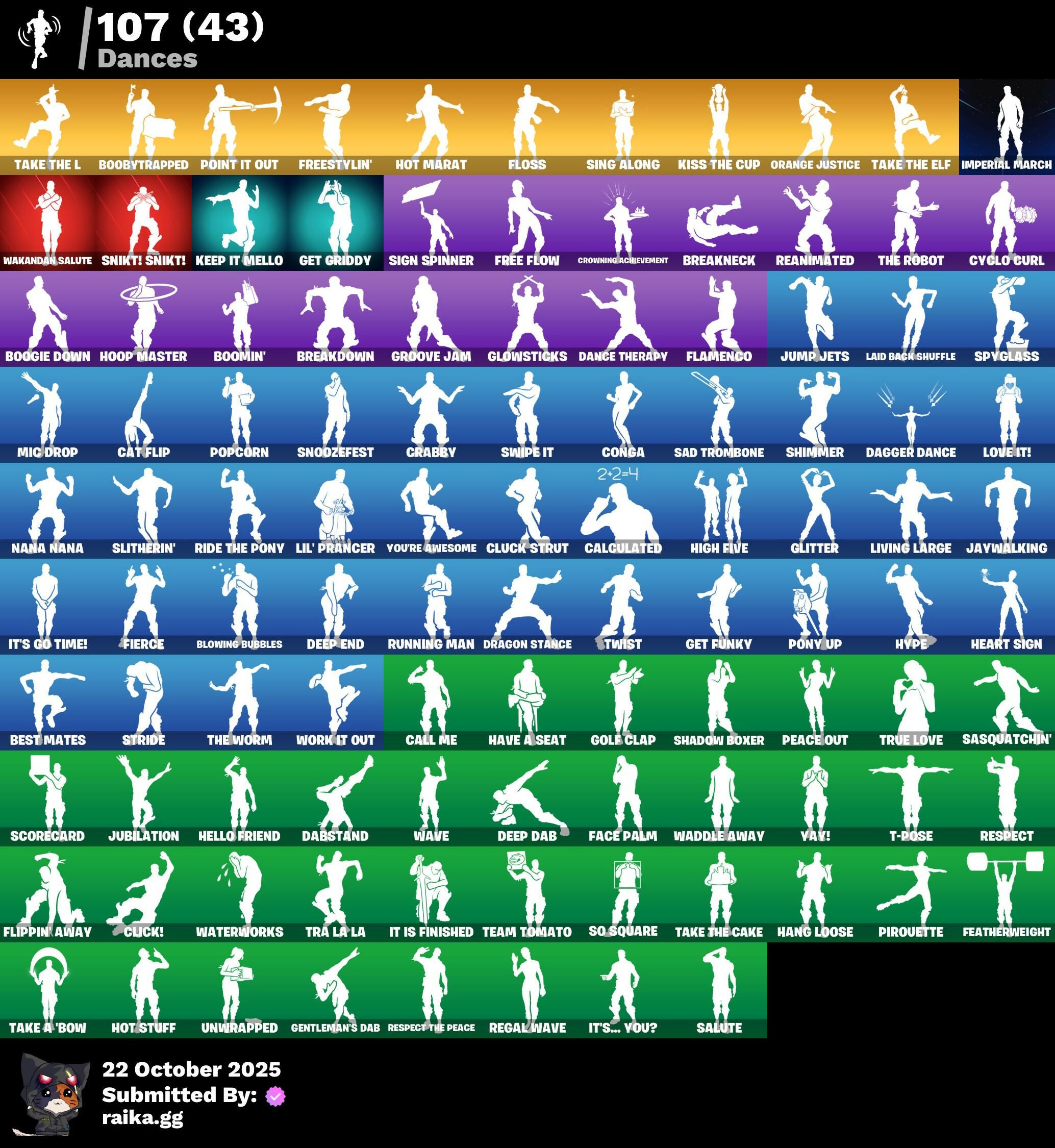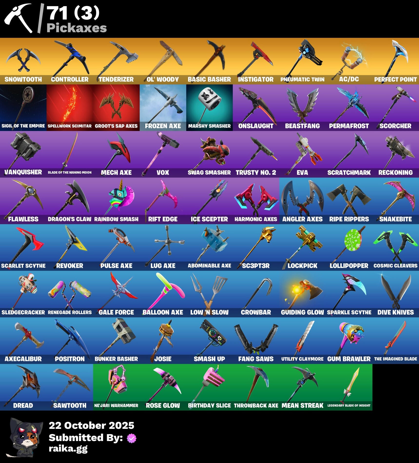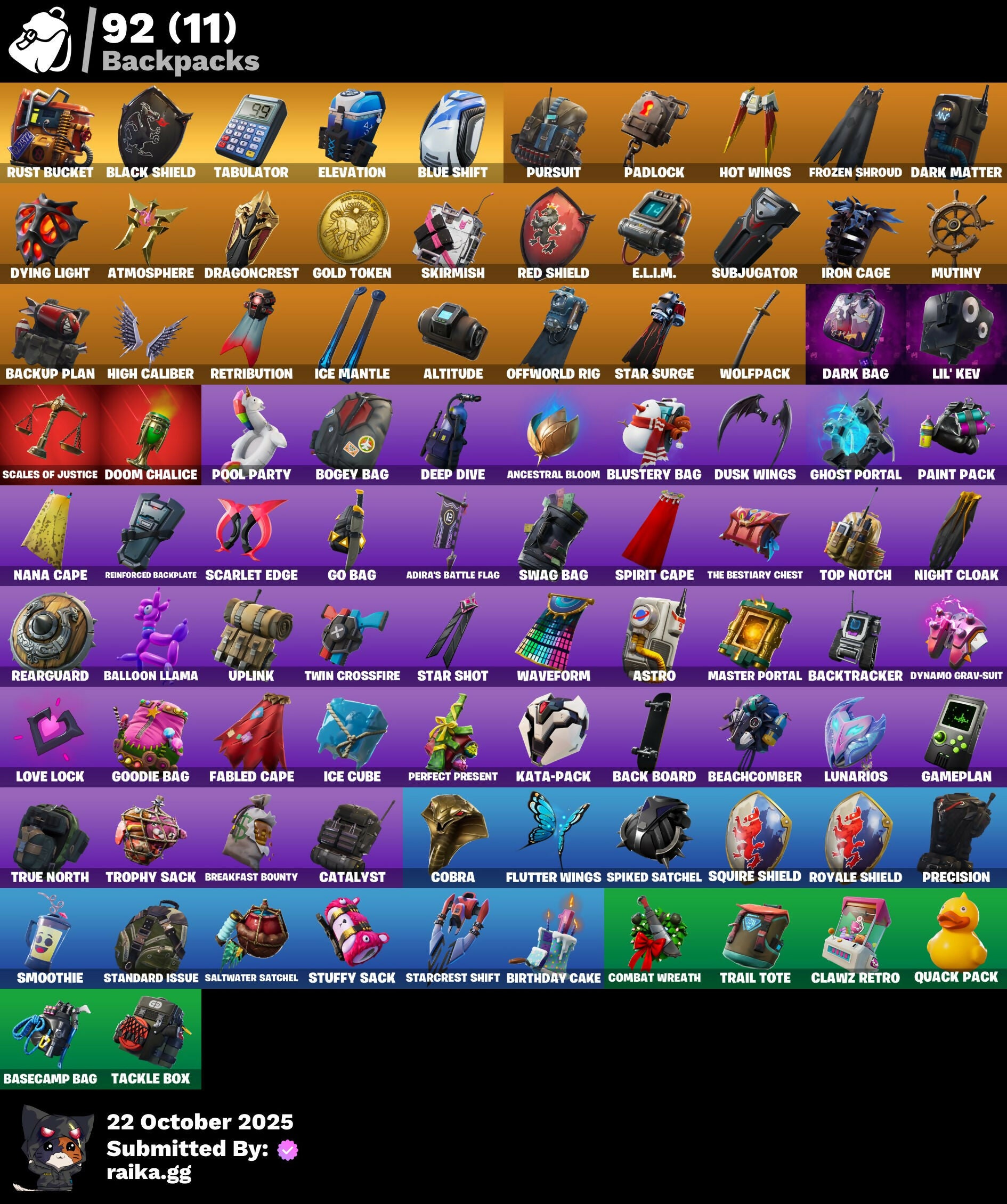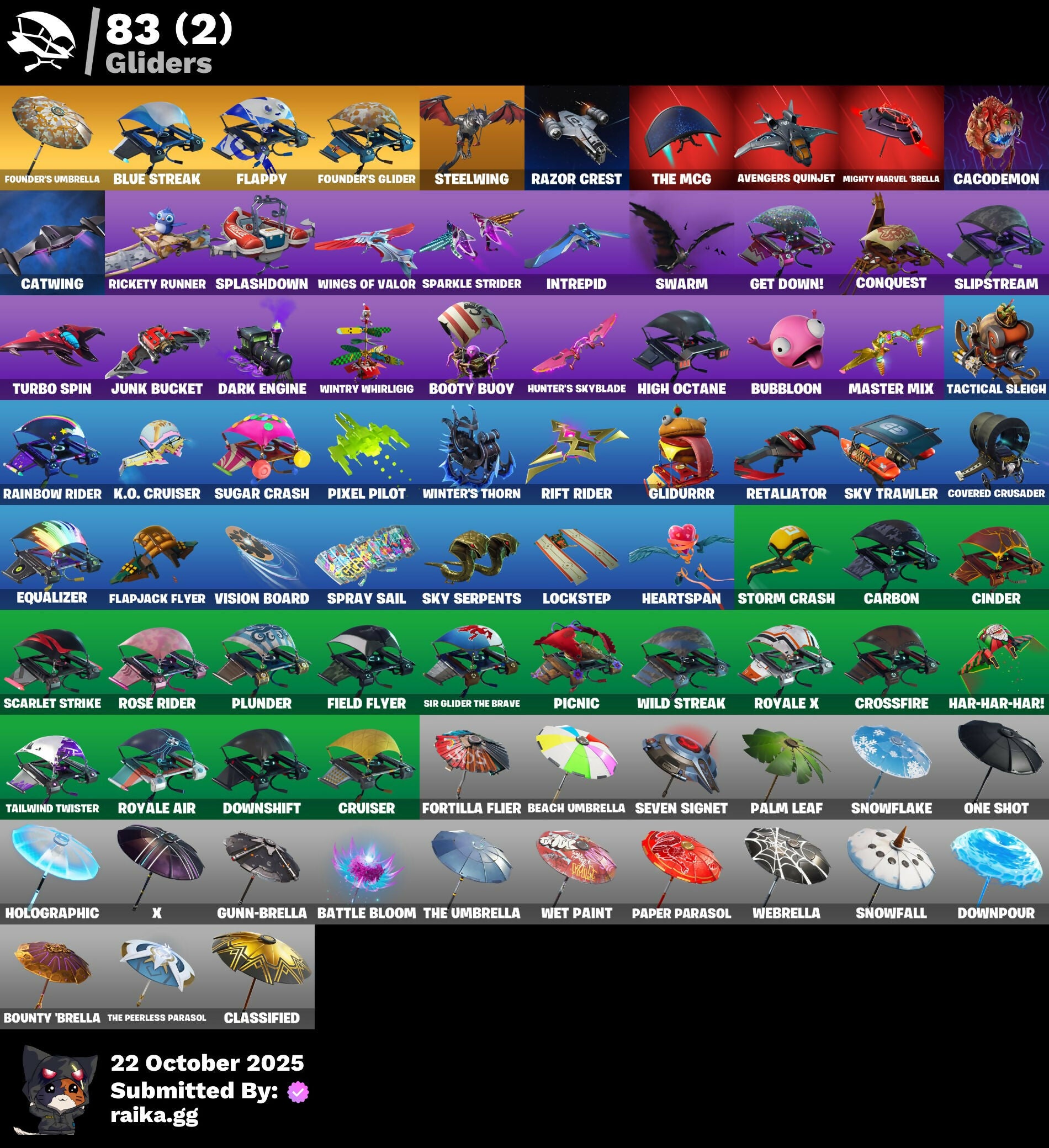 A.I.M., AC/DC, Abominable Axe, Adira's Battle Flag, Altitude, Ancestral Bloom, Angler Axes, Arctic Adeline, Astro, Atmosphere, Avengers Quinjet, Axecalibur, Back Board, Backtracker, Backup Plan, Balloon Axe, Balloon Llama, Basecamp Bag, Basic Basher, Battle Bloom, Battlehawk, Beach Umbrella, Beachcomber, Beastfang, Best Mates, Birdie, Birthday Cake, Birthday Slice, Black Knight, Black Shield, Blackheart, Blade Of The Waning Moon, Blowing Bubbles, Blue Shift, Blue Squire, Blue Streak, Blue Striker, Blue Team Leader, Blustery Bag, Bogey Bag, Boobytrapped, Boogie Down, Boomin', Booty Buoy, Bounty 'Brella, Breakdown, Breakfast Bounty, Breakneck, Brite Bomber, Bubbloon, Bunker Basher, Bunker Jonesy, Cacodemon, Calamity, Calculated, Call Me, Carbide, Carbon, Cat Flip, Catalyst, Catwing, Cinder, Classified, Clawz Retro, Click!, Cloud Striker, Cluck Strut, Cobalt, Cobra, Combat Wreath, Conga, Conquest, Controller, Cosmic Cleavers, Covered Crusader, Cozy Commander, Crabby, Crossfire, Crowbar, Crowning Achievement, Cruiser, Cuddle King, Cyclo Curl, DJ Yonder, Dabstand, Dagger Dance, Dance Therapy, Dante, Dark Bag, Dark Bomber, Dark Engine, Dark Matter, Dark Voyager, Deep Dab, Deep Dive, Deep End, Demi, Dire, Dive Knives, Doom Chalice, Downpour, Downshift, Dragon Stance, Dragon's Claw, Dragoncrest, Dread, Drift, Dusk, Dusk Wings, Dying Light, Dynamo Grav-Suit, E.L.I.M., Elevation, Elite Agent, Ember, Enforcer, Equalizer, Eternal Voyager, Eva, Fable, Fabled Cape, Face Palm, Fang Saws, Featherweight, Field Flyer, Fierce, Flamenco, Flapjack Flyer, Flappy, Flawless, Flippin' Away, Floss, Flutter, Flutter Wings, Fortilla Flier, Founder's Glider, Founder's Umbrella, Free Flow, Freestylin', Frozen Axe, Frozen Shroud, Gale Force, Gameplan, Gentleman's Dab, Get Down!, Get Funky, Get Griddy, Ghost Portal, Giddy-Up, Glidurrr, Glitter, Glowsticks, Go Bag, Gold Token, Golf Clap, Goodie Bag, Groots Sap Axes, Groove Jam, Guiding Glow, Gum Brawler, Gunn-Brella, Hang Loose, Har-Har-Har!, Harmonic Axes, Have A Seat, Havoc, Heart Sign, Heartspan, Hello Friend, High Caliber, High Five, High Octane, Holographic, Hoop Master, Hot Marat, Hot Stuff, Hot Wings, Hunter's Skyblade, Huntress, Hybrid, Hype, Ice Cube, Ice Mantle, Ice Scepter, Imperial March, Instigator, Intrepid, Iron Cage, It Is Finished, It's Go Time!, It's... You?, Jaywalking, Josie, Journey vs Hazard, Jubilation, Jump Jets, Junk Bucket, K.O. Cruiser, Kata-Pack, Keep It Mello, Kiss The Cup, Laid Back Shuffle, Legendary Blade Of Insight, Lil' Kev, Lil' Prancer, Living Large, Lockpick, Lockstep, Lollipopper, Love It!, Love Lock, Low 'N Slow, Lug Axe, Lunarios, Luxe, Lynx, Mancake, Mandalorian, Marshy Smasher, Master Key, Master Mix, Master Portal, Mean Streak, Mech Axe, Mic Drop, Mighty Marvel 'Brella, Mission Specialist, Moonwalker, Mutiny, Nana Cape, Nana Nana, Ne'Jari Warhammer, Night Cloak, Nightshade, Nite Nite, Nitelite, Offworld Rig, Ol' Woody, Omega, One Shot, Onesie, Onslaught, Orange Justice, Padlock, Paint Pack, Palm Leaf, Paper Parasol, Pastel, Peace Out, Peely, Perfect Point, Perfect Present, Permafrost, Picnic, Pirouette, Pixel Pilot, Plunder, Pneumatic Twin, Point It Out, Pony Up, Pool Party, Popcorn, Positron, Powder, Precision, Prodigy, Pulse Axe, Pursuit, Quack Pack, Ragnarok, Rainbow Rider, Rainbow Smash, Raven, Razor Crest, Reanimated, Rearguard, Reckoning, Red Knight, Red Shield, Redline, Reese, Regal Wave, Reinforced Backplate, Renegade Rollers, Respect, Respect The Peace, Retaliator, Retribution, Revoker, Rickety Runner, Ride The Pony, Rift Edge, Rift Rider, Ripe Rippers, Rippley vs Sludge, Rogue Agent, Rook, Rose Glow, Rose Rider, Rose Team Leader, Rox, Royale Air, Royale Knight, Royale Shield, Royale X, Ruin, Running Man, Rust Bucket, Rust Lord, SC3PT3R, Sad Trombone, Saltwater Satchel, Salute, Sasquatchin', Sawtooth, Scales Of Justice, Scarlet Edge, Scarlet Scythe, Scarlet Strike, Scorcher, Scorecard, Scorpion, Scratchmark, Sentinel, Seven Signet, Sgt. Winter, Shadow Boxer, Shimmer, Sidewinder, Sigil Of The Empire, Sign Spinner, Sing Along, Singularity, Sir Glider The Brave, Skirmish, Skull Ranger, Skull Trooper, Sky Serpents, Sky Trawler, Sledgecracker, Sledgehammer, Slipstream, Slitherin', Smash Up, Smoothie, Snakebite, Snikt! Snikt!, Snoozefest, Snowfall, Snowflake, Snowtooth, So Square, Sparkle Scythe, Sparkle Specialist, Sparkle Strider, Sparkle Supreme, Spellwork Scimitar, Spiked Satchel, Spirit Cape, Splashdown, Spray Sail, Spyglass, Squad Leader, Squire Shield, Standard Issue, Star Shot, Star Surge, Starcrest Shift, Steelwing, Storm Crash, Stratus, Stride, Stuffy Sack, Sub Commander, Subjugator, Sugar Crash, Summit Striker, Sun Strider, Swag Bag, Swag Smasher, Swarm, Swipe It, T-Pose, Tabulator, Tackle Box, Tactical Sleigh, Tailwind Twister, Take A 'Bow, Take The Cake, Take The Elf, Take The L, Team Tomato, Teknique, Tenderizer, The Ace, The Bestiary Chest, The Ice King, The Imagined Blade, The Mcg, The Peerless Parasol, The Prisoner, The Reaper, The Robot, The Scientist, The Umbrella, The Visitor, The Worm, Throwback Axe, Tilted Teknique, Top Notch, Toy Trooper, Tra La La, Trail Tote, Trailblazer, Trog, Trophy Sack, True Love, True North, Trusty No. 2, Turbo Spin, Turk vs Riptide, Twin Crossfire, Twist, Ultima Knight, Unwrapped, Uplink, Utility Claymore, Valor, Vanquisher, Vega, Vendetta, Vision Board, Vox, Waddle Away, Wakandan Salute, Warpaint, Waterworks, Wave, Waveform, Webrella, Wet Paint, Wild Streak, Wingman, Wings Of Valor, Winter's Thorn, Wintry Whirligig, Wolfpack, Work It Out, World Cup, X, X-Lord, Yay!, Yond3r, You're Awesome, Zenith, Zoey