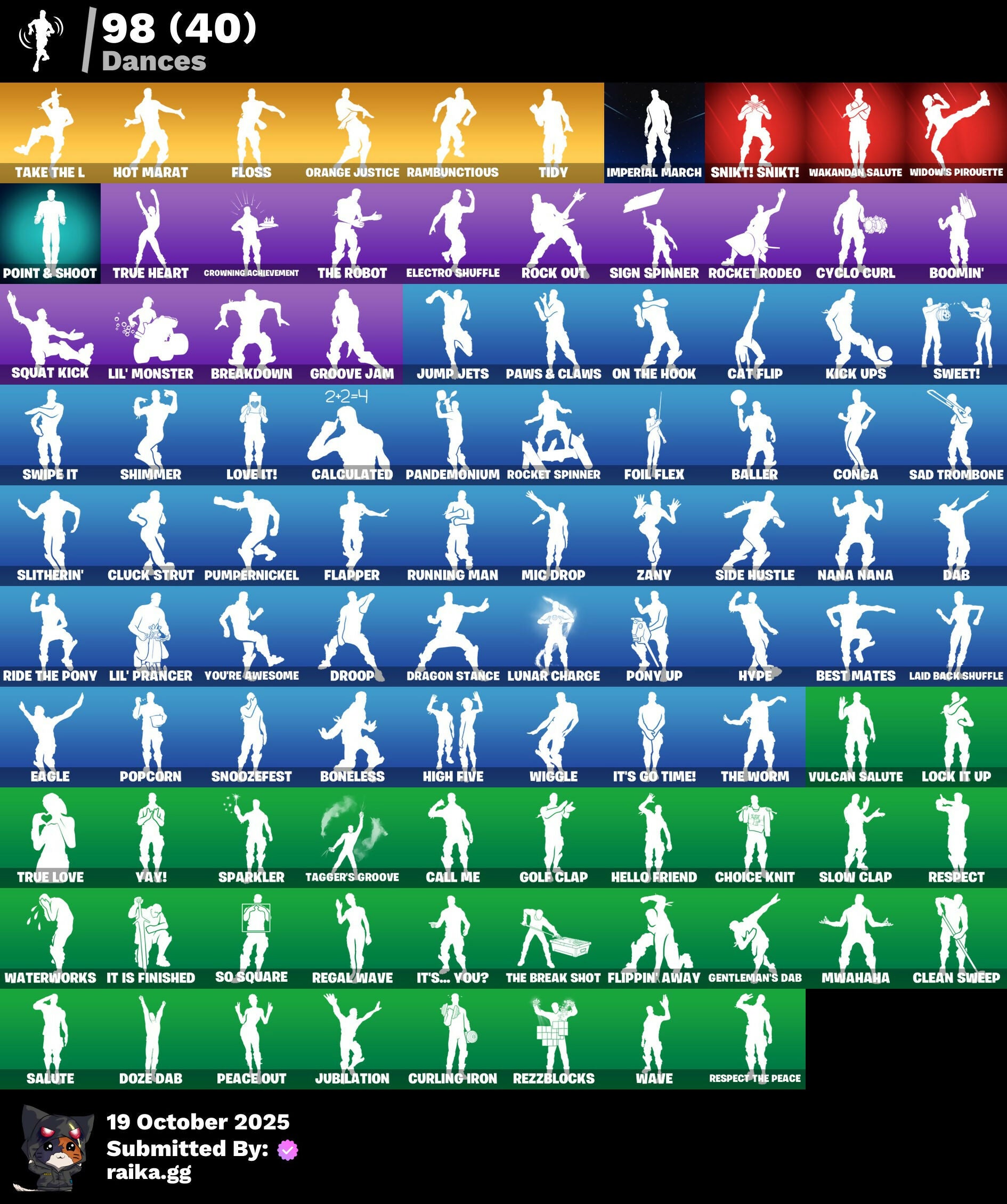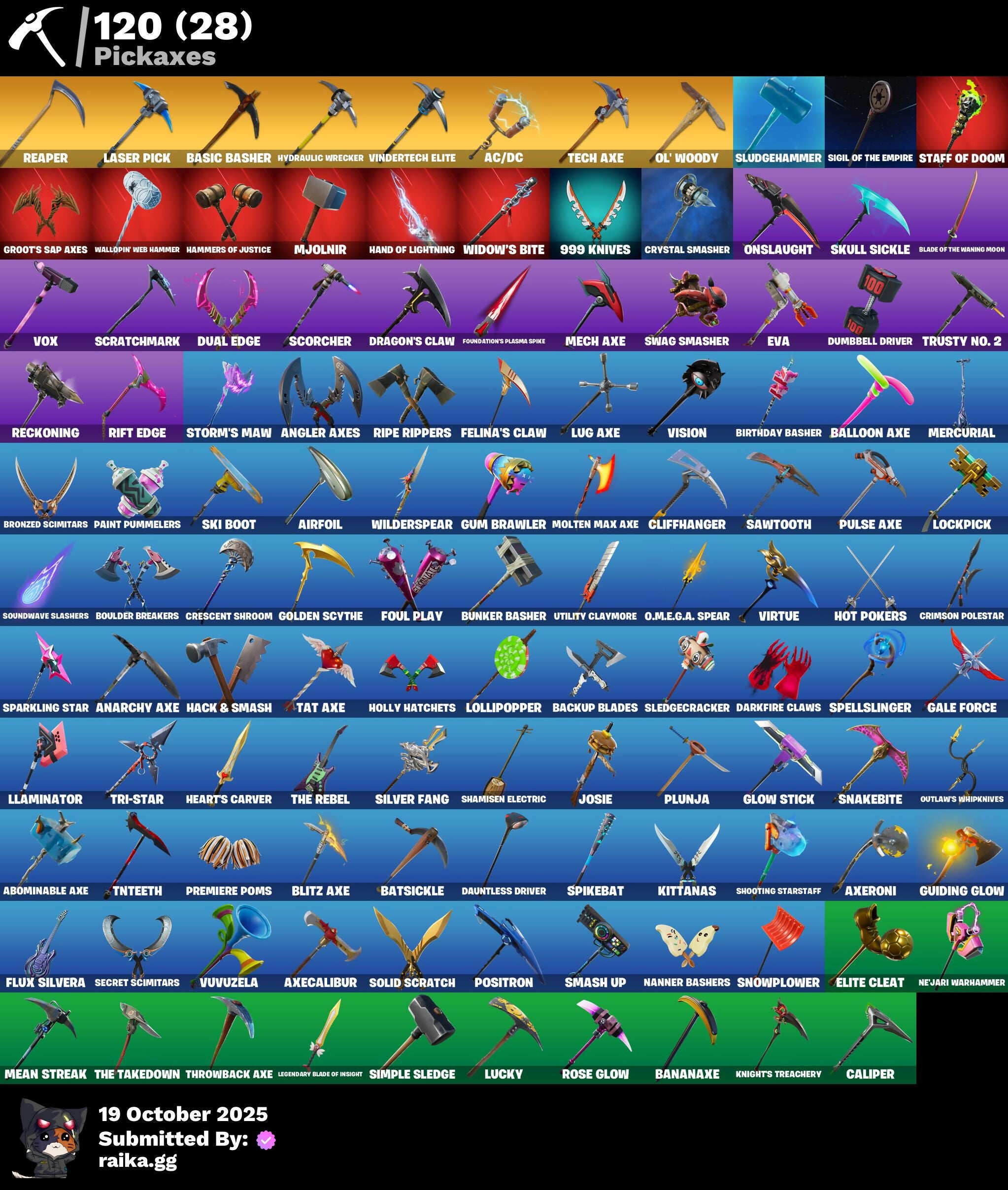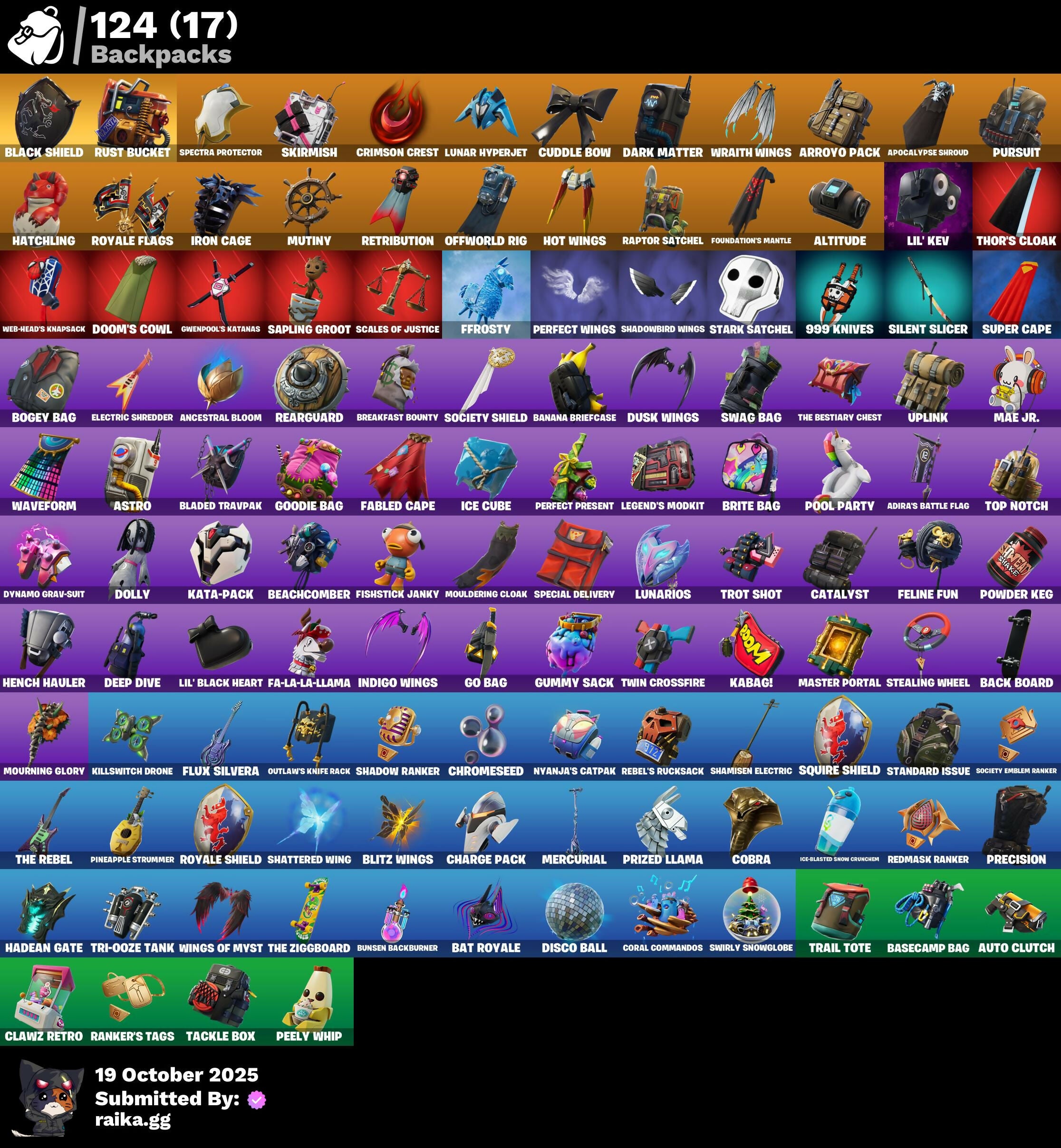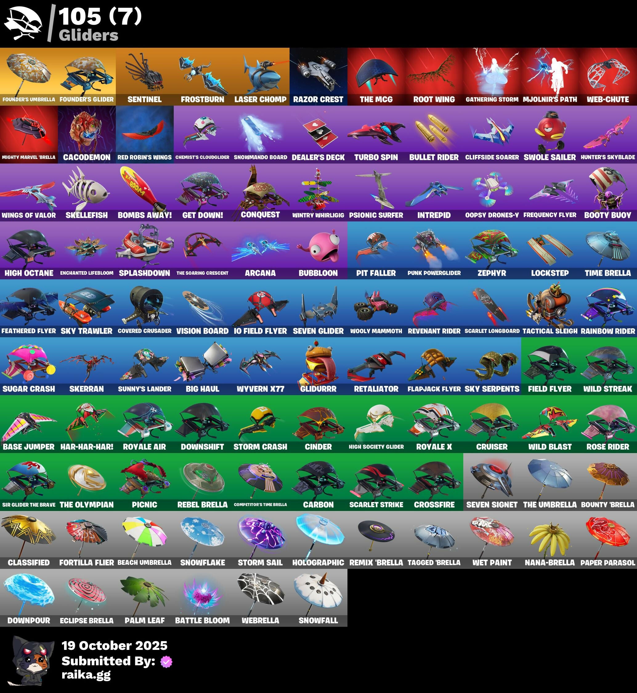 999 Knives, AC/DC, Abominable Axe, Adira's Battle Flag, Agent Peely, Airfoil, Altitude, Anarchy Axe, Ancestral Bloom, Angler Axes, Apocalypse Shroud, Arcana, Arctic Adeline, Arroyo Pack, Astro, Auto Clutch, Axecalibur, Axeroni, Back Board, Backup Blades, Baller, Balloon Axe, Banana Briefcase, Bananaxe, Base Jumper, Basecamp Bag, Basic Basher, Bat Royale, Batsickle, Battle Bloom, Battlehawk, Beach Umbrella, Beachcomber, Best Mates, Big Haul, Birthday Basher, Black Knight, Black Shield, Blackheart, Blacklight, Blade Of The Waning Moon, Bladed Travpak, Blinky, Blitz Axe, Blitz Wings, Blue Squire, Bogey Bag, Bombs Away!, Boneless, Boomin', Booty Buoy, Boulder Breakers, Bounty 'Brella, Breakdown, Breakfast Bounty, Brite Bag, Brite Gunner, Bronzed Scimitars, Brutus, Bubbloon, Bullet Rider, Bunker Basher, Bunker Jonesy, Bunsen Backburner, Cacodemon, Calamity, Calculated, Caliper, Call Me, Carbide, Carbon, Cat Flip, Catalyst, Catrina, Charge Pack, Chemist's Cloudglider, Choice Knit, Chromeseed, Cinder, Classified, Clawz Retro, Clean Sweep, Cliffhanger, Cliffside Soarer, Clinical Crosser, Cluck Strut, Cobra, Competitor's Time Brella, Conga, Conquest, Coral Commandos, Covered Crusader, Crescent Shroom, Crimson Crest, Crimson Polestar, Crossfire, Crowning Achievement, Cruiser, Crystal Smasher, Cuddle Bow, Cuddle Team Leader, Curling Iron, Cyclo Curl, DJ Yonder, Dab, Dark Matter, Dark Voyager, Darkfire Claws, Dauntless Driver, Deadpool, Dealer's Deck, Deep Dive, Demi, Disco Ball, Disco Diva, Doctor Doom, Dolly, Doom's Cowl, Downpour, Downshift, Doze Dab, Dragon Stance, Dragon's Claw, Dream, Drift, Droop, Dual Edge, Dumbbell Driver, Dusk, Dusk Wings, Dynamo Grav-Suit, Eagle, Eclipse Brella, Electric Shredder, Electro Shuffle, Elite Agent, Elite Cleat, Ember, Enchanted Lifebloom, Eva, Fa-La-La-Llama, Fable, Fabled Cape, Feathered Flyer, Felina's Claw, Feline Fun, Ffrosty, Field Flyer, Fishstick Janky, Flapjack Flyer, Flapper, Flippin' Away, Floss, Flux Silvera, Foil Flex, Fortilla Flier, Foul Play, Foundation's Mantle, Foundation's Plasma Spike, Founder's Glider, Founder's Umbrella, Frequency Flyer, Frostburn, Gale Force, Gathering Storm, Gear Specialist Maya, Gentleman's Dab, Get Down!, Giddy-Up, Glidurrr, Glow Stick, Go Bag, Golden Scythe, Golf Clap, Goodie Bag, Groot, Groot's Sap Axes, Groove Jam, Guiding Glow, Gum Brawler, Gumbo, Gummy Sack, Gwenpool's Katanas, Hack & Smash, Hadean Gate, Hammers Of Justice, Hand Of Lightning, Har-Har-Har!, Harlowe, Hatchling, Haven, Heart's Carver, Hello Friend, Hench Hauler, High Five, High Octane, High Society Glider, Hollowhead, Holly Hatchets, Holographic, Hot Marat, Hot Pokers, Hot Wings, Hunter's Skyblade, Huntress, Hybrid, Hydraulic Wrecker, Hype, IO Field Flyer, Ice Cube, Ice-Blasted Snow Crunchem, Imperial March, Indigo Wings, Intrepid, Iron Cage, It Is Finished, It's Go Time!, It's... You?, Jennifer Walters, Josie, Journey Vs Hazard, Jubilation, Jump Jets, Jumpshot, Kabag!, Kata-Pack, Kick Ups, Killswitch Drone, Kittanas, Knight's Treachery, Krisabelle, Laguna, Laid Back Shuffle, Laser Chomp, Laser Pick, Legend's Modkit, Legendary Blade Of Insight, Lil' Black Heart, Lil' Kev, Lil' Monster, Lil' Prancer, Llaminator, Lock It Up, Lockpick, Lockstep, Lollipopopper, Love It!, Lt. John Llama, Lucky, Lug Axe, Lunar Charge, Lunar Hyperjet, Lunarios, Lynx, Mae Jr., Mancake, Mandalorian, Master Portal, Mean Streak, Mech Axe, Meowscles, Mercurial, Mic Drop, Mighty Marvel 'Brella, Mission Specialist, Mjolnir, Mjolnir's Path, Molten Max Axe, Moonwalker, Mouldering Cloak, Mourning Glory, Mutiny, Mwahaha, Nana Nana, Nana-Brella, Nanner Bashers, Ne'Jari Warhammer, Nyanja's Catpak, O.M.E.G.A. Spear, Offworld Rig, Ol' Woody, Omega, On The Hook, Onslaught, Oopsy Drones-V, Orange Justice, Outlaw's Knife Rack, Outlaw's Whipknives, Paint Pummellers, Palm Leaf, Pandemonium, Paper Parasol, Paws & Claws, Peace Out, Peely, Peely Whip, Perfect Present, Perfect Shadow, Perfect Wings, Picnic, Pineapple Strummer, Pit Faller, Plunja, Point & Shoot, Polar Peely, Pony Up, Pool Party, Popcorn, Positron, Powder, Powder Keg, Precision, Premiere Poms, Prized Llama, Psionic Surfer, Pulse Axe, Pumpernickel, Punk Powerglider, Pursuit, Rainbow Rider, Rambunctious, Ranker's Tags, Raptor, Raptor Satchel, Raven, Razor Crest, Reaper, Rearguard, Rebel Brella, Rebel's Rucksack, Reckoning, Red Robin's Wings, Redline, Redmask Ranker, Reese, Regal Wave, Remedy Vs Toxin, Remix 'Brella, Respect, Respect The Peace, Retaliator, Retribution, Revenant Rider, Rezzblocks, Ride The Pony, Rift Edge, Ripe Rippers, Rippley Vs Sludge, Rock Out, Rocket Rodeo, Rocket Spinner, Rogue Agent, Ronin, Rook, Root Wing, Rose Glow, Rose Rider, Rose Team Leader, Rox, Royale Air, Royale Flags, Royale Knight, Royale Shield, Royale X, Running Man, Rust Bucket, Rust Lord, Sad Trombone, Salute, Sapling Groot, Sawtooth, Scales of Justice, Scarlet Longboard, Scarlet Strike, Scorcher, Scratchmark, Secret Scimitars, Sentinel, Seven Glider, Seven Signet, Sgt. Winter, Shadow Ranker, Shadow Skully, Shadowbird, Shadowbird Wings, Shamisen Electric, Shanta, Shattered Wing, Shimmer, Shooting Starstaff, Side Hustle, Sidewinder, Sigil Of The Empire, Sign Spinner, Silent Slicer, Silver Fang, Simple Sledge, Sir Glider The Brave, Skellefish, Skerran, Ski Boot, Skirmish, Skull Sickle, Sky Serpents, Sky Trawler, Slayer Juice Wrld, Sledgecracker, Sledgehammer, Slitherin', Slow Clap, Sludgehammer, Smash Up, Snakebite, Snikit! Snikit!, Snoozefest, Snowfall, Snowflake, Snowmando Board, Snowplower, So Square, Society Emblem Ranker, Society Shield, Solid Scratch, Soundwave Slashers, Sparkle Specialist, Sparkler, Sparkling Star, Special Delivery, Spectra Protector, Spellslinger, Spider-Man, Spikebat, Splashdown, Squad Leader, Squat Kick, Squire Shield, Staff Of Doom, Standard Issue, Stark Satchel, Stealing Wheel, Storm, Storm Crash, Storm Sail, Storm's Maw, Stratus, Sugar Crash, Summit Striker, Sun Strider, Sunny's Lander, Super Cape, Swag Bag, Swag Smasher