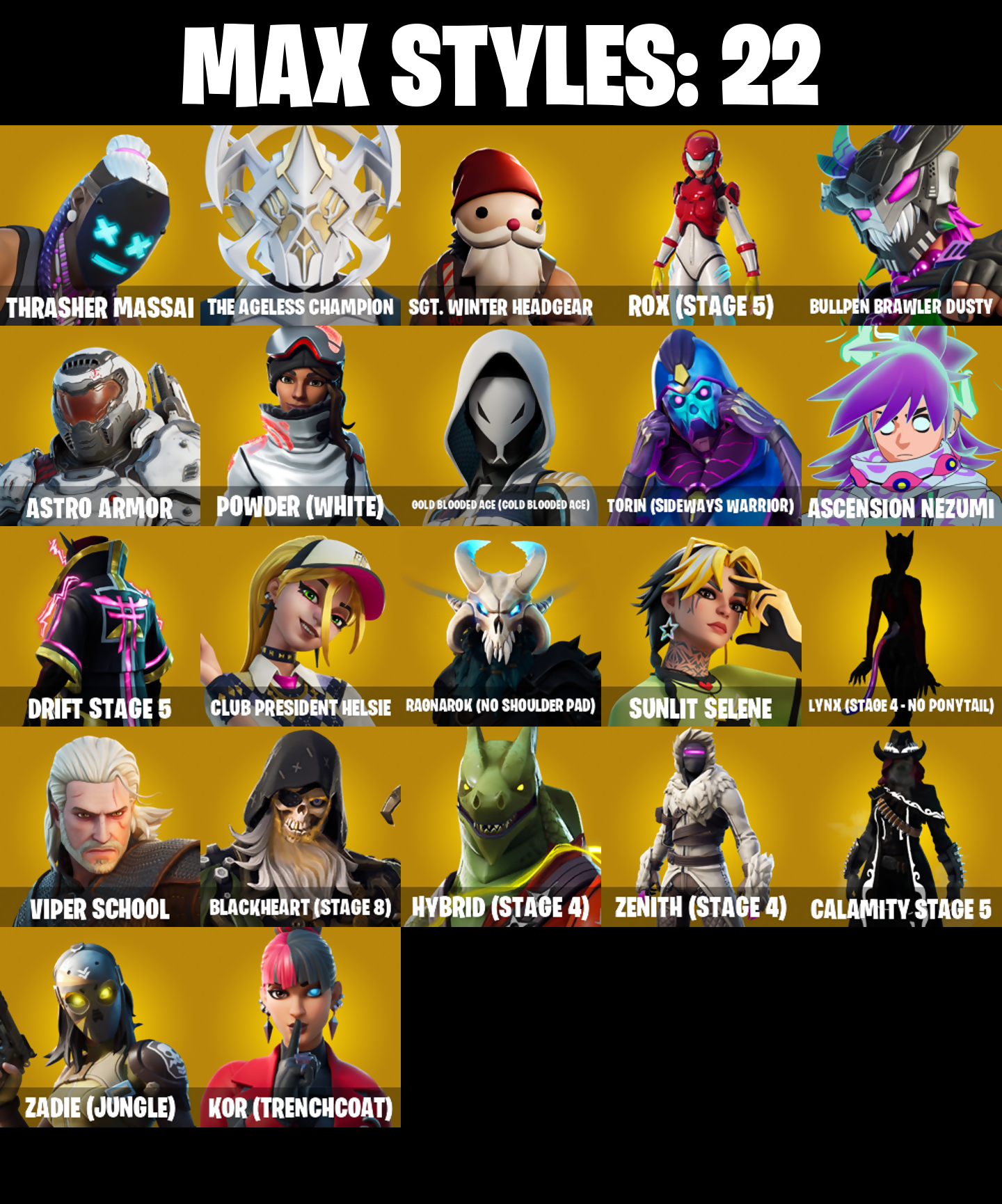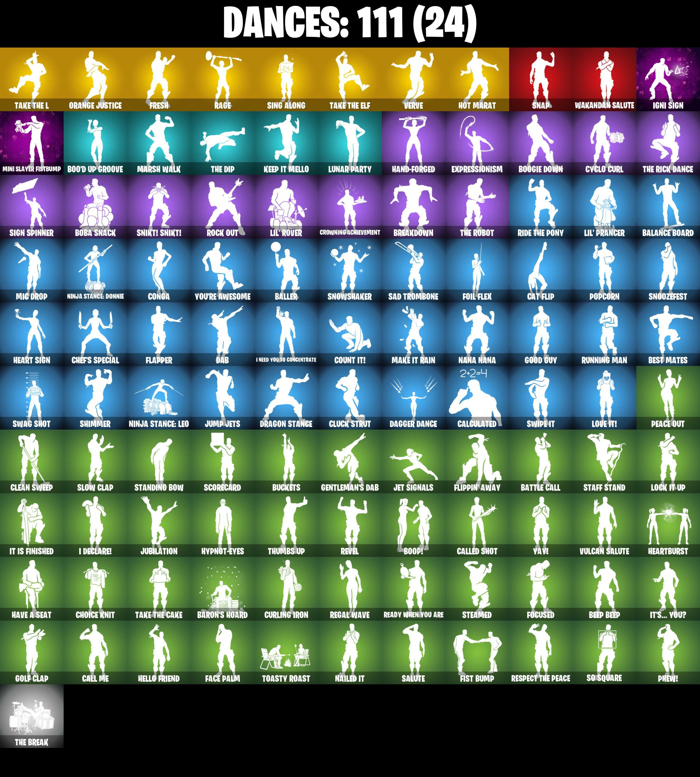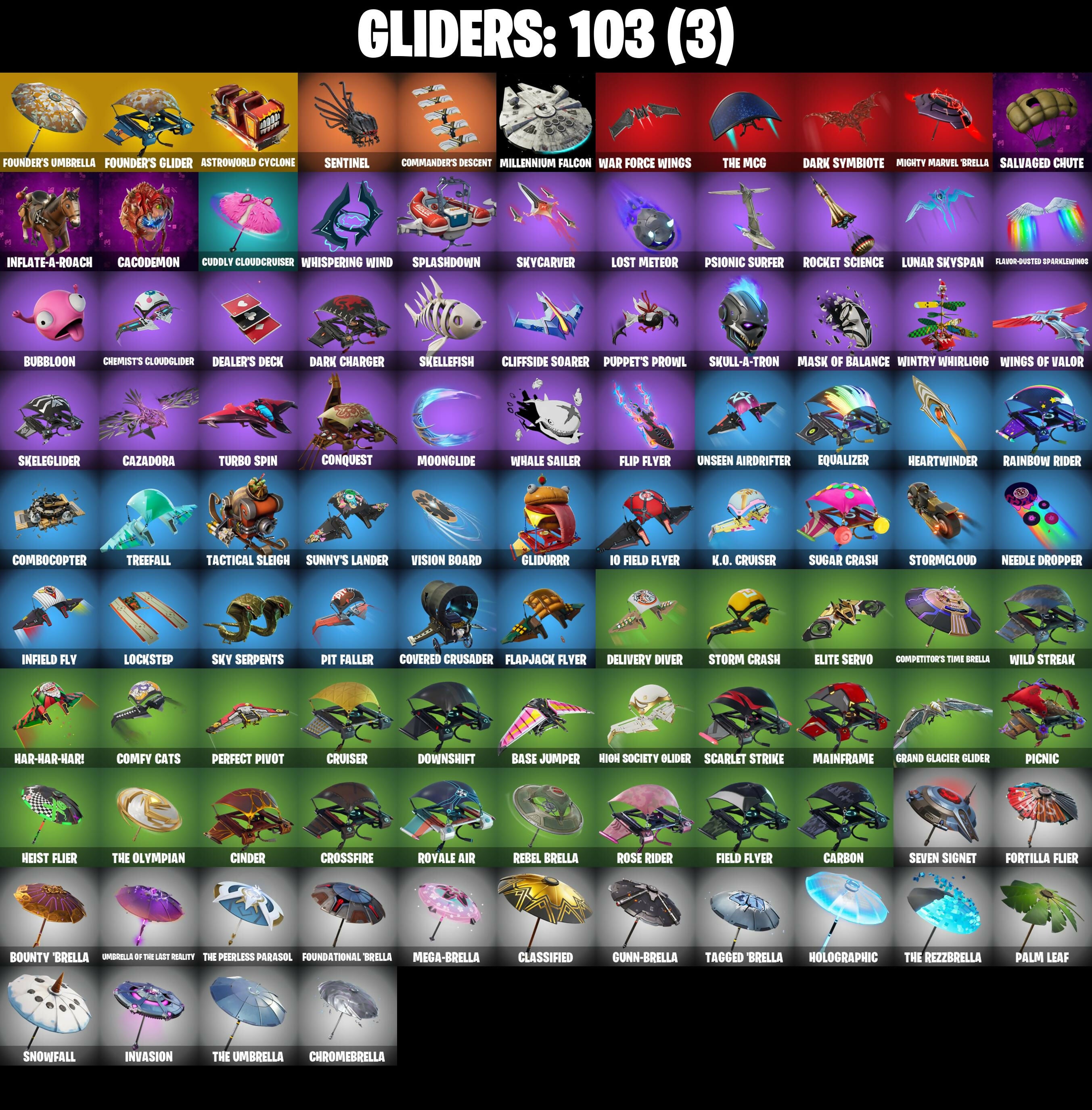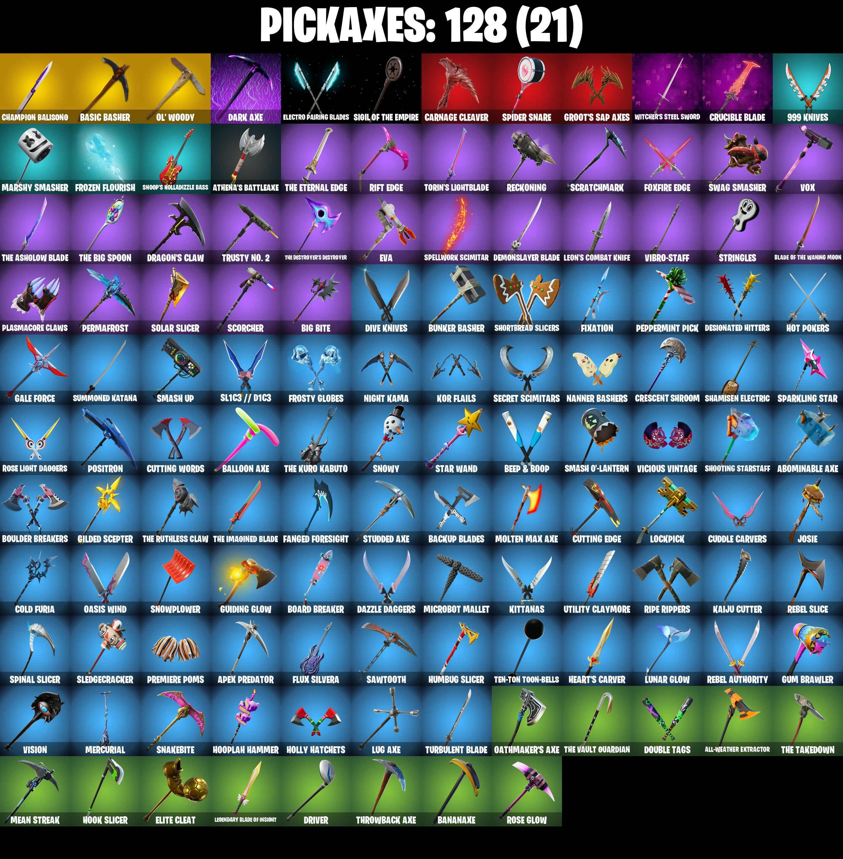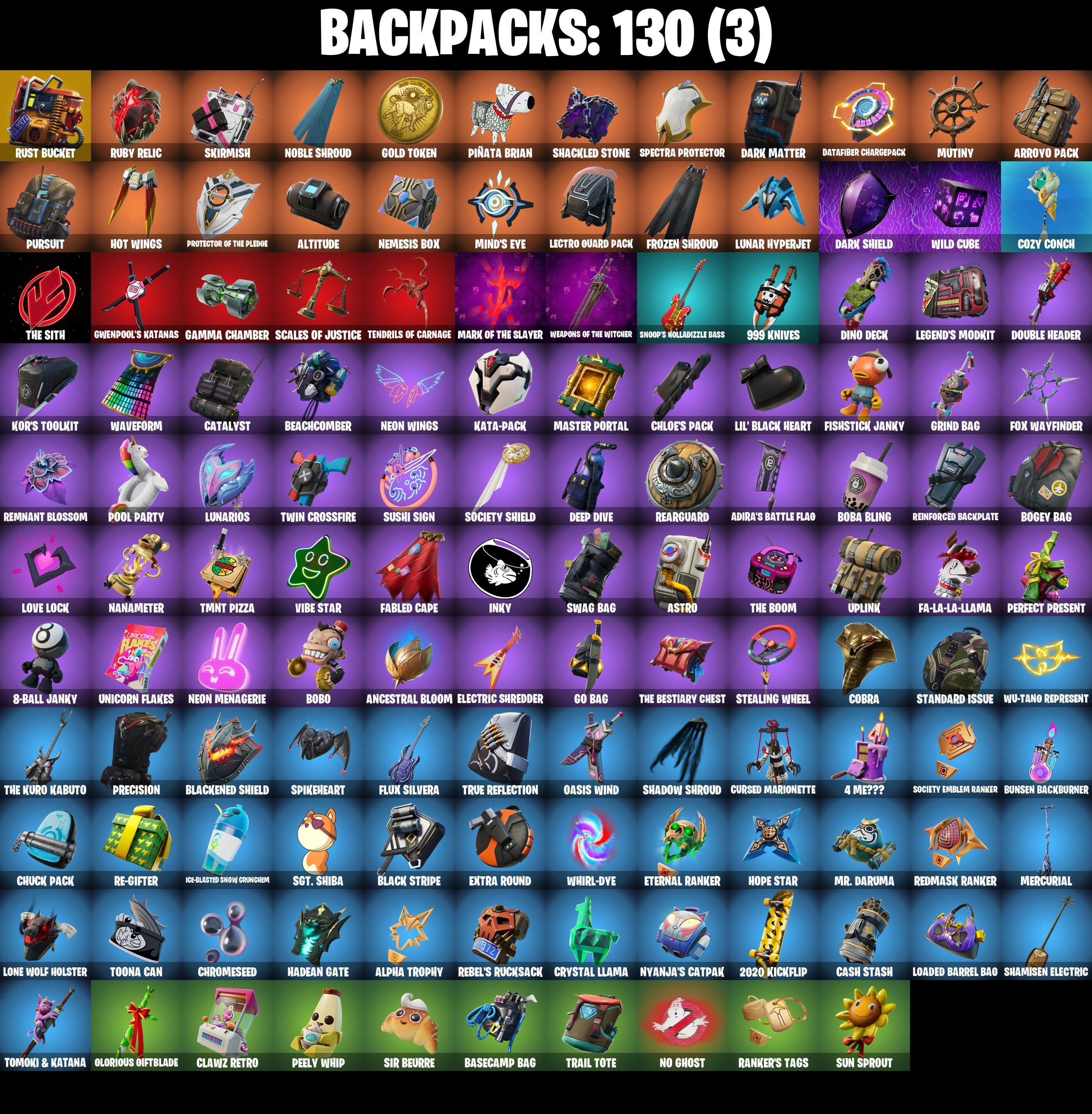 2020 Kickflip, 4 Me???, 8-Ball Janky, 999 Knives, Abominable Axe, Adira's Battle Flag, All-Weather Extractor, Alpha Trophy, Altitude, Ancestral Bloom, Apex Predator, Arctic Adeline, Arroyo Pack, Ascension Nezumi, Aspen, Astro, Astro Armor, Astroworld Cyclone, Athena's Battleaxe, B.R.U.T.E. Gunner, Backup Blades, Balance Board, Baller, Balloon Axe, Bananaxe, Baron's Hoard, Base Jumper, Basecamp Bag, Basic Basher, Battle Call, Battlehawk, Beachcomber, Beep & Boop, Beep Beep, Best Mates, Big Bite, Black Stripe, Blackened Shield, Blackheart, Blackheart (Stage 8), Blade of the Waning Moon, Board Breaker, Boba Bling, Boba Snack, Bobo, Bogey Bag, Boo'd Up Groove, Boogie Down, Boop!, Boulder Breakers, Bounty 'brella, Breakdown, Bubbloon, Buckets, Bullpen Brawler Dusty, Bunker Basher, Bunker Jonesy, Bunsen Backburner, Cacodemon, Calamity, Calamity Stage 5, Calculated, Call Me, Called Shot, Carbide, Carbon, Carnage, Carnage Cleaver, Cash Stash, Castaway Jonesy, Cat Flip, Catalyst, Cazadora, Champion Balisong, Charlotte, Chef's Special, Chemist's Cloudglider, Chill Count, Chloe Frazer, Chloe's Pack, Choice Knit, Chrome Punk, Chromebrella, Chromeseed, Chuck Pack, Cinder, Circuit Breaker, Classified, Clawz Retro, Clean Sweep, Cliffside Soarer, Club President Helsie, Cluck Strut, Cobalt, Cobra, Cold Furia, Combocopter, Comfy Cats, Commander's Descent, Competitor's Time 'brella, Conga, Conquest, Count It!, Covered Crusader, Cozy Conch, Crescent Shroom, Crossfire, Crowning Achievement, Crucible Blade, Cruiser, Crystal Llama, Cuddle Carvers, Cuddly Cloudcruiser, Curling Iron, Cursed Marionette, Cutting Edge, Cutting Words, Cyclo Curl, DJ Yonder, Dab, Dagger Dance, Dark Axe, Dark Charger, Dark Jonesy, Dark Matter, Dark Red Knight, Dark Shield, Dark Symbiote, Dark Voyager, Dark Wild Card, Datafiber Chargepack, Dazzle Daggers, Deadfire, Dealer's Deck, Deep Dive, Delivery Diver, Demonslayer Blade, Designated Hitters, Dino Deck, Dive Knives, Dizzie, Doom Slayer, Double Header, Double Tags, Downshift, Dragon Stance, Dragon's Claw, Drift, Drift Stage 5, Driver, Dusty, Dyed Breeze, Echo, Electric Shredder, Electro Pairing Blades, Elite Agent, Elite Cleat, Elite Servo, Ember, Equalizer, Eternal Ranker, Eva, Ex, Expressionism, Extra Round, FFC Chloe Kim, Fa-La-La-Llama, Fabio Sparkle Mane, Fabled Cape, Face Palm, Fanged Foresight, Field Flyer, Fishstick Janky, Fist Bump, Fixation, Flapjack Flyer, Flapper, Flavor-Dusted Sparklwings, Flip Flyer, Flippin' Away, Flow, Flux Silvera, Focus, Focused, Foil Flex, Fortilla Flier, Foundational 'brella, Founder's Glider, Founder's Umbrella, Fox Wayfinder, Foxfire Edge, Fresh, Frosty Globes, Frozen Flourish, Frozen Shroud, Gale Force, Gamma Chamber, Gentleman's Dab, Geralt Of Rivia, Giddy-Up, Gilded Scepter, Glidurrr, Glorious Giftblade, Go Bag, Gold Blooded Ace, Gold Blooded Ace (Cold Blooded Ace), Gold Token, Golf Clap, Good Guy, Grand Glacier Glider, Grind Bag, Groot's Sap Axes, Guff Gringle, Guiding Glow, Gum Brawler, Gunn-Brella, Gwenpool's Katanas, Hadean Gate, Hand-Forged, Har-Har-Har!, Have A Seat, Heart Sign, Heart's Carver, Heartburst, Heartwinder, Heist Flier, Hello Friend, Helsie, High Society Glider, Highwire, Holiday Boxy, Holly Hatchets, Holographic, Hook Slicer, Hooplah Hammer, Hope Star, Hot Marat, Hot Pokers, Hot Wings, Hulk, Humbug Slicer, Huntress, Hush, Hybrid, Hybrid (Stage 4), Hypnot-Eyes, I Declare!, I Need You To Concentrate, Ice-Blasted Snowcrunch, Igni Sign, Imani, Infield Fly, Inflate-A-Roach, Inky, Invasion, Io Field Flyer, It Is Finished, It's... You?, J.B. Chimpanski, Jet Signals, Josie, Jubilation, Jump Jets, K.O. Cruiser, Kaiju Cutter, Kata-Pack, Keep It Mello, Kittanas, Kor, Kor (Trenchcoat), Kor Flails, Kor's Toolkit, Krisabelle, Lectro Guard Pack, Legend's Modkit, Legendary Blade of Insight, Leon's Combat Knife, Lil' Black Heart, Lil' Prancer, Lil' Rover, Loaded Barrel Bag, Lock It Up, Lockpick, Lockstep, Lone Wolf Holster, Lost Meteor, Love It!, Love Lock, Lt. Evergreen, Lug Axe, Lunar Glow, Lunar Hyperjet, Lunar Party, Lunar Skyspan, Lunarios, Lynx, Lynx (Stage 4 - No Ponytail), Mainframe, Make It Rain, Mark Of The Slayer, Marsh Walk, Marshy Smasher, Mask Of Balance, Massai, Master Portal, Mean Streak, Mega-Brella, Mercurial, Mic Drop, Microbot Mallet, Mighty Marvel 'brella, Millennium Falcon, Mina Park, Mind's Eye, Mini Slayer Fistbump, Mission Specialist, Molten Max Axe, Moonglide, Moonwalker, Mr. Daruma, Mrbeast, Munitions Expert, Mutiny, Mystica, Nailed It, Nana Nana, Nanameter, Nanner Bashers, Needle Dropper, Nemesis Box, Neon Menagerie, Neon Wings, Nezumi, Night Kama, Ninja Stance: Donnie, Ninja Stance: Leo, Nitelite, No Ghost, Noble Shroud, Nyanja's Catpak, Oasis Wind, Oathmaker's Axe, Ol' Woody, Orange Justice, Palm Leaf, Peace Out, Peely, Peely Whip, Peppermint Pick, Perfect Pivot, Perfect Present, Permafrost, Phew!, Picnic, Pit Faller, Pitstop, Piñata Brian, Plasmacore Claws, Poised Playmaker, Polar Peely, Pool Party, Popcorn, Positron, Powder, Powder (White), Precision, Premiere Poms, Protector Of The Pledge, Psionic Surfer, Puppet's Prowl, Pursuit, Rage, Ragnarok, Rainbow Rider, Ranker's Tags, Raonarok (No Shoulder Pad), Re-Gifter, Ready When You Are, Rearguard, Rebel Authority, Rebel Brella, Rebel Slice, Rebel's Rucksack, Reckoning, Redline, Redmask Ranker, Regal Wave, Reinforced Backplate, Remnant Blossom, Renzo The Destroyer, Respect The Peace, Revel, Ride The Pony, Rift Edge, Ripe Rippers, Rock Out, Rocket Science, Rogue Agent, Rook, Rose Glow, Rose Light Daggers, Rose Rider, Rose Team Leader, Rox, Rox (Stage 5), Royale Air, Ruby Relic, Running Man, Rust Bucket, Rust Lord, Sad Trombone, Salute, Salvaged Chute, Sandstorm, Sawtooth, Scales Of Justice, Scarlet Strike, Scorcher, Scorecard, Scratchmark, Secret Scimitars, Selene, Sentinel, Seven Signet, Sgt. Shiba, Sgt. Winter, Sgt. Winter Headgear, Shackled Stone, Shadow Shroud, Shamisen Electric, Shimmer, Shimmer Specialist, Shooting Starstaff, Shortbread Slicers, Sidewinder, 
