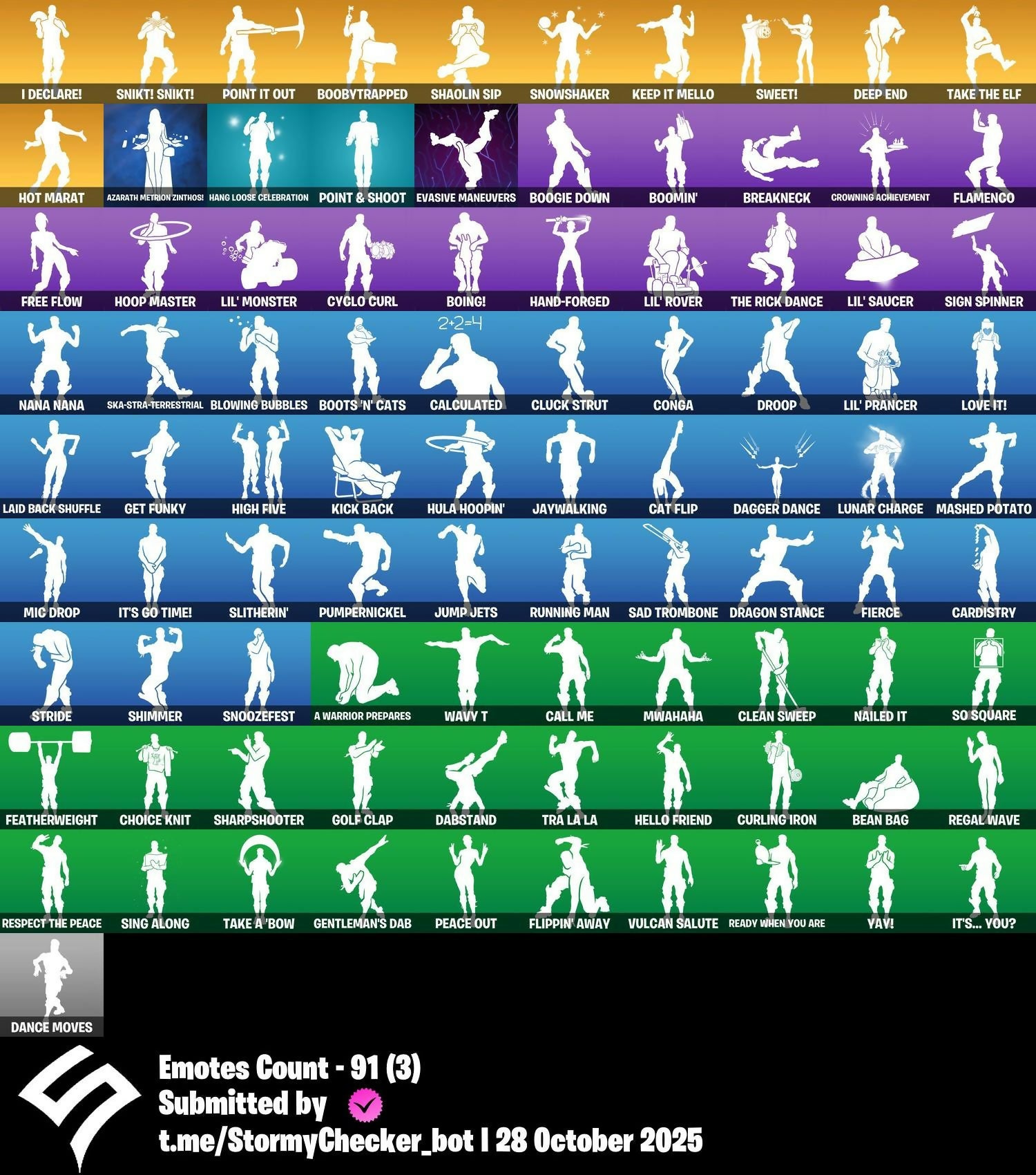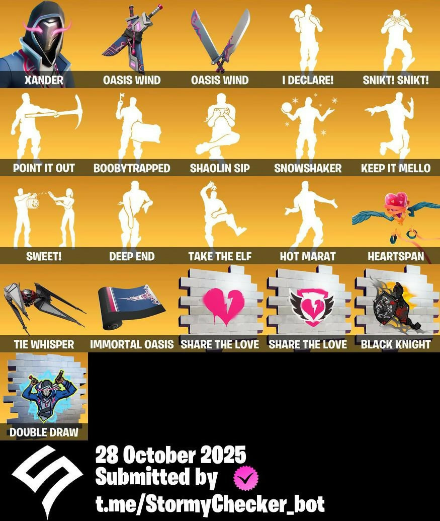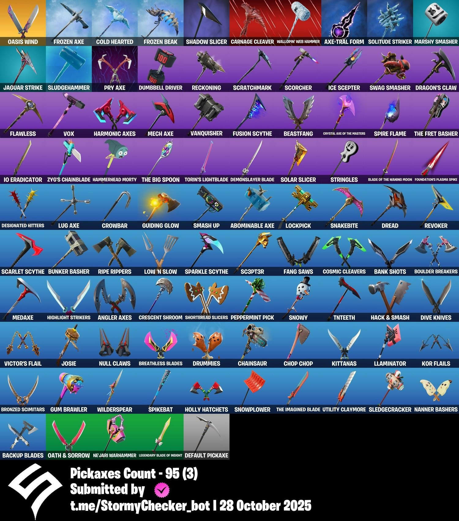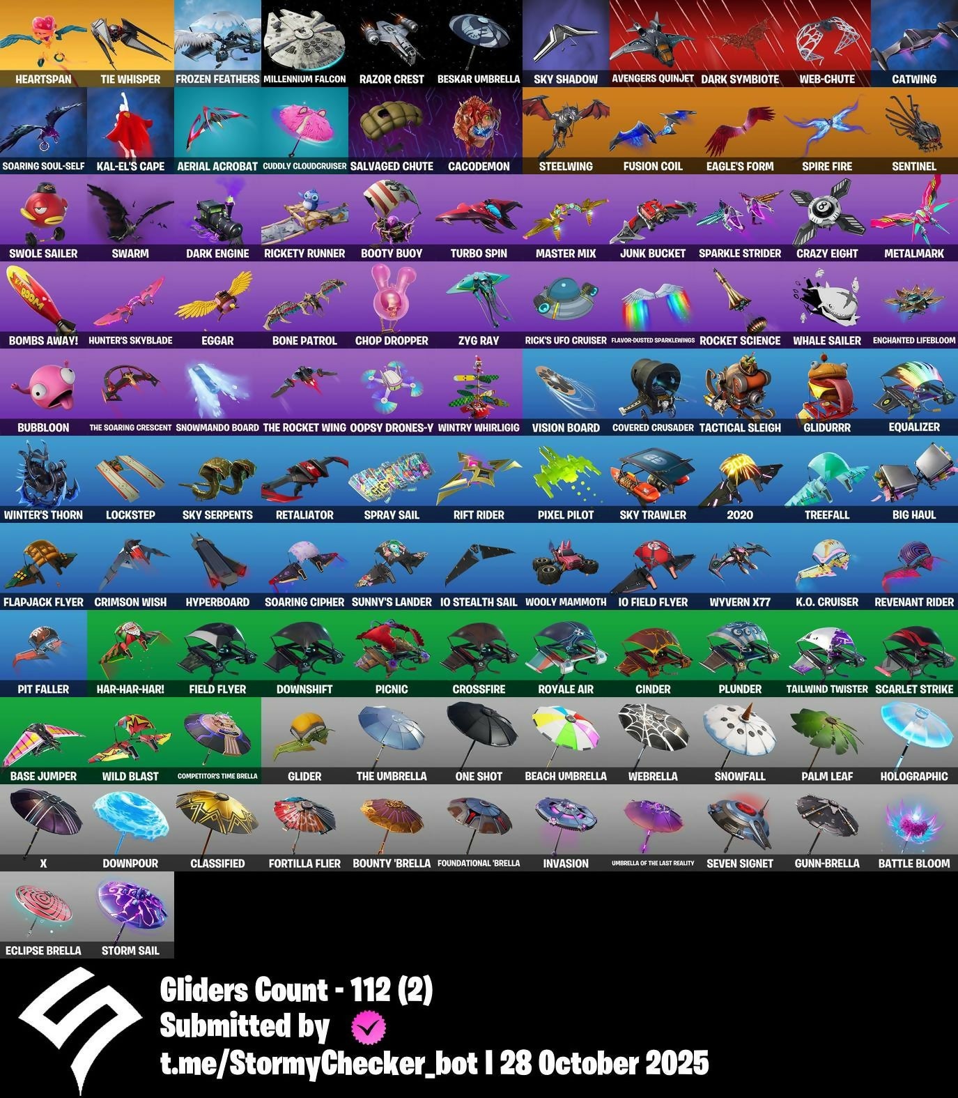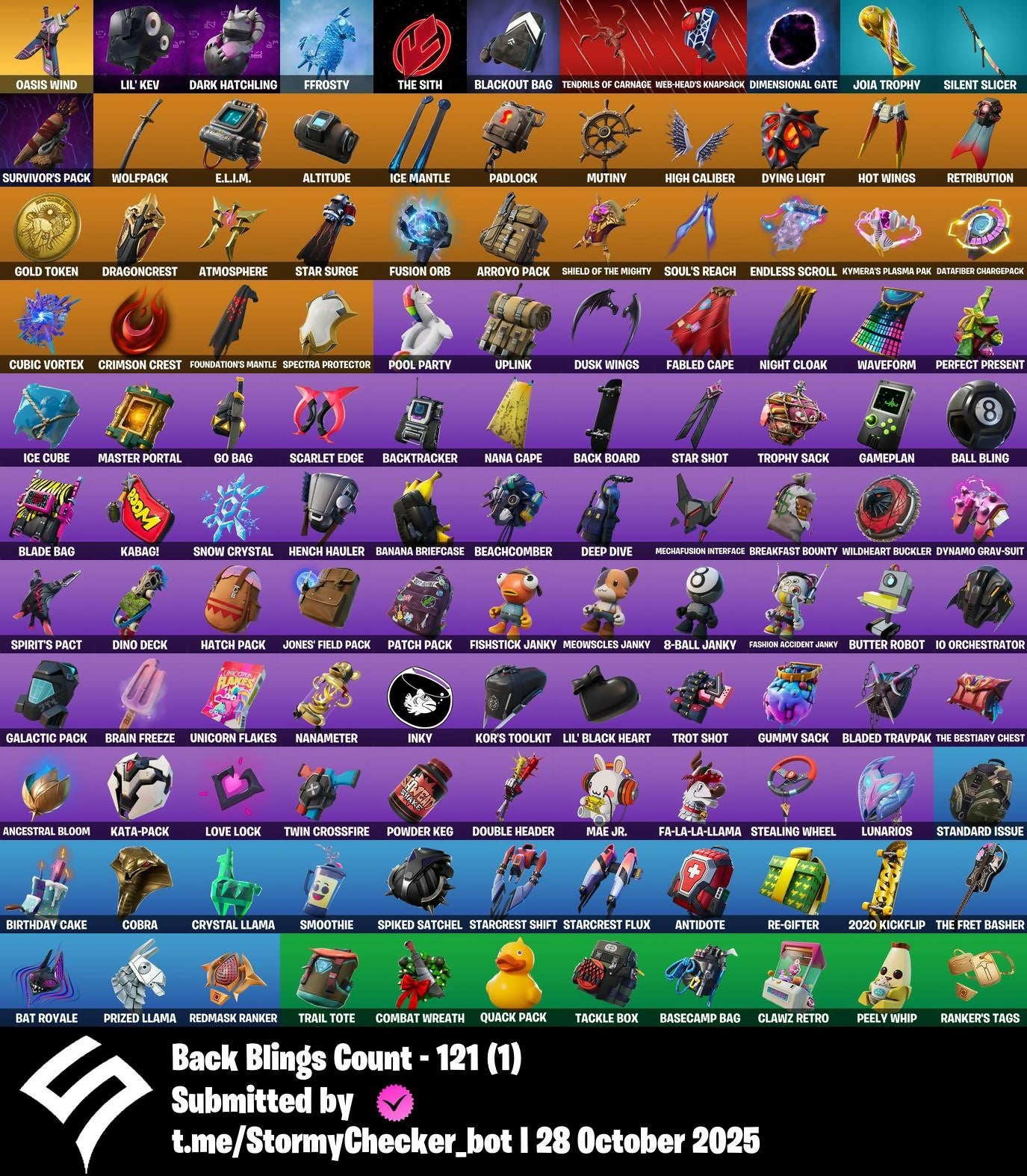 2020, 2020 Kickflip, 8-Ball Janky, 8-Ball Vs Scratch, A Warrior Prepares, A.I.M., Abominable Axe, Aerial Acrobat, Agent Jones, Agent Peely, Altitude, Ancestral Bloom, Andre, Angler Axes, Antidote, Arctic Adeline, Arroyo Pack, Atmosphere, Avengers Quinjet, Axe-tral Form, Azarath Metrion Zinthos!, Back Board, Backtracker, Backup Blades, Ball Bling, Banana Briefcase, Bank Shots, Base Jumper, Basecamp Bag, Bat Royale, Battle Bloom, Beach Umbrella, Beachcomber, Bean Bag, Beastfang, Beskar Umbrella, Big Haul, Birthday Cake, Black Knight, Blackheart, Blackout Bag, Blade Bag, Blade Of The Waning Moon, Bladed Travpak, Blizzabelle, Blowing Bubbles, Boing!, Bombs Away!, Bone Patrol, Boobytrapped, Boogie Down, Boomin', Boots 'N' Cats, Booty Buoy, Boulder Breakers, Bounty 'Brella, Brain Freeze, Breakfast Bounty, Breakneck, Breathless Blades, Bronzed Scimitars, Brutus, Bubloon, Bunker Basher, Bunker Jonesy, Butter Robot, Cacodemon, Calamity, Calculated, Call Me, Cameo Vs Chic, Cardistry, Carnage, Carnage Cleaver, Cat Flip, Catalyst, Catwing, Chainsaur, Charlotte, Choice Knit, Chop Chop, Chop Dropper, Cinder, Classified, Clawz Retro, Clean Sweep, Cluck, Cluck Strut, Clutch, Cobra, Cold Hearted, Combat Wreath, Competitor's Time Brella, Conga, Cosmic Cleavers, Covered Crusader, Crazy Eight, Crescent Shroom, Crimson Crest, Crimson Wish, Crossfire, Crowbar, Crowning Achievement, Crystal Axe Of The Masters, Crystal Llama, Cubic Vortex, Cuddly Cloudcruiser, Curling Iron, Cyclo Curl, DJ Vonder, Dabstand, Dagger Dance, Dance Moves, Danger Zone, Dark Engine, Dark Hatchling, Dark Symbiote, Dark Tricera Ops, Datafiber Chargepack, Deep Dive, Deep End, Default Pickaxe, Demi, Demonslayer Blade, Designated Hitters, Dimensional Gate, Dino Deck, Dire, Dive Knives, Doctor Slone, Double Draw, Double Header, Downpour, Downshift, Dragon Stance, Dragon's Claw, Dragoncrest, Dread, Droop, Drummies, Dumbbell Driver, Dusk, Dusk Wings, Dying Light, Dynamo Grav-Suit, E.L.I.M., Eagle's Form, Eclipse Brella, Eggar, Ember, Enchanted Lifebloom, Endless Scroll, Equalizer, Eternal Voyager, Evasive Maneuvers, Fa-La-La-Llama, Fabio Sparklemane, Fable, Fabled Cape, Fang Saws, Fashion Accident Janky, Featherweight, Ffrosty, Field Flyer, Fierce, Fishstick Janky, Flamenco, Flapjack Flyer, Flavor-Dusted Sparklewings, Flawless, Flippin' Away, Fortilla Flier, Foundation's Mantle, Foundation's Plasma Spike, Foundational 'Brella, Free Flow, Frozen Axe, Frozen Beak, Frozen Feathers, Fusion, Fusion Coil, Fusion Orb, Fusion Scythe, Galactic Pack, Gameplan, Gear Specialist Maya, Gentleman's Dab, Get Funky, Giddy-Up, Glider, Glidurr, Go Bag, Gold Token, Golf Clap, Grind, Guff Gringle, Guggimon, Guiding Glow, Gum Brawler, Gumbo, Gummy Sack, Gunn-Brella, Hack & Smash, Hammerhead Morty, Hand-Forged, Hang Loose Celebration, Har-Har-Har!, Harlowe, Harmonic Axes, Hatch Pack, Haven, Heartspan, Hello Friend, Hench Hauler, High Caliber, High Five, Highlight Strikers, Holly Hatchets, Holographic, Hoop Master, Hot Marat, Hot Wings, Hot Zone, Hula Hoopin', Hunter's Skyblade, Hybrid, Hyperboard, I Declare!, IO Eradicator, IO Field Flyer, IO Orchestrator, IO Stealth Sail, Ice Cube, Ice Mantle, Ice Scepter, Immortal Oasis, Inky, Invasion, It's Go Time!, It's... You?, J.B. Chimpanski, Jaguar Strike, Jaywalking, Joey, Joia Trophy, Jones' Field Pack, Josie, Journey Vs Hazard, Jump Jets, Junk Bucket, K.O. Cruiser, Kabag!, Kal-El's Cape, Kata-Pack, Keep It Mello, Kick Back, Kittanas, Kondor, Kor, Kor Flails, Kor's Toolkit, Krisabelle, Kymera, Kymera's Plasma Pak, Laid Back Shuffle, Lara Croft, Legendary Blade Of Insight, Lexa, Lil' Black Heart, Lil' Kev, Lil' Monster, Lil' Prancer, Lil' Rover, Lil' Saucer, Llaminator, Lockpick, Lockstep, Love It!, Love Lock, Low 'N Slow, Lt. Evergreen, Lt. John Llama, Lug Axe, Lunar Charge, Lunarios, Luxe, Lynx, Mae Jr., Mancake, Mandalorian, Marshy Smasher, Mashed Potato, Master Key, Master Mix, Master Portal, Mave, Mech Axe, Mechafusion Interface, Medaxe, Menace, Meowscles Janky, Metalmark, Mic Drop, Millennium Falcon, Mutiny, Mwahaha, Nailed It, Nana Cape, Nana Nana, Nanameter, Nanner Bashers, Ne'Jari Warhammer, Neymar Jr, Night Cloak, Nightshade, Null Claws, Oasis Wind, Oath & Sorrow, One Shot, Onesie, Oopsy Drones-Y, Padlock, Palm Leaf, Patch Pack, Peace Out, Peely, Peely Whip, Peppermint Pick, Perfect Present, Picnic, Pit Faller, Pixel Pilot, Plunder, Point & Shoot, Point It Out, Polar Peely, Pool Party, Powder, Powder Keg, Prized Llama, Pry Axe, Pumpernickel, Quack Pack, Ranker's Tags, Raz, Razor Crest, Re-Gifter, Ready When You Are, Rebirth Raven, Reckoning, Redmask Ranker, Reese, Regal Wave, Remedy Vs Toxin, Renee, Respect The Peace, Retaliator, Retribution, Revenant Rider, Revoker, Rick Sanchez, Rick's UFO Cruiser, Rickety Runner, Rift Rider, Ripe Rippers, Rippley Vs Slodge, Rocket Science, Ronin, Rox, Royale Air, Ruby Shadows, Ruin, Running Man, Sad Trombone, Salvaged Chute, Sc3pt3r, Scarlet Edge, Scarlet Scythe, Scarlet Strike, Scorcher, Scratchmark, Sentinel, Seven Signet, Sgt. Winter, Shadow Slicer, Shanta, Shaolin Sip, Share The Love, Sharpshooter, Shield Of The Mighty, Shimmer, Shortbread Slicers, Sidewinder, Sign Spinner, Silent Slicer, Sing Along, Singularity, Ska-Stra-Terrestrial, Sky Serpents, Sky Shadow, Sky Trawler, Sled Ready Guff, Sledgecracker, Slitherin', Sludgehammer, Smash Up, Smoothie, Snakebite, Snikt! Snikt!, Snoozefest, Snow Crystal, Snowfall, Snowmando Board, Snowplower, Snowshaker, Snowy, So Square, Soaring Cipher, Soaring Soul-Self, Solar Slicer, Solitude Striker, Soul's Reach, Sparkle Scythe, Sparkle Strider, Sparkle Supreme, Spectra Protector, Spider-Man, Spikebat, Spiked Satchel, Spire Assassin, Spire Fire, Spire Flame, Spirit's Pact, Spray Sail, Standard Issue, Star Shot, Star Surge, Starcrest Flux, Starcrest Shift, Stealing Wheel, Steelwing, Storm Sail, Stratus, Stride, Stringles, Sunny, Sunny's Lander, Survivor's Pack, Swag Smasher, Swarm, Sweet!, Swole Sailer, Tackle Box, Tactical Sleigh, Tailwin