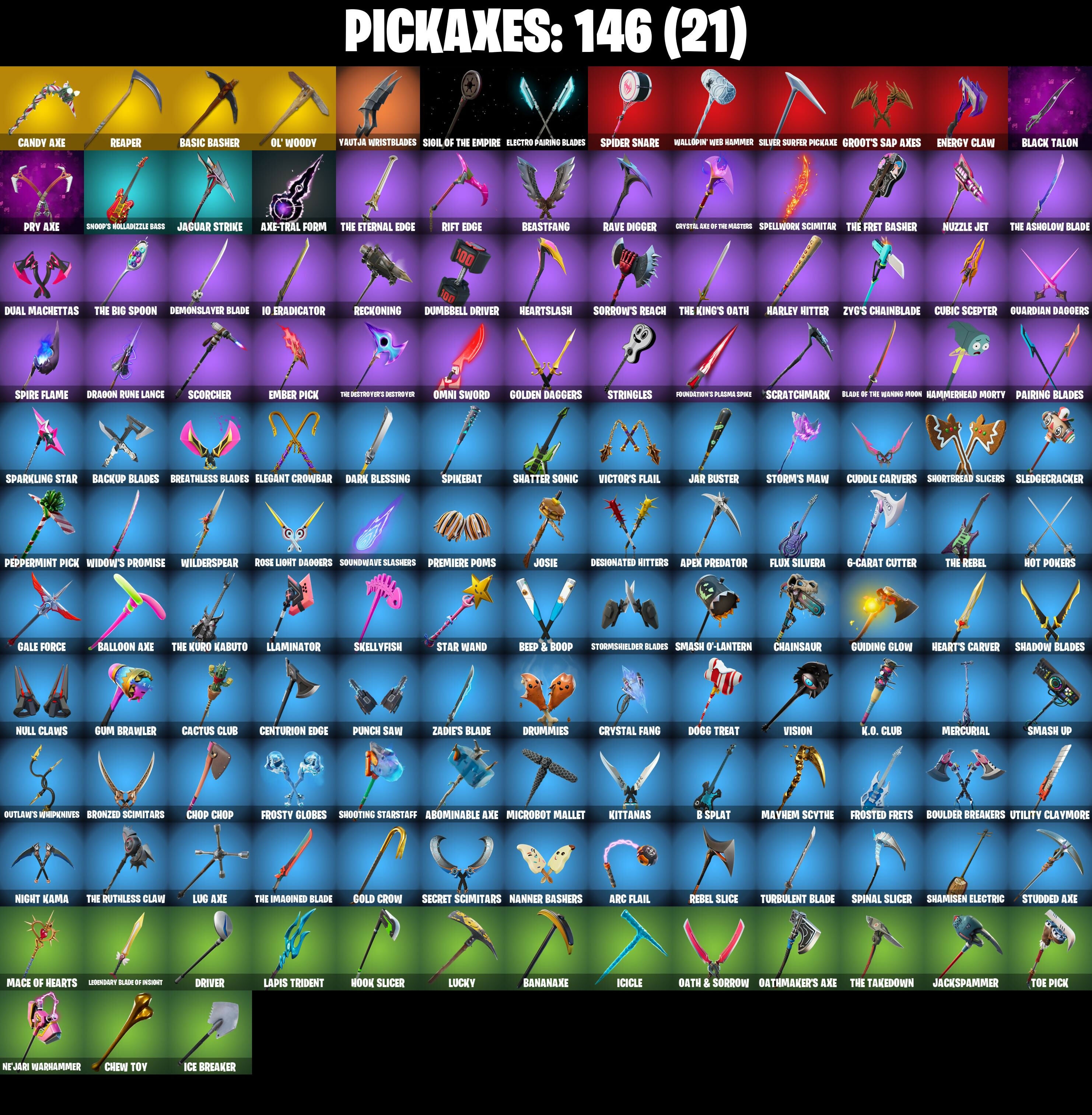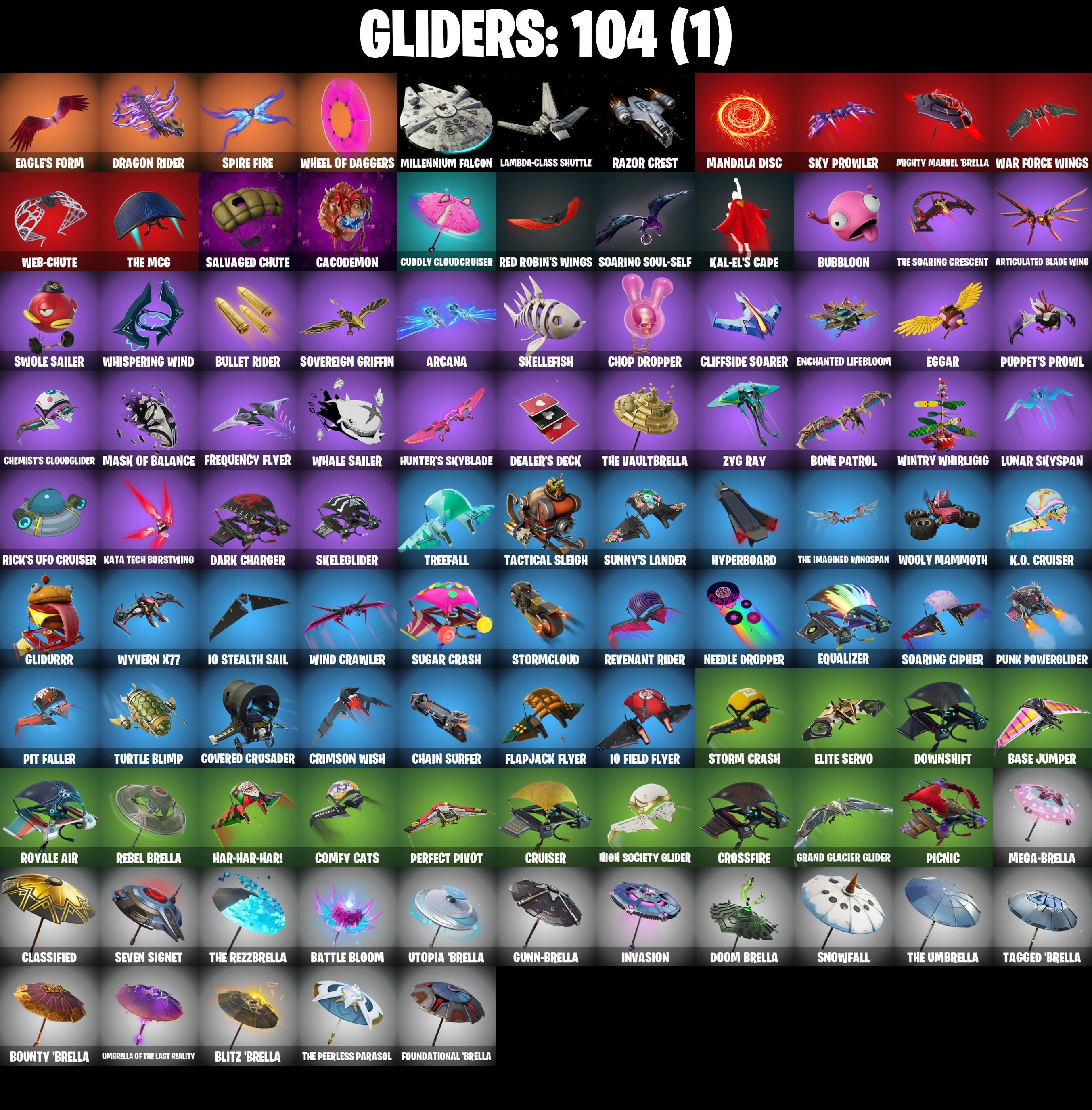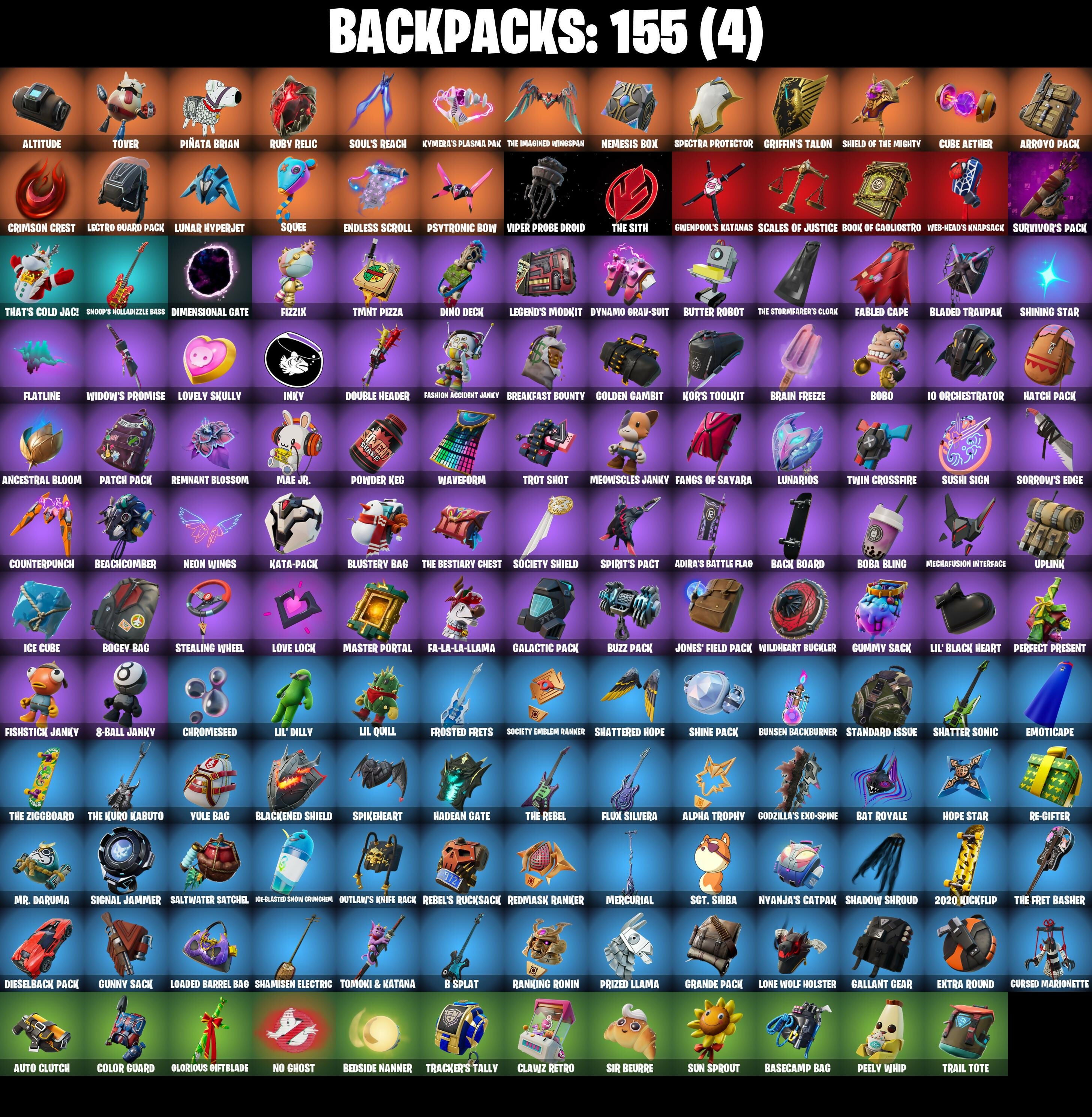 10 Field Flyer, 10 Stealth Sail, 2020 Kickflip, 6-Carat Cutter, 8-Ball Janky, A Warrior Prepares, Abominable Axe, Adira, Adira (Battle Mask), Adira's Battle Flag, Aftermath, Agent Jones, Agent Jones (Jump 31), Alli, Alpha Trophy, Altitude, Ancestral Bloom, Apex Predator, Arc Flail, Arcana, Arctic Adeline, Arctic Assassin, Arroyo Pack, Articulated Blade Wing, Astra, Aura, Auto Clutch, Axe-tral Form, Azarath Metrion Zinthos!, B Splat, B.R.U.T.E. Gunner, Back Board, Backlash, Backup Blades, Balloon Axe, Bananaxe, Baron's Hoard, Base Jumper, Basecamp Bag, Basic Basher, Bat Royale, Battle Bloom, Battlehawk, Beachcomber, Bean Bag, Beastfang, Bedside Nanner, Beep & Boop, Beep Beep, Birdie, Black Talon, Blackened Shield, Blade Of The Waning Moon, Bladed Travpak, Blitz 'Brella, Blowin' Up, Blustery Bag, Boba Bling, Bobo, Bogey Bag, Bone Patrol, Boogie Down, Book of Caolostro, Boomin', Boots 'N' Cats, Boulder Breakers, Bounty 'Brella, Brain Freeze, Brawler, Breakfast Bounty, Breakpoint, Breathless Blades, Bring It Around, Bronzed Scimitars, Brush Your Shoulders, Bubblon, Bullet Rider, Bunsen Backburner, Butter Robot, Buzz Pack, Cacodemon, Cactus Club, Calamity, Calamity Stage 5, Call Me, Candy Axe, Carbide, Cardistry, Cat Flip, Centurion, Centurion Edge, Chain Surfer, Chainsaur, Charlotte, Chemist's Cloudglider, Chew Toy, Chicken Wing It, Chop Chop, Chop Dropper, Chrome Punk, Chromeseed, Classified, Clawz Retro, Clean Sweep, Click!, Cliffside Soarer, Cluck, Cluck (Slurpy), Color Guard, Comfy Cats, Conjure Weapon, Counterpunch, Covered Crusader, Crimson Crest, Crimson Wish, Crossfire, Crowning Achievement, Cruiser, Crystal, Crystal Axe Of The Masters, Crystal Fang, Cube Aether, Cubic Scepter, Cuddle Carvers, Cuddly Cloudcruiser, Curling Iron, Cursed Marionette, Cyclo Curl, D'ark, DJ Yonder, Dagger Dance, Dark Blessing, Dark Charger, Darth Vader, Dealer's Deck, Deimos, Demonslayer Blade, Designated Hitters, Diamond Diva, Dieselback Pack, Dimensional Gate, Dino Deck, Dizzie, Doctor Slone, Doctor Strange, Dogg Treat, Doom Brella, Double Header, Downshift, Dragon Rider, Dragon Rune Lance, Drift, Drift Stage 5, Driver, Drummies, Dual Machettas, Dumbbell Driver, Dusk Knight, Dynamo Grav-Suit, Eagle's Form, Eggar, Electro Pairing Blades, Elegant Crowbar, Elite Servo, Ember Pick, Emoticape, Enchanted Lifebloom, Endless Scroll, Energy Claw, Equalizer, Erisa, Evasive Maneuvers, Evie, Evie (Summer Strider), Extra Round, Fa-La-La-Llama, Fable, Fabled Cape, Fangs of Sayara, Fashion Accident Janky, Fishstick, Fishstick Janky, Fist Bump, Fizzix, Flapjack Flyer, Flatline, Flippin' Away, Flux Silvera, Foil Flex, Foundation's Plasma Spike, Foundational 'Brella, Frequency Flyer, Frosted Frets, Frosty Globes, Galactic Pack, Gale Force, Gallant Gear, Gentleman's Dab, Get Griddy, Giddy-Up, Glidurr, Glorious Giftblade, Godzilla's Exo-Spine, Gold Crow, Golden Daggers, Golden Gambit, Golf Clap, Good Guy, Grand Glacier Glider, Grande Pack, Griffin's Talon, Groot's Sap Axes, Guardian Daggers, Guggimon, Guiding Glow, Guitar Walk, Gum Brawler, Gumbo, Gummy Sack, Gunn-Brella, Gunnar, Gunny Sack, Gwenpool's Katanas, Hadean Gate, Hammerhead Morty, Hand-Forged, Har-Har-Har!, Harley Hitter, Harlowe, Hatch Pack, Have A Seat, Haven, Haven (Tropical Chirper), Head (Droopy), Heart Sign, Heart's Carver, Heartslash, Hello Friend, High Society Glider, Holiday Boxy, Hook Slicer, Hope Star, Hot Pokers, Howl, Hunter's Skyblade, Huntress, Hyperboard, Hypnot-Eyes, I Declare!, IO Eradicator, IO Orchestrator, Ice Breaker, Ice Cube, Ice-Blasted Snow Crunch, Icicle, Imperial March, Inky, Invasion, It Is Finished, It's Go Time!, It's... You?, Jackspammer, Jaguar Strike, Jar Buster, Jet Signals, Joey, Jones' Field Pack, Josie, Jungle Scout, K.O. Club, K.O. Cruiser, Kal-El's Cape, Kata Tech Burstwing, Kata-Pack, Kiara K.O., Kiara K.O. (Captain's Bomber), Kick Back, Kittanas, Kondor, Kor, Kor's Toolkit, Kymera, Kymera's Plasma Pak, Lambda-Class Shuttle, Lapis Trident, Lara Croft, Last Forever, Laugh It Up, Lectro Guard Pack, Legend's Modkit, Legendary Blade Of Insight, Lexa, Lil Quill, Lil' Black Heart, Lil' Dilly, Lil' Monster, Lil' Prancer, Lil' Saucer, Llaminator, Loaded Barrel Bag, Lone Wolf Holster, Love It!, Love Lock, Lovely Skully, Lt. Evergreen, Lt. John Llama, Lucky, Lug Axe, Lunar Charge, Lunar Hyperjet, Lunar Skyspan, Lunarios, Lynx, Lynx (Stage 4 - No Ponytail), Mace Of Hearts, Mae Jr., Make A Seat, Malik, Malik (Solitary Defender), Mancake, Mandala Disc, Mandalorian, Manic, Marigold, Mashed Potato, Mask of Balance, Master Portal, Mave, Mave (Reactive Hair Off), Mayhem Scythe, Mecha Cuddle Master, Mechafusion Interface, Mega-Brella, Menace, Menace (Challenger Menace - Flame), Meowscles Janky, Mercurial, Mic Drop, Microbot Mallet, Mighty Marvel 'Brella, Millennium Falcon, Mina Park, Mr. Daruma, Mwahaha, My World, Nanner Bashers, Ne'Jari Warhammer, Needle Dropper, Nemesis Box, Neon Wings, Neymar Jr, Night Kama, Ninja Stance: Donnie, Ninja Stance: Leo, Ninja Stance: Mikey, Ninja Stance: Raph, No Ghost, Nog Ops, Null Claws, Nuzzle Jet, Nyanja's Catpak, Oath & Sorrow, Oathmaker's Axe, Ol' Woody, Omni Sword, Outlaw's Knife Rack, Outlaw's Whipknives, Pairing Blades, Party Hips, Patch Pack, Peely Whip, Peppermint Pick, Perfect Pivot, Perfect Present, Picnic, Pit Faller, Piñata Brian, Poised Playmaker, Popular Vibe, Powder, Powder (White), Powder Keg, Predator, Premiere Poms, Prized Llama, Prowler, Pry Axe, Psytronic Bow, Punch Saw, Punk Powerglider, Puppet's Prowl, Raise The Roof, Ranking Ronin, Rave Digger, Raz, Razor Crest, Re-Gifter, Ready When You Are, Reaper, Rebel Brella, Rebel Slice, Rebel's Rucksack, Rebirth Raven, Reckoning, Red Robin's Wings, Redline, Redmask Ranker, Reese, Regal Wave, Remnant Blossom, Respect The Peace, Revenant Rider, Rick Sanchez, Rick's Ufo Cruiser, Rift Edge, Rio Grande, Rock Paper Scissors, Rollie, Ronin, Ronin (Cape), Rose Light Daggers, Royale Air, Ruby Relic, Running Man, Runway Racer, Sabina, Sabina (Ponytail