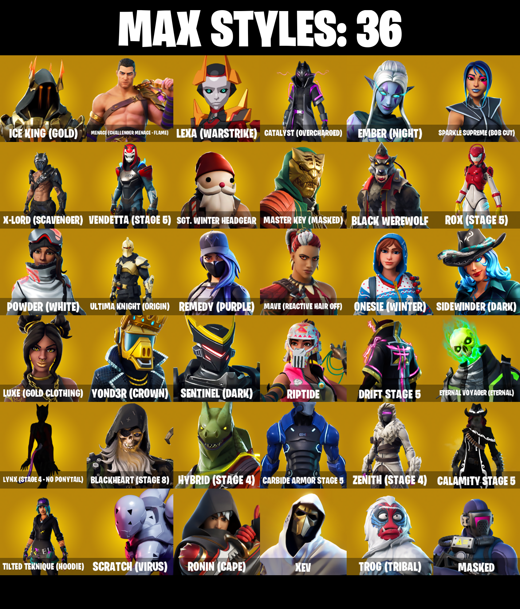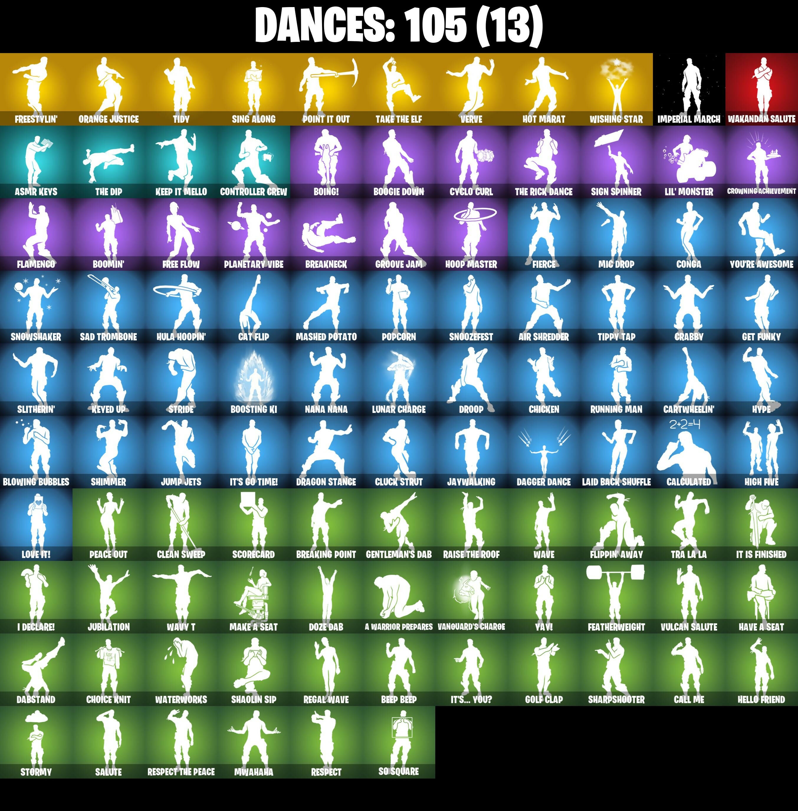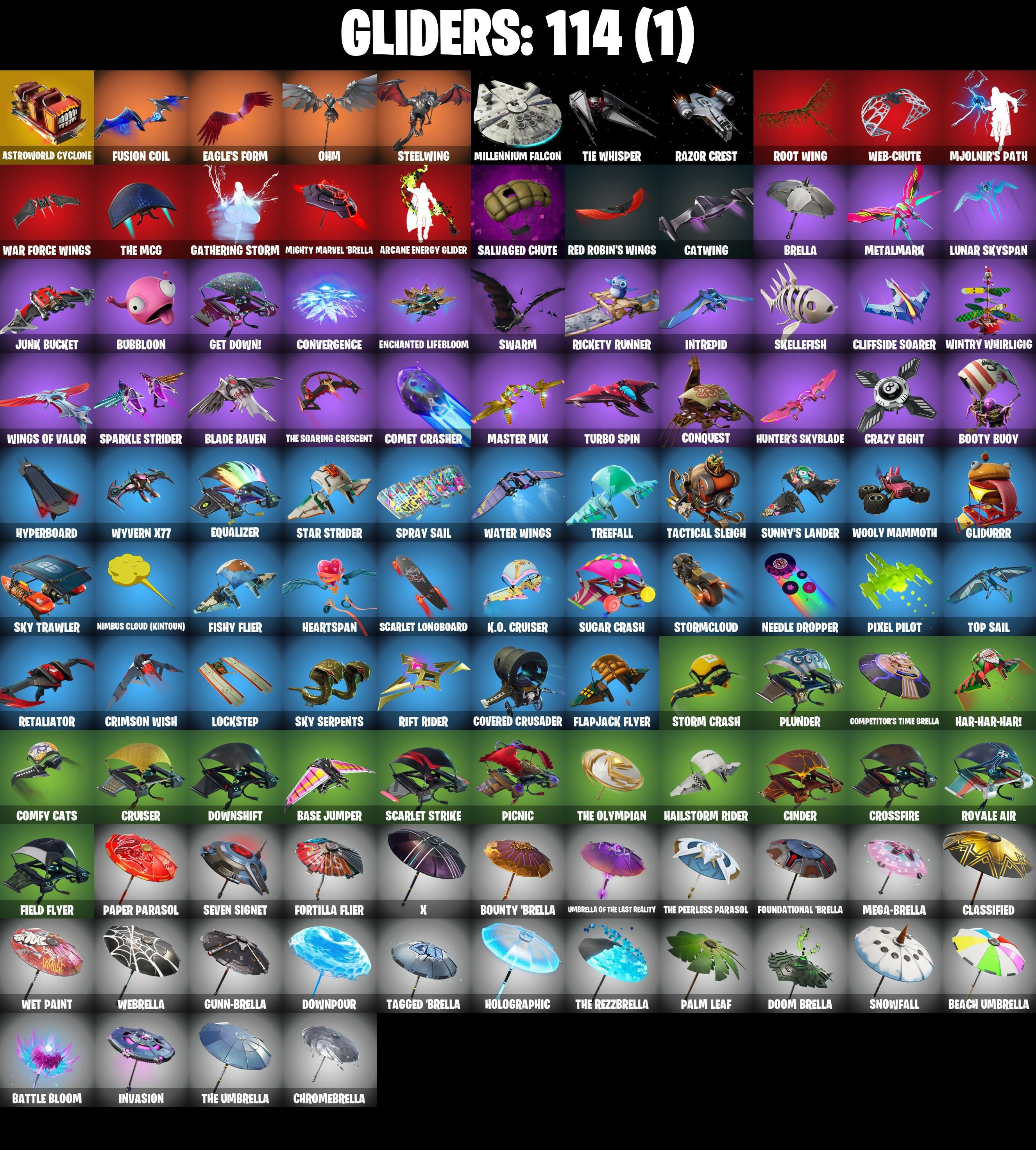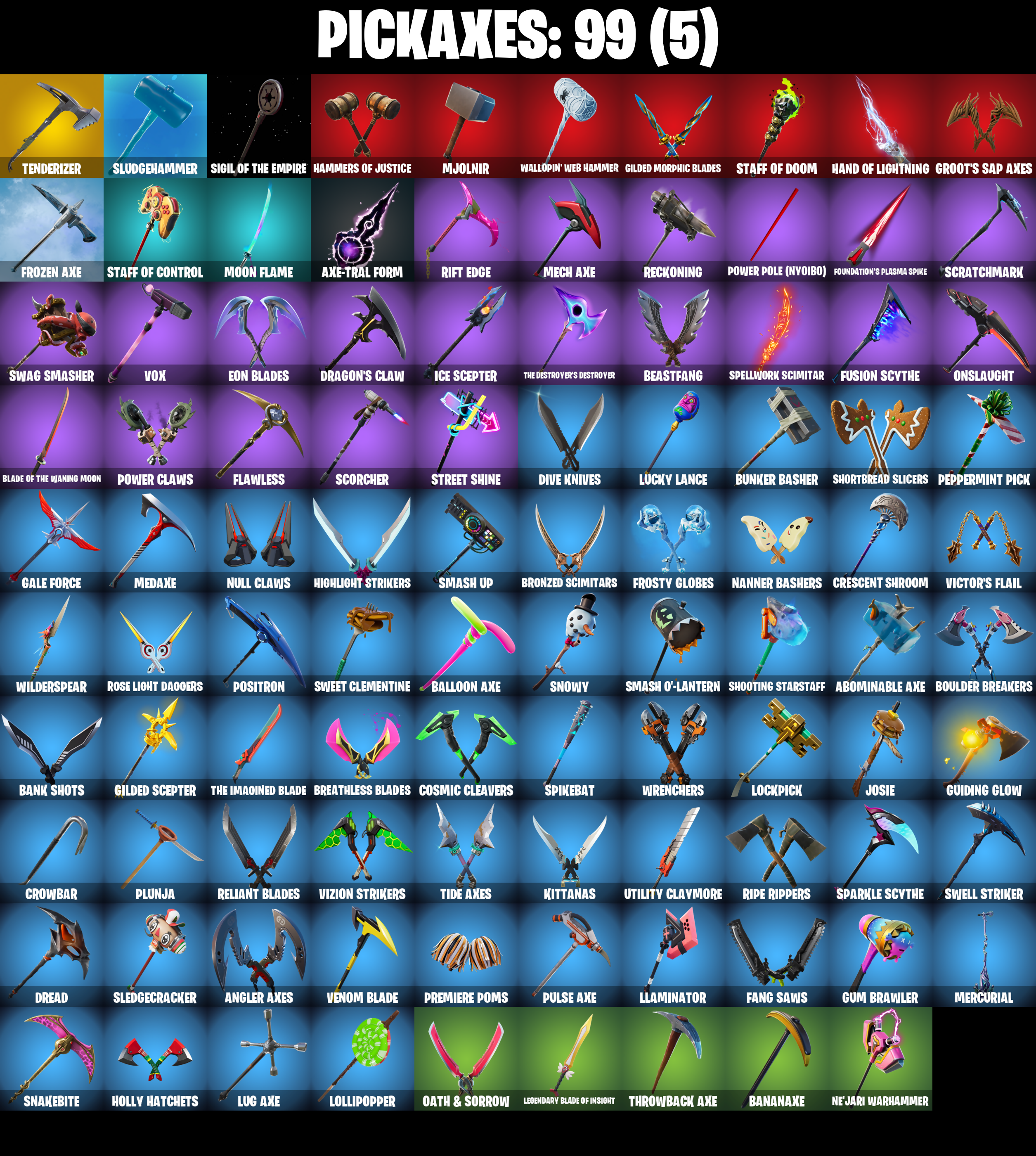 2020 Kickflip, 8-Ball Janky, 8-Ball VS Scratch, A Warrior Prepares, A.I.M., Abominable Axe, Adira's Battle Flag, Air Shredder, Altitude, Ancestral Bloom, Angler Axes, Antidote, Arcane Energy Glider, Arroyo Pack, Asmr Keys, Astroworld Cyclone, Aura, Axe-tral Form, Back Board, Backstabber, Ball Bling, Balloon Axe, Balls of Power, Bananaxe, Bank Shots, Base Jumper, Basecamp Bag, Battle Bloom, Battlehawk, Beach Umbrella, Beachcomber, Beastfang, Beep Beep, Black Werewolf, Blackheart, Blackheart (Stage 8), Blade Bag, Blade Of The Waning Moon, Blade Raven, Bladed Travpak, Blowing Bubbles, Blue Squire, Bobo, Bogey Bag, Boing!, Boogie Down, Boomin', Boosting Ki, Booty Buoy, Boulder Breakers, Bounty 'Brella, Breakfast Bounty, Breaking Point, Breakneck, Breathless Blades, Brella, Bronzed Scimitars, Bubloon, Bunker Basher, Bunker Jonesy, Calamity, Calamity Stage 5, Calculated, Call Me, Cameo VS Chic, Carbide, Carbide Armor Stage 5, Cartwheelin', Cat Flip, Catalyst, Catalyst (Overcharged), Catwing, Chicken, Choice Knit, Chromebrella, Cinder, Classified, Clawz Retro, Clean Sweep, Cliffside Soarer, Cluck Strut, Cobra, Combat Wreath, Comet Crasher, Comfy Cats, Competitor's Time Brella, Conga, Conquest, Controller Crew, Convergence, Cosmic Cleavers, Covered Crusader, Crabby, Crazy Eight, Crescent Shroom, Crimson Crest, Crimson Wish, Crossfire, Crowbar, Crowning Achievement, Cruiser, Crystal Llama, Cyclo Curl, DJ Yonder, Dabstand, Dagger Dance, Deep Dive, Demi, Dino Deck, Dire, Dive Knives, Doctor Doom, Doom Brella, Doom Chalice, Doom's Cowl, Downpour, Downshift, Doze Dab, Dragon Radar, Dragon Stance, Dragon's Claw, Dragoncrest, Dread, Drift, Drift Stage 5, Droop, Dry Bag, Dusk, Dusk Wings, Dying Light, Dynamo Grav-Suit, E.L.I.M., Eagle's Form, Ember, Ember (Night), Enchanted Lifebloom, Eon Blades, Equalizer, Eternal Knight, Eternal Shield, Eternal Voyager, Eternal Voyager (Eternal), Fa-La-La-Llama, Fable, Fabled Cape, Fade, Fang Saws, Featherweight, Field Flyer, Fierce, Fishstick Janky, Fishy Flier, Flamenco, Flapjack Flyer, Flawless, Flippin' Away, Fortilla Flier, Foundation's Mantle, Foundation's Plasma Spike, Foundational 'Brella, Free Flow, Freestylin', Frosty Globes, Frozen Axe, Fusion, Fusion Coil, Fusion Orb, Fusion Scythe, Gale Force, Gathering Storm, Gentleman's Dab, Get Down!, Get Funky, Giddy-Up, Gilded Morphic Blades, Gilded Scepter, Glidurr, Go Bag, Golf Clap, Goodie Bag, Groot, Groot's Sap Axes, Groove Jam, Guiding Glow, Gum Brawler, Gumbo, Gummy Sack, Gunn-Brella, Gwenpool's Katanas, Hadean Gate, Hailstorm Rider, Hammers Of Justice, Hand Of Lightning, Har-Har-Har!, Harlowe, Have A Seat, Haven, Heartspan, Hello Friend, High Caliber, High Five, Highlight Strikers, Holly Hatchets, Holographic, Hoop Master, Hot Marat, Hot Wings, Hula Hoopin', Hunter's Skyblade, Huntress, Hybrid, Hybrid (Stage 4), Hype, Hyperboard, I Declare!, Ice Cube, Ice King (Gold), Ice Mantle, Ice Scepter, Ice-Blasted Snow Cruncher, Ignition, Imperial March, Infinite Bloom, Intrepid, Invasion, It Is Finished, It's Go Time!, It's... You?, Jaywalking, Jennifer Walters, Josie, Journey VS Hazard, Jubilation, Jules, Jump Jets, Junk Bucket, K.O. Cruiser, Kata-Pack, Keep It Mello, Keyed Up, Kit, Kittanas, Komplex, Kondor, Laguna, Laid Back Shuffle, Lectro Guard Pack, Legendary Blade Of Insight, Lexa, Lexa (Warstrike), Lil' Black Heart, Lil' Kev, Lil' Monster, Llaminator, Lockpick, Lockstep, Lollipopper, Love It!, Love Lock, Love Ranger, Love Wings, Lt. Evergreen, Lt. John Llama, Lucky Lance, Lug Axe, Lunar Charge, Lunar Hyperjet, Lunar Skyspan, Luxe, Luxe (Gold Clothing), Lynx, Lynx (Stage 4 - No Ponytail), Major Mancake, Make A Seat, Mancake, Mandalorian, Mashed Potato, Masked, Master Key, Master Key (Masked), Master Mix, Master Portal, Mave, Mave (Reactive Hair Off), Mech Axe, Mechafusion Interface, Medaxe, Mega-Brella, Menace, Menace (Challenger Menace - Flame), Meowtooth Plush, Mercurial, Metalhead, Metalmark, Mic Drop, Mighty Marvel 'Brella, Millennium Falcon, Mini Moon, Mjolnir, Mjolnir's Path, Moon Flame, Mutiny, Mwahaha, Mystique, Mystique's Skull, Nana Bath, Nana Nana, Nanner Bashers, Ne'Jari Warhammer, Needle Dropper, Nemesis Box, Night Cloak, Nightshade, Nimbus Cloud (Kintoun), Null Claws, Nyanja's Catpak, Oath & Sorrow, Ocean, Offworld Rig, Ohm, Omega, Onesie, Onesie (Winter), Onslaught, Orange Justice, PJ Patroller, Padlock, Palm Leaf, Paper Parasol, Peace Out, Peely, Peely Whip, Peppermint Pick, Perfect Present, Picnic, Pineapple Strummer, Pink Plushie, Pixel Pilot, Planetary Vibe, Plunder, Plunja, Point It Out, Pool Party, Popcorn, Positron, Powder, Powder (White), Power Claws, Power Pole (Nyoibo), Precision, Premiere Poms, Prized Llama, Pulse Axe, Purple Jam, Raise The Roof, Ranker's Tags, Razor Crest, Re-Gifter, Rebel's Rucksack, Reckoning, Red Robin's Wings, Red-Nosed Raider, Redline, Reese, Regal Wave, Reliant Blades, Remedy (Purple), Remedy VS Toxin, Remnant Blossom, Respect, Respect The Peace, Retaliator, Retribution, Rickety Runner, Rift Edge, Rift Rider, Ripe Rippers, Rippley VS Sludge, Riptide, Ronin, Ronin (Cape), Root Wing, Rose Light Daggers, Rox, Rox (Stage 5), Royale Air, Rubius, Ruin, Running Man, Sad Trombone, Salute, Salvaged Chute, Sapling Groot, Scales of Justice, Scarlet Lonoboard, Scarlet Strike, Scorcher, Scorecard, Scratch (Virus), Scratchmark, Scuba Jonesy, Sentinel, Sentinel (Dark), Seven Signet, Sgt. Winter, Sgt. Winter Headgear, Shadow Ranker, Shanta, Shaolin Sip, Sharpshooter, Shield of the Mighty, Shimmer, Shooting Starstaff, Shortbread Slicers, Sidewinder, Sidewinder (Dark), Sigil Of The Empire, Sign Spinner, Sing Along, Siona, Skellefish, Sky Serpents, Sky Trawler, Sled Ready Guff, Sledgecracker, Slitherin', Sludgehammer, Smash O'-Lantern, Smash Up, Snakebite, Snoozefest, Snowfall, Snowshaker, Snowy, So Square, Son Goku, Sparkle Scythe, Sparkle Strider, Sparkle Supreme, Sparkle Supreme (Bob Cut), Spectra Protector, Spellwork Scimitar, Spider-Man, Spikebat, Spiked Satchel, Spirit's Pac