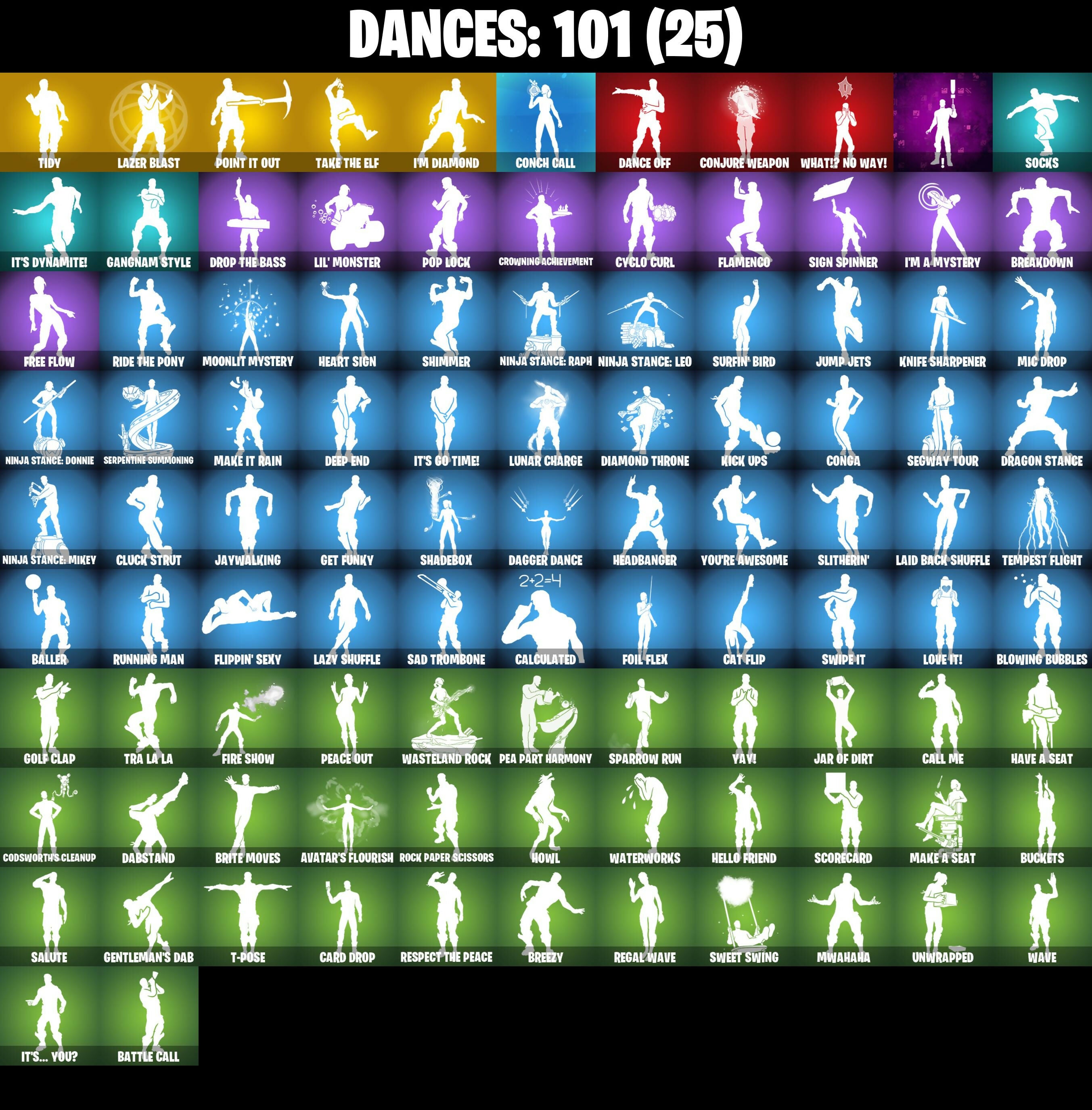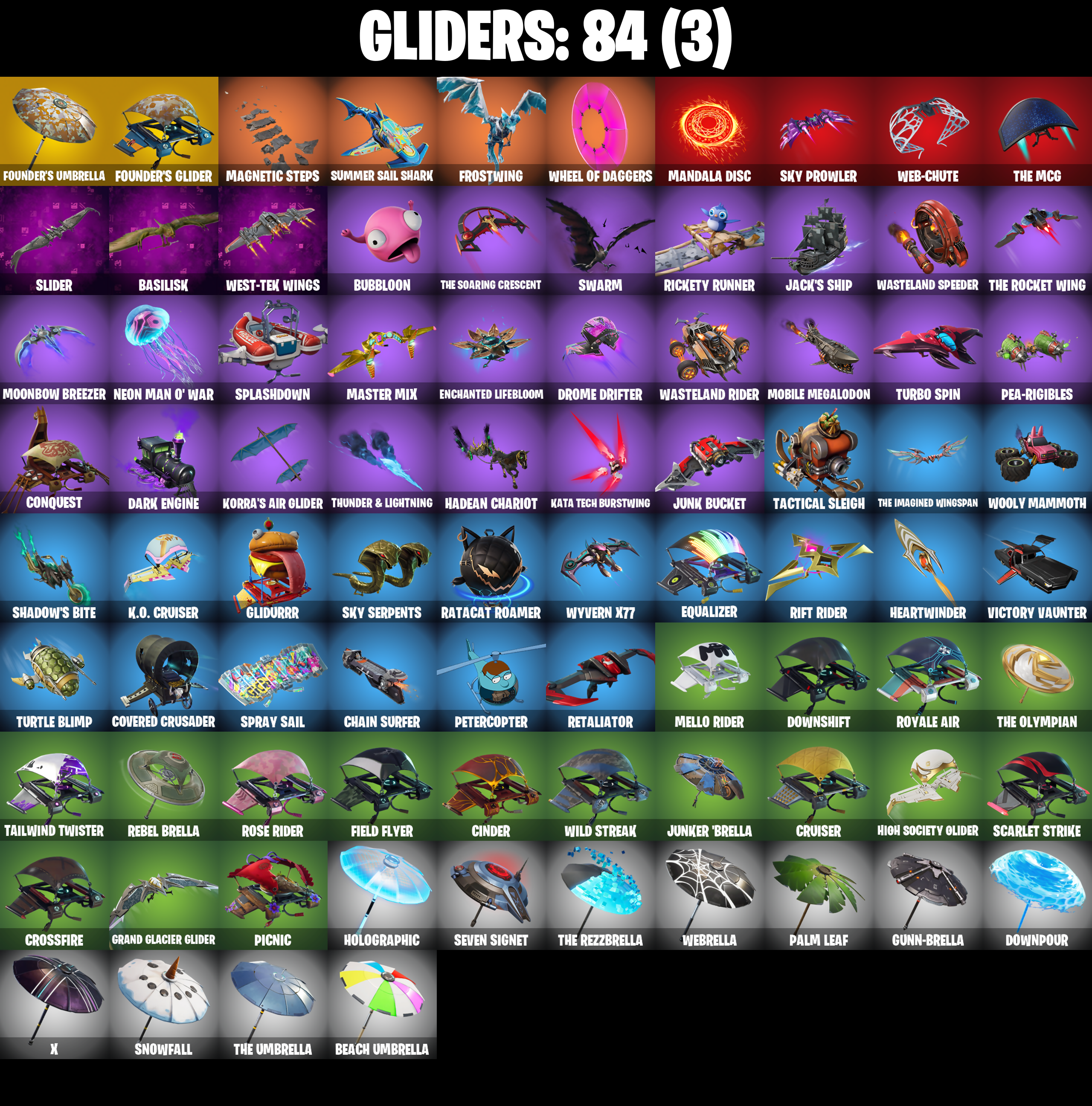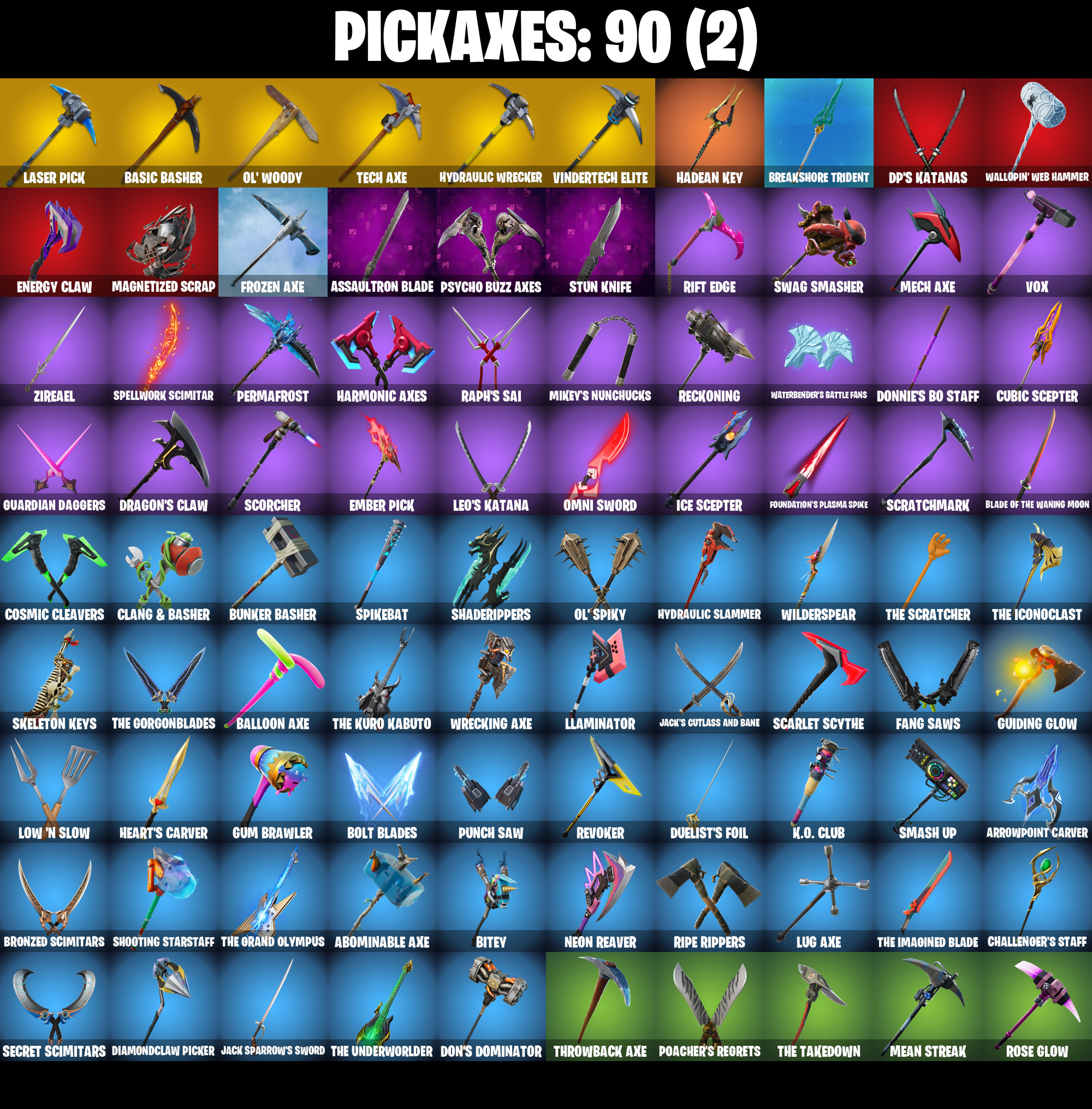 A.I.M., Abominable Axe, Altitude, Ancestral Bloom, Aphrodite, Arrowpoint Carver, Artemis, Assaultron Blade, Atmosphere, Avatar Cycle, Avatar's Flourish, Back Board, Backtracker, Balanced, Baller, Balloon Axe, Banner Cape, Basic Basher, Basilisk, Battle Call, Beach Umbrella, Birthday Cake, Bitey, Black Knight T-60 Power Armor, Black Werewolf, Blackheart, Blackheart (Stage 8), Blade Of The Waning Moon, Bladed Travpak, Blowing Bubbles, Blue Shift, Blue Striker, Bolt Blades, Book of Caolostro, Breakdown, Breakshore Trident, Breezy, Brite Moves, Brite Raider, Bronzed Scimitars, Bubloon, Buckets, Bunker Basher, Bunker Jonesy, Burning Ambition Valeria, Buzz Pack, Calamity, Calamity Stage 5, Calculated, Call Me, Carbon Fiber Holster, Card Drop, Cat Flip, Catalyst, Cerberus, Chain Surfer, Challenger's Staff, Cinder, Ciri, Clang & Basher, Clawbox, Clawz Retro, Clip Show Carry-All, Cluck Strut, Cobra, Codsworth's Cleanup, Combat Wreath, Conch Call, Conga, Conjure Weapon, Conquest, Cosmic Cleavers, Covered Crusader, Cozy Conch, Crimson Crest, Crossfire, Crowning Achievement, Cruiser, Cube Aether, Cubic Scepter, Cursed Jack Sparrow, Cyclo Curl, DJ Yonder, DP's Katanas, Dabstand, Dagger Dance, Dance Off, Dark Engine, Darklands Brite Raider, Dawn Duelist Nisha, Deadfire, Deadpool (Pen & Ink), Deck Ducky, Deep End, Demi, Diamond Throne, Diamondclaw Picker, Dieselback Pack, Dire, Doctor Strange, Doctor Strange (Stealth Silver), Don's Dominator, Donatello, Donnie's Bo Sheath, Donnie's Bo Staff, Downpour, Downshift, Dragon Stance, Dragon's Claw, Drift, Drift Stage 5, Drome Drifter, Dromerunner's Trophy, Drop The Bass, Duelist's Foil, Dusk, Dusk Wings, E.L.I.M., Ember Pick, Enchanted Lifebloom, Energy Claw, Enforcer, Equalizer, Erisa, Erisa (Stealth Silver), Eternal Ranker, Fable, Fabled Cape, Fancy Peter Griffin, Fang Saws, Field Flyer, Fire Show, Fizzix, Flamenco, Flippin' Sexy, Foil Flex, Foundation's Mantle, Foundation's Plasma Spike, Founder's Glider, Founder's Umbrella, Free Flow, Frostwing, Frozen Axe, Frozen Shroud, Gangnam Style, Gentleman's Dab, Get Funky, Giddy-Up, Glidurr, Go Bag, Golf Clap, Gorgon's Aegis, Grand Glacier Glider, Guardian Daggers, Guiding Glow, Gum Brawler, Gumbo, Gummy Sack, Gunn-Brella, Gunnar, Gunnar (Stealth Silver), Hadean Chariot, Hadean Gate, Hadean Key, Hades, Hard Boiled, Harlowe, Harmonic Axes, Have A Seat, Haven, Haven (Tropical Chirper), Headbanger, Headpool, Heart Sign, Heart's Carver, Heart's Rest, Heartbreaker, Heartwinder, Hello Friend, High Society Glider, Holographic, Hope, Hot Wings, Howl, Huntress, Huntress Lyre, Hybrid, Hybrid (Stage 4), Hydraulic Slammer, Hydraulic Wrecker, I'm A Mystery, I'm Diamond, Ice Cube, Ice King (Gold), Ice Mantle, Ice Scepter, Ignition Pack, Immortal Form, Imperial Stormtrooper, It's Dynamite!, It's Go Time!, It's... You?, Jack Sparrow, Jack Sparrow's Sword, Jack's Compass, Jack's Cutlass And Bane, Jack's Prize, Jack's Ship, Jackie, Jar Of Dirt, Jaywalking, Jump Jets, Jumpshot, Junk Bucket, Junker 'Brella, K.O. Club, K.O. Cruiser, Kata Tech Burstwing, Kata-Pack, Kiara K.O., Kiara K.O. (Captain's Bomber), Kick Ups, Knife Sharpener, Korra, Korra's Air Glider, Laid Back Shuffle, Laser Pick, Lazer Blast, Lazy Shuffle, Legend's Modkit, Leo's Katana, Leo's Saya, Leonardo, Lil' Monster, Liteshow, Llaminator, Love It!, Love Lock, Love Ranger, Love Wings, Low 'N Slow, Lt. John Llama, Lt. Logo, Lug Axe, Lunar Charge, Lynx, Lynx (Stage 4 - No Ponytail), Magnetic Steps, Magnetized Scrap, Magneto, Magneto's Cape, Make A Seat, Make It Rain, Mandala Disc, Marshmello, Master Mix, Master Portal, Mean Streak, Mech Axe, Medusa, Megalo Don, Megalopak, Mello Rider, Merry Marauder, Metal Gear Mk. II, Metalhead, Mic Drop, Michelangelo, Midfield Maestro, Mikey's Board & Chucks, Mikey's Nunchucks, Mini Marauder, Mobile Megalodon, Montague, Moonbow Breezer, Moonlit Mystery, Mutiny, Mwahaha, Nana Bath, Nana Cape, Neon Man O' War, Neon Reaver, Night Cloak, Night Hunter Scarr, Nightshade, Ninja Stance: Donnie, Ninja Stance: Leo, Ninja Stance: Mikey, Ninja Stance: Raph, Nisha, Nitro Fusion Megalo Don, Nog Ops, Ol' Spiky, Ol' Woody, Old Snake, Omni Sword, Onesie, Onesie (Winter), Oscar, Oxide Rust, Padlock, Palm Leaf, Pea Buddies, Pea Part Harmony, Pea-Rigibles, Peabody, Peace Out, Perfect Present, Permafrost, Peter Griffin, Petercopter, Picnic, Pip-Boy, Piñata Brian, Poacher's Regrets, Point It Out, Pool Party, Pop Lock, Poseidon, Powder, Powder (White), Prized Llama, Prowler, Psycho Bandit, Psycho Buzz Axes, Punch Saw, Pursuit, Quack Pack, Rabbit Raider, Ragnarok, Ragnarok (No Shoulder Pad), Raider's Trophy, Raph's Sai, Raph's Sai Holster, Raphael, Ratacat, Ratacat Roamer, Rearguard, Rebel Brella, Reckoning, Redline, Regal Wave, Respect The Peace, Retaliator, Retribution, Revoker, Rickety Runner, Ride The Pony, Rift Edge, Rift Rider, Ringmaster Scarr, Ripe Rippers, Rock Paper Scissors, Rogue Agent, Ronin, Ronin (Cape), Rook, Rose Glow, Rose Rider, Rose Team Leader, Rose of Avarice, Rough Cut Montague, Rox, Rox (Stage 5), Royale Air, Ruby Relic, Running Man, Rust, Rust Bucket, Sad Trombone, Salute, Scarlet Edge, Scarlet Scythe, Scarlet Strike, Scorcher, Scorecard, Scratchmark, Secret Scimitars, Segway Tour, Sentinel, Sentinel (Dark), Serpentine Summoning, Seven Signet, Sgt. Winter, Sgt. Winter Headgear, Shackled Stone, Shadebox, Shaderippers, Shadow's Bite, Shanta, Shimmer, Shock Brawler Oscar, Shooting Starstaff, Sidewinder, Sign Spinner, Singularity, Skeleton Keys, Skirmish, Skull and Crossed Swords, Skullder, Sky Prowler, Sky Serpents, Skynet Llama, Sledgehammer, Slider, Slitherin', Slurp Peabody, Smash Up, Snakebite Keyring, Snowfall, Society Emblem Ranker, Society Shield, Socks, Solid Snake, Sparrow Run, Spellwork Scimitar, Spider-Man, Spikebat, Spiked Satchel, Splashdown, Spray Sail, Stage 4, Standard Issue, Stratus, Stun Knife, Subjugator, Summer Sail Shark, Sun Sign, Sun Strider, Surfin' Bird, Swag Smasher, Swarm, Sweet Swing, Sweetheart, Swipe It, T-60