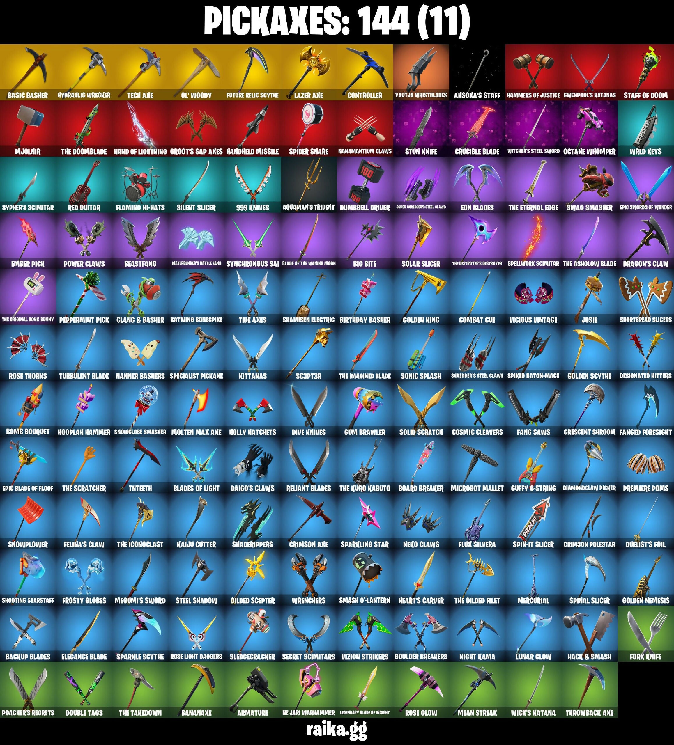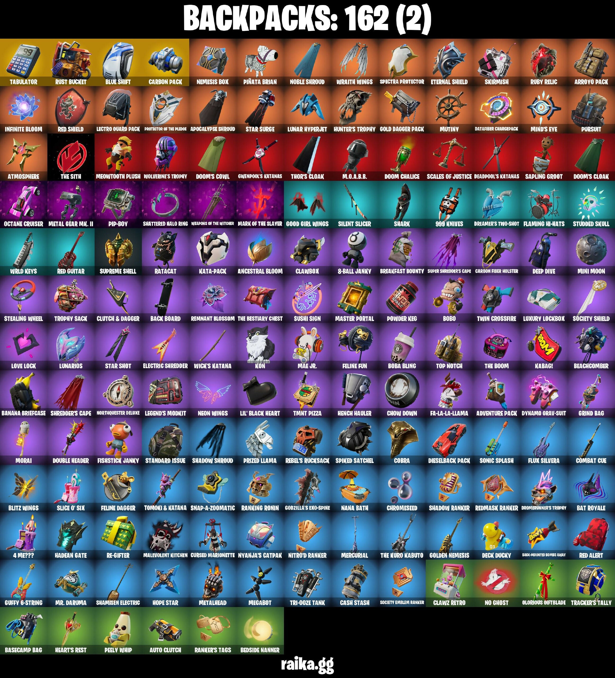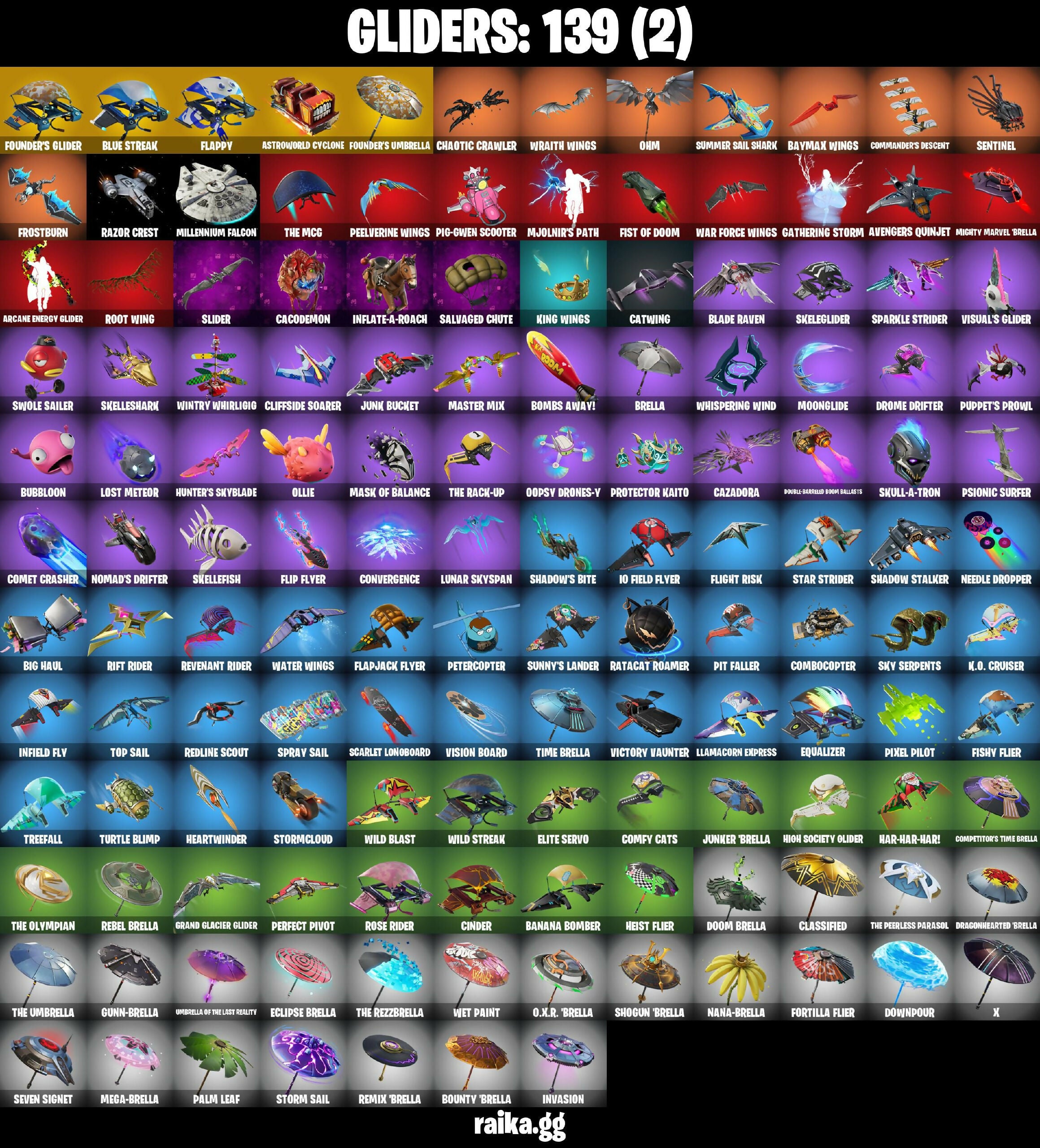 (Sniktt!), 4 Me???, 8-Ball Janky, 999, 999 Knives, Adventure Pack, Aerial Classic, Afterparty, Agent Jones, Agent Peely, Ahsoka Tano, Ahsoka's Staff, Air Shredder, All-Nighter, Ancestral Bloom, Antonia, Aphrodite, Apocalypse Shroud, Aquaman, Aquaman's Trident, Arcane Energy Glider, Arcane Steel, Arctic Adeline, Armature, Arroyo Pack, Arthur Curry, Ascension Nezumi, Astro Antidote, Astro Armor, Astro Jack, Astroworld Cyclone, Atmosphere, Auntie Dot, Auto Clutch, Avengers, Avengers Quinjet, Back Board, Backup Blades, Balance Board, Banana Bomber, Banana Briefcase, Bananaxe, Banner, Banner Icon, Baseball, Basecamp Bag, Basic Basher, Bat, Bat Royale, Batman, Battle Prep, Battle Prep: Super, Batwino Bonespike, Baymax Wings, Beachcomber, Beastfang, Beatbox, Beatzbunny, Bedside Nanner, Beep Beep, Big Bite, Big Haul, Bike To Go, Birthday Basher, Black, Black Hole, Blackheart, Blackheart (Stage 8), Blade Of The Waning Moon, Blade Raven, Blades Of Light, Blasted, Blitz Wings, Blowing Bubbles, Blue Shift, Blue Streak, Blue Striker, Blue Team Leader, Board Breaker, Boba Bling, Boba Snack, Bobo, Bomb Bouquet, Bombs Away!, Boogie Down, Boomin', Boulder Breakers, Bounty 'Brella, Breakfast Bounty, Breakneck, Brella, Brutus, Bubloon, Burning Ambition Valeria, Burpee, Burst Case Scenario, Bushie Bright, Buttoned Up, Bytes' Sigil, Cacodemon, Calico, Call Me, Called Shot, Captain America's Shield, Carbon Commando, Carbon Fiber Holster, Carbon Pack, Carbon Scarlet, Cash Stash, Catalyst, Catwing, Cazadora, Cerberus, Cerberus Bite, Chalked Up 1-Ball, Chaos Directive, Chaotic Crawler, Charlotte's Logo, Chef's Special, Choice Knit, Choppy, Chow Down, Chrome Marked, Chromeseed, Chronos Lock, Cinder, Clang & Basher, Classified, Clawbox, Clawz Retro, Clean Sweep, Cliffside Soarer, Cloudburst, Club President Helsie, Cluck, Clutch & Dagger, Cobra, Coin Flip, Collector Kado Thorne, Combat Cue, Combocopter, Comet Crasher, Comfy Cats, Commander's Descent, Competitor's Time Brella, Conga, Constructor, Contour Camo, Controlled Focus, Controller, Convergence, Coral Crush, Core, Corrosive Stripe, Cosmic Cleavers, Count It!, Cowboy Chat, Crack It, Crescent Shroom, Crimson Axe, Crimson Polestar, Crowning Achievement, Crucible Blade, Cryptic Sigil, Cube, Cubed, Cuddle Hearts, Cursed Marionette, Cyclo Curl, Dabstand, Dagger Dance, Daigo's Claws, Datafiber Chargepack, Dawn Duelist Nisha, Deadpool, Deadpool Unmasked, Deadpool's Katanas, Deck Ducky, Deep Dive, Denim Destiny, Designated Hitters, Destroyer Signature, Diamond Throne, Diamondclaw Picker, Dice Roll, Dieselback Pack, Dive Knives, Doctor Doom, Doggo, Dolphin, Doom, Doom Brella, Doom Chalice, Doom's Cloak, Doom's Cowl, Double Header, Double Tags, Double-Barreled Boom Ballista, Downpour, Doze Dab, Dragon Stance, Dragon's Claw, Dragonhearted Brella, Dreamer's Two-Shot, Driftwood, Drome Drifter, Dromerunner's Trophy, Duelist's Foil, Dumbbell Driver, Dumbell Driver, Durr Burger, Dusty, Dyna-Boom!, Dynamo Grav-Suit, Dynamo Tntoon-A, Eclipse Brella, Electric Shredder, Elegance Blade, Elite Servo, Ember Pick, Emote Camo, Eon Blades, Epic Blade Of Floof, Epic Swords Of Wonder, Eq, Equalizer, Escapees, Eternal Emblem, Eternal Shield, Exile's Emblem, Expressionism, Fa-La-La-Llama, Fade, Falling Leaf, Fang Saws, Fanged Foresight, Featherweight, Felina, Felina's Claw, Feline Dagger, Feline Fun, Ferocious, Final Eclipse, Fish Hook, Fishstick Janky, Fishy Flier, Fist, Fist Bump, Fist Of Doom, Fizzix, Flaky Feast, Flaming Hi-Hats, Flapjack Flyer, Flappy, Flight Risk, Flip Flyer, Flippin' Away, Floating Island, Flux Silvera, Foil Flex, Fork Knife, Fortilla Flier, Founder's Glider, Founder's Umbrella, Frostburn, Frosty Globes, Future Relic Scythe, Gathering Storm, Gear Specialist Maya, Geralt, Gila, Gila Classic, Gilded Heart, Gilded Scepter, Glorious Giftblade, Glory To Latveria, Godzilla's Exo-Spine, Gold Brutus, Gold Dagger Pack, Gold Midas, Golden Grin, Golden King, Golden Nemesis, Golden Scythe, Golden Shine, Good Girl Wings, Good Guy, Grand Glacier Glider, Grav-Fusion, Greed, Grid, Grind Bag, Gringle Gift, Groot, Groot's Sap Axes, Grriz, Guardian Jade, Guffy 6-String, Gum Brawler, Gumbo, Gunn-Brella, Gunnar's Special, Gwen-step, Gwenpool, Gwenpool's Katanas, Gwettermam Jacket, Hack & Smash, Hadean Gate, Hammers Of Justice, Hand Of Lightning, Hand of Trace, Handheld Missile, Happy, Har-Har-Har!, Haute Hustle, Haven, Heart Sign, Heart's Carver, Heart's Rest, Heartwinder, Heist Flier, Hello Friend, Hench, Hench Hauler, High Society Glider, High Stakes Club, Holiday Boxy, Holly Hatchets, Hooplah Hammer, Hop And A Wink, Hope, Hope Star, Hot Marat, Hunter Purple, Hunter's Skyblade, Hunter's Trophy, Hybrid, Hybrid (Stage 4), Hybrid Egg, Hydraulic Wrecker, Hypnot-Eyes, I Am Fearless, I'm A Mystery, IO Field Flyer, Igni Sign, Imagined Edge, Imagined Order, Imani, Industrious, Infield Fly, Infinite Bloom, Infinite Dab, Infinite Swirl, Inflate-A-Roach, Influential, Invasion, Invisible Cut, It's Like This, It's... You?, Jaywalking, Jedi Order, Jellyfish, Jennifer Walters, Jet Signals, Jolly Roger, Josie, Jubilation, Juice Wrld, Jujutsu Kaisen Emblem, Jules' Mask, Junk Bucket, Junker 'Brella, Jurassically Charged, K.O. Cruiser, Kabag!, Kaboom!, Kaiju Cutter, Kata-Pack, Kendo, Kevin, Keyed Up, King Wings, Kintsugi Daigo, Kit, Kittanas, Knee Slapper, Knife Sharpener, Knighted, Kon, Krisabelle, Kymera Swarm, Lady In Gold, Lazer Axe, Lbc Signature, Lectro Guard Pack, Legend's Modkit, Legend's Retribution, Legendary Blade Of Insight, Lil' Black Heart, Lil' Godzilla Attack, Lil' Prancer, Lil' T-6 Shuttle, Lithic, Llamacorn, Llamacorn Express, Lobby Classic, Lost Meteor, Love It!, Love Lock, Lt. Evergreen, Lucid Dreams, Lunar Glow, Lunar Hyperjet, Lunar Party, Lunar Skyspan, Lunarian Luxury, Lunarios, Luxury Lockbox, M.O.A.B.B., Machine Of War, Mae, Mae Jr., Mae's Sigil, Make A Seat, Malevolent Kitchen, Mancake, Mandala Disc, Mandalorian, Mark of the Slayer, Martial Arts Master, Mask Of Balance, Masked