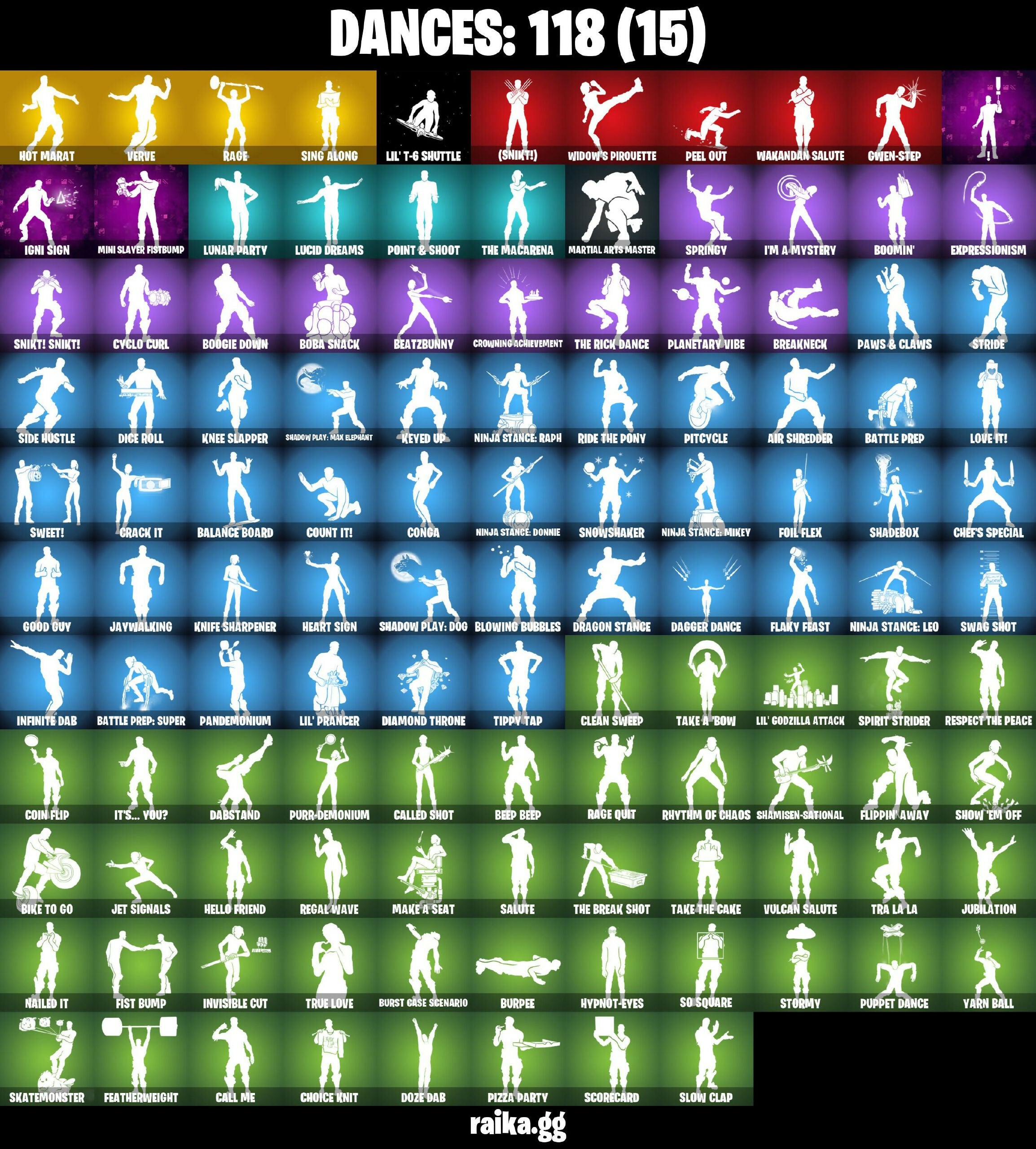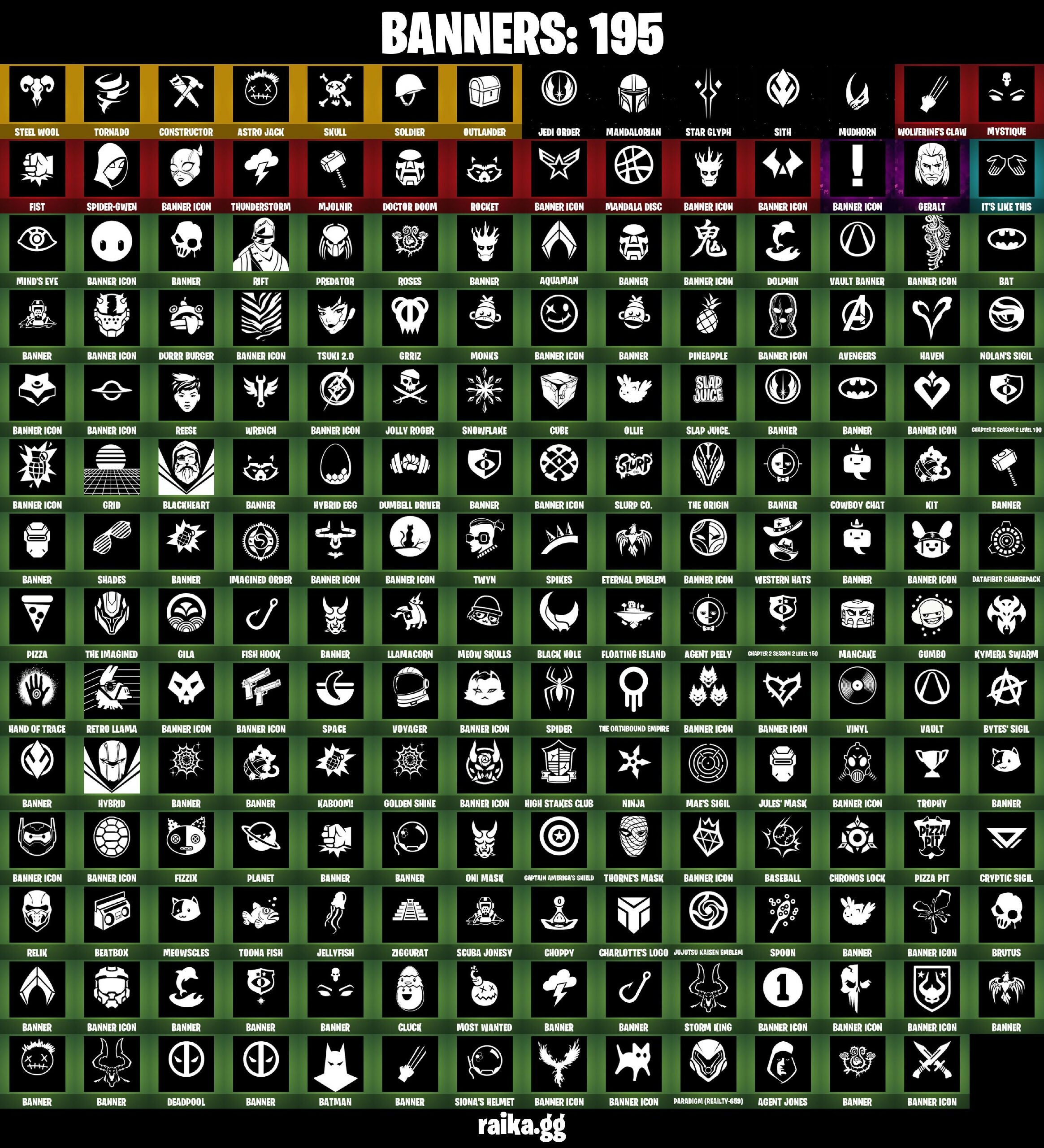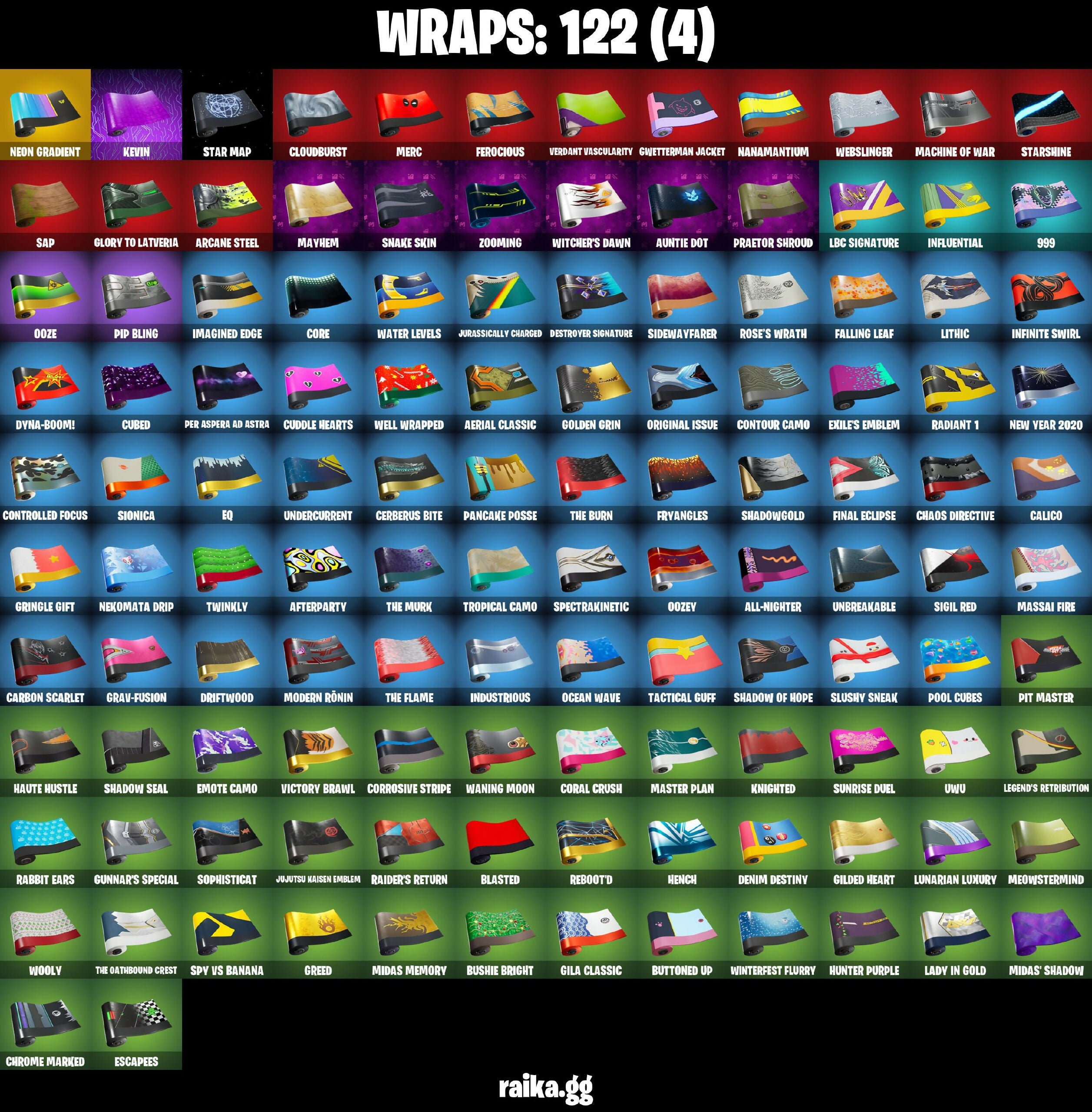 (Sniktt!), 4 Me???, 8-Ball Janky, 999, 999 Knives, Adventure Pack, Aerial Classic, Afterparty, Agent Jones, Agent Peely, Ahsoka Tano, Ahsoka's Staff, Air Shredder, All-Nighter, Ancestral Bloom, Antonia, Aphrodite, Apocalypse Shroud, Aquaman, Aquaman's Trident, Arcane Energy Glider, Arcane Steel, Arctic Adeline, Armature, Arroyo Pack, Arthur Curry, Ascension Nezumi, Astro Antidote, Astro Armor, Astro Jack, Astroworld Cyclone, Atmosphere, Auntie Dot, Auto Clutch, Avengers, Avengers Quinjet, Back Board, Backup Blades, Balance Board, Banana Bomber, Banana Briefcase, Bananaxe, Banner, Banner Icon, Baseball, Basecamp Bag, Basic Basher, Bat, Bat Royale, Batman, Battle Prep, Battle Prep: Super, Batwino Bonespike, Baymax Wings, Beachcomber, Beastfang, Beatbox, Beatzbunny, Bedside Nanner, Beep Beep, Big Bite, Big Haul, Bike To Go, Birthday Basher, Black, Black Hole, Blackheart, Blackheart (Stage 8), Blade Of The Waning Moon, Blade Raven, Blades Of Light, Blasted, Blitz Wings, Blowing Bubbles, Blue Shift, Blue Streak, Blue Striker, Blue Team Leader, Board Breaker, Boba Bling, Boba Snack, Bobo, Bomb Bouquet, Bombs Away!, Boogie Down, Boomin', Boulder Breakers, Bounty 'Brella, Breakfast Bounty, Breakneck, Brella, Brutus, Bubloon, Burning Ambition Valeria, Burpee, Burst Case Scenario, Bushie Bright, Buttoned Up, Bytes' Sigil, Cacodemon, Calico, Call Me, Called Shot, Captain America's Shield, Carbon Commando, Carbon Fiber Holster, Carbon Pack, Carbon Scarlet, Cash Stash, Catalyst, Catwing, Cazadora, Cerberus, Cerberus Bite, Chalked Up 1-Ball, Chaos Directive, Chaotic Crawler, Charlotte's Logo, Chef's Special, Choice Knit, Choppy, Chow Down, Chrome Marked, Chromeseed, Chronos Lock, Cinder, Clang & Basher, Classified, Clawbox, Clawz Retro, Clean Sweep, Cliffside Soarer, Cloudburst, Club President Helsie, Cluck, Clutch & Dagger, Cobra, Coin Flip, Collector Kado Thorne, Combat Cue, Combocopter, Comet Crasher, Comfy Cats, Commander's Descent, Competitor's Time Brella, Conga, Constructor, Contour Camo, Controlled Focus, Controller, Convergence, Coral Crush, Core, Corrosive Stripe, Cosmic Cleavers, Count It!, Cowboy Chat, Crack It, Crescent Shroom, Crimson Axe, Crimson Polestar, Crowning Achievement, Crucible Blade, Cryptic Sigil, Cube, Cubed, Cuddle Hearts, Cursed Marionette, Cyclo Curl, Dabstand, Dagger Dance, Daigo's Claws, Datafiber Chargepack, Dawn Duelist Nisha, Deadpool, Deadpool Unmasked, Deadpool's Katanas, Deck Ducky, Deep Dive, Denim Destiny, Designated Hitters, Destroyer Signature, Diamond Throne, Diamondclaw Picker, Dice Roll, Dieselback Pack, Dive Knives, Doctor Doom, Doggo, Dolphin, Doom, Doom Brella, Doom Chalice, Doom's Cloak, Doom's Cowl, Double Header, Double Tags, Double-Barreled Boom Ballista, Downpour, Doze Dab, Dragon Stance, Dragon's Claw, Dragonhearted Brella, Dreamer's Two-Shot, Driftwood, Drome Drifter, Dromerunner's Trophy, Duelist's Foil, Dumbbell Driver, Dumbell Driver, Durr Burger, Dusty, Dyna-Boom!, Dynamo Grav-Suit, Dynamo Tntoon-A, Eclipse Brella, Electric Shredder, Elegance Blade, Elite Servo, Ember Pick, Emote Camo, Eon Blades, Epic Blade Of Floof, Epic Swords Of Wonder, Eq, Equalizer, Escapees, Eternal Emblem, Eternal Shield, Exile's Emblem, Expressionism, Fa-La-La-Llama, Fade, Falling Leaf, Fang Saws, Fanged Foresight, Featherweight, Felina, Felina's Claw, Feline Dagger, Feline Fun, Ferocious, Final Eclipse, Fish Hook, Fishstick Janky, Fishy Flier, Fist, Fist Bump, Fist Of Doom, Fizzix, Flaky Feast, Flaming Hi-Hats, Flapjack Flyer, Flappy, Flight Risk, Flip Flyer, Flippin' Away, Floating Island, Flux Silvera, Foil Flex, Fork Knife, Fortilla Flier, Founder's Glider, Founder's Umbrella, Frostburn, Frosty Globes, Future Relic Scythe, Gathering Storm, Gear Specialist Maya, Geralt, Gila, Gila Classic, Gilded Heart, Gilded Scepter, Glorious Giftblade, Glory To Latveria, Godzilla's Exo-Spine, Gold Brutus, Gold Dagger Pack, Gold Midas, Golden Grin, Golden King, Golden Nemesis, Golden Scythe, Golden Shine, Good Girl Wings, Good Guy, Grand Glacier Glider, Grav-Fusion, Greed, Grid, Grind Bag, Gringle Gift, Groot, Groot's Sap Axes, Grriz, Guardian Jade, Guffy 6-String, Gum Brawler, Gumbo, Gunn-Brella, Gunnar's Special, Gwen-step, Gwenpool, Gwenpool's Katanas, Gwettermam Jacket, Hack & Smash, Hadean Gate, Hammers Of Justice, Hand Of Lightning, Hand of Trace, Handheld Missile, Happy, Har-Har-Har!, Haute Hustle, Haven, Heart Sign, Heart's Carver, Heart's Rest, Heartwinder, Heist Flier, Hello Friend, Hench, Hench Hauler, High Society Glider, High Stakes Club, Holiday Boxy, Holly Hatchets, Hooplah Hammer, Hop And A Wink, Hope, Hope Star, Hot Marat, Hunter Purple, Hunter's Skyblade, Hunter's Trophy, Hybrid, Hybrid (Stage 4), Hybrid Egg, Hydraulic Wrecker, Hypnot-Eyes, I Am Fearless, I'm A Mystery, IO Field Flyer, Igni Sign, Imagined Edge, Imagined Order, Imani, Industrious, Infield Fly, Infinite Bloom, Infinite Dab, Infinite Swirl, Inflate-A-Roach, Influential, Invasion, Invisible Cut, It's Like This, It's... You?, Jaywalking, Jedi Order, Jellyfish, Jennifer Walters, Jet Signals, Jolly Roger, Josie, Jubilation, Juice Wrld, Jujutsu Kaisen Emblem, Jules' Mask, Junk Bucket, Junker 'Brella, Jurassically Charged, K.O. Cruiser, Kabag!, Kaboom!, Kaiju Cutter, Kata-Pack, Kendo, Kevin, Keyed Up, King Wings, Kintsugi Daigo, Kit, Kittanas, Knee Slapper, Knife Sharpener, Knighted, Kon, Krisabelle, Kymera Swarm, Lady In Gold, Lazer Axe, Lbc Signature, Lectro Guard Pack, Legend's Modkit, Legend's Retribution, Legendary Blade Of Insight, Lil' Black Heart, Lil' Godzilla Attack, Lil' Prancer, Lil' T-6 Shuttle, Lithic, Llamacorn, Llamacorn Express, Lobby Classic, Lost Meteor, Love It!, Love Lock, Lt. Evergreen, Lucid Dreams, Lunar Glow, Lunar Hyperjet, Lunar Party, Lunar Skyspan, Lunarian Luxury, Lunarios, Luxury Lockbox, M.O.A.B.B., Machine Of War, Mae, Mae Jr., Mae's Sigil, Make A Seat, Malevolent Kitchen, Mancake, Mandala Disc, Mandalorian, Mark of the Slayer, Martial Arts Master, Mask Of Balance, Masked