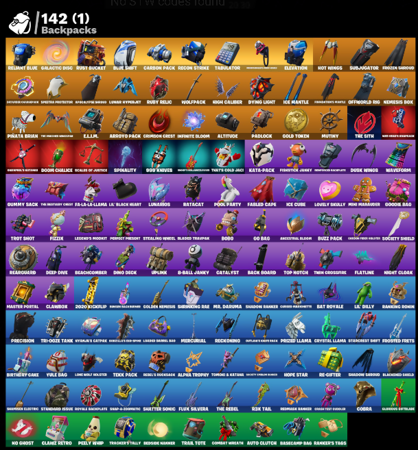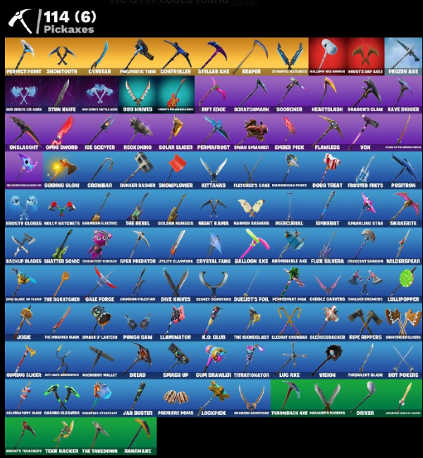 10 Field Flyer, 2020 Kickflip, 8-Ball Janky, 999 Knives, A.I.M., Abominable Axe, Aftermath, Alpha Trophy, Altitude, Ancestral Bloom, Apex Predator, Apocalypse Shroud, Arcana, Arctic Adeline, Arroyo Pack, Aura, Auto Clutch, Back Board, Backup Blades, Balloon Axe, Bandana Axe, Bankers Walrusklaw, Baron's Hoard, Base Jumper, Basecamp Bag, Bat Royale, Battlehawk, Beach Umbrella, Beachcomber, Bedside Manner, Big Dill, Birthday Cake, Blackened Shield, Blackheart, Bladed Trapjak, Blizzard Bomber, Blue Shift, Blue Streak, Blue Striker, Blue Team Leader, Blue Viper, Bobo, Boogie Down, Booty Buoy, Boulder Breakers, Bounty Brella, Breakdown, Bud-zero's Battle Axes, Bud-zero's Ice Axe, Bullet Rider, Bunker Basher, Bunker Jonesy, Burndown, Buzz Pack, Calamity, Calculated, Call Me, Carbide, Carbon Commando, Carbon Fiber Blaster, Carbon Pack, Cassidy Quinn, Catalyst, Catflip, Celebratory Slice, Chain Surfer, Choice Knit, Chromebrella, Chromebrella The Pixel, Cinder, Classic Combat Skulls, Classified, Clawbox, Clawz Retro, Clean Sweep, Cliffside Soarer, Cloud Striker, Cluck Strut, Coaxial Blue, Cobalt, Cobra, Combat Wreath, Cometbrella, Commando, Conga, Conquest, Controller, Cosmic Cleavers, Covered Crusader, Crash Test Goober, Cream Test Chugger, Crescent Shroom, Crimson Crest, Crimson Pole Star, Crossfire, Crossing Checkpoint, Crowbar, Cruiser, Crystal Fang, Crystal Llama, Cuddle Carvers, Curling Iron, Curved Polished 8-C, Cyber Glider Cruiser, Cyclo Curl, Cymitar, DJ Lights Card Trick, DJ Yonder, Dabstand, Dark Charger, Daywater Cross, Dealer's Deck, Deep Dive, Denim Blastercam, Diamond Club Pickaxe, Diamond Throne, Dino Deck, Dire, Discovery, Dive Knives, Dogo Treat, Doom Chalice, Downpour, Downshift, Doze Dab, Dragon Stance, Dragon's Claw, Dragonmaster Brella, Dread, Drift, Driver, Duelist's Foil, Dusk, Dusk Wings, Dying Light, E.L.I.M., Eader Pick, Electro Swing, Elegant Gorgbar, Elevation, Elite Servo, Ember, Enchanted Lifeslicer, Enforcer, Epic Blade of Flood, Equalizer, Fa-La-La-Llama, Fable, Fabled Cape, Field Flyer, Fierce, Fishstick Johnny, Fist Bump, Fixer, Fizzix, Flamenco, Flanvagk Flyer, Flappy, Flatline, Flawless, Fletcher Kane, Fletcher's Cane, Flippin' Away, Flux Silvera, Foil Flex, Follow The Butterfly, Fortilla Flier, Foundation Brella, Free Flow, Frog, Frostburn, Frosted Frets, Frosty Cloves, Frozen Axe, Frozen Shroud, Frozen Treat Cart, Galactic Disc, Galaxy, Gale Force, Gangnam Style, Gentleman's Dab, Get Funky, Get Griddy, Giddy-Up, Glidurr, Glorious Gutiblade, Glow, Go Bag, Gold Token, Golden Nemesis, Gole Clap, Goodie Bag, Groot's Blade, Groot's Sap Axes, Groove Jam, Guiding Glow, Gum Brawler, Gumbo, Gumboots Cloudglider, Gummy Sack, Gunnar, Harlowe, Haven, Heartslash, Hello Friend, High Caliber, High Society Glider, Holiday Boy X, Holly Hatchets, Holographic, Hoop Master, Hope, Hope Star, Hot Marat, Hot Pokers, Hot Wings, Humbug Slicer, Huntress, Hybrid, Hype, I Declare, I'm A Mystery, Ice Cube, Ice Mantle, Ice Scepter, In-Cited Scimitars, Infinite Bloom, Intrepid, Introducing..., Invasion, It's Chemistry!, It's Go Time!, It's... You, Jabbers Switchjaw, Jar Buster, Jaywalking, Josie, Joss, Jubilation, Jump Jets, Junk Bucket, K.O. Club, K.O. Cruiser, Kata-Pack, Keep It Mello, Keisha Cross, Kiara K.O., Kittanas, Knight's Treachery, Kombat Crasher, Krisabelle, Laminator, Legend's Modul, Lil' Black Heart, Lil' Dilly, Lil' Monster, Lil' Prancer, Loaded Basil Bag, Lockpick, Lockstep, Lollipopper, Lone Wolf Holster, Love It!, Lovely Skully, Lt. Evergreen, Lt. John Llama, Lug Axe, Lunar Charge, Lunar Hyperjet, Lunarios, Luxe, Lynx, Manner Bashers, Mask of Balance, Master Key, Master Portal, Mega-Brella, Mercurial, Merry Marauder, Mic Drop, Microbot Mallet, Mighty Marvel Bella, Millennium Falcon, Mini Marauder, Montague, Mr. Daruma, Muhahaha, Mutiny, Nailed It, Nana Nana, Needle Dropper, Nemesis Box, Night Cloak, Night Kama, Nightshade, Nisha, No Ghost, Nyanjas Catpak, Offworld Rig, Omega, One Shot, Onesie, Onslaught, Opini Sword, Orange Justice, Oscar, Outlands Shimmerslice, Outlaw Midas, Outlaw's Highspot, Outlaw's Sabre Pack, Outlaw's Strut, Oversized Strategy, Pack Leader, Padlock, Palm Leaf, Paper Parasol, Peace Out, Peely, Peely Whip, Peppermint Paragliders, Peppermint Pick, Perfect Pivot, Perfect Point, Perfect Present, Permafrost, Peter Griffin, Pickle Chip, Picnic, Pinata Brian, Pirouette, Pit Faller, Pizza Party, Pneumatic Twin, Point It Out, Point Patroller, Poised Playmaker, Polar Peely, Pool Party, Popcorn, Positron, Powder, Precision, Premier Poms, Prized Llama, Prodigy, Punch Saw, Punk Powerglider, Puppet's Prowl, R3X Tail, Ragnarok, Rambunctious, Ranker's Tags, Ranking Ronin, Ratatag Roamer, Ratcat, Rave Digger, Raven's Legion, Re-Gifter, Reaper, Rearguard, Rebel Brella, Rebel's Rugrask, Reckoning, Recon Strike, Red Robin's Wings, Redline, Redmask Ranker, Redwood Recon Lurker, Regal Wave, Reliant Blurr, Remix Brella, Respect, Respect This Peace, Revel, Revenant Rider, Rickety Runner, Rift Edge, Ripe Rippers, Rogue Agent, Ronin, Rook, Rox, Royale Air, Royale Backplate, Ruby Relic, Ruin, Running Man, Runway Racer, Rust Bucket, Sackin', Sad Trombone, Salute, Salvaged Chute, Santa Doggo, Scales Of Justice, Scarlet Commander, Scarlet Defender, Scarlet Longboard, Scarlet Strike, Scorcher, Scratchmark, Secret Ember Banner, Secret Scimitars, Segway Tour, Sentinel, Seven Signet, Sgt. Green Clover, Sgt. Winter, Shadow Ranker, Shadow Shroud, Shamisen Electric, Shamisen Electrix, Shanta, Sharpshooter, Shatter Sonic, Shimmer, Shooting Starflare, Show 'Em Off, Sidewinder, Sign Spinner, Silver Juice World, Sing Along, Skellefish, Skelleshark, Skerran, Sky Serpents, Slayer of the Winged Frost, Sled Ready Guff, Sledgecracker, Sledgehammer, Slitherin', Smash O'-Lantern, Smash Up, Snakebite, Snap-O-Zombie, Snikt! Snikt!, Snoozefest, Snow Sailer, Snowfall, Snowplower, Snowshaker, Snowtooth, So Square, Society Shield, Solar Slicer, Sparkling Star, Spectra Protector, Spider-Man, Spikebat, S