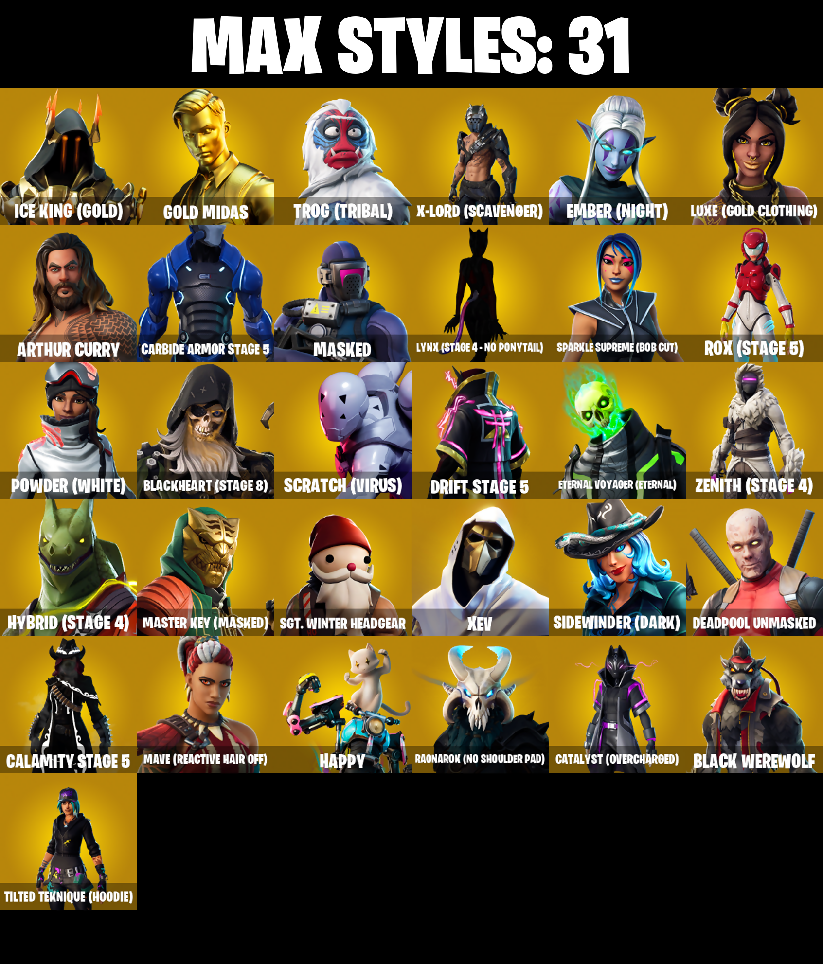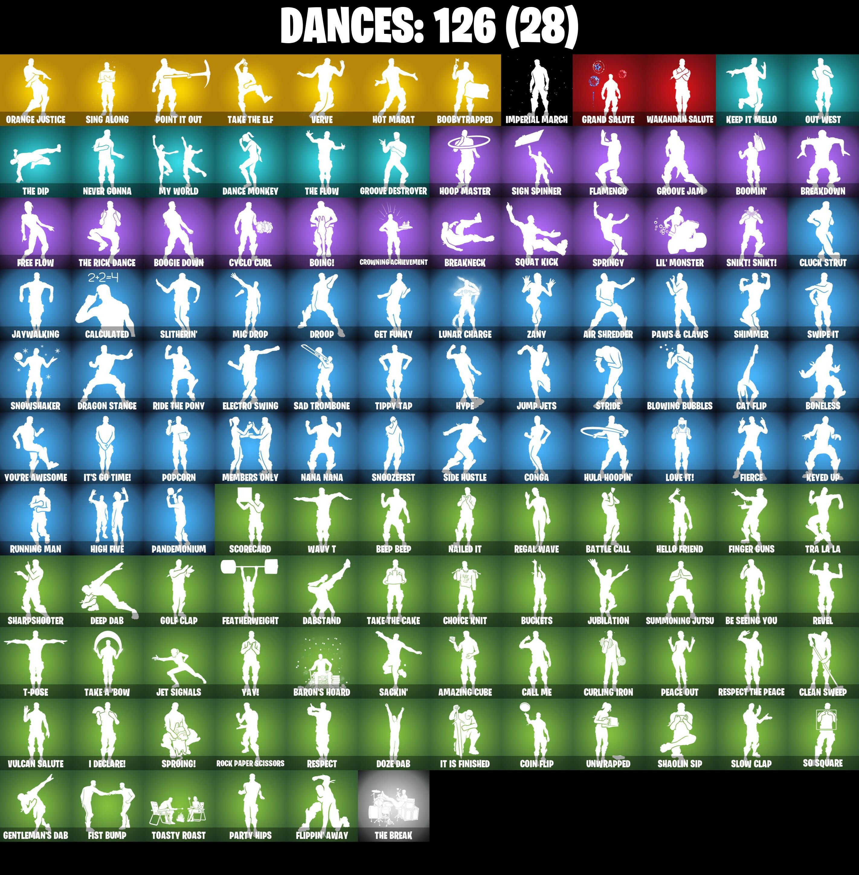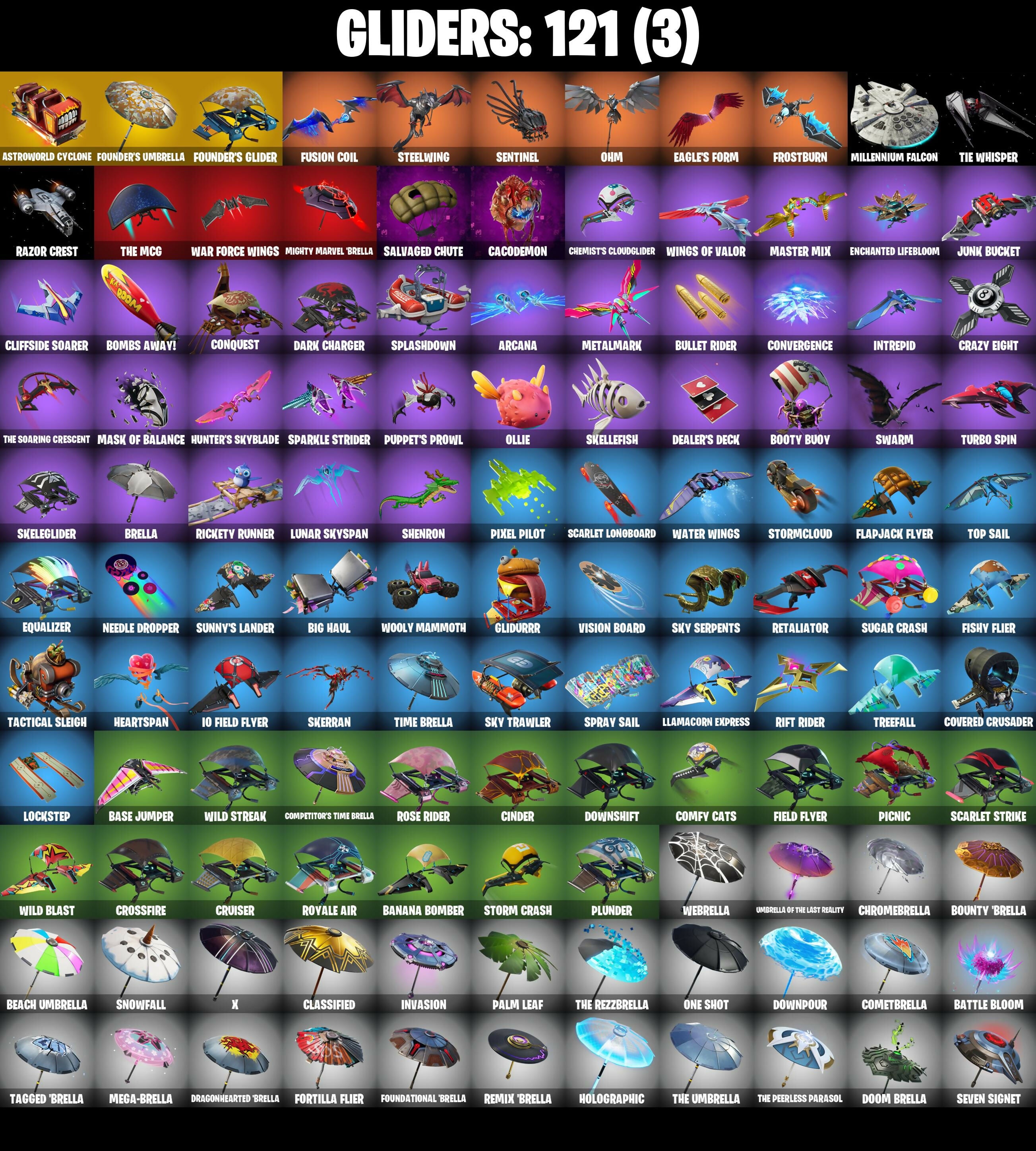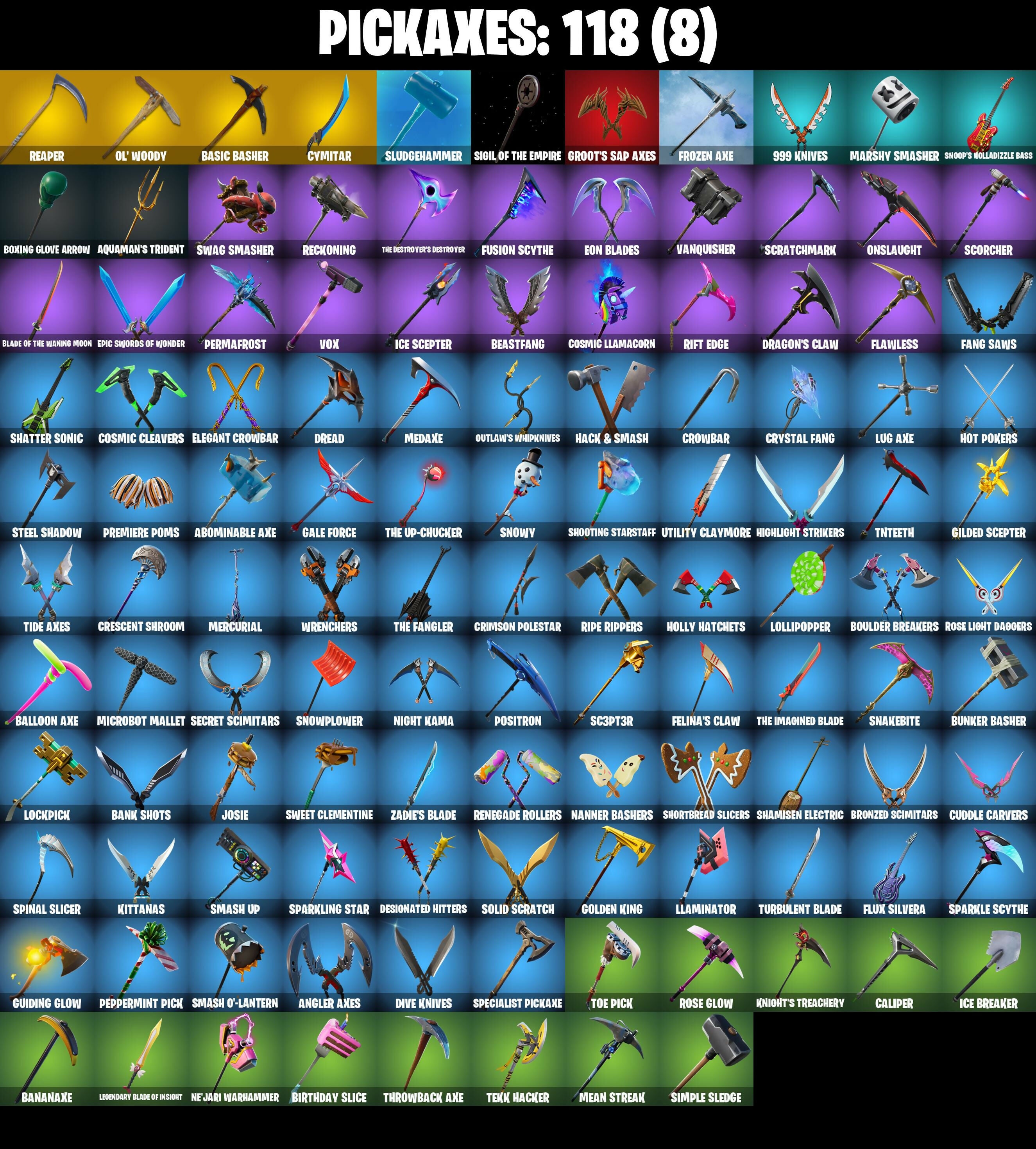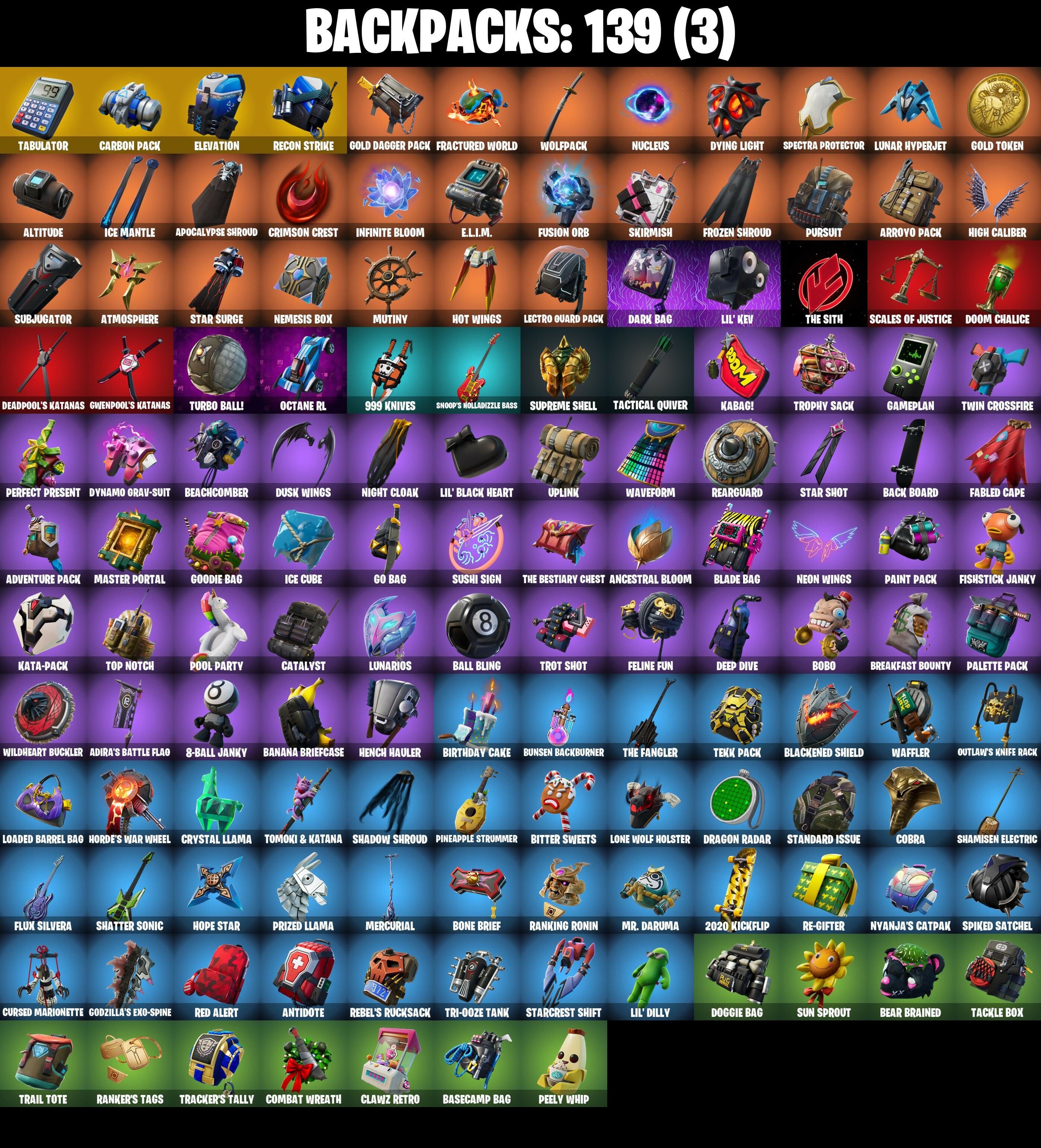 2020 Kickflip, 8-Ball Janky, 8-Ball Vs Scratch, 999 Knives, , A.I.M., Abominable Axe, Adira's Battle Flag, Adventure Pack, Agent Peely, Air Shredder, Altitude, Amazing Cube, Ancestral Bloom, Angler Axes, Antidote, Apocalypse Shroud, Aquaman, Aquaman's Trident, Arcana, Arroyo Pack, Arthur Curry, Astroworld Cyclone, Atmosphere, Aura, Back Board, Ball Bling, Balloon Axe, Banana Bomber, Banana Briefcase, Bananaxe, Bank Shots, Baron's Hoard, Base Jumper, Basecamp Bag, Basic Basher, Battle Bloom, Battle Call, Battlehawk, Be Seeing You, Beach Umbrella, Beachcomber, Bear Brained, Beastfang, Beep Beep, Big Haul, Birthday Cake, Birthday Slice, Bitter Sweets, Black Werewolf, Blackened Shield, Blackheart, Blackheart (Stage 8), Blade Bag, Blade Of The Waning Moon, Blizzabelle, Blowing Bubbles, Bobo, Boing!, Bombs Away!, Bone Brief, Boneless, Boobytrapped, Boogie Down, Boomin', Booty Buoy, Boulder Breakers, Bounty 'Brella, Boxing Glove Arrow, Breakdown, Breakfast Bounty, Breakneck, Brella, Bronzed Scimitars, Brutus, Buckets, Bullet Rider, Bunker Basher, Bunker Jonesy, Bunsen Backburner, Cacodemon, Calamity, Calamity Stage 5, Calculated, Caliper, Call Me, Cameo Vs Chic, Carbide, Carbide Armor Stage 5, Carbon Commando, Carbon Pack, Cat Flip, Catalyst, Catalyst (Overcharged), Chemist's Cloudglider, Choice Knit, Chrobrella, Cinder, Classified, Clawz Retro, Clean Sweep, Cliffside Soarer, Cloud Striker, Cluck Strut, Cobra, Coin Flip, Combat Wreath, Cometbrella, Comfy Cats, Competitor's Time Brella, Conga, Conquest, Convergence, Cosmic Cleavers, Cosmic Llamacorn, Covered Crusader, Cozy Commander, Crazy Eight, Crescent Shroom, Crimson Crest, Crimson Polestar, Crossfire, Crowbar, Crowning Achievement, Cruiser, Crystal Fang, Crystal Llama, Cuddle Carvers, Curling Iron, Cursed Marionette, Cyclo Curl, Cymitar, DJ Yonder, Dabstand, Dance Monkey, Dark Bag, Dark Bomber, Dark Charger, Dark Doggo, Deadpool, Deadpool Unmasked, Deadpool's Katanas, Dealer's Deck, Deep Dab, Deep Dive, Designated Hitters, Dire, Dive Knives, Doggie Bag, Doom Brella, Doom Chalice, Downpour, Downshift, Doze Dab, Dragon Radar, Dragon Stance, Dragon's Claw, Dragonhearted 'Brella, Dread, Drift, Drift Stage 5, Droop, Dusk, Dusk Wings, Dying Light, Dynamo Grav-Suit, E.L.I.M., Eagle's Form, Electro Swing, Elegant Crowbar, Elevation, Ember, Ember (Night), Enchanted Lifebloom, Enforcer, Eon Blades, Epic Swords Of Wonder, Equalizer, Eternal Voyager, Eternal Voyager (Eternal), Fable, Fabled Cape, Fade, Fang Saws, Featherweight, Felina's Claw, Feline Fun, Field Flyer, Fierce, Finger Guns, Fishstick Janky, Fishy Flier, Fist Bump, Flamenco, Flapjack Flyer, Flawless, Flippin' Away, Flux Silvera, Fortilla Flier, Foundational 'Brella, Founder's Glider, Founder's Umbrella, Fractured World, Free Flow, Frostburn, Froststorm Bomber, Frozen Axe, Frozen Shroud, Fusion, Fusion Coil, Fusion Orb, Fusion Scythe, Galaxia, Galaxy Scout, Gale Force, Gameplan, Gear Specialist Maya, Gentleman's Dab, Get Funky, Ghoul Trooper, Giddy-Up, Gilded Scepter, Gingerbread Raider, Glidurrr, Go Bag, Godzilla's Exo-Spine, Gold Dagger Pack, Gold Midas, Gold Token, Golden King, Golf Clap, Goodie Bag, Grand Salute, Green Arrow, Groot's Sap Axes, Groove Destroyer, Groove Jam, Guiding Glow, Gwenpool's Katanas, Hack & Smash, Happy, Heartspan, Hello Friend, Hench Hauler, High Caliber, High Five, Highlight Strikers, Holly Hatchets, Holographic, Hoop Master, Hope Star, Horde's War Wheel, Hot Marat, Hot Pokers, Hot Wings, Hula Hoopin', Hunter's Skyblade, Huntress, Hybrid, Hybrid (Stage 4), Hype, I Declare!, Ice Breaker, Ice Cube, Ice King (Gold), Ice Mantle, Ice Scepter, Imperial March, Infinite Bloom, Intrepid, Invasion, Io Field Flyer, It Is Finished, It's Go Time!, Jaywalking, Jet Signals, Josie, Journey Vs Hazard, Jubilation, Jules, Jump-Jets, Junk Bucket, Kabag!, Kata-Pack, Keep It Mello, Keyed Up, Kit, Kittanas, Knight's Treachery, Krisabelle, Laguna, Lectro Guard Pack, Legendary Blade Of Insight, Lil' Black Heart, Lil' Dilly, Lil' Kev, Lil' Monster, Llamacorn Express, Llaminator, Loaded Barrel Bag, Lockpick, Lockstep, Lollipopper, Lone Wolf Holster, Love It!, Lt. Evergreen, Lt. John Llama, Lug Axe, Lunar Charge, Lunar Hyperjet, Lunar Skyspan, Lunarios, Luxe, Luxe (Gold Clothing), Lynx, Lynx (Stage 4 - No Ponytail), Major Mancake, Mancake, Mandalorian, Marshy Smasher, Mask Of Balance, Masked, Master Key, Master Key (Masked), Master Mix, Master Portal, Mave, Mave (Reactive Hair Off), Mean Streak, Medaxe, Mega-Brella, Members Only, Meowscles, Mercurial, Metalmark, Mic Drop, Microbot Mallet, Mighty Marvel 'Brella, Millennium Falcon, Modena Icon, Mr. Daruma, Mutiny, My World, Nailed It, Nana Nana, Nanner Bashers, Ne'Jari Warhammer, Needle Dropper, Nemesis Box, Neon Wings, Never Gonna, Night Cloak, Night Kama, Nightshade, NiteLite, Nucleus, Nyanja's Catpak, Ocean, Octane RL, Ohm, Ol' Woody, Ollie, Omega, One Shot, Onesie, Onslaught, Orange Justice, Out West, Outlaw's Knife Rack, Outlaw's Whipknives, Paint Pack, Palette Pack, Palm Leaf, Pandemonium, Party Hips, Paws & Claws, Peace Out, Peely, Peely Whip, Peppermint Pick, Perfect Present, Permafrost, Picnic, Pineapple Strummer, Pixel Pilot, Plunder, Point It Out, Point Patroller, Polar Peely, Pool Party, Popcorn, Positron, Powder, Powder (White), Premiere Poms, Prized Llama, Prodigy, Puppet's Prowl, Pursuit, Ragnarok, Ragnarok (No Shoulder Pad), Ranker's Tags, Ranking Ronin, Razor Crest, Re-Gifter, Reaper, Rearguard, Rebel's Rucksack, Reckoning, Recon Strike, Red Alert, Red-Nosed Raider, Redline, Reese, Regal Wave, Remedy Vs Toxin, Remix 'Brella, Renegade Rollers, Respect, Respect The Peace, Retaliator, Revel, Rickety Runner, Ride The Pony, Rift Edge, Rift Rider, Ripe Rippers, Rippley Vs Sludge, Rock Paper Scissors, Rogue Agent, Ronin, Rook, Rose Glow, Rose Light Daggers, Rose Rider, Rose Team Leader, Rox, Rox (Stage 5), Royale Air, Ruby, Ruin, Running Man, Sackin', Sad Trombone, Salvaged Chute, Santa Dogg, Sc3pt3r, Scales of Justice, Scarlet Lon