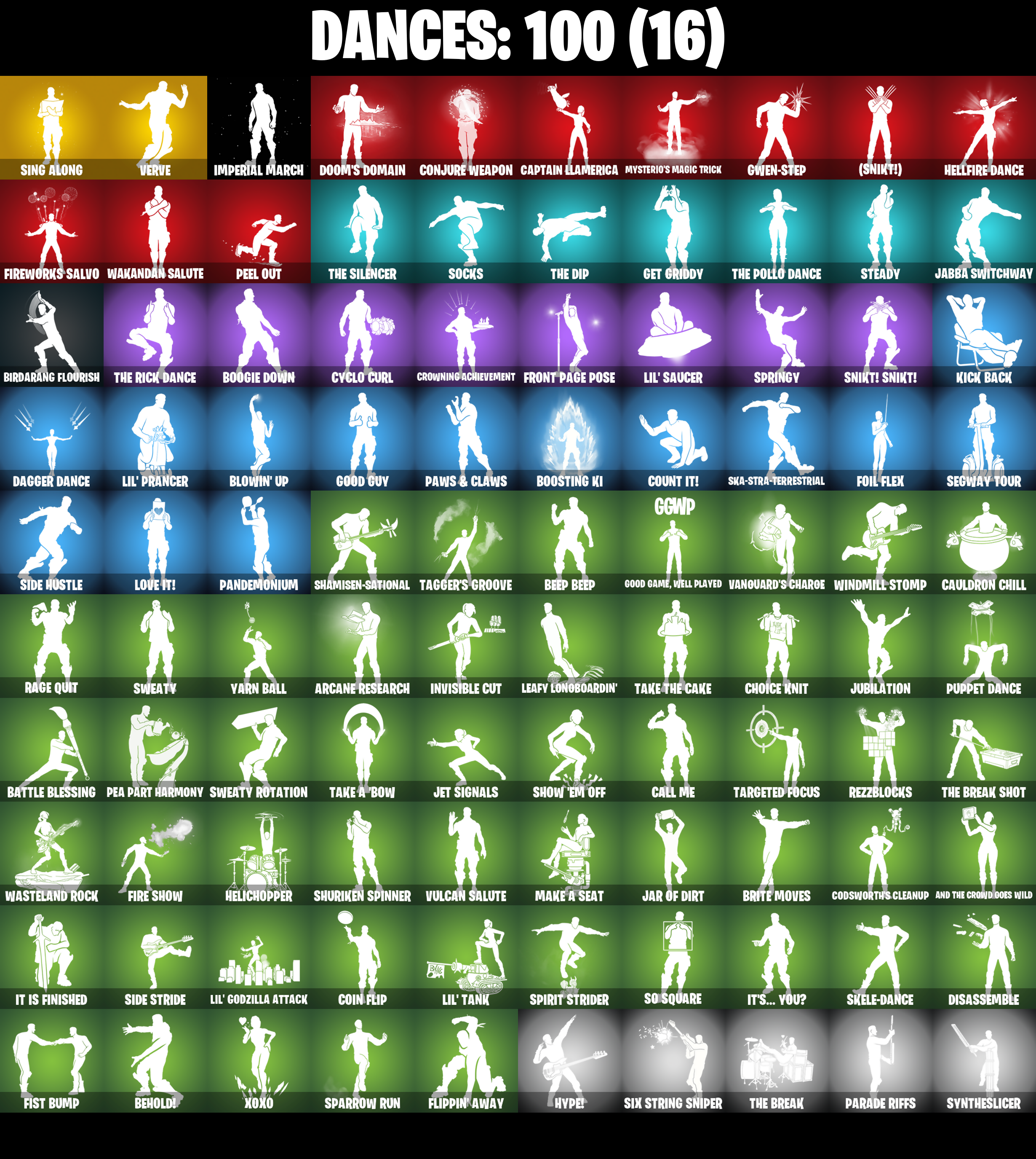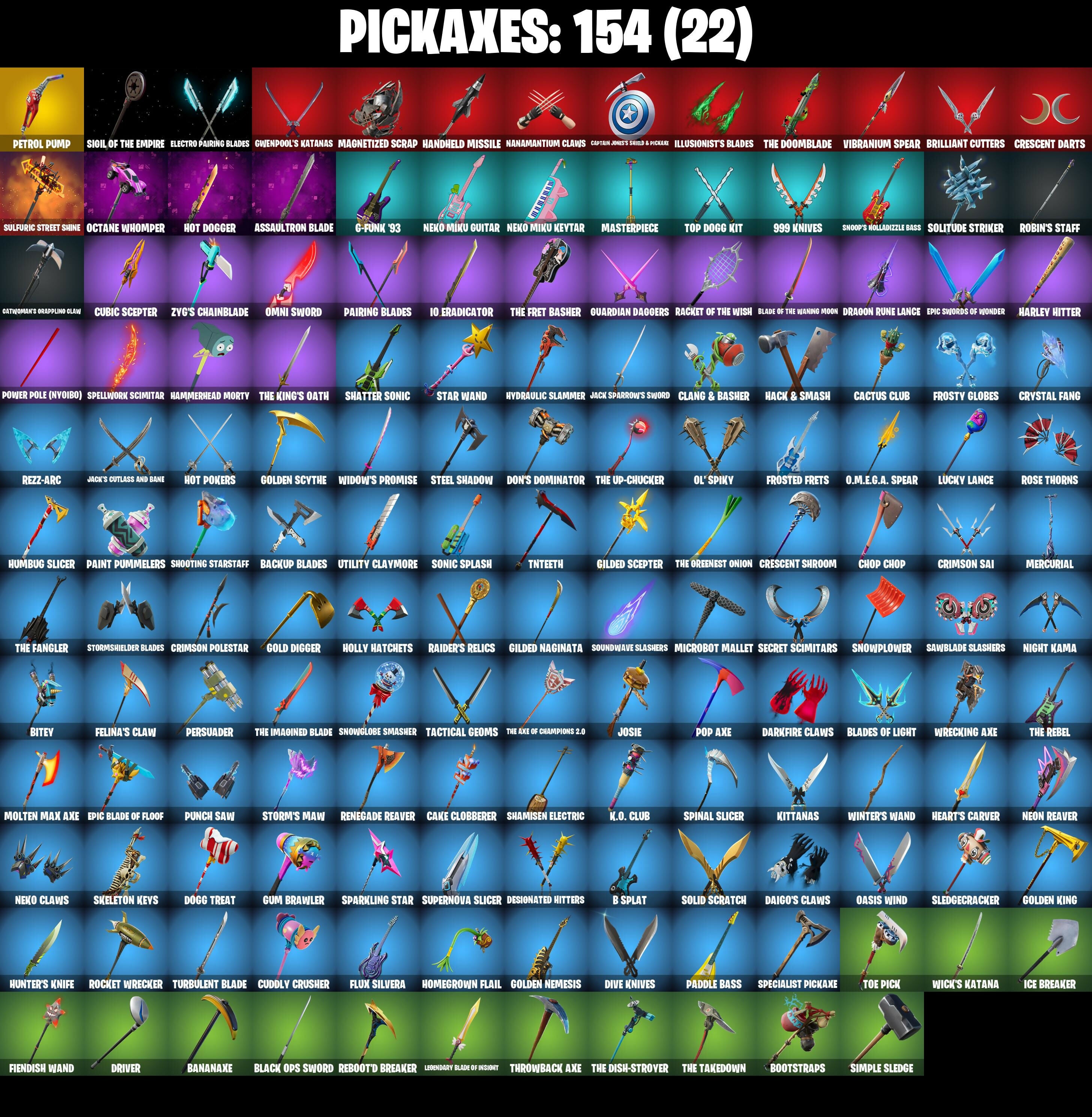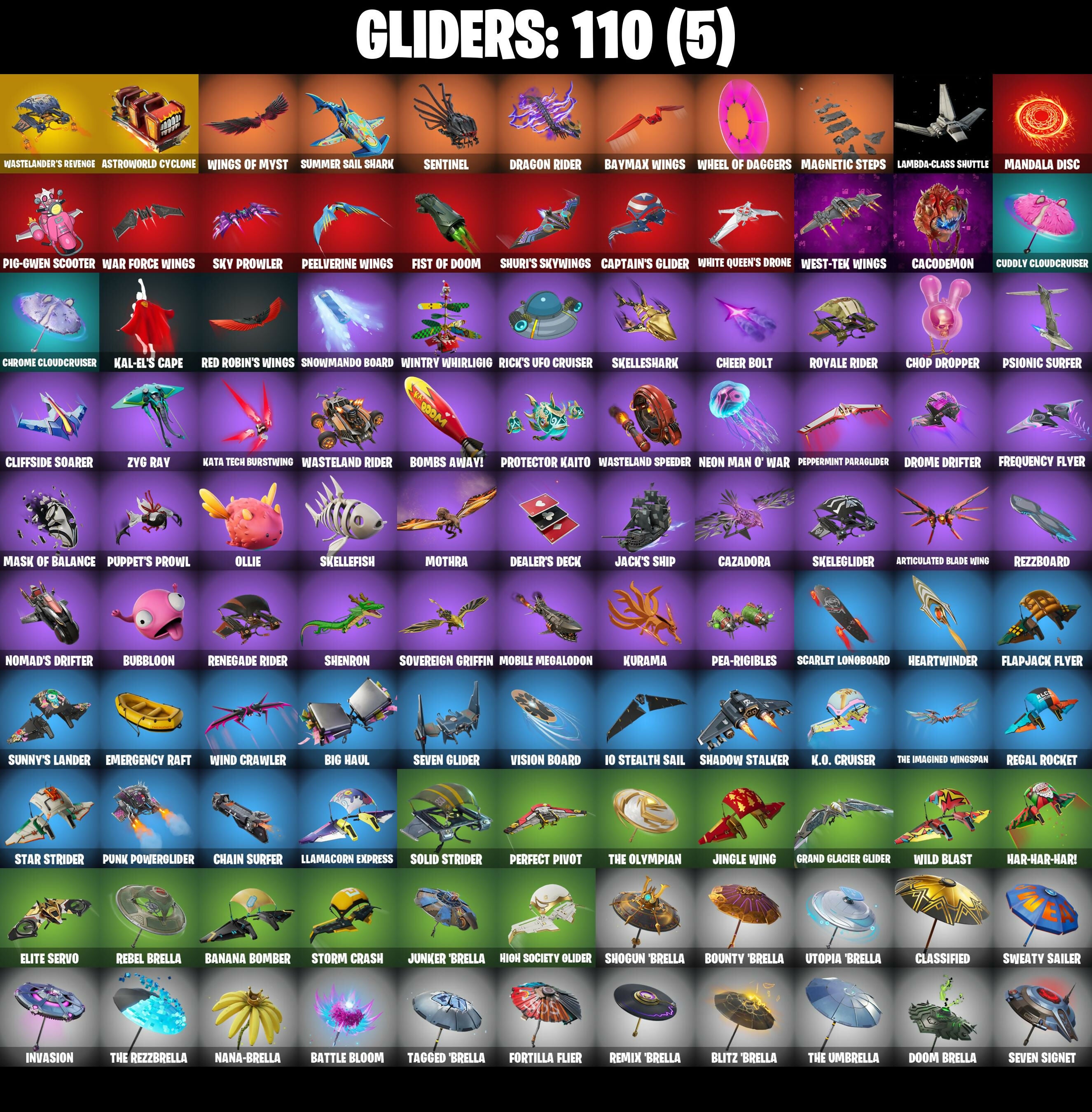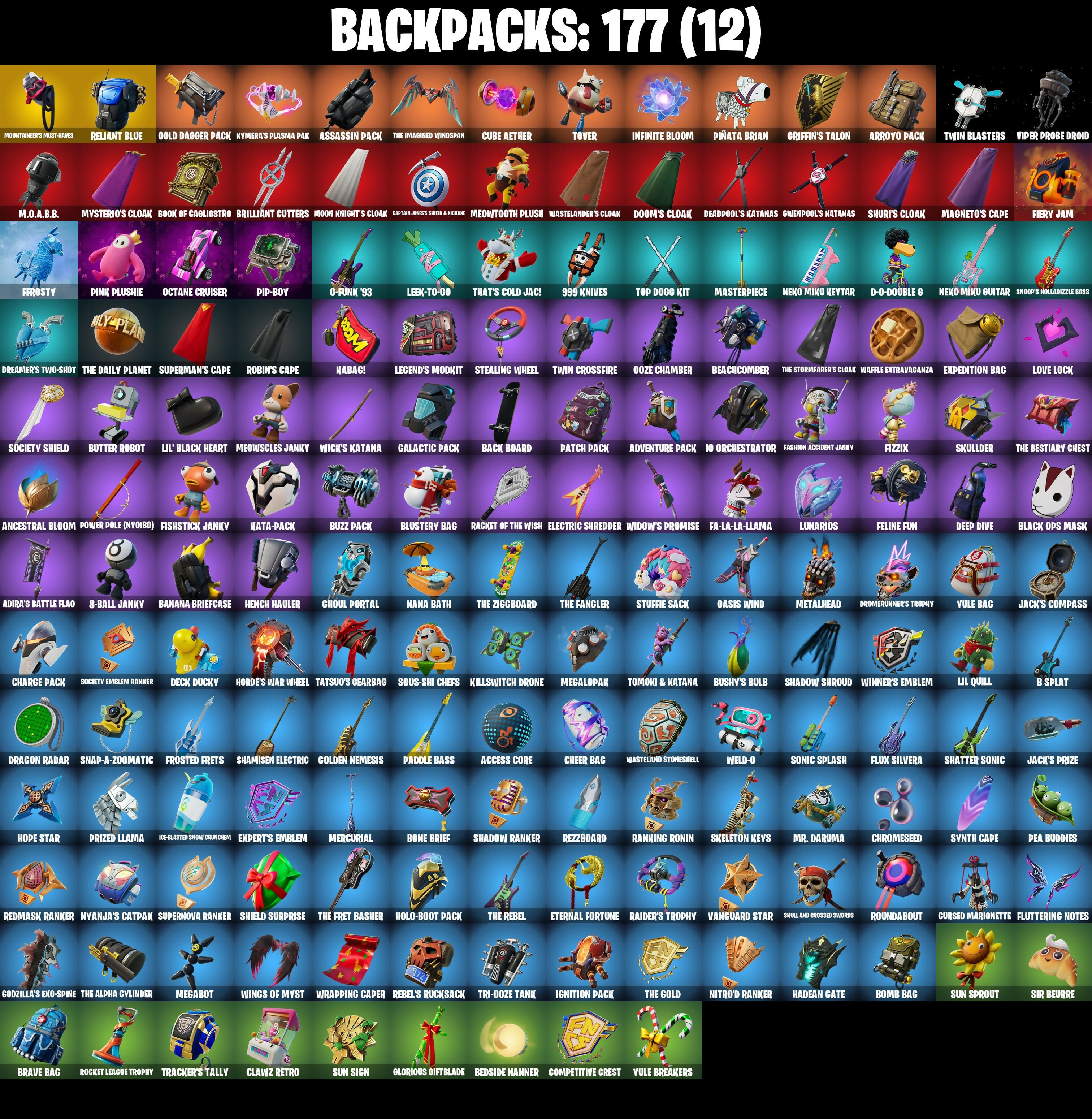 (Snikt!), 8-Ball Janky, 999 Knives, Access Core, Adira, Adira (Battle Mask), Adira's Battle Flag, Adventure Pack, Aerial Assault Bomber, Aerial Assault Captain, Agent Peely, Ancestral Bloom, And The Crowd Goes Wild, Arcane Research, Arctic Adeline, Arroyo Pack, Articulated Blade Wing, Assassin Pack, Assaultron Blade, Astroworld Cyclone, B Splat, Back Board, Backup Blades, Banana Bomber, Banana Briefcase, Bananaxe, Battle Blessing, Battle Bloom, Baymax Wings, Beachcomber, Bedside Nanner, Beep Beep, Behold!, Big Haul, Birdarang Flourish, Bitey, Black Knight T-60 Power Armor, Black Ops Mask, Black Ops Sword, Black Panther (Shuri), Black Queen, Blade of the Waning Moon, Blades of Light, Blitz 'Brella, Blizzabelle, Blizzard Bomber, Blowin' Up, Blustery Bag, Bomb Bag, Bombs Away!, Bone Brief, Boogie Down, Book of Cagliostro, Boosting Ki, Bootstraps, Bounty 'Brella, Brave Bag, Brilliant Cutters, Brite Hatsune Miku, Brite Moves, Brite Raider, Bubloon, Bushy's Bulb, Butter Robot, Buzz Pack, Cacodemon, Cactus Club, Cake Clobberer, Call Me, Camo War Machine, Captain Jones, Captain Jones (Pen & Ink), Captain Jones's Shield & Pickaxe, Captain Llamerica, Captain's Glider, Catwoman's Grappling Claw, Cauldron Chill, Cazadora, Chain Surfer, Chaos Agent, Charge Pack, Cheer Bag, Cheer Bolt, Choice Knit, Chop Chop, Chop Dropper, Chrome Cloudcruiser, Chromeseed, Chromium, Clang & Basher, Clark Kent, Clark Kent (Superman), Classic Peelverine, Classified, Clawz Retro, Cliffside Soarer, Codsworth’s Cleanup, Coin Flip, Competitive Crest, Conjure Weapon, Count It!, Court Queen Erisa, Crescent Darts, Crescent Shroom, Crimson Polestar, Crimson Sai, Crowning Achievement, Crystal Fang, Cube Aether, Cubic Scepter, Cuddly Cloudcruiser, Cuddly Crusher, Cursed Jack Sparrow, Cursed Marionette, Cyclo Curl, D-O Double G, Dagger Dance, Daigo, Daigo's Claws, Dali, Dark Doggo, Dark Gwenpool, Darkfire Claws, Darklands Brite Raider, Darth Vader, Deadpool, Deadpool Unmasked, Deadpool's Katanas, Dealer's Deck, Deck Ducky, Deep Dive, Demon Hunter Hope, Designated Hitters, Diecast, Disassemble, Dive Knives, Doctor Slone, Doctor Strange, Dogg Treat, Don's Dominator, Doom, Doom Brella, Doom's Cloak, Doom's Domain, Dragon Radar, Dragon Rider, Dragon Rune Lance, Dreamer's Two-Shot, Driver, Drome Drifter, Dromerunner's Trophy, Durrr Taisho, Dusk Knight, Dynamo, Electric Shredder, Electro Pairing Blades, Eleven, Elite Servo, Emergency Raft, Emma Frost, Energized Godzilla, Epic Blade of Floof, Epic Swords of Wonder, Erisa, Eternal Fortune, Evie, Evie (Summer Strider), Expedition Bag, Expert's Emblem, Fa-La-La-Llama, Fashion Accident Janky, Felina, Felina's Claw, Feline Fun, Ffrosty, Fiendish Wand, Fiery Jam, Fire Show, Fireworks Salvo, Fishstick Janky, Fist Bump, Fist Of Doom, Fizzix, Flapjack Flyer, Flippin' Away, Fluttering Notes, Flux Silvera, Foil Flex, Fortilla Flier, Frequency Flyer, Front Page Pose, Frost Squad, Frosted Frets, Frosty Globes, G-Funk '93, Galactic Pack, Gear Specialist Maya, Get Griddy, Ghoul Portal, Gilded Naginata, Gilded Scepter, Glorious Giftblade, Godzilla Evolved, Godzilla's Exo-Spine, Gold Brutus, Gold Dagger Pack, Gold Digger, Gold Midas, Golden King, Golden Nemesis, Golden Scythe, Good Game, Well Played, Good Guy, Grand Glacier Glider, Griffin's Talon, Guardian Daggers, Guardian Jade, Guccimon, Gum Brawler, Gunnar, Gwen-Step, Gwenpool, Gwenpool's Katanas, Hack & Smash, Hadean Gate, Hammerhead Morty, Handheld Missile, Har-Har-Har!, Harley Hitter, Haylee Skye, Head (Droopy), Headhunter Prime, Heart's Carver, Heartwinder, Helichopper, Hellfire Dance, Hench Hauler, Hero Baymax, High Society Glider, Holiday Boxy, Holly Hatchets, Holo-Boot Pack, Homegrown Flail, Hope Star, Horde's War Wheel, Hot Dogger, Hot Pokers, Humbug Slicer, Hunter's Knife, Hydraulic Slammer, Hype!, IO Eradicator, IO Orchestrator, Ice Breaker, Ice-Blasted Snow Cruncher, Ignition Pack, Illusionist's Blades, Illusory Mysterio, Imperial March, Indiana Jones, Indiana Jones (Temple Explorer), Infinite Bloom, Invasion, Invisible Cut, Io Stealth Sail, Iris, It Is Finished, It's... You?, Itachi Uchiha, Jabba Switchway, Jack Sparrow, Jack Sparrow's Sword, Jack's Compass, Jack's Cutlass and Bane, Jack's Prize, Jack's Ship, Jade, Jar Of Dirt, Jet Signals, Jingle Wing, Joey, John Wick, Joltara, Josie, Jubilation, Junker 'Brella, K.O. Club, K.O. Cruiser, Kabag!, Kal-El's Cape, Kata Tech Burstwing, Kata-Pack, Kendo, Kiara K.O., Kiara K.O. (Captain's Bomber), Kick Back, Killswitch, Killswitch Drone, Kintsugi Daigo, Kitanas, Krisabelle, Kurama, Kymera, Kymera's Plasma Pak, LBC '93 Dogg, Lady of Cranes, Lambda-Class Shuttle, Leafy Longboardin', Leek-To-Go, Legend's Modkit, Legendary Blade of Insight, Lightrider, Lil Quill, Lil' Black Heart, Lil' Godzilla Attack, Lil' Prancer, Lil' Saucer, Lil' Tank, Llamacorn Express, Love It!, Love Lock, Lucky Lance, Lucky Nyanja, Lunarios, M.O.A.B.B., Magnetic Steps, Magnetized Scrap, Magneto, Magneto's Cape, Make A Seat, Malik, Malik (Solitary Defender), Mandala Disc, Mask Of Balance, Masterpiece, Megabot, Megalo Don, Megalopak, Meowscles, Meowscles Janky, Meowtooth Plush, Mercurial, Metalhead, Microbot Mallet, Min-Joon, Mobile Megalodon, Molten Max Axe, Moon Knight, Moon Knight's Cloak, Morgan Myst, Mothra, Mr. Daruma, Mysterio, Mysterio's Cloak, Mysterio's Magic Trick, Nana Bath, Nana-Brella, Nanomantium Claws, Neko Claws, Neko Hatsune Miku, Neko Miku Guitar, Neko Miku Keytar, Neon Man O' War, Neon Reaver, Night Hunter Scarr, Night Kama, Nitro Flare Machinist, Nitro Fusion Megalo Don, Nitro'd Ranker, Nomad's Drifter, Nyanja, Nyanja's Catpak, O.M.E.G.A. Spear, Oasis Wind, Octane Cruiser, Octane Whomper, Ol' Spiky, Ollie, Omni Sword, Ooze Chamber, Oxide Rust, Paddle Bass, Paint Pummellers, Pairing Blades, Pandemonium, Pandora's Armor Doom, Parade Riffs, Paradigm (Reality-659), Patch Pack, Paws & Claws, Pea Buddies, Pea Part Harmony, Pea-Rigibles, Peabody, Peel Out, Peelverine, Peelverine Wings, Peppermint Paraglider, Perf