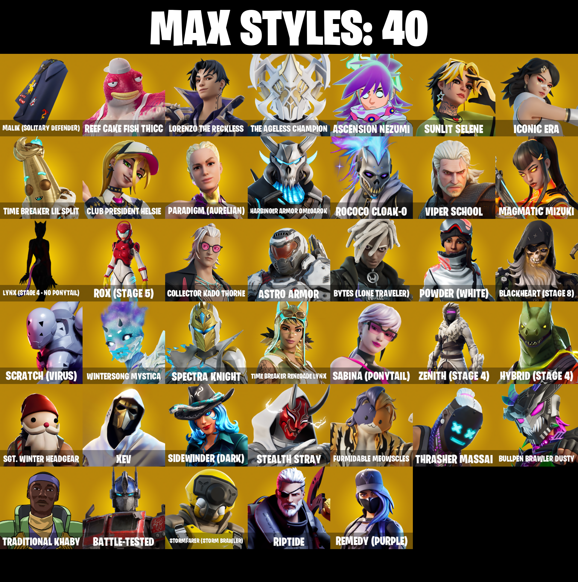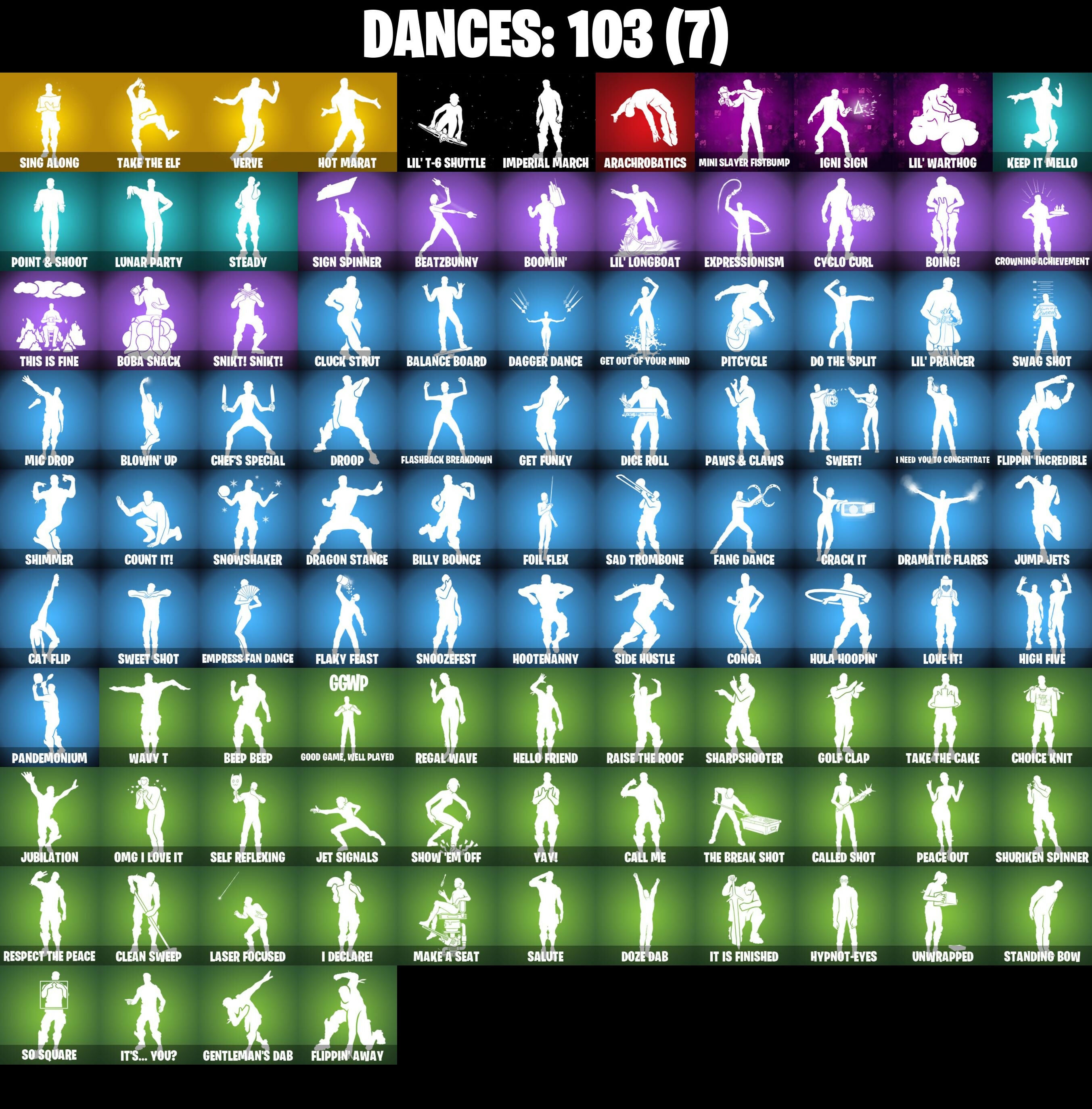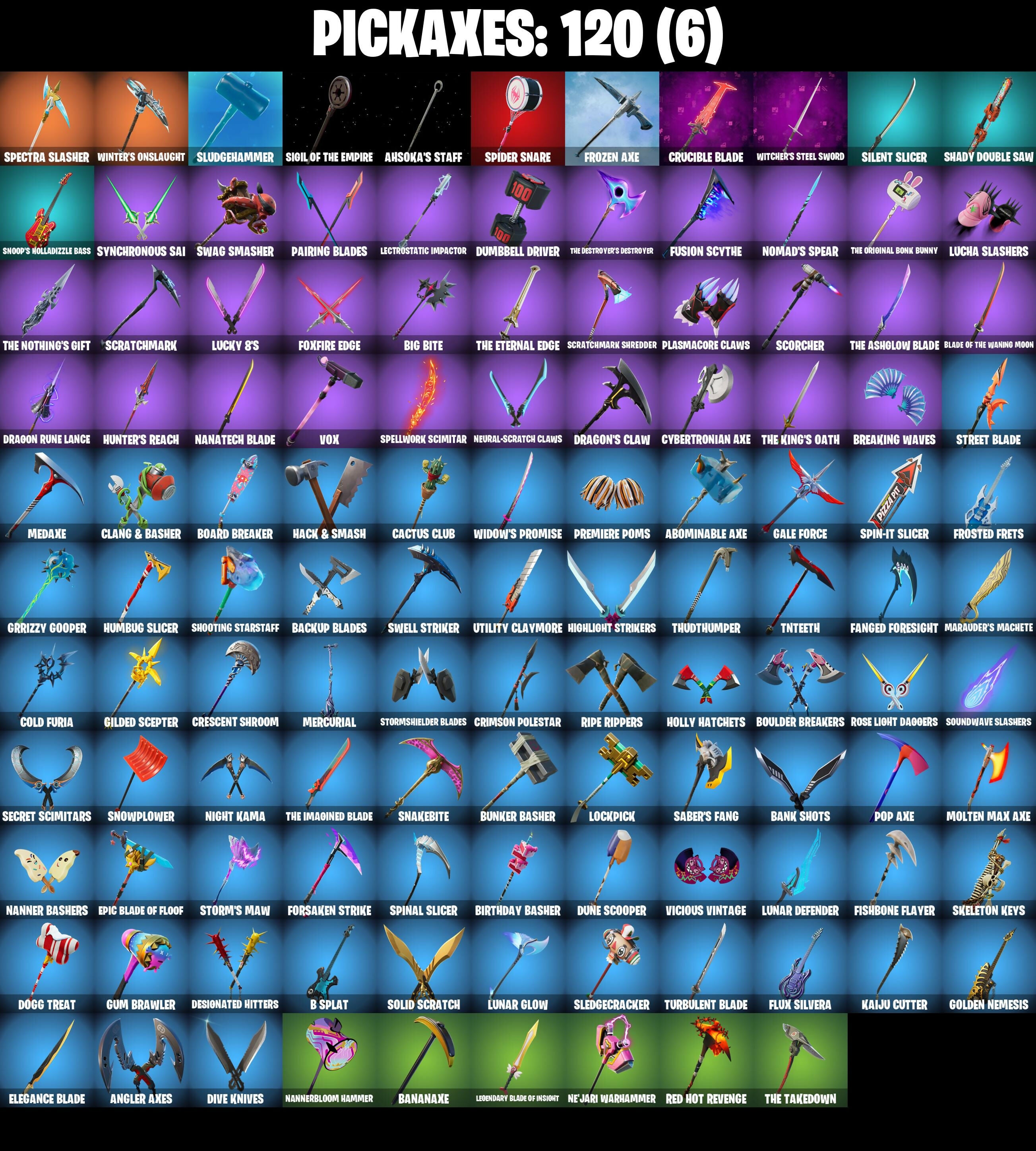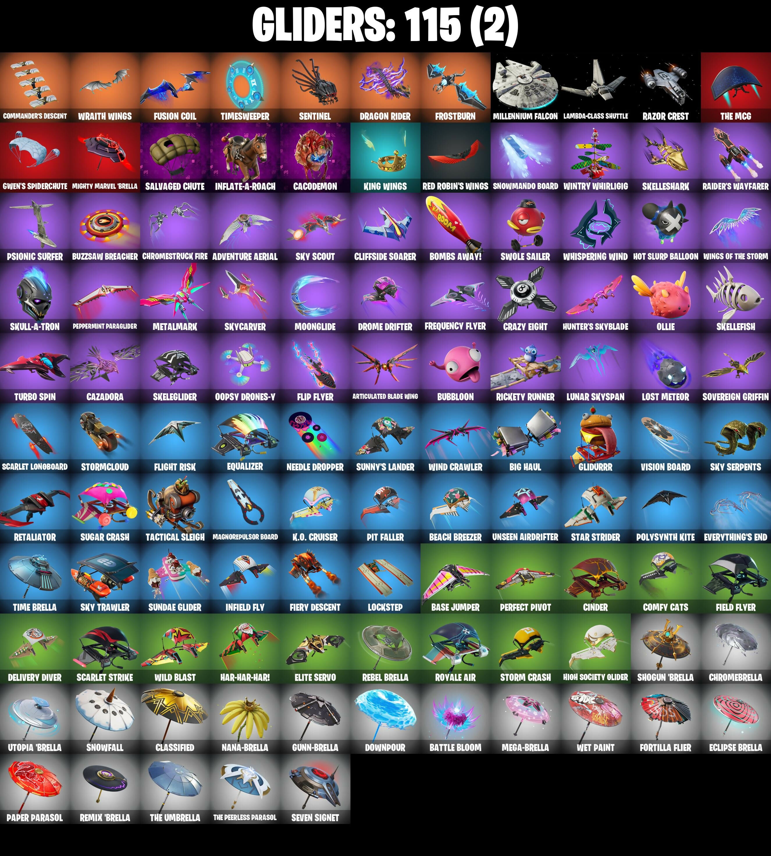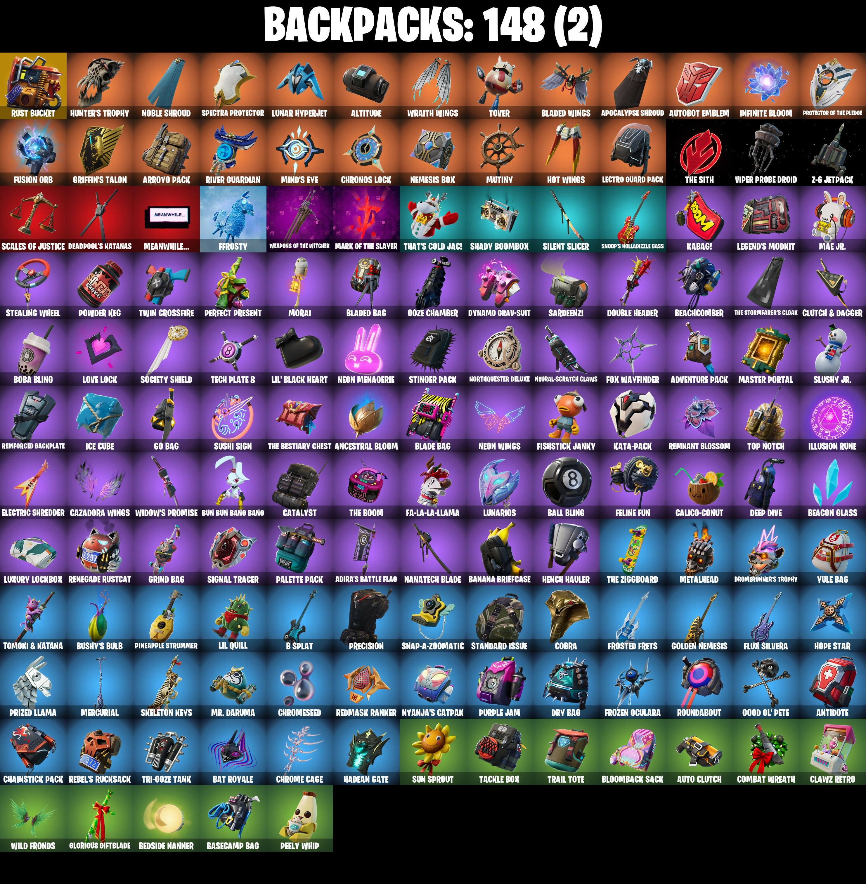 8-Ball Vs Scratch, Abominable Axe, Acrchrobatics, Adira, Adira's Battle Flag, Adventure Aerial, Adventure Pack, Agent Peely, Ahsoka Tano, Ahsoka's Staff, Altitude, Ancestral Bloom, Angler Axes, Antidote, Antonia, Apocalypse Shroud, Arctic Adeline, Arroyo Pack, Articulated Blade Wing, Ascension Nezumi, Astro Armor, Auto Clutch, Autobot Emblem, B Splat, Backup Blades, Balance Board, Ball Bling, Banana Briefcase, Bananaxe, Bank Shots, Base Jumper, Basecamp Bag, Bat Royale, Battle Bloom, Battle-Tested, Battlehawk, Beach Breezer, Beachcomber, Beacon Glass, Beatzbunny, Bedside Nanner, Beep Beep, Big Bite, Big Haul, Billy Bounce, Birthday Basher, Blackheart, Blackheart (Stage 8), Blade Bag, Blade Of The Waning Moon, Bladed Bag, Bladed Wings, Bloomback Sack, Blowin' Up, Board Breaker, Boba Bling, Boba Fett, Boba Snack, Boing!, Bombs Away!, Boomin', Boulder Breakers, Breaking Waves, Brutus, Bubbloon, Bullpen Brawler Dusty, Bun Bun Bang Bang, Bunker Basher, Bunker Jonesy, Bushy's Bulb, Buzzsaw Breacher, Bytes, Bytes (Lone Traveler), Cacodemon, Cactus Club, Calico-Conut, Call Me, Called Shot, Cameo Vs Chic, Carbide, Cat Flip, Catalyst, Cazadora, Cazadora Wings, Chainstick Pack, Chaos Agent, Chef's Special, Choice Knit, Chrome Cage, Chromebrella, Chromeseed, Chromestruck Fire, Chronos Lock, Cinder, Clang & Basher, Classified, Clawz Retro, Clean Sweep, Cliffside Soarer, Club President Helsie, Cluck Strut, Clutch & Dagger, Cobalt, Cobra, Cold Furia, Collector Kado Thorne, Combat Wreath, Comfy Cats, Commander's Descent, Conga, Count It!, Cr2-8, Crack It, Crazy Eight, Crescent Shroom, Crimson Polestar, Crowning Achievement, Crucible Blade, Cybertronian Axe, Cyclo Curl, Dagger Dance, Darth Vader, Deadpool's Katanas, Deep Dive, Delirium, Delivery Diver, Demi, Designated Hitters, Dice Roll, Dive Knives, Do The Split, Dogg Treat, Doom Slayer, Double Header, Downpour, Doze Dab, Dragon Rider, Dragon Rune Lance, Dragon Stance, Dragon's Claw, Dramatic Flares, Drome Drifter, Dromerunner's Trophy, Droop, Dry Bag, Dumbbell Driver, Dune Scooper, Dusk Knight, Dusty, Dynamo Grav-Suit, Eclipse Brella, Electric Shredder, Elegance Blade, Elite Servo, Empress Fan Dance, Epic Blade Of Floof, Equalizer, Era, Everything's End, Evie, Expressionism, Fa-La-La-Llama, Fang Dance, Fanged Foresight, Feline Fun, Ffrosty, Field Flyer, Fiery Descent, Fish Thicc, Fishbone Flayer, Fishstick Janky, Flaky Feast, Flashback Breakdown, Flight Risk, Flip Flyer, Flippin' Away, Flippin' Incredible, Flux Silvera, Foil Flex, Forsaken Strike, Fortilla Flier, Fox Wayfinder, Foxfire Edge, Frequency Flyer, Frostburn, Frosted Frets, Frozen Axe, Frozen Oculura, Furmidable Meowscles, Fusion, Fusion Coil, Fusion Orb, Fusion Scythe, Gale Force, Gear Specialist Maya, Gentleman's Dab, Geralt Of Rivia, Get Funky, Get Out Of Your Mind, Gilded Scepter, Glidurr, Glorious Giftblade, Go Bag, Golden Nemesis, Golf Clap, Good Game, Well Played, Good Ol' Pete, Griffin's Talon, Grind Bag, Grriz, Grrizzy Gooper, Gum Brawler, Gunn-Brella, Gwen's Spiderchute, Hack & Smash, Hadean Gate, Har-Har-Har!, Harbinger Armor Omegorak, Hello Friend, Helsie, Hench Hauler, High Five, High Society Glider, Highlight Strikers, Highwire, Holiday Boxy, Holly Hatchets, Hootenanny, Hope Star, Hot Marat, Hot Slurp Balloon, Hot Wings, Hula Hoopin', Humbug Slicer, Hunter's Reach, Hunter's Skyblade, Hunter's Trophy, Huntmaster Saber, Hybrid, Hybrid (Stage 4), Hypnot-Eyes, I Declare!, I Need You To Concentrate, Ice Cube, Iconic Era, Igni Sign, Illusion Rune, Imani, Imperial March, Infield Fly, Infinite Bloom, Inflate-A-Roach, Iris, It Is Finished, It's... You?, Jet Signals, Journey Vs Hazard, Jubilation, Jump Jets, K.O. Cruiser, Kabag!, Kado Thorne, Kaiju Cutter, Kata-Pack, Keep It Mello, Kev, Khaby Lame, King Wings, Komplex, Krisabelle, Laguna, Lambda-Class Shuttle, Laser Focused, Lectro Guard Pack, Lectrostatic Impactor, Legend's Modkit, Legendary Blade Of Insight, Lennox Rose, Lil Quill, Lil Split, Lil' Black Heart, Lil' Longboat, Lil' Prancer, Lil' T-6 Shuttle, Lil' Warthog, Lockpick, Lockstep, Lorenzo, Lorenzo The Reckless, Lost Meteor, Love It!, Love Lock, Lucha Slashers, Lucky 8's, Lunar Defender, Lunar Glow, Lunar Hyperjet, Lunar Party, Lunar Skyspan, Lunarios, Luxury Lockbox, Lynx, Lynx (Stage 4 - No Ponytail), Mae, Mae Jr., Magmatic Mizuki, Magnorepulsor Board, Make A Seat, Malik, Malik (Solitary Defender), Mandalorian, Marauder's Machete, Mariposa, Mark of the Slayer, Massai, Master Portal, Medaxe, Mega-Brella, Meow Skulls, Meowscles, Mercurial, Metalhead, Metalmark, Mic Drop, Mighty Marvel 'Brella, Millennium Falcon, Mind's Eye, Mini Slayer Fistbump, Mizuki, Molten Max Axe, Moonglide, Morai, Mr. Daruma, Mutiny, Mystica, Nana-Brella, Nanatech Blade, Nanner Bashers, Nannerbloom Hammer, Ne'Jari Warhammer, Needle Dropper, Nemesis Box, Neon Menagerie, Neon Wings, Neural-Scratch Claws, Neuralynx, Nezumi, Night Kama, Noble Shroud, Nolan Chance, Nomad's Spear, Northquester Deluxe, Nyanja's Catpak, Ollie, Omegarok, Omg I Love It, Oopsy Drones-V, Ooze Chamber, Optimus Prime, P33ly, Pairing Blades, Palette Pack, Pandemonium, Paper Parasol, Paradigm (Aurelian), Paradigm (Reality-659), Paws & Claws, Peace Out, Peely, Peely Whip, Peppermint Paraglider, Perfect Pivot, Perfect Present, Pineapple Strummer, Piper Pace, Pit Faller, Pitcycle, Plasmacore Claws, Point & Shoot, Polar Peely, Polysynth Kite, Pop Axe, Powder, Powder (White), Powder Keg, Precision, Predator, Premiere Poms, Prized Llama, Protector of the Fledge, Psionic Surfer, Purple Jam, Purradise Meowscles, Raider's Wayfarer, Raise The Roof, Rap Boy, Razor Crest, Rebel Brella, Rebel's Rucksack, Red Hot Revenge, Red Robin's Wings, Red Strike, Redmask Ranker, Reef Cake Fish Thicc, Reese, Regal Wave, Reinforced Backplate, Relik, Remedy (Purple), Remedy Vs Toxin, Remix Brella, Remnant Blossom, Renegade Lynx, Renegade Rustcat, Renzo The Destroyer, Respect The Peace, Retaliator, Rian, Rickety Runner, Ripe Rippers, Rippley Vs Sludge, Riptide, Rive