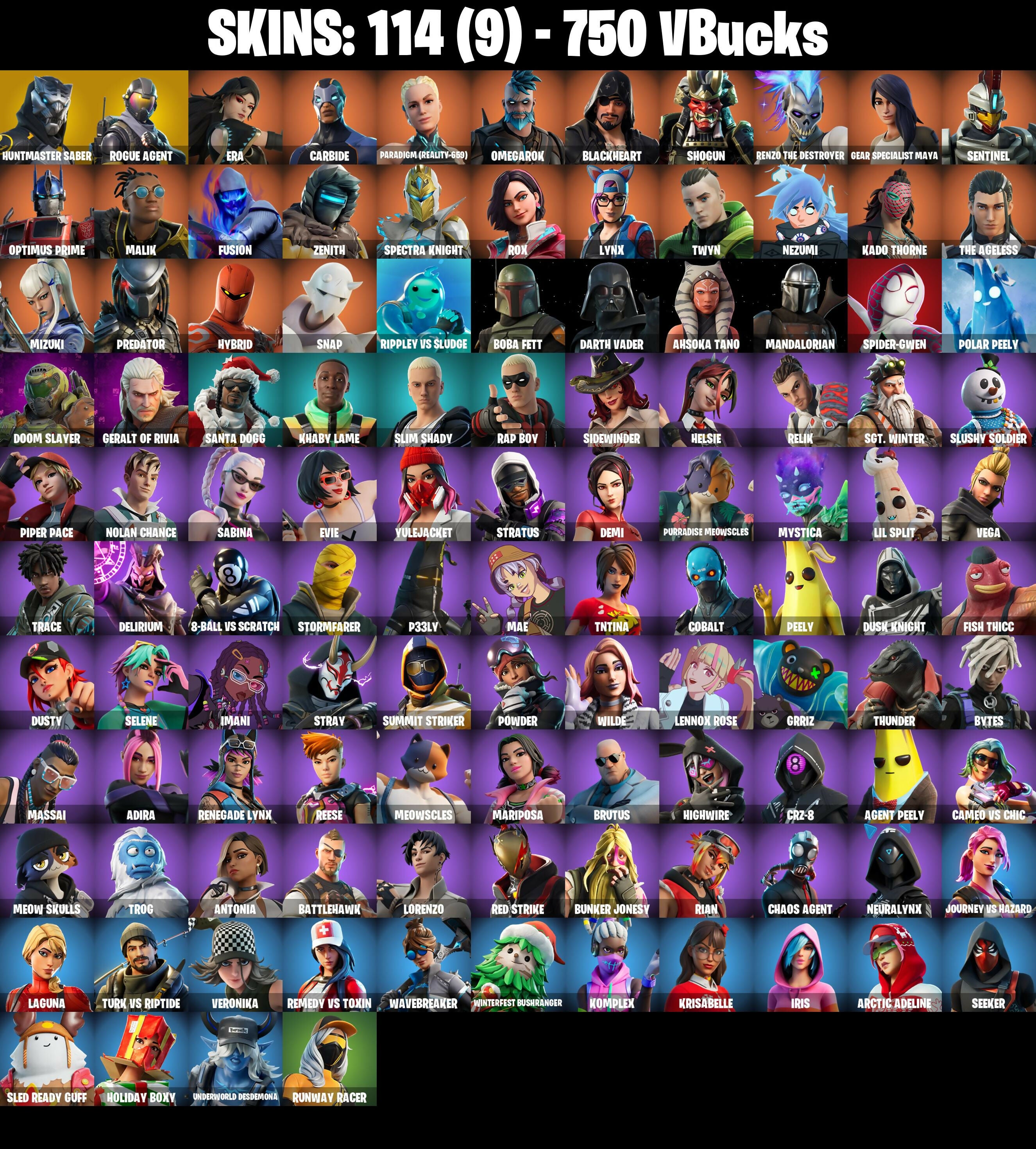 PC/PSN/XBOX |114 skins | Huntmaster Saber | Spider-Gwen | Rogue Agent | Carbide | Peely | Fusion | Darth Vader | The Ageless | Mizuki | #B848