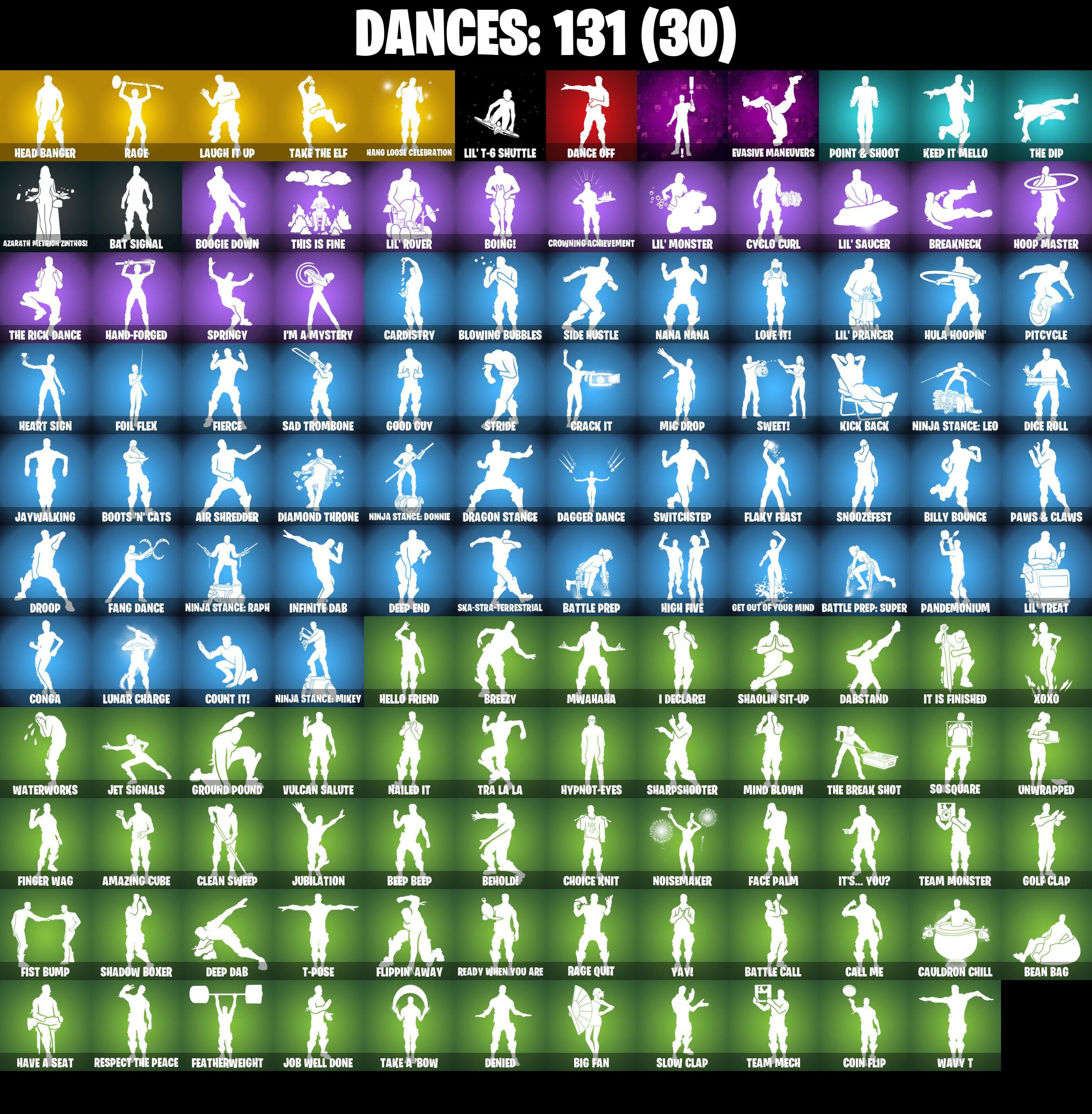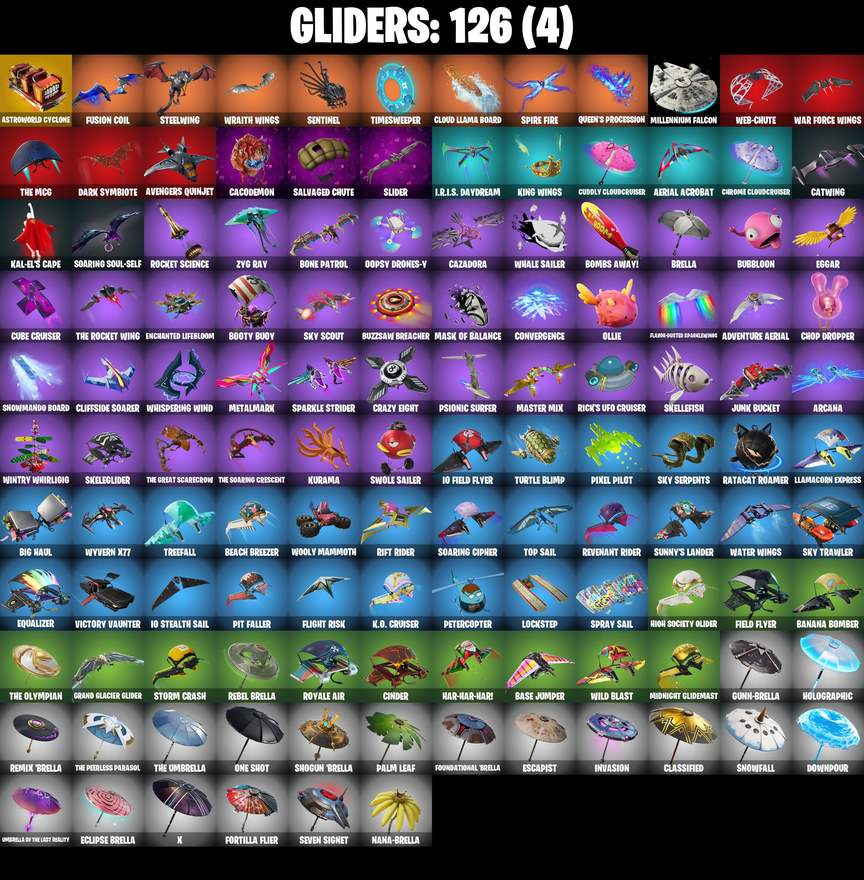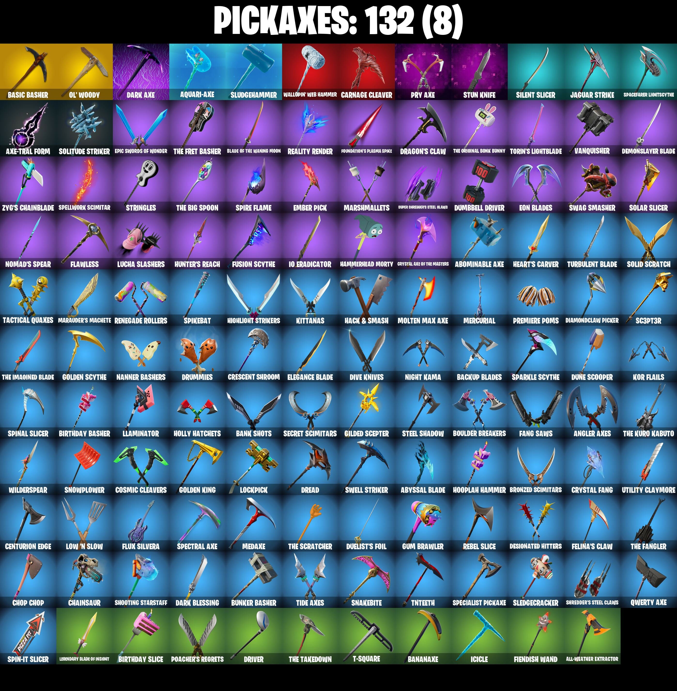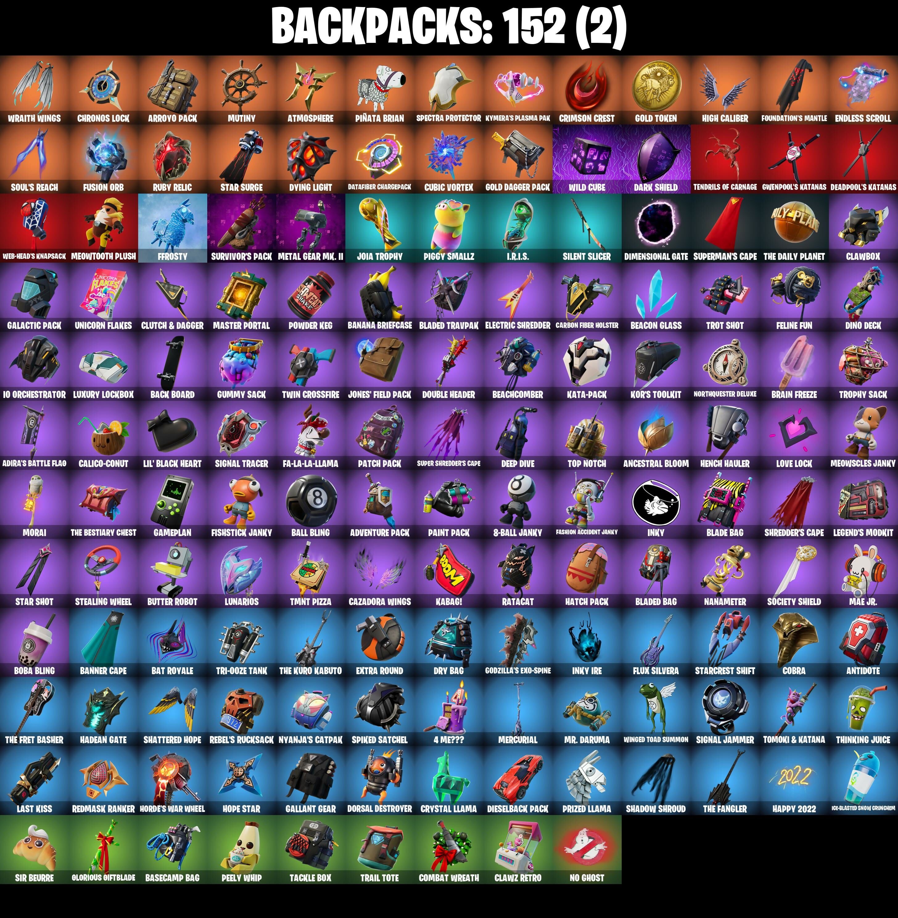 10 Orchestrator, 4 Me???, 8-Ball Janky, 8-Ball vs Scratch, Abominable Axe, Absenz, Abyssal Blade, Adira's Battle Flag, Adventure Aerial, Adventure Pack, Aerial Acrobat, Agent Jones, Agent Jones (Jump 31), Agent Peely, Air Shredder, All-Weather Extractor, Amazing Cube, Ancestral Bloom, Angler Axes, Antidote, Antonia, Aquari-Axe, Arcana, Arctic Adeline, Ariana Grande, Arroyo Pack, Astroworld Cyclone, Atmosphere, Avengers Quinjet, Axe-Tral Form, Azarath Metrion Zinthos!, Back Board, Backup Blades, Ball Bling, Banana Bomber, Banana Briefcase, Bananaxe, Bank Shots, Banner Cape, Base Jumper, Basecamp Bag, Basic Basher, Bat Royale, Bat Signal, Battle Call, Battle Prep, Battle Prep: Super, Beach Breezer, Beachcomber, Beacon Glass, Bean Bag, Beep Beep, Behold!, Big Fan, Big Haul, Billy Bounce, Birthday Basher, Birthday Slice, Blackheart, Blackheart (Stage 8), Blade Bag, Blade Of The Waning Moon, Bladed Bag, Bladed Travpak, Blowing Bubbles, Boba Bling, Boing!, Bombs Away!, Bone Patrol, Boogie Down, Boots 'n' Cats, Booty Buoy, Boulder Breakers, Brain Freeze, Breakneck, Breakpoint, Breezy, Brella, Bronzed Scimitars, Brutus, Bubloon, Bunker Basher, Butter Robot, Buzzsaw Breacher, Cacodemon, Calico-Conut, Call Me, Cameo vs Chic, Carbon Fiber Holster, Cardistry, Carnage, Carnage (Maximum), Carnage Cleaver, Catalyst, Catwing, Cauldron Chill, Cazadora, Cazadora Wings, Centurion, Centurion Edge, Chainsaur, Charlotte, Charlotte (Golden Rune), Choice Knit, Chop Chop, Chop Dropper, Chrome Cloudcruiser, Chronos Lock, Cinder, Clark Kent, Clark Kent (Superman), Classified, Clawbox, Clawz Retro, Clean Sweep, Cliffside Soarer, Cloud Llama Board, Cluck, Cluck (Slurpy), Clutch & Dagger, Cobra, Coin Flip, Combat Wreath, Conga, Contract Giller, Convergence, Cosmic Cleavers, Count It!, Crack It, Crazy Eight, Crescent Shroom, Crimson Crest, Crowning Achievement, Crystal, Crystal Axe Of The Masters, Crystal Fang, Crystal Llama, Cube Cruiser, Cubic Vortex, Cuddly Cloudcruiser, Cyclo Curl, D'Ark, Dabstand, Dagger Dance, Dance Off, Dark Axe, Dark Blessing, Dark Jonesy, Dark Red Knight, Dark Shield, Dark Symbiote, Dark Wild Card, Datafiber Chargepack, Dawn Duelist Nisha, Deadpool, Deadpool Unmasked, Deadpool's Katanas, Deep Dab, Deep Dive, Deep End, Demonslayer Blade, Denied, Designated Hitters, Diamond Throne, Diamondclaw Picker, Dice Roll, Dieselback Pack, Dimensional Gate, Dino Deck, Dive Knives, Dizzie, Doctor Slone, Doctor Slone (Prismatic), Dorsal Destroyer, Double Header, Downpour, Dragon Stance, Dragon's Claw, Dread, Driver, Droop, Drummies, Dry Bag, Duelist's Foil, Dumbbell Driver, Dune Scooper, Dying Light, Eclipse Brella, Eggar, Electric Shredder, Elegance Blade, Ember, Ember Pick, Enchanted Lifebloom, Endless Scroll, Eon Blades, Epic Swords Of Wonder, Equalizer, Era, Escapist, Eternal Voyager, Evasive Maneuvers, Extra Round, Fa-La-La-Llama, Fabio SparkleMane, Fabio Sparklemane (Golden Rune), Face Palm, Fade, Fang Dance, Fang Saws, Fashion Accident Janky, Featherweight, Felina, Felina's Claw, Feline Fun, Ffrosty, Field Flyer, Fiendish Wand, Fierce, Finger Wag, Fish Thicc, Fishstick Janky, Fist Bump, Flaky Feast, Flavor-Dusted Sparklewings, Flawless, Flight Risk, Flippin' Away, Flux Silvera, Foil Flex, Fortilla Flier, Foundation's Mantle, Foundation's Plasma Spike, Foundational 'Brella, Furmidable Meowscles, Fusion, Fusion Coil, Fusion Orb, Fusion Scythe, Galactic Pack, Gallant Gear, Gameplan, Gear Specialist Maya, Get Out Of Your Mind, Gilded Scepter, Glorious Giftblade, Godzilla's Exo-Spine, Gold Dagger Pack, Gold Token, Golden King, Golden Scythe, Golf Clap, Good Guy, Grand Glacier Glider, Ground Pound, Guggimon, Guggimon (Prismatic), Gum Brawler, Gumbo, Gumbo (Sour), Gummy Sack, Gunn-Brella, Gwenpool's Katanas, Hack & Smash, Hadean Gate, Hammerhead Morty, Hand-Forged, Hang Loose Celebration, Happy 2022, Har-Har-Har!, Harlowe, Harlowe (Helmet), Hatch Pack, Have A Seat, Haven, Haven (Tropical Chirper), Head (Droopy), Head Banger, Heart Sign, Heart's Carver, Hello Friend, Hench Hauler, High Caliber, High Five, High Society Glider, Highlight Strikers, Holiday Boxy, Holly Hatchets, Holographic, Hoop Master, Hooplah Hammer, Hope, Hope Star, Horde's War Wheel, Hula Hoopin', Hunter's Reach, Hybrid, Hybrid (Stage 4), Hypnot-Eyes, I Declare!, I'm A Mystery, I.R.I.S., I.R.I.S. Daydream, IO Field Flyer, IO Stealth Sail, Ice-Blasted Snow Crunchem, Icicle, Infinite Dab, Inky, Inky Ire, Invasion, Io Eradicator, It Is Finished, It's... You?, J.B. Chimpanski, J.B. Chimpanski (Helmet), Jaguar Strike, Jaywalking, Jet Signals, Job Well Done, Joey, Joia Trophy, Jones' Field Pack, Journey vs Hazard, Jubilation, Junk Bucket, K.O. Cruiser, Kabag!, Kado Thorne, Kal-El's Cape, Kata-Pack, Kaws Skeleton, Keep It Mello, Khaby Lame, Kick Back, King Wings, Kittanas, Kor, Kor (Trenchcoat), Kor Flails, Kor's Toolkit, Krisabelle, Kurama, Kymera, Kymera's Plasma Pak, Lara Croft, Lara Croft (Gold Anniversary), Last Kiss, Laugh It Up, Legend's Modkit, Legendary Blade Of Insight, Lil' Black Heart, Lil' Monster, Lil' Prancer, Lil' Rover, Lil' Saucer, Lil' T-6 Shuttle, Lil' Treat, Llamacorn Express, Llaminator, Lockpick, Lockstep, Love It!, Love Lock, Low 'N Slow, Lt. John Llama, Lt. John Llama (Oiled Reality), Lucha Slashers, Lunar Charge, Lunarios, Luxe, Luxe (Gold Clothing), Luxury Lockbox, Mae, Mae Jr., Marauder's Machete, Mariposa, Marshmallets, Mask of Balance, Master Kev (Masked), Master Key, Master Mix, Master Portal, Medaxe, Meowscles, Meowscles Janky, Meowtooth Plush, Mercurial, Metal Gear Mk. II, Metallmark, Mic Drop, Midas, Midnight Glidemast, Millennium Falcon, Mind Blown, Modena Icon, Molten Max Axe, Montague, Morai, Mr. Daruma, Mutiny, Mwahaha, Nailed It, Nana Nana, Nana-Brella, Nanameter, Nanner Bashers, Neymar Jr, Neymar Jr (Exhibition), Night Kama, Ninja Stance: Donnie, Ninja Stance: Leo, Ninja Stance: Mikey, Ninja Stance: Raph, Nisha, No Ghost, Noisemaker, Nolan Chance, Nomad's Spear, Northquester Deluxe, Nyanja's Catpak, Ocean, O