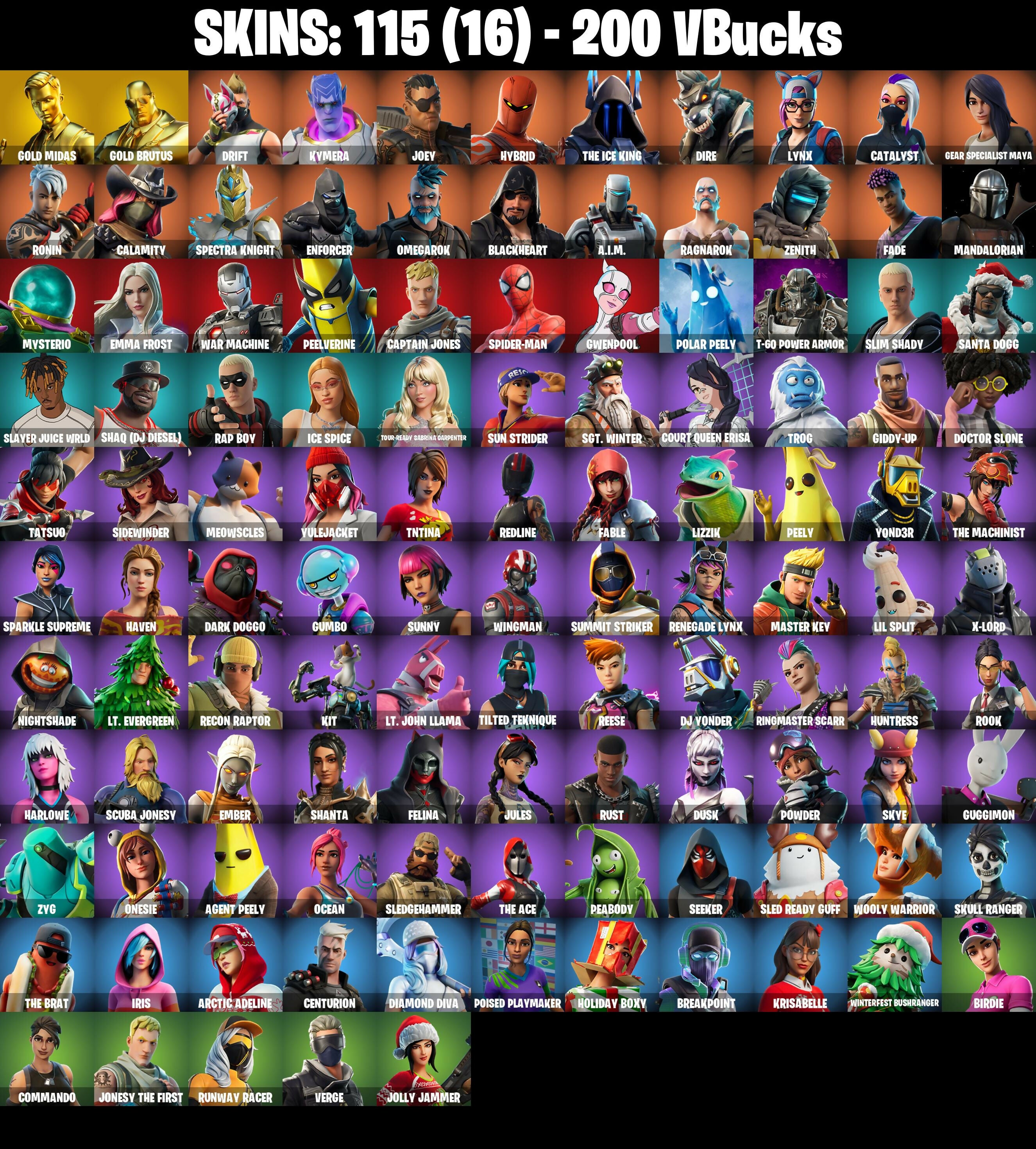 PC/PSN/XBOX |115 skins | Gold Midas | Gold Brutus | Orange Justice | Drift | Go Mufasa | Ragnarok | Dire | The Ice King | Peely | Spider-Man | #B885