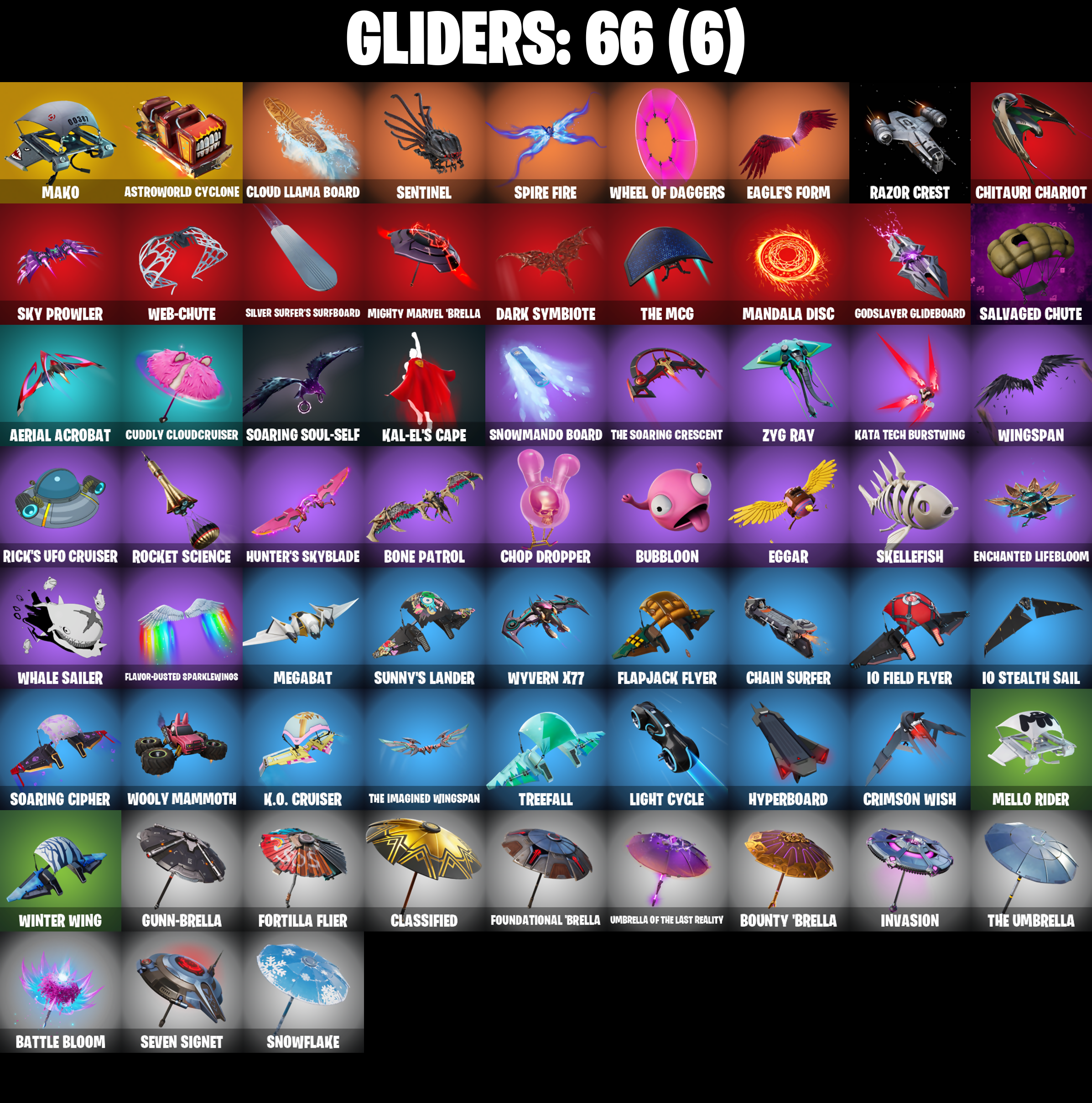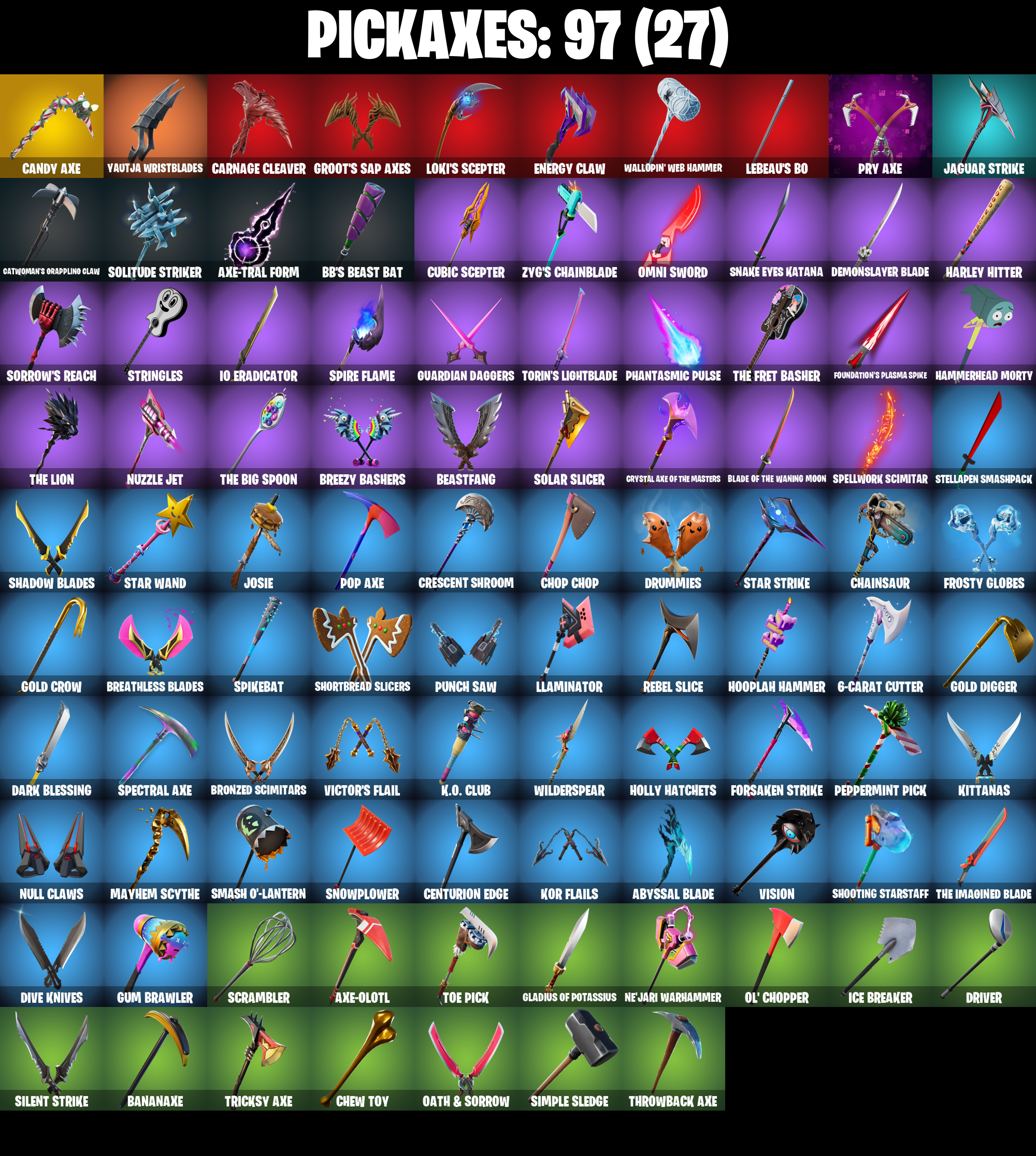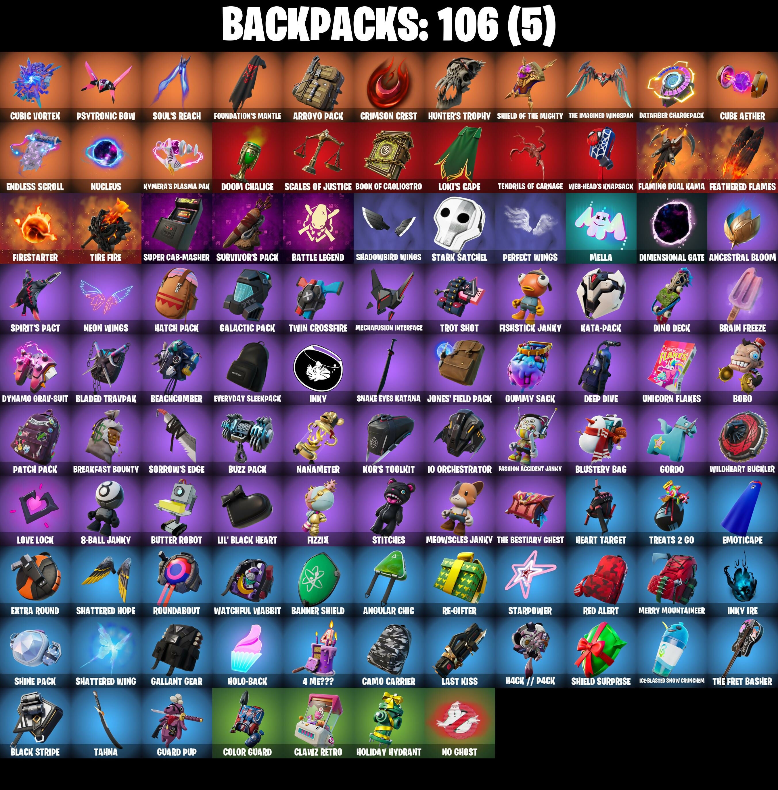 4 Me???, 6-Carat Cutter, 8-Ball Janky, A Warrior Prepares, AbseNz, Abyssal Blade, Adeline, Aerial Acrobat, Agent Jones, Agent Jones (Jump 31), Air Horn, Amazing Cube, Amplitude, Ancestral Bloom, Angular Chic, Arroyo Pack, Aspen, Assault Trooper, Astroworld Cyclone, Aura, Axe-Olotl, Axe-Tral Form, Azarath Metrion Zinthos!, BB's Beast Bat, Bananaxe, Banner Shield, Banner Trooper, Battle Bloom, Battle Call, Battle Legend, Be Seeing You, Beachcomber, Bean Bag, Bear Hug, Beastfang, Beep Beep, Bhangra Boogie, Billy Bounce, Black Stripe, Blade of the Waning Moon, Bladed Travpak, Blaze, Blustery Bag, Bobo, Bold Stance, Bolt, Bone Patrol, Boogie Down, Book of Cagliostro, Boomin', Boots 'N' Cats, Bounty 'Brella, Brain Freeze, Branded Brigadier, Breakfast Bounty, Breaking Point, Breathless Blades, Breezy Bashers, Bring It, Bring It Around, Britestorm Bomber, Bronzed Scimitars, Bubbloon, Build Up, Bullseye, Burpee, Burst Case Scenario, Butter Robot, Buzz Pack, Call Me, Camo Carrier, Candy Axe, Cardistry, Carnage, Carnage (Maximum), Carnage Cleaver, Catwoman Zero, Catwoman's Grappling Claw, Centurion, Centurion Edge, Chain Surfer, Chainsaur, Charlotte, Charlotte (Golden Rune), Chew Toy, Chigusa, Chitauri Chariot, Choice Knit, Chop Chop, Chop Dropper, Chun-Li, Classified, Clawz Retro, Clean Sweep, Cloud Llama Board, Cluck, Cluck (Slurpy), Color Guard, Conjure Weapon, Crackdown, Crescent Shroom, Crimson Crest, Crimson Wish, Crowning Achievement, Crystal, Crystal Axe of the Masters, Cube Aether, Cubic Scepter, Cubic Vortex, Cuddly Cloudcruiser, Customized Captain, Cyberdyne Salute, Cyclo Curl, D'ark, Dab, Dagger Dance, Dark Blessing, Dark Symbiote, Datafiber Chargepack, Deep Dab, Deep Dive, Deimos, Demonslayer Blade, Diamond Diva, Dimensional Gate, Dino Deck, Dive Knives, Dizzie, Doctor Slone, Doctor Slone (Prismatic), Don't Start Now, Doom Chalice, Dream, Driver, Drummies, Dynamo Grav-Suit, Eagle's Form, Eggar, Electro Shuffle, Electro Swing, Emoticape, Enchanted Lifebloom, Endless Scroll, Energy Claw, Envoy, Erisa, Evasive Maneuvers, Everyday Sleekpack, Extra Round, Extraterrestrial, Fabio Sparklemane, Face Palm, Fashion Accident Janky, Fashion Banshee, Feathered Flames, Firestarter, Fishstick Janky, Fizzix, Flaming Dual Kama, Flapjack Flyer, Flavor-Dusted Sparklewings, Flippin' Away, Forsaken Strike, Fortilla Flier, Foundation's Mantle, Foundation's Plasma Spike, Foundational 'Brella, Frosty Globes, Galactic Pack, Galaxy Scout, Gallant Gear, Gangnam Style, Get Griddy, Get Schwifty, Gladius of Potassus, Godslayer Glideboard, Gold Crow, Gold Digger, Good Guy, Gordo, Groot's Sap Axes, Ground Pound, Guard Pup, Guardian Daggers, Guggimon, Guggimon (Prismatic), Gum Brawler, Gumbo, Gumbo (Sour), Gummy Sack, Gunn-Brella, Gunnar, Hack // Pack, Hammerhead Morty, Hand-Forged, Hang Loose, Hang Loose Celebration, Harley Hitter, Harlowe, Harlowe (Helmet), Hatch Pack, Have A Seat, Haven, Haven (Tropical Chirper), Head (Droopy), Headhunter Prime, Heart Sign, Heart Target, Heart-Stopper, Hit It, Holiday Hydrant, Holly Hatchets, Holo-Back, Hooplah Hammer, Howl, Hunter's Skyblade, Hunter's Trophy, Hush, Hyperboard, IO Eradicator, IO Orchestrator, Ice Breaker, Ice-Blasted Snow Cruncher, Incinerator Kuno, Inky, Inky Ire, Invasion, Io Field Flyer, Io Stealth Sail, Iris, It's... You?, J.B. Chimpanski, J.B. Chimpanski (Helmet), Jabba Switchway, Jaguar Strike, Joey, Joltara, Jones' Field Pack, Josie, Jumbo Popcorn, K.O. Club, K.O. Cruiser, Kal-El's Cape, Karve, Kata Tech Burstwing, Kata-Pack, Kiara K.O., Kiara K.O. (Captain’s Bomber), Kick Back, Kittanas, Kondor, Kor, Kor (Trenchcoat), Kor Flails, Kor's Toolkit, Krisabelle, Kymera, Kymera's Plasma Pak, Lace, Lara Croft, Lara Croft (Gold Anniversary), Last Forever, Last Kiss, Laugh It Up, Lazer Blast, Lebeau's Bo, Lexa, Lexa (Warstrike), Light Cycle, Lil' Black Heart, Lil' Monster, Lil' Rover, Lil' Saucer, Llaminator, Lock It Up, Loki Laufeyson, Loki's Cape, Loki's Scepter, Love It!, Love Lock, Lt. Evergreen, Lt. John Llama, Lt. John Llama (Gilded Reality), Lunar Charge, Mako, Mancake, Mandala Disc, Mandalorian, Mandalorian (Clothing), Marius, Marsha, Martial Arts Master, Mashed Potato, Master Chief (Matte Black), Mave, Mave (Reactive Hair Off), Mayhem Scythe, Mecha Cuddle Master, Mechafusion Interface, Megabat, Megumi, Mella, Mello Rider, Menace, Menace (Challenger Menace - Flame), Meowscles Janky, Merry Mountaineer, Mighty Marvel 'Brella, Modena Icon, Molten Ragnarok, Mwahaha, Nailed It, Nanameter, Ne'Jari Warhammer, Neon Wings, Neymar Jr, No Ghost, No Sweat, Nucleus, Null Claws, Nuzzle Jet, Oath & Sorrow, Office Chariot, Ol' Chopper, Omni Sword, Out West, Par Patroller, Party Hips, Patch Pack, Pele's Air Punch, Peppermint Pick, Perfect Shadow, Perfect Wings, Phantasmic Pulse, Polar Peely, Pop Axe, Pop Lock, Predator, Prowler, Pry Axe, Psytronic Bow, Punch Saw, Quick Bite, Raise The Roof, Raz, Razor Crest, Re-Gifter, Ready When You Are, Rebel Slice, Rebirth Raven, Rebound Raider, Red Alert, Red Jade, Reese, Rick Sanchez, Rick Sanchez (Prismatic), Rick's Ufo Cruiser, Roast Lord, Rocket Science, Rollie, Ronin, Ronin (Cape), Roundabout, Ruby, Salvaged Chute, Sandstone Joey, Sasquatchin', Say So, Scales of Justice, Scarlet Commander, Scarlet Defender, Scrambler, Segway Tour, Sentinel, Seven Signet, Shadow Blades, Shadow Skully, Shadowbird, Shadowbird Wings, Shady Doggo, Shake & Slash, Shanta, Shanta (Headpiece), Shaolin Sit-Up, Shattered Hope, Shattered Wing, Shield Surprise, Shield of the Mighty, Shine Pack, Shooting Starstaff, Shortbread Slicers, Silent Strike, Silver Surfer's Surfboard, Simple Sledge, Sing Along, Siren, Ska-Stra-Terrestrial, Skellefish, Sky Prowler, Slow Clap, Smash O'-Lantern, Smooth Moves, Snake Eyes, Snake Eyes Katana, Snowflake, Snowmando, Snowmando Board, Snowplower, Snowshaker, So Square, Soaring Cipher, Soaring Soul-Self, Solar Slicer, Solitude Striker, Sorrow's Edge, Sorrow's Reach, Soul's Reach, Spectral Axe, Spellwork Scimitar, Spider-Man, Spider