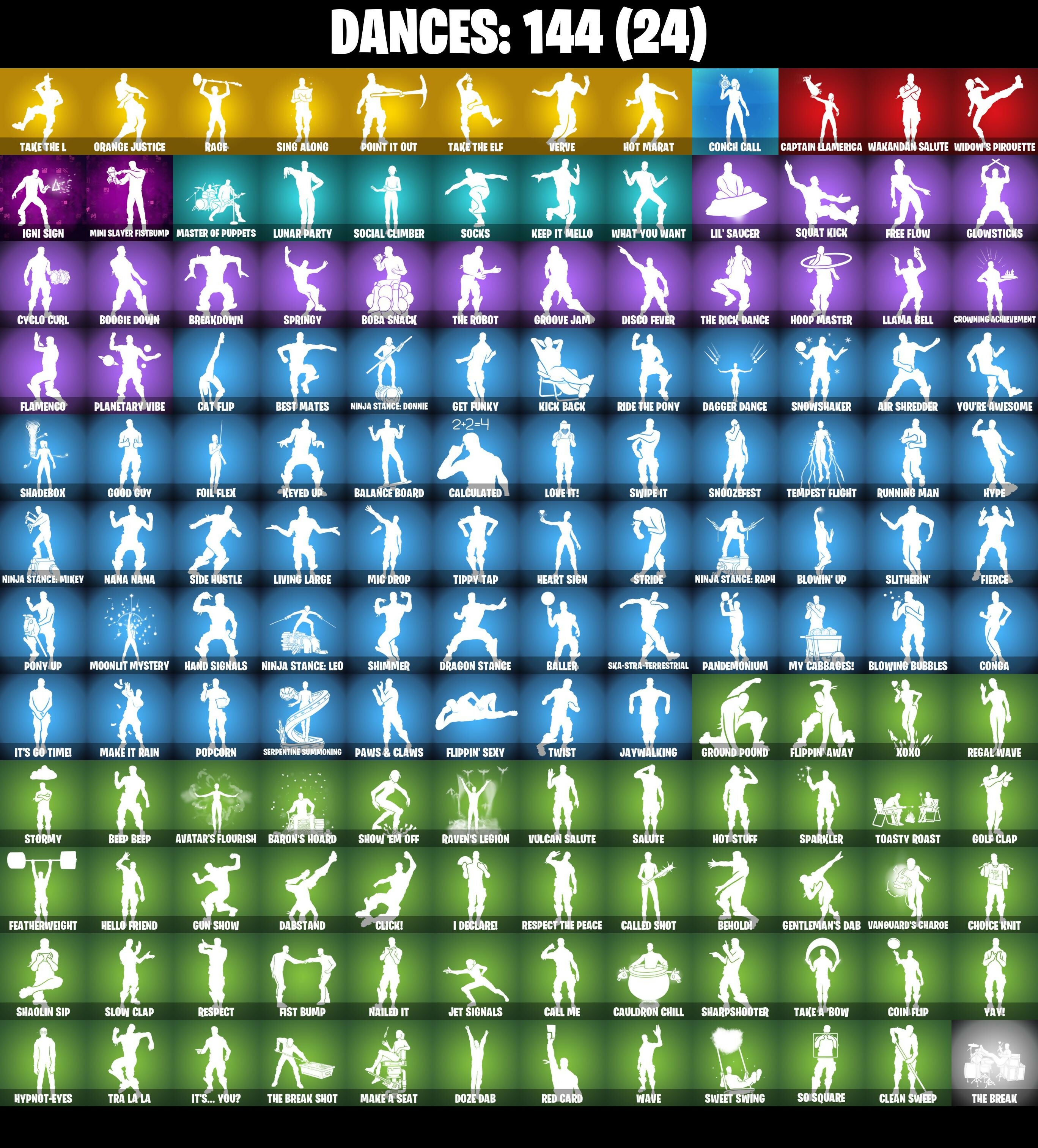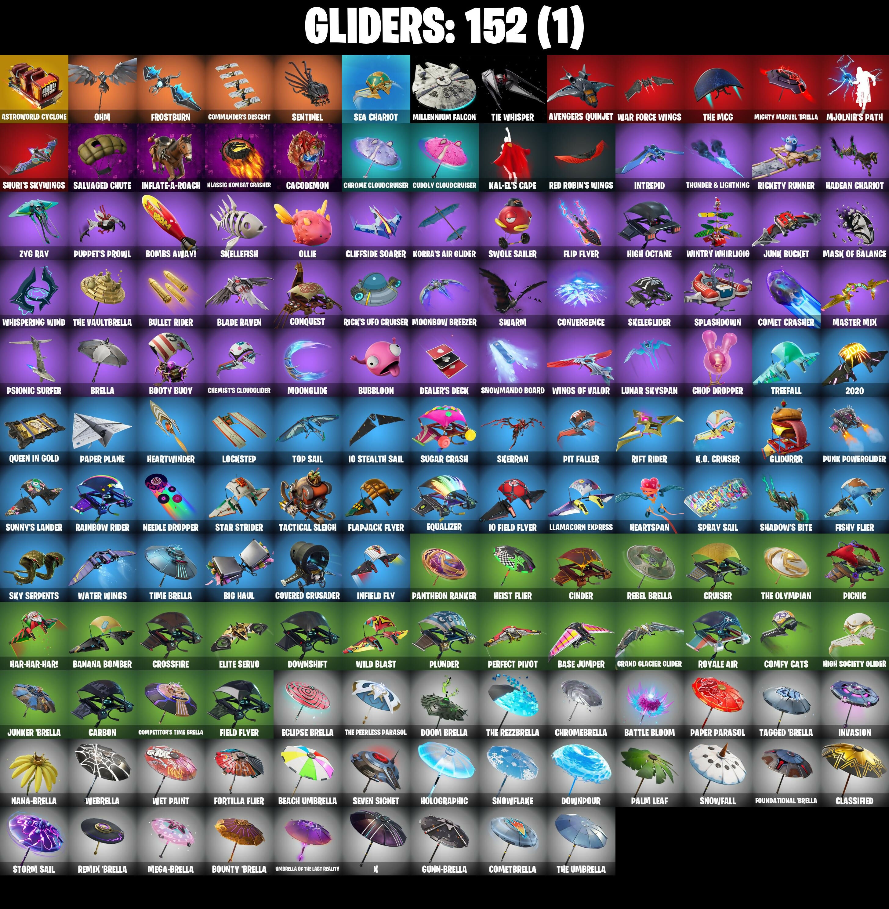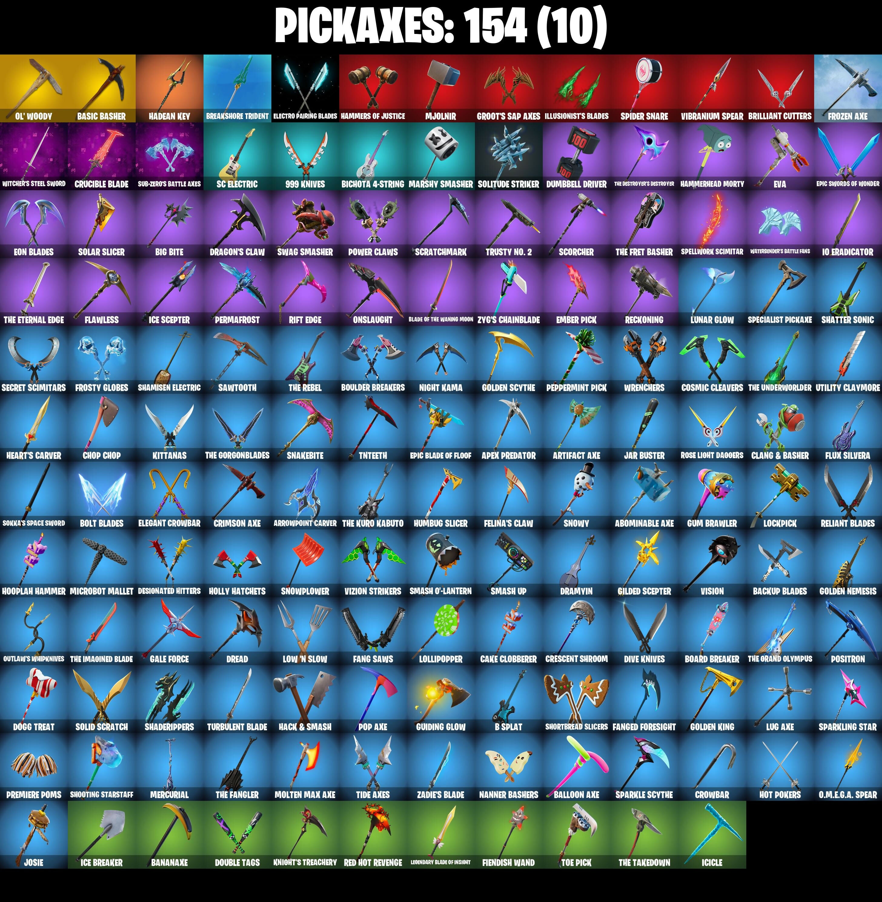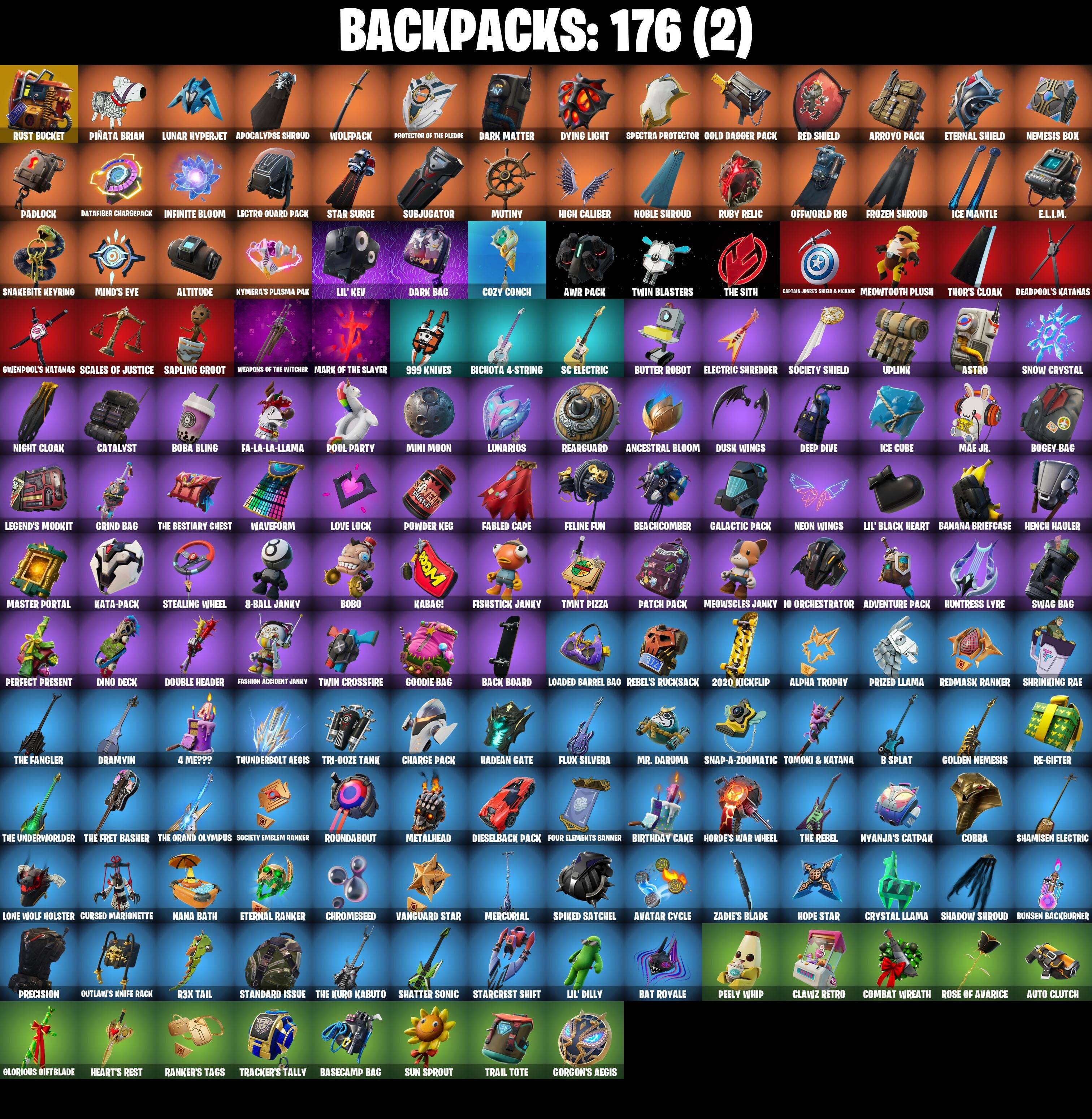 10 Orchestrator, 2020, 2020 Kickflip, 4 Me???, 8-Ball Janky, 999 Knives, A.I.M., AWR Pack, Abominable Axe, Adventure Pack, Agent Peely, Air Shredder, Alpha Trophy, Altitude, Ancestral Bloom, Apex Predator, Aphrodite, Apocalypse Shroud, Arrowpoint Carver, Arroyo Pack, Artemis, Artifact Axe, Ascension Nezumi, Astro, Astro Armor, Astroworld Cyclone, Aura, Auto Clutch, Avatar Cycle, Avatar's Flourish, Avengers Quinjet, B Splat, Back Board, Backup Blades, Balance Board, Balanced, Baller, Balloon Axe, Banana Bomber, Banana Briefcase, Bananaxe, Baron's Hoard, Base Jumper, Basecamp Bag, Basic Basher, Bat Royale, Battle Bloom, Battlehawk, Beach Umbrella, Beachcomber, Beep Beep, Behold!, Best Mates, Bichota 4-String, Big Bite, Big Haul, Birthday Cake, Black Werewolf, Blackheart, Blackheart (Stage 8), Blade Of The Waning Moon, Blade Raven, Blazing Fire Cerberus, Blowin' Up, Blowing Bubbles, Board Breaker, Boba Bling, Boba Snack, Bobo, Bogey Bag, Bolt Blades, Bombs Away!, Boogie Down, Booty Buoy, Boulder Breakers, Bounty 'Brella, Breakdown, Breakshore Trident, Brella, Brilliant Cutters, Bubloon, Bullet Rider, Bullseye, Bunsen Backburner, Butter Robot, Cacodemon, Cake Clobberer, Calamity, Calamity Stage 5, Calculated, Call Me, Called Shot, Captain James's Shield & Pickaxe, Captain Llamerica, Carbide, Carbide Armor Stage 5, Carbon, Cat Flip, Catalyst, Cauldron Chill, Cerberus, Charge Pack, Chemist's Cloudglider, Choice Knit, Chop Chop, Chop Dropper, Chrome Cloudcruiser, Chrome Punk, Chromebrella, Chromeseed, Cinder, Clang & Basher, Classified, Clawz Retro, Clean Sweep, Click!, Cliffside Soarer, Club President Helsie, Cobra, Coin Flip, Combat Wreath, Comet Crasher, Cometbrella, Comfy Cats, Commander's Descent, Commando, Competitor's Time Brella, Conch Call, Conga, Conquest, Convergence, Cosmic Cleavers, Covered Crusader, Cozy Conch, Crescent Shroom, Crimson Axe, Crossfire, Crowbar, Crowning Achievement, Crucible Blade, Cruiser, Crystal, Crystal Llama, Cuddly Cloudcruiser, Cursed Marionette, Cyclo Curl, DJ Yonder, Dabstand, Dagger Dance, Dark Bag, Dark Bomber, Dark Matter, Dark Voyager, Datafiber Chargepack, Deadpool, Deadpool Unmasked, Deadpool's Katanas, Dealer's Deck, Deep Dive, Designated Hitters, Dieselback Pack, Dino Deck, Dire, Disco Fever, Dive Knives, Doctor Slone, Dogg Treat, Doom Brella, Doom Slayer, Double Header, Double Tags, Downpour, Downshift, Doze Dab, Dragon Stance, Dragon's Claw, Dramvin, Dramyin, Dread, Drift, Drift Stage 5, Dumbbell Driver, Dusk, Dusk Wings, Dusty, Dying Light, E.L.I.M., Eclipse Brella, Electric Shredder, Electro Pairing Blades, Elegant Crowbar, Elite Agent, Elite Servo, Ember, Ember Pick, Enforcer, Eon Blades, Epic Blade Of Floof, Epic Swords Of Wonder, Equalizer, Eternal Knight, Eternal Ranker, Eternal Shield, Eva, Evie, Fa-La-La-Llama, Fable, Fabled Cape, Fade, Fang Saws, Fanged Foresight, Fashion Accident Janky, Featherweight, Felina, Felina's Claw, Feline Fun, Field Flyer, Fiendish Wand, Fierce, Fishtstick Janky, Fishy Flier, Fist Bump, Flamenco, Flapjack Flyer, Flawless, Flip Flyer, Flippin' Away, Flippin' Sexy, Flux Silvera, Foil Flex, Fortilla Flier, Foundational 'Brella, Four Elements Banner, Free Flow, Frostburn, Frosty Globes, Frozen Axe, Frozen Shroud, Galactic Pack, Gale Force, Garrison, Gear Specialist Maya, Gentleman's Dab, Geralt of Rivia, Get Funky, Giddy-Up, Gilded Scepter, Glidurr, Glorious Giftblade, Glowsticks, Gold Brutus, Gold Dagger Pack, Gold Meowscles, Gold Midas, Golden King, Golden Nemesis, Golden Scythe, Gole Clap, Good Guy, Goodie Bag, Gorgon's Aegis, Grand Glacier Glider, Grind Bag, Groot, Groot's Sap Axes, Groove Jam, Ground Pound, Guggimon, Guiding Glow, Gum Brawler, Gun Show, Gunn-Brella, Gwenpool's Katanas, Hack & Smash, Hadean Chariot, Hadean Gate, Hadean Key, Hades, Hammerhead Morty, Hammers Of Justice, Hand Signals, Har-Har-Har!, Head (Droopy), Heart Sign, Heart's Carver, Heart's Rest, Heartspan, Heartwinder, Heist Flier, Hello Friend, Helsie, Hench Hauler, High Caliber, High Octane, High Society Glider, Holiday Boxy, Holly Hatchets, Holographic, Hoop Master, Hooplah Hammer, Hope Star, Horde's War Wheel, Hot Marat, Hot Pokers, Hot Stuff, Humbug Slicer, Huntress, Huntress Lyre, Hybrid, Hybrid (Stage 4), Hype, Hypnot-Eyes, I Declare!, Ice Breaker, Ice Cube, Ice King (Gold), Ice Mantle, Ice Scepter, Icicle, Igni Sign, Illusionist's Blades, Immortal Form, Infield Fly, Infinite Bloom, Inflate-A-Roach, Intrepid, Invasion, Io Eradicator, Io Field Flyer, Io Stealth Sail, Iris, It's Go Time!, It's... You?, Jar Buster, Jaywalking, Jennifer Walters, Jet Signals, Joey, Josie, Jules, Jumpshot, Jungle Scout, Junk Bucket, Junker 'Brella, K.O. Cruiser, Kabag!, Kal-El's Cape, Kata-Pack, Keep It Mello, Keyed Up, Kick Back, Kit, Kittanas, Klassic Kombat Crasher, Knight's Treachery, Korra, Korra's Air Glider, Krisabelle, Kymera, Kymera's Plasma Pak, Lectro Guard Pack, Legend's Modkit, Legendary Blade Of Insight, Lil' Black Heart, Lil' Dilly, Lil' Kev, Lil' Saucer, Living Large, Llama Bell, Llamacorn Express, Loaded Barrel Bag, Lockpick, Lockstep, Lollipopper, Lone Wolf Holster, Love It!, Love Lock, Low 'N Slow, Lt. Evergreen, Lug Axe, Lunar Glow, Lunar Hyperjet, Lunar Party, Lunar Skyspan, Lunarios, Luxe, Luxe (Gold Clothing), Lynx, Lynx (Stage 4 - No Ponytail), Mae Jr., Magmatic Poseidon, Make A Seat, Make It Rain, Mark Of The Slayer, Marshy Smasher, Mask of Balance, Masked, Massai, Master Key, Master Key (Masked), Master Mix, Master Of Puppets, Master Portal, Medusa, Mega-Brella, Meowscles Janky, Meowtooth Plush, Mercurial, Metalhead, Mic Drop, Microbot Mallet, Mighty Marvel Brella, Millennium Falcon, Mind's Eye, Mini Moon, Mini Slayer Fistbump, Mission Specialist, Mjolnir, Mjolnir's Path, Molten Max Axe, Moonbow Breezer, Moonglide, Moonlit Mystery, Moonwalker, Mr. Daruma, Mutiny, My Cabbages!, Nailed It, Nana Bath, Nana Nana, Nana-Brella, Nanner Bashers, Needle Dropper, Nemesis Box, Neon Wings, Nezumi, Night Cloak, Night Kama, Nightshade, Ninja 