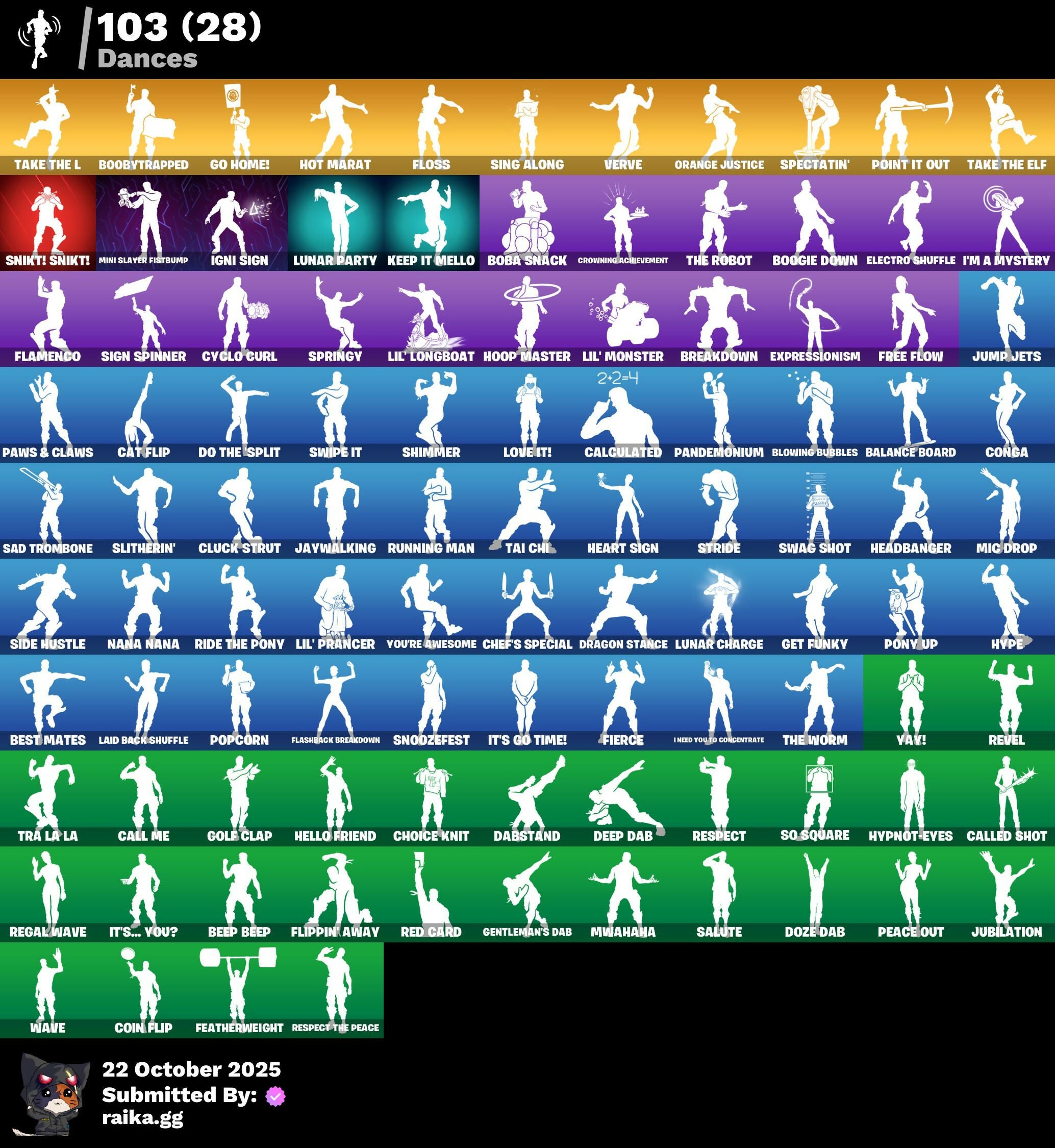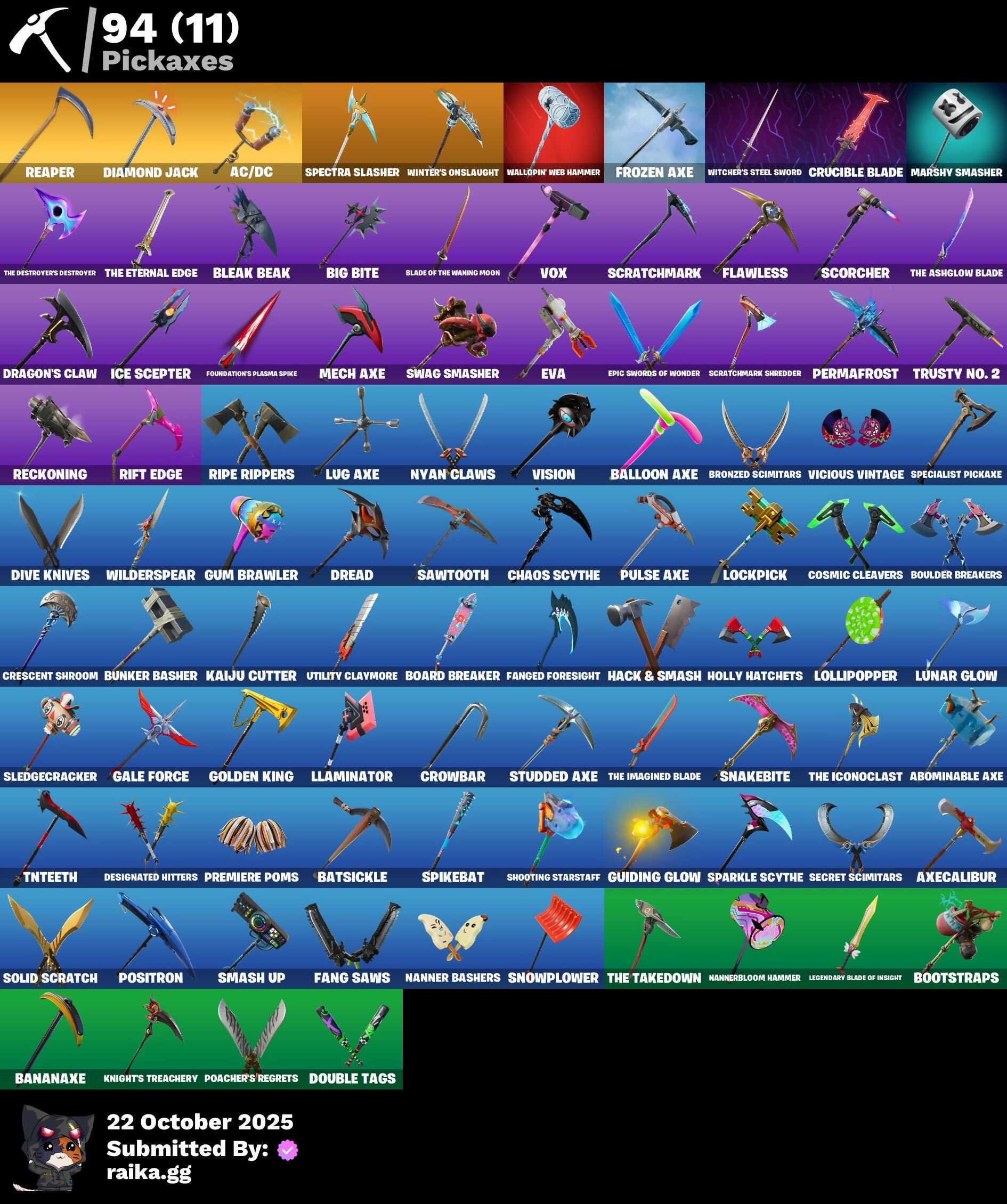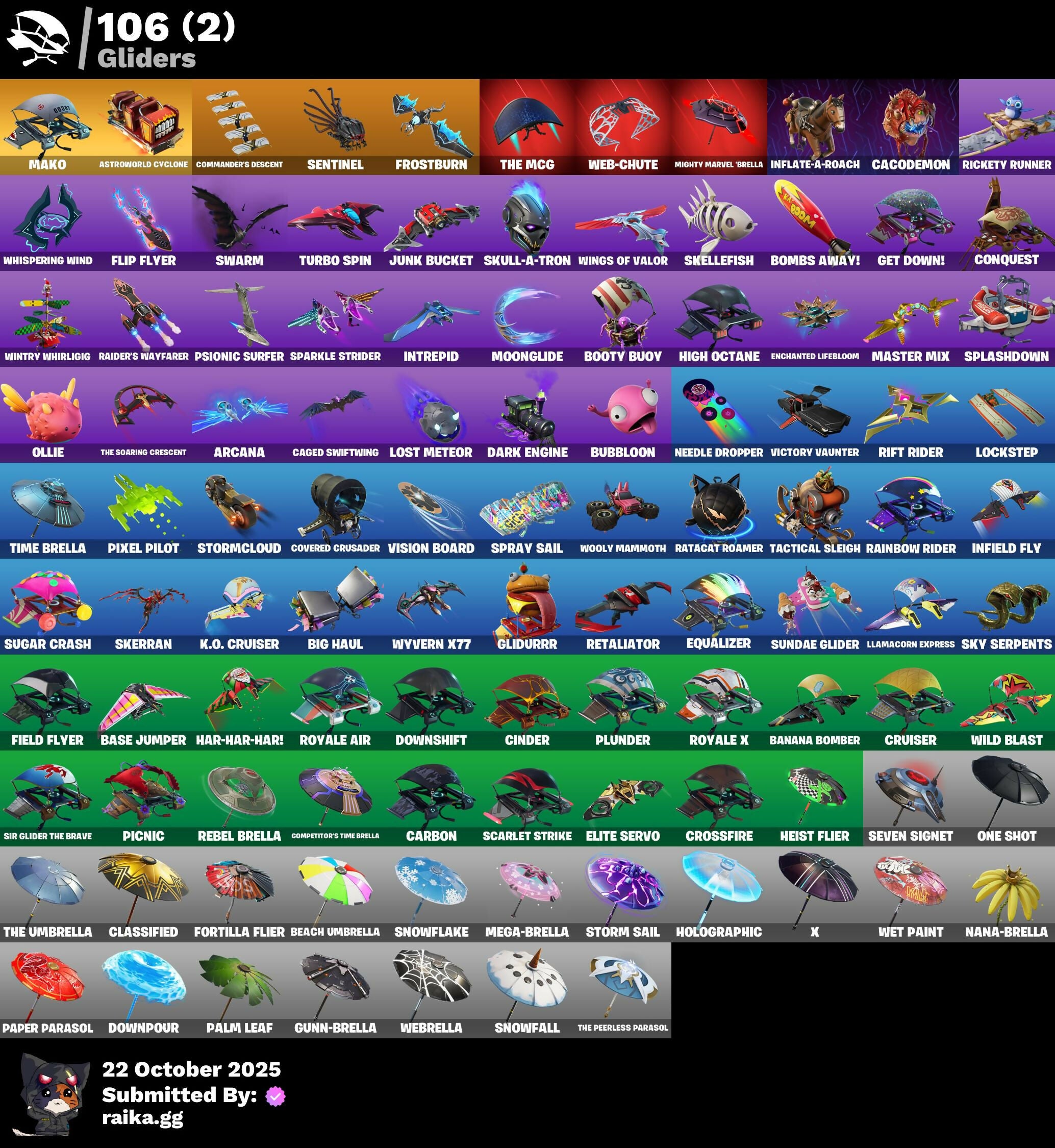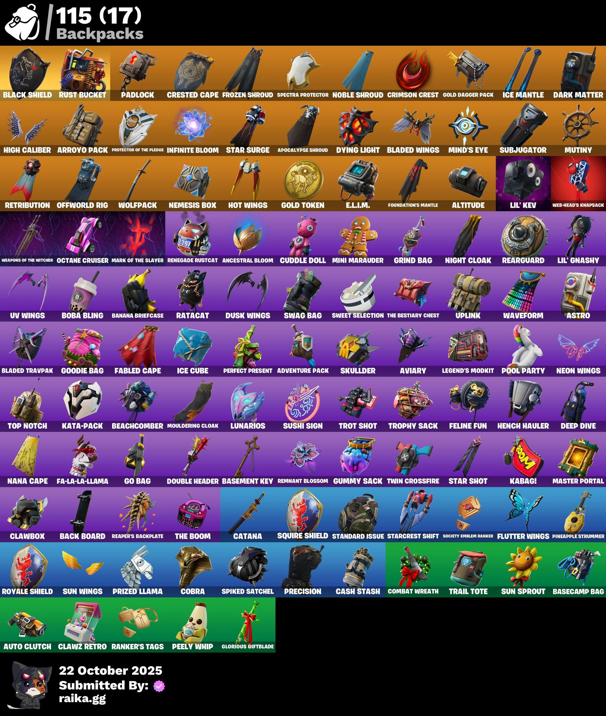 A.I.M., AC/DC, Abominable Axe, Adventure Pack, Agent Peely, Altitude, Ancestral Bloom, Apocalypse Shroud, Arcana, Arctic Adeline, Arroyo Pack, Astro, Astroworld Cyclone, Auto Clutch, Aviary, Axecalibur, Azuki, Back Board, Balance Board, Balloon Axe, Banana Bomber, Banana Briefcase, Bananaxe, Base Jumper, Basecamp Bag, Basement Key, Batsickle, Battle Hound, Battlehawk, Beach Umbrella, Beachcomber, Beep Beep, Best Mates, Big Bite, Big Haul, Black Knight, Black Shield, Blackheart, Blade Of The Waning Moon, Bladed Travpak, Bladed Wings, Bleak Beak, Blizzabelle, Blowing Bubbles, Blue Squire, Board Breaker, Boba Bling, Boba Snack, Bombs Away!, Boobytrapped, Boogie Down, Bootstraps, Booty Buoy, Boulder Breakers, Breakdown, Brite Bomber, Bronzed Scimitars, Brutus, Bubbloon, Bunker Basher, Bunker Jonesy, Cacodemon, Caged Swiftwing, Calamity, Calculated, Call Me, Called Shot, Carbide, Carbon, Cash Stash, Cat Flip, Catalyst, Catana, Chaos Scythe, Chef's Special, Choice Knit, Cinder, Classified, Clawbox, Clawz Retro, Cluck Strut, Cobra, Coin Flip, Combat Wreath, Commander's Descent, Competitor's Time Brella, Conga, Conquest, Cosmic Cleavers, Covered Crusader, Crescent Shroom, Crested Cape, Crimson Crest, Crossfire, Crowbar, Crowning Achievement, Crucible Blade, Cruiser, Cuddle Doll, Cyclo Curl, Dabstand, Dark Engine, Dark Matter, Dark Voyager, Deadpool, Deep Dab, Deep Dive, Demi, Designated Hitters, Diamond Jack, Dire, Dive Knives, Dj Vonder, Do The Split, Doom Slayer, Double Header, Double Tags, Downpour, Downshift, Doze Dab, Dragon Stance, Dragon's Claw, Dread, Drift, Dusk, Dusk Wings, Dusty, Dying Light, Dynamic Dribbler, E.L.I.M., Electro Shuffle, Elite Agent, Elite Servo, Ember, Enchanted Lifebloom, Enforcer, Epic Swords Of Wonder, Equalizer, Eva, Expressionism, Fa-La-La-Llama, Fable, Fabled Cape, Fang Saws, Fanged Foresight, Featherweight, Feline Fun, Field Flyer, Fierce, Flamenco, Flashback Breakdown, Flawless, Flip Flyer, Flippin' Away, Floss, Flutter, Flutter Wings, Fortilla Flier, Foundation's Mantle, Foundation's Plasma Spike, Free Flow, Frostburn, Frozen Axe, Frozen Shroud, Gale Force, Gear Specialist Maya, Gentleman's Dab, Geralt Of Rivia, Get Down!, Get Funky, Giddy-Up, Glidurr, Glorious Giftblade, Gnash, Go Bag, Go Home!, Gold Dagger Pack, Gold Token, Golden King, Golf Clap, Goodie Bag, Grave, Grind Bag, Guiding Glow, Gum Brawler, Gumbo, Gummy Sack, Gunn-Brella, Hack & Smash, Har-Har-Har!, Harlowe, Haven, Headbanger, Heart Sign, Heist Flier, Hello Friend, Helsie, Hench Hauler, High Caliber, High Octane, Holiday Boxy, Hollowhead, Holly Hatchets, Holographic, Hoop Master, Hope, Hot Marat, Hot Wings, Huntress, Hybrid, Hype, Hypnot-Eyes, I Need You To Concentrate, I'm A Mystery, Ice Cube, Ice Mantle, Ice Scepter, Igni Sign, Imani, Infield Fly, Infinite Bloom, Inflate-A-Roach, Intrepid, It's Go Time!, It's... You?, Jaywalking, Jubilation, Jump Jets, Junk Bucket, K.O. Cruiser, Kabag!, Kaiju Cutter, Kata-Pack, Keep It Mello, Knight's Treachery, Krisabelle, Laguna, Laid Back Shuffle, Legend's Modkit, Legendary Blade Of Insight, Lil Split, Lil' Gnashy, Lil' Kev, Lil' Longboat, Lil' Monster, Lil' Prancer, Llamacorn Express, Llaminator, Lockpick, Lockstep, Lollipopopper, Lost Meteor, Love It!, Lt. John Llama, Lug Axe, Lunar Charge, Lunar Glow, Lunar Party, Lunarios, Luxe, Lynx, Mako, Mark Of The Slayer, Marked Marauder, Marshy Smasher, Massai, Master Key, Master Mix, Master Portal, Mech Axe, Mega-Brella, Meowscles, Merry Marauder, Mic Drop, Midas, Mighty Marvel 'Brella, Mind's Eye, Mini Marauder, Mini Slayer Fistbump, Mission Specialist, Moonglide, Moonwalker, Mouldering Cloak, Mutiny, Mwahaha, Myna, Mystica, Nana Cape, Nana Nana, Nana-Brella, Nanner Bashers, Nannerbloom Hammer, Needle Dropper, Nemesis Box, Neon Wings, Nezumi, Night Cloak, Nightshade, Nightwitch, Noble Shroud, Nyan Claws, Octane Cruiser, Offworld Rig, Ollie, Omegarok, One Shot, Onesie, Orange Justice, Oscar, Padlock, Palm Leaf, Pandemonium, Paper Parasol, Paws & Claws, Peace Out, Peely, Peely Whip, Perfect Present, Permafrost, Picnic, Pineapple Strummer, Pixel Pilot, Plunder, Poacher's Regrets, Point It Out, Polar Peely, Pony Up, Pool Party, Popcorn, Positron, Powder, Precision, Premiere Poms, Prized Llama, Protector Of The Pledge, Psionic Surfer, Pulse Axe, Ragnarok, Raider's Wayfarer, Rainbow Rider, Ranker's Tags, Ratacat, Ratacat Roamer, Reaper, Reaper's Backplate, Rearguard, Rebel Brella, Reckoning, Recon Expert, Red Card, Redline, Regal Wave, Remnant Blossom, Renegade Lynx, Renegade Rustcat, Renzo The Destroyer, Respect, Respect The Peace, Retaliator, Retribution, Revel, Rickety Runner, Ride The Pony, Rift Edge, Rift Rider, Ripe Rippers, Ronin, Rook, Rox, Royale Air, Royale Knight, Royale Shield, Royale X, Ruin, Running Man, Runway Racer, Rust Bucket, Rust Lord, Sad Trombone, Salute, Satoru Gojo, Sawtooth, Scarlet Strike, Scimitar, Scorcher, Scratchmark, Scratchmark Shredder, Secret Scimitars, Selene, Sentinel, Seven Signet, Sgt. Winter, Shanta, Shimmer, Shogun, Shooting Starstaff, Side Hustle, Sidewinder, Sign Spinner, Sing Along, Sir Glider The Brave, Skellefish, Skerran, Skull Ranger, Skull-A-Tron, Skullder, Sky Serpents, Skye, Sled Ready Guff, Sledgecracker, Sledgehammer, Slitherin', Smash Up, Snakebite, Snikt! Snikt!, Snoozefest, Snowfall, Snowflake, Snowplower, So Square, Society Emblem Ranker, Solid Scratch, Sparkle Scythe, Sparkle Specialist, Sparkle Strider, Sparkle Supreme, Specialist Pickaxe, Spectatin', Spectra Knight, Spectra Protector, Spectra Slasher, Spider-Man, Spikebat, Spiked Satchel, Splashdown, Spray Sail, Springy, Squad Leader, Squire Shield, Standard Issue, Star Shot, Star Surge, Starcrest Shift, Storm Sail, Stormcloud, Stratus, Stride, Studded Axe, Subjugator, Sugar Crash, Summit Striker, Sun Sprout, Sun Strider, Sun Wings, Sunbird, Sundae Glider, Sushi Sign, Swag Bag, Swag Shot, Swag Smasher, Swarm, Sweet Selection, Swipe It, Tactical Sleigh, Tai Chi, Take The Elf, Take The L, Teknique, The Ace, The