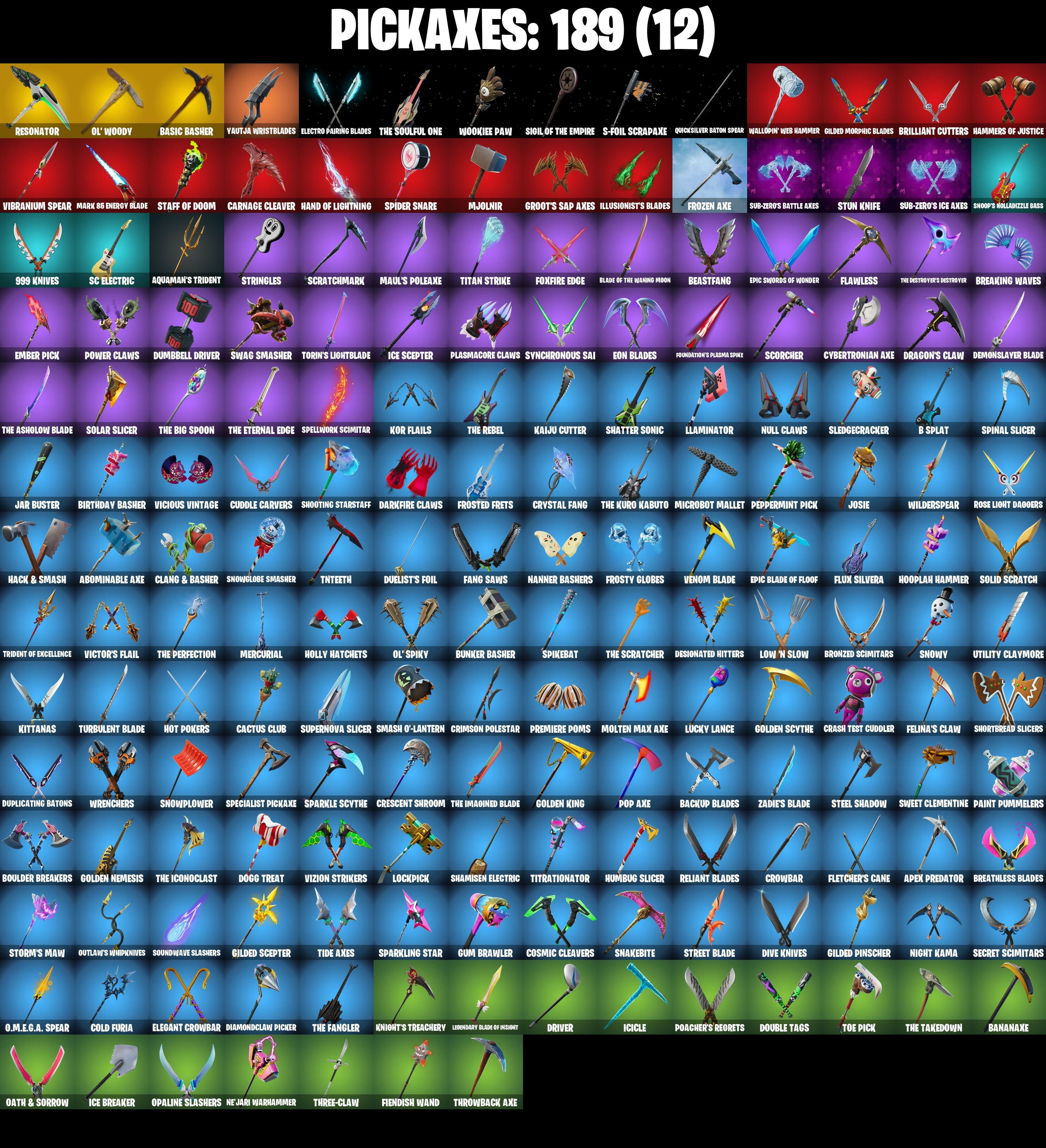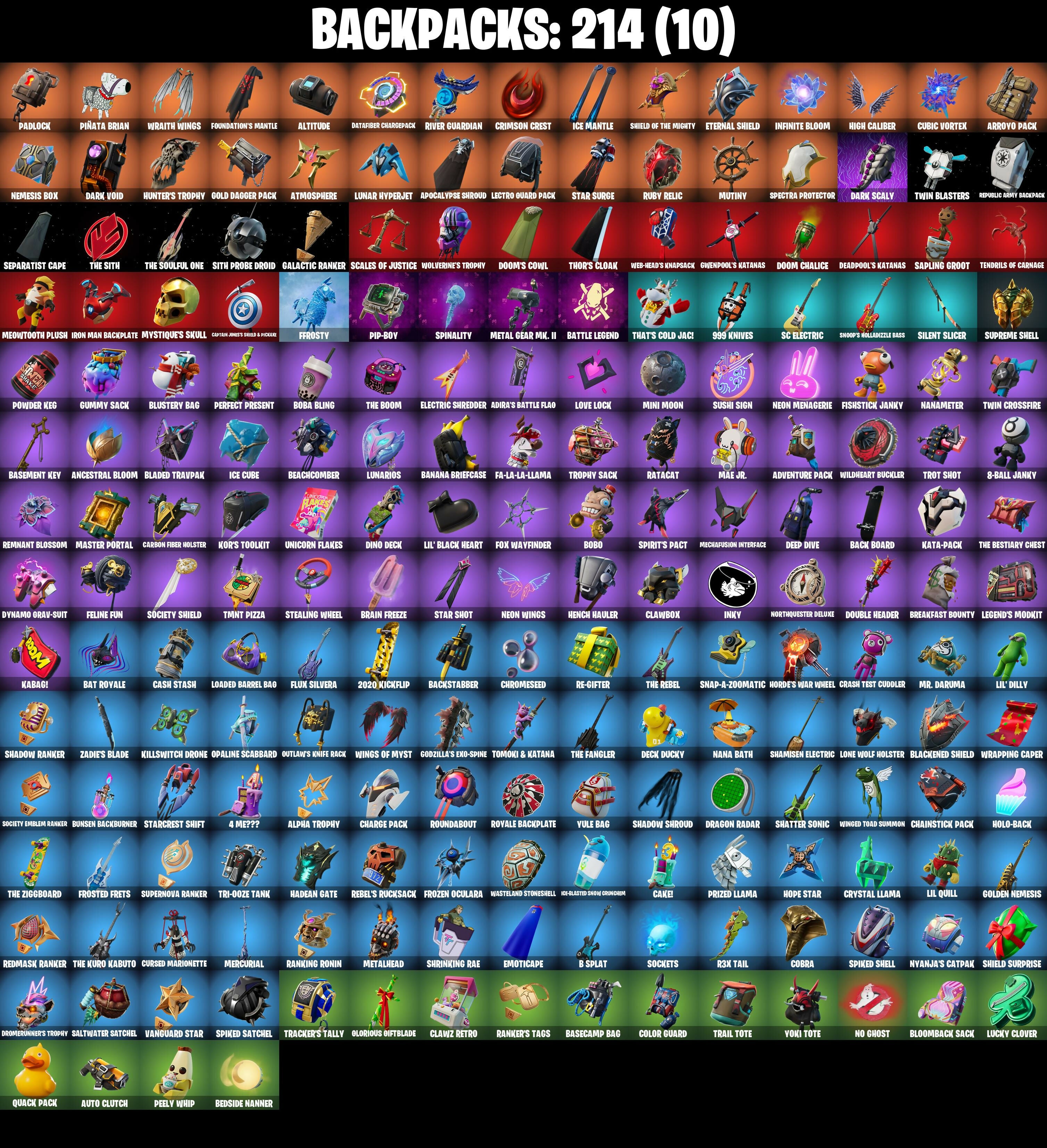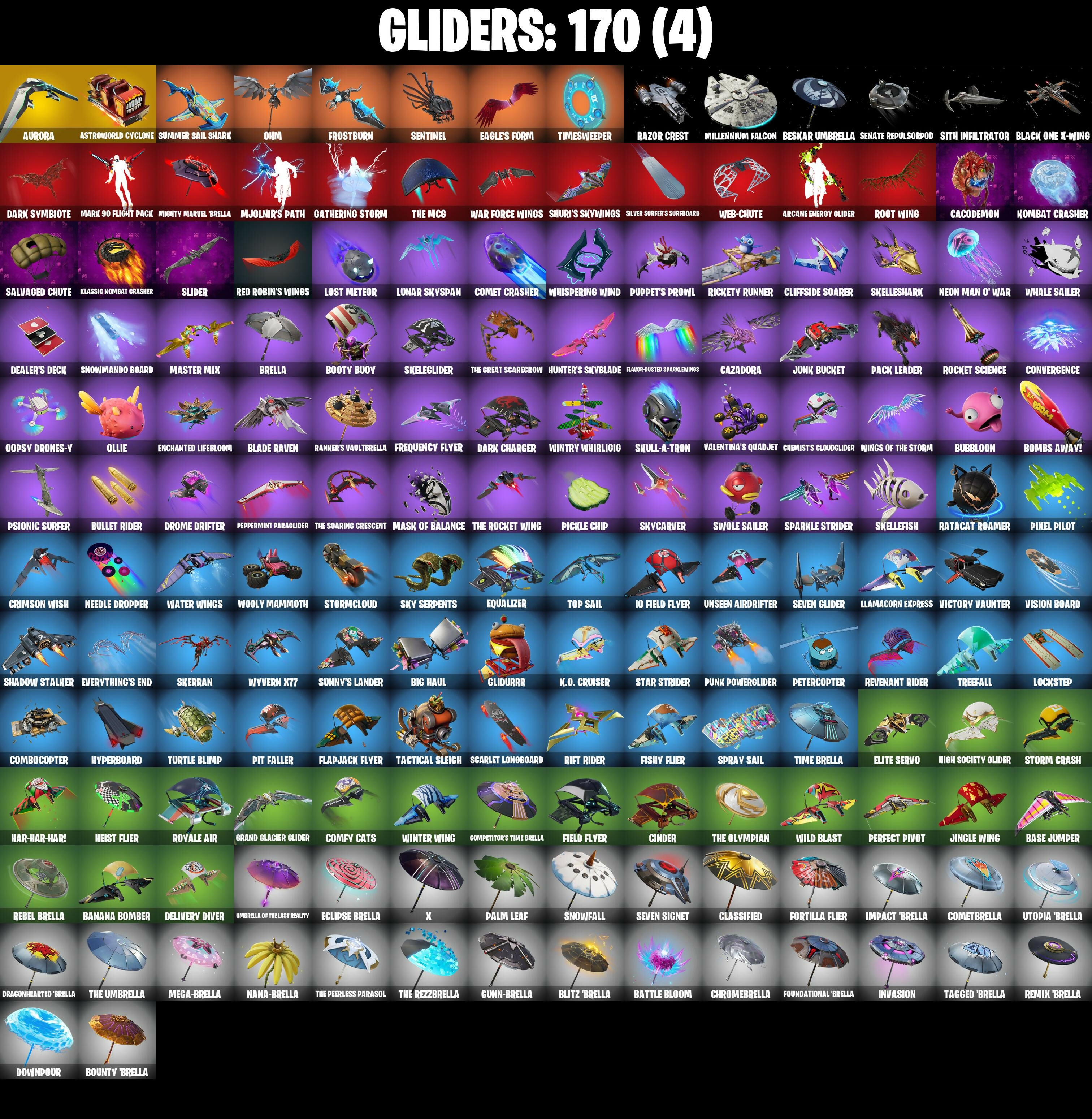 2020 Kickflip, 4 Me???, 8-Ball Janky, 999 Knives, A Warrior Prepares, Abominable Axe, Adira's Battle Flag, Adventure Pack, Agent Peely, Ahsoka's Clone Trooper, Air Shredder, Alpha Trophy, Altitude, Ancestral Bloom, Apex Predator, Apocalypse Shroud, Aquaman, Aquaman's Trident, Arcane Energy Glider, Arctic Adeline, Arroyo Pack, Arthur Curry, Astroworld Cyclone, Atmosphere, Aura, Aurora, Auto Clutch, B Splat, Back Board, Backstabber, Backup Blades, Banana Bomber, Banana Briefcase, Bananaxe, Baron's Hoard, Base Jumper, Basecamp Bag, Basement Key, Basic Basher, Bat Royale, Battle Bloom, Battle Legend, Beachcomber, Beastfang, Bedside Banner, Beep Beep, Beskar Umbrella, Bhangra Boogie, Bi-Han, Big Dill, Big Haul, Billy Bounce, Birthday Basher, Black, Black One X-Wing, Blackened Shield, Blackheart, Blackheart (Stage 8), Blade Raven, Blade of the Waning Moon, Bladed Travpak, Blitz 'brella, Bloomback Sack, Blowing Bubbles, Blustery Bag, Boba Bling, Bobo, Bombs Away!, Boogie Down, Boomin', Boosting Ki, Booty Buoy, Boulder Breakers, Bounty 'brella, Brain Freeze, Breakfast Bounty, Breaking Point, Breaking Waves, Breakneck, Breathless Blades, Brella, Brilliant Cutters, Bronzed Scimitars, Bubblegum Highwire, Bubbloon, Bullet Rider, Bunker Basher, Bunsen Backburner, Burning Ambition Valeria, Burpee, Cacodemon, Cactus Club, Cake!, Call Me, Cap Kick, Captain Jones' Shield & Pickaxe, Captain Llamerica, Carbon Fiber Holster, Carnage, Carnage (Maximum), Carnage Cleaver, Cash Stash, Cassidy Quinn, Cat Flip, Catalyst, Catalyst (Overcharged), Cauldron Chill, Cazadora, Chainstick Pack, Charge Pack, Charlotte, Chef's Special, Chemist's Cloudglider, Choice Knit, Chrome Punk, Chromebrella, Chromeseed, Cinder, Clang & Basher, Classified, Clawbox, Clawz Retro, Clean Sweep, Cleveland Brown, Cliffside Soarer, Cobra, Coin Flip, Cold Furia, Color Guard, Combocopter, Comet Crasher, Cometbrella, Comfy Cats, Competitor's Time Brella, Conga, Convergence, Coruscant Guard, Cosmic Cleavers, Count It!, Crash Test Cuddler, Crescent Shroom, Crimson Crest, Crimson Polestar, Crimson Wish, Crossbounce, Crowbar, Crowning Achievement, Crystal, Crystal Fang, Crystal Llama, Cubic Vortex, Cuddle Carvers, Curling Iron, Cursed Marionette, Cybertronian Axe, Cyclo Curl, Dabstand, Dagger Dance, Dark Charger, Dark Rex, Dark Scaly, Dark Symbiote, Dark Vanguard, Dark Void, Darkfire Claws, Datafiber Chargepack, Dawn Duelist Nisha, Deadpool, Deadpool Unmasked, Deadpool's Katanas, Deal'em Cassidy Quinn, Dealer's Deck, Deck Ducky, Deep Dive, Deep End, Delivery Diver, Demonslayer Blade, Designated Hitters, Diamond Throne, Diamondclaw Picker, Dill With It, Dillinger The Other, Dino Deck, Dive Knives, Doctor Doom, Doctor Doom (God Emperor), Dogg Treat, Doom Chalice, Doom's Cowl, Double Header, Double Tags, Downpour, Doze Dab, Dragon Radar, Dragon Stance, Dragon's Claw, Dragonhearted 'brella, Driver, Drome Drifter, Dromerunner's Trophy, Duelist's Card Trick, Duelist's Foil, Dumbbell Driver, Duplicating Batons, Dusk Knight, Dynamo, Dynamo Grav-Suit, Eagle's Form, Eclipse Brella, Electric Shredder, Electro Pairing Blades, Electro Swing, Elegant Crowbar, Elite Servo, Ember, Ember Pick, Emoticape, Empress Fan Dance, Enchanted Lifebloom, Entranced, Eon, Eon Blades, Epic Blade of Floof, Epic Swords of Wonder, Equalizer, Eren Jaeger, Eternal Knight, Eternal Shield, Eternal Voyager, Eternal Voyager (Eternal), Everything's End, Expressionism, Fa-La-La-Llama, Fabio Sparklemane, Face Palm, Fade, Fang Saws, Featherweight, Feelin' Jaunty, Felina, Felina's Claw, Feline Fun, Ffrosty, Field Flyer, Fiendish Wand, Fierce, Fishstick, Fishstick Janky, Fishy Flier, Fist Bump, Flapjack Flyer, Flavor-Dusted Sparklingus, Flawless, Fletcher Kane, Fletcher's Cane, Flippin' Away, Flux Silvera, Foil Flex, Fortilla Flier, Foundation's Mantle, Foundation's Plasma Spike, Foundational 'brella, Fox Wayfinder, Foxfire Edge, Free Flow, Frequency Flyer, Frost Squad, Frostburn, Frosted Frets, Frosty Globes, Frozen Axe, Frozen Oculard, Frozen Treat Cart, Full Moon Fletcher Kane, Full Tilt, Gage, Galactic Ranker, Gathering Storm, Gear Specialist Maya, Get Funky, Get Griddy, Gilded Morphic Blades, Gilded Pinscher, Gilded Scepter, Glidurr, Glorious Giftblade, Godzilla's Exo-Spine, Gold Brutus, Gold Dagger Pack, Gold Meowscles, Gold Midas, Gold Tintina, Gold Tntina, Golden King, Golden Nemesis, Golden Scythe, Golf Clap, Grand Glacier Glider, Groot, Groot (Silver Foil), Groot's Sap Axes, Ground Pound, Gum Brawler, Gumbo, Gumbo (Sour), Gummy Sack, Gunn-Brella, Gunslinger Outlaw Midas, Gwenpool's Katanas, Hack & Smash, Hadean Gate, Hammers of Justice, Hand of Lightning, Hand-Forged, Happy, Har-Har-Har!, Harlowe, Harlowe (Helmet), Harmony, Haven, Haven (Tropical Chirper), Heart Sign, Heist Flier, Hello Friend, Hench Hauler, High Caliber, High Society Glider, Highwire, Holiday Boxy, Holly Hatchets, Holo-Back, Hoop Master, Hooplah Hammer, Hope, Hope Star, Horde's War Wheel, Hot Pokers, Humbug Slicer, Hunter's Skyblade, Hunter's Trophy, Hybrid, Hybrid (Stage 4), Hyperboard, Hypnot-Eyes, I Declare!, I'm A Mystery, IO Field Flyer, Ice Breaker, Ice Cube, Ice King (Gold), Ice Mantle, Ice Scepter, Ice-Blasted Snow Crunch, Icicle, Illusionist's Blades, Imani, Impact Brella, Imperial March, Infinite Bloom, Inky, Invasion, Iris, Iron Man Backplate, It Is Finished, It's Chemistry!, It's... You?, J.B. Chimpanski, J.B. Chimpanski (Helmet), Jar Buster, Jaywalking, Jennifer Walters, Jet Signals, Jingle Wing, Josie, Joss, Jubilation, Jules, Junk Bucket, K.O. Cruiser, Kabag!, Kaiju Cutter, Kata-Pack, Keep It Mello, Keisha Cross, Keyed Up, Killswitch Drone, Kit, Kittanas, Klassic Kombat Crasher, Knife Sharpener, Knight's Treachery, Kombat Crasher, Kondor, Kor, Kor (Trenchcoat), Kor Flails, Kor's Toolkit, Krisabelle, Laugh It Up, Lectro Guard Pack, Legendary Blade of Insight, Legends Modkit, Lexa, Lexa (Warstrike), Lil Quill, Lil' Black Heart, Lil' Dilly, Lil' Monster, Lil' Mower, Lil' Podracer, Lil' Prancer, Lil' Rove