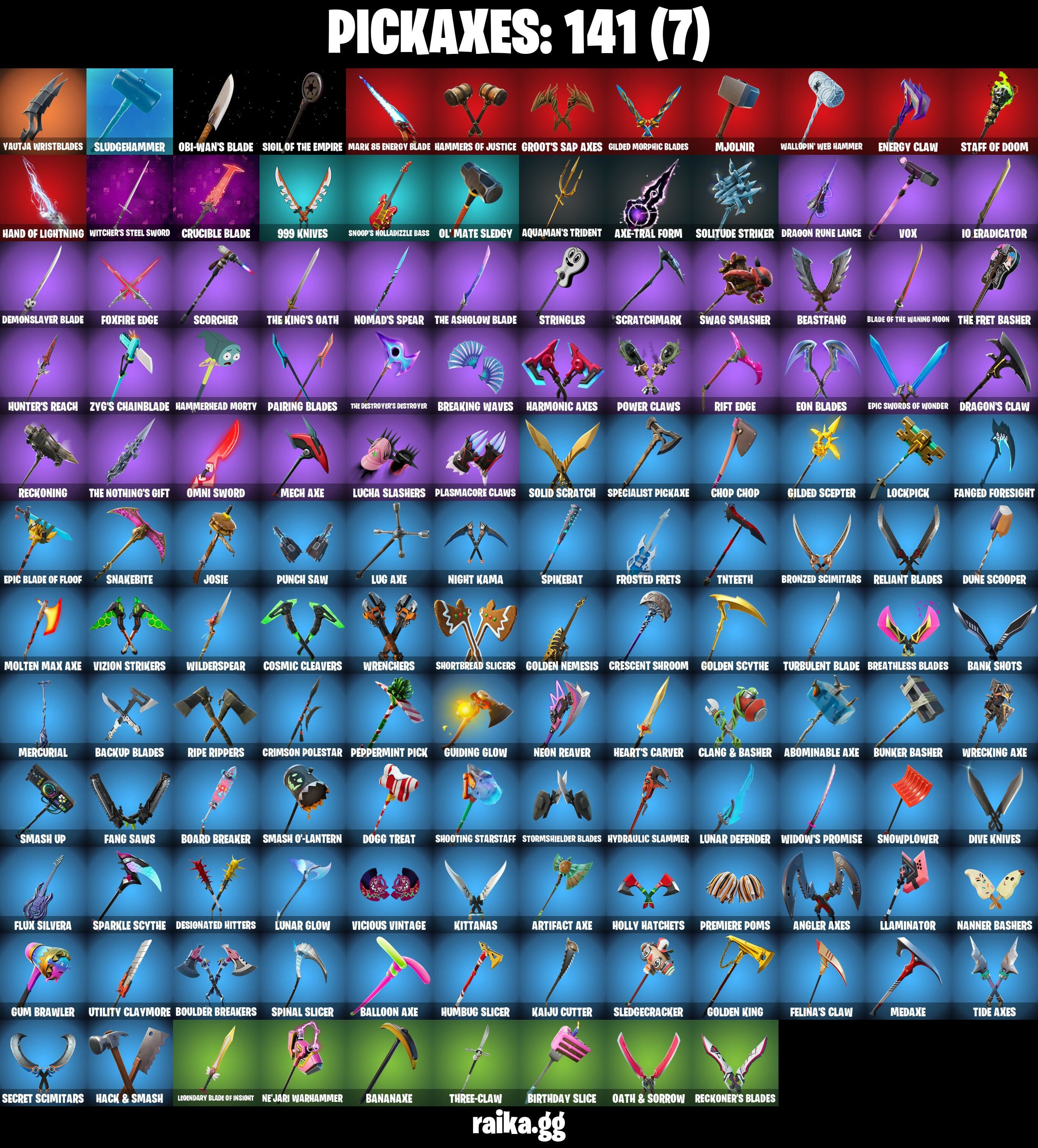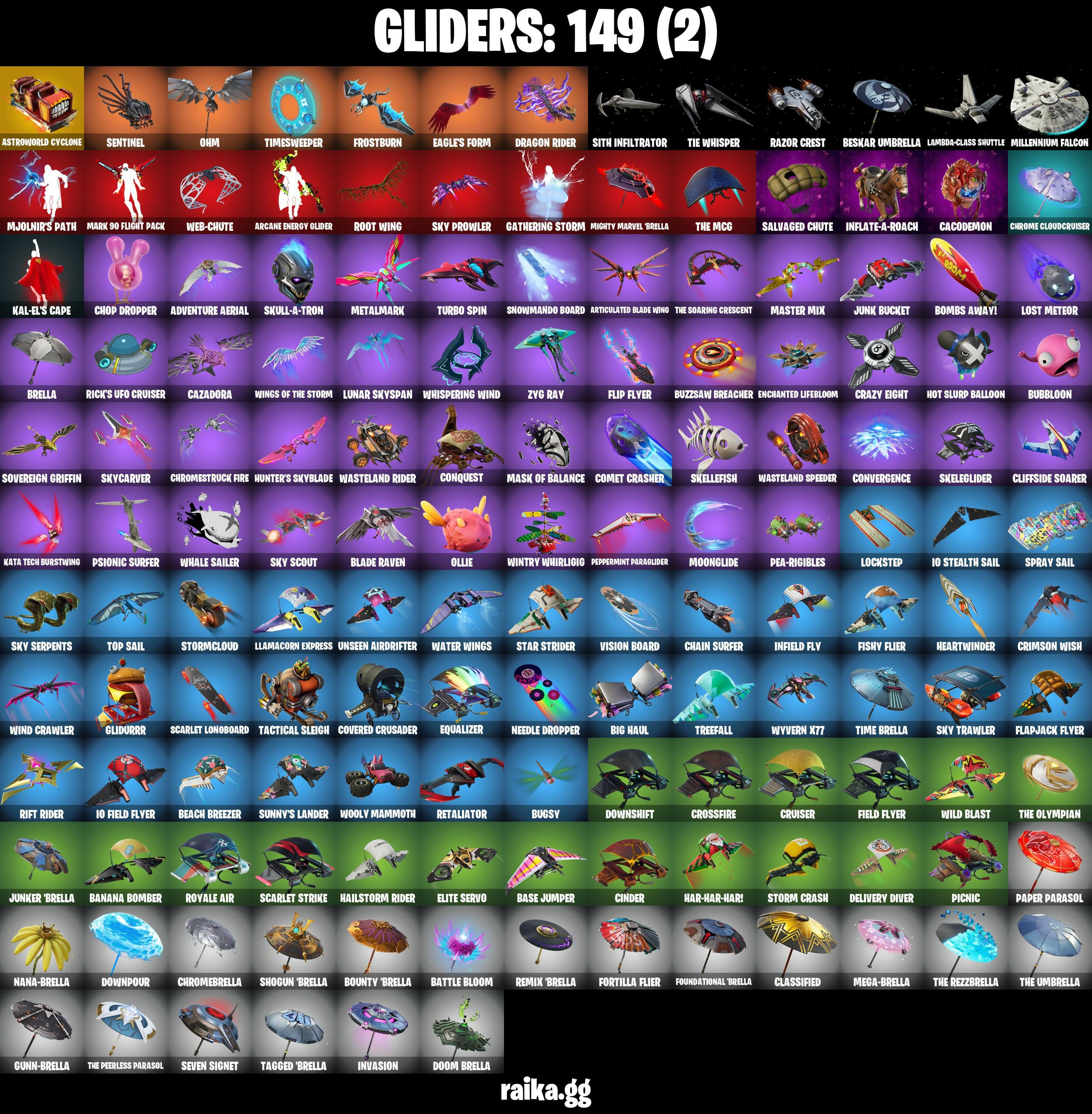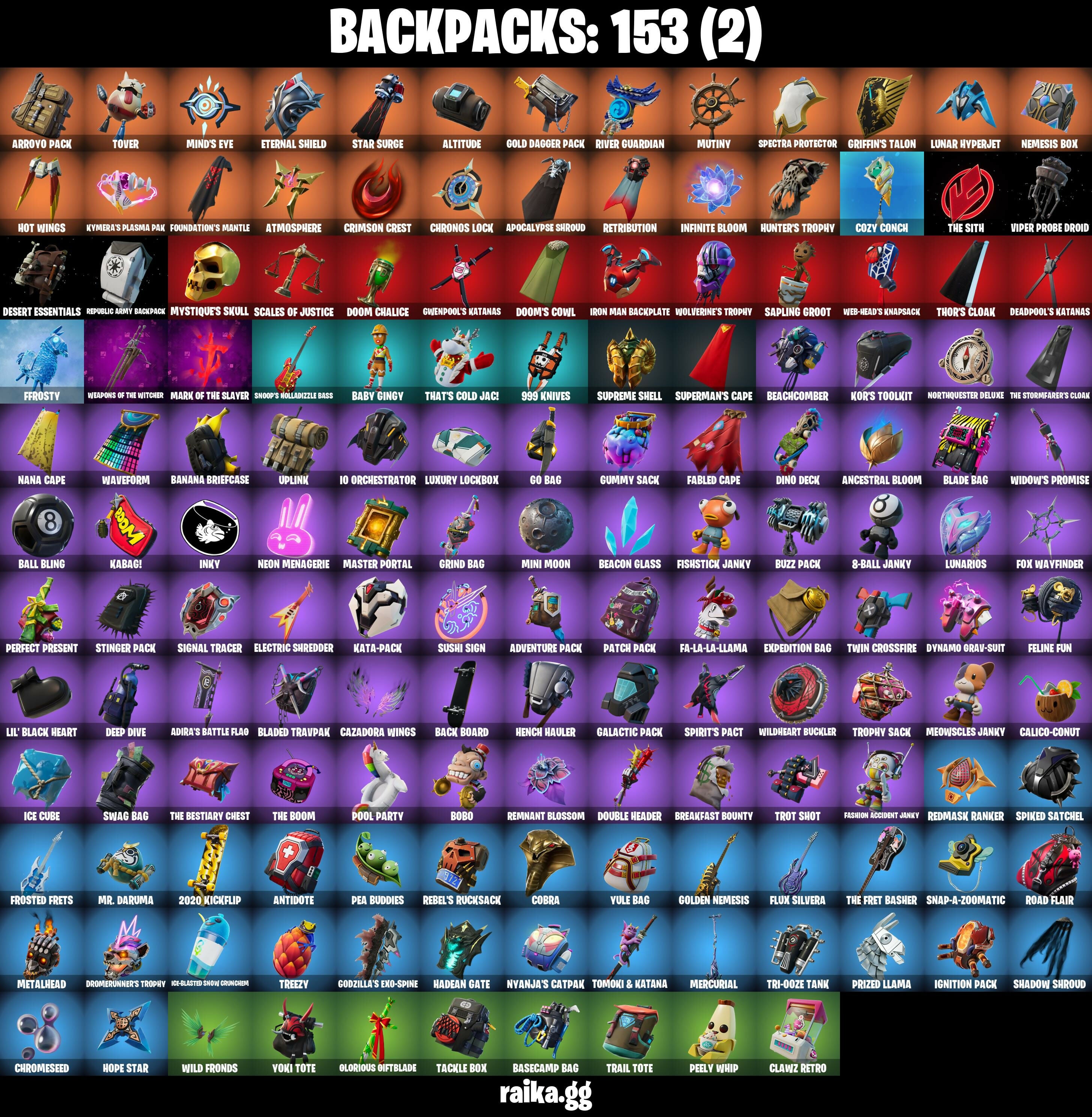 10 Orchestrator, 2020 Kickflip, 8-Ball Janky, 8-ball Vs Scratch, 999 Knives, Abominable Axe, Adira, Adira (Battle Mask), Adira's Battle Flag, Adventure Aerial, Adventure Pack, Agent Peely, Air Shredder, Altitude, Ancestral Bloom, Angler Axes, Antidote, Apocalypse Shroud, Aquaman, Aquaman's Trident, Arcane Energy Glider, Arctic Adeline, Arroyo Pack, Articulated Blade Wing, Artifact Axe, Astro Armor, Astroworld Cyclone, Atmosphere, Axe-tral Form, Baby Gingy, Back Board, Backup Blades, Balance Board, Ball Bling, Balloon Axe, Banana Bomber, Banana Briefcase, Bananaxe, Bank Shots, Base Jumper, Basecamp Bag, Battle Bloom, Beach Breezer, Beachcomber, Beacon Glass, Beastfang, Beep Beep, Beskar Umbrella, Big Haul, Birthday Slice, Black, Blackheart, Blackheart (Stage 8), Blade Bag, Blade Of The Waning Moon, Blade Raven, Bladed Travpak, Blowin' Up, Blowing Bubbles, Board Breaker, Bobo, Bombs Away!, Boogie Down, Boomin', Boulder Breakers, Bounty ‘Brella, Breakfast Bounty, Breaking Waves, Breathless Blades, Brella, Bronzed Scimitars, Bubblegum Highwire, Bubbloon, Bugsy, Bunker Basher, Bunker Jonesy, Buzz Pack, Buzzsaw Breacher, Bytes, Bytes (Lone Traveler), Cacodemon, Calamity, Calamity Stage 5, Calculated, Calico-Conut, Call Me, Cat Flip, Catalyst, Cazadora, Cazadora Wings, Chain Surfer, Charlotte, Chef's Special, Choice Knit, Chop Chop, Chop Dropper, Chopper, Chrome Cloudcruiser, Chrome Punk, Chromebrella, Chromeseed, Chromestruck Fire, Chronos Lock, Cinder, Clang & Basher, Clark Kent, Clark Kent (Superman), Classified, Clawz Retro, Clean Sweep, Cliffside Soarer, Clone Trooper, Cluck Strut, Cobra, Coin Flip, Comet Crasher, Conga, Conquest, Convergence, Cosmic Cleavers, Count It!, Covered Crusader, Cozy Conch, Crabby, Crazy Eight, Crescent Shroom, Crimson Crest, Crimson Polestar, Crimson Wish, Crossfire, Crowning Achievement, Crucible Blade, Cruiser, Cyclo Curl, Dabstand, Darth Vader, Deadpool, Deadpool Unmasked, Deadpool's Katanas, Deep Dab, Deep Dive, Delivery Diver, Demi, Demonslayer Blade, Desert Essentials, Designated Hitters, Dice Roll, Dino Deck, Dip, Dive Knives, Dj Yonder, Doctor Doom, Doctor Doom (God Emperor), Doctor Slone, Dogg Treat, Doom Brella, Doom Chalice, Doom Slayer, Doom's Cowl, Double Header, Downpour, Downshift, Doze Dab, Dragon Rider, Dragon Rune Lance, Dragon Stance, Dragon's Claw, Drift, Drift Stage 5, Dromerunner's Trophy, Droop, Dune Scooper, Dusty, Dynamo Grav-Suit, Eagles Form, Electric Shredder, Elite Servo, Empress Fan Dance, Enchanted Lifebloom, Energy Claw, Eon Blades, Epic Blade Of Floof, Epic Swords Of Wonder, Equalizer, Era, Eternal Knight, Eternal Shield, Evie, Expedition Bag, Expressionism, Fa-La-La-Llama, Fable, Fabled Cape, Fade, Fang Saws, Fanged Foresight, Fashion Accident Janky, Featherweight, Felina's Claw, Feline Fun, Ffrosty, Field Flyer, Fishstick Janky, Fishy Flier, Flapjack Flyer, Flip Flyer, Flippin' Away, Flux Silvera, Fortilla Flier, Foundation's Mantle, Foundational ‘Brella, Fox Wayfinder, Foxfire Edge, Frostburn, Frosted Frets, Galactic Pack, Gathering Storm, Gear Specialist Maya, Gear Specialist Maya (Hat - Dark), Gentleman's Dab, Geralt Of Rivia, Get Funky, Get Out Of Your Mind, Giddy-up, Gilded Morphic Blades, Gilded Scepter, Glidurr, Go Bag, Godzilla's Exo-Spine, Gold Brutus, Gold Dagger Pack, Gold Midas, Golden King, Golden Nemesis, Golden Scythe, Golf Clap, Good Guy, Griffin's Talon, Grind Bag, Groot, Groot (Silver Foil), Groot's Sap Axes, Grriz, Guggimon, Guiding Glow, Gum Brawler, Gumbo, Gummy Sack, Gunn-Brella, Gunnar, Gwenpool's Katanas, Hack & Smash, Hadean Gate, Hailstorm Rider, Hammerhead Morty, Hammers Of Justice, Hand Of Lightning, Hand-Forged, Happy, Har-Har-Har!, Harlowe, Harmonic Axes, Haven, Head (Droopy), Heart's Carver, Heartwinder, Hello Friend, Hench Hauler, High Five, Highwire, Holiday Boxy, Holly Hatchets, Hope Star, Hot Slurp Balloon, Hot Wings, Hula Hoopin', Humbug Slicer, Hunter's Reach, Hunter's Trophy, Hunter’s Skyblade, Huntress, Hybrid, Hybrid (Stage 4), Hydraulic Slammer, IO Eradicator, Ice Cube, Ice-Blasted Snow Crunch'em, Igni Sign, Ignition Pack, Imani, Imperial March, Infield Fly, Infinite Bloom, Infinite Dab, Inflate-A-Roach, Inky, Invasion, Io Field Flyer, Io Stealth Sail, Iron Man Backplate, It Is Finished, It's Go Time!, It's... You, Jaywalking, Jennifer Walters, Jet Signals, Joey, Josie, Journey Vs Hazard, Jules, Jump Jets, Junk Bucket, Junker ‘Brella, Kabag!, Kaiju Cutter, Kal-El’s Cape, Kata Tech Burstwing, Kata-Pack, Keyed Up, Kick Back, Kit, Kittanas, Kondor, Kor, Kor's Toolkit, Krisabelle, Kymera, Kymera's Plasma Pak, Laid Back Shuffle, Lambda-class Shuttle, Lazarbeam, Legendary Blade Of Insight, Lil' Black Heart, Lil' Monster, Lil' Podracer, Lil' Prancer, Lil' Saucer, Llamacorn Express, Llaminator, Lockpick, Lockstep, Lost Meteor, Love It!, Lt. John Llama, Lucha Slashers, Lug Axe, Lunar Charge, Lunar Defender, Lunar Glow, Lunar Hyperjet, Lunar Party, Lunar Skyspan, Lunarios, Lunch Break, Luxury Lockbox, Lynx, Lynx (Stage 4 - No Ponytail), Make A Seat, Malik, Malik (Solitary Defender), Mancake, Mandalorian, Mariposa, Mark 85 Energy Blade, Mark 90 Flight Pack, Mark Of The Slayer, Mask Of Balance, Masked, Massai, Master Mix, Master Portal, Mave, Mave (Reactive Hair Off), Mech Axe, Medaxe, Mega-Brella, Meowscles, Meowscles Janky, Mercurial, Metalhead, Metalmark, Mic Drop, Mighty Marvel ‘Brella, Millennium Falcon, Mind's Eye, Mini Moon, Mini Slayer Fistbump, Mizuki, Mjolnir, Mjolnir’s Path, Molten Max Axe, Moonglide, Mr. Daruma, Mutiny, Mwahaha, Mystica, Mystique, Mystique's Skull, Nana Cape, Nana Nana, Nana-Brella, Nanner Bashers, Ne'Jari Warhammer, Needle Dropper, Nemesis Box, Neon Menagerie, Neon Reaver, Nezumi, Night Kama, Nolan Chance, Nomad's Spear, Northquester Deluxe, Nyanja's Catpak, Oath & Sorrow, Obi-Wan's Blade, Obi-wan Kenobi, Ocean, Ohm, Ol' Mate Sledgy, Ollie, Olorious Giftblade, Omni Sword, Oxide Rust, Pairing Blades, Pandemonium, Paper Parasol, Paradigm (Reality-659), Patch