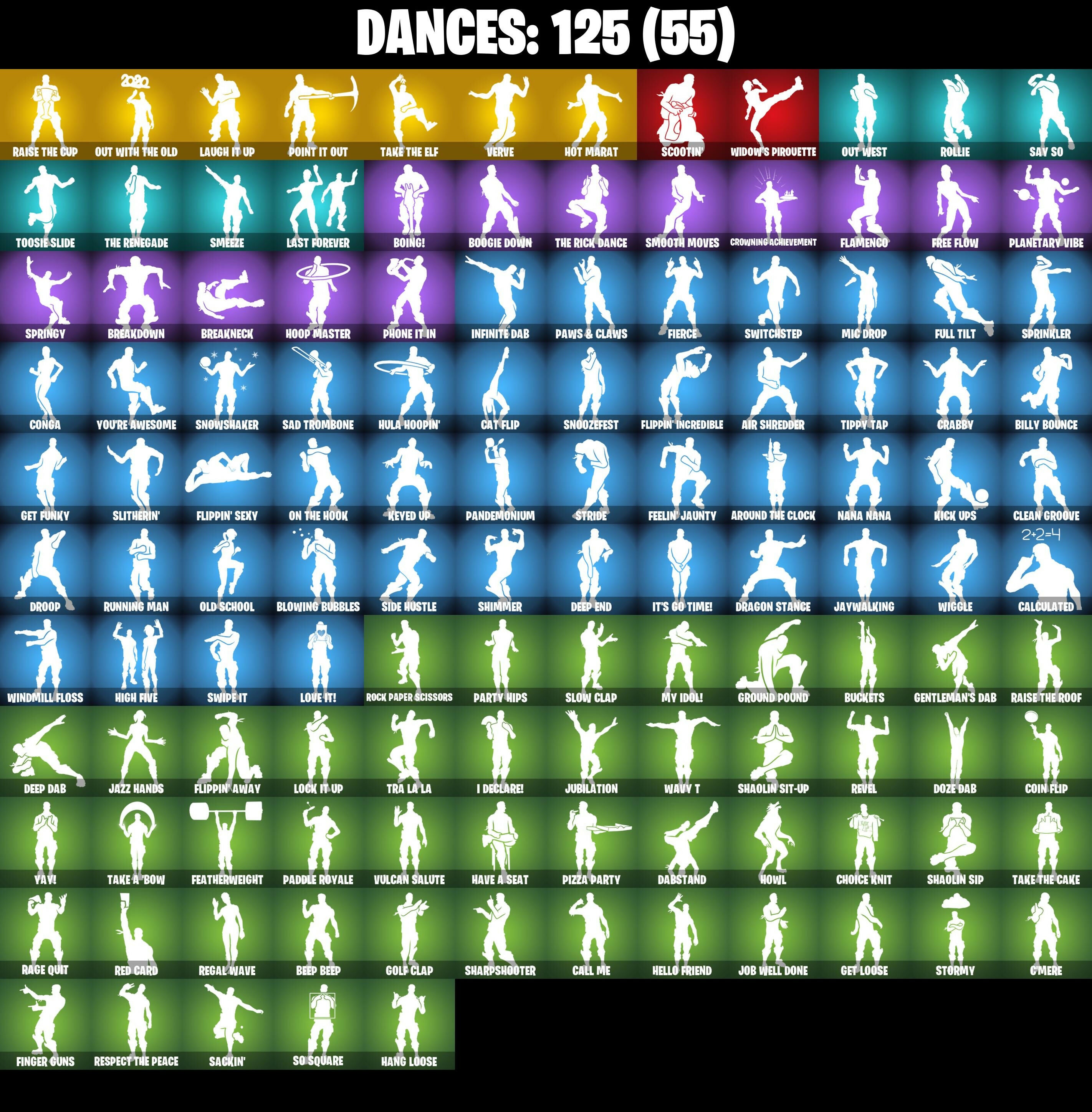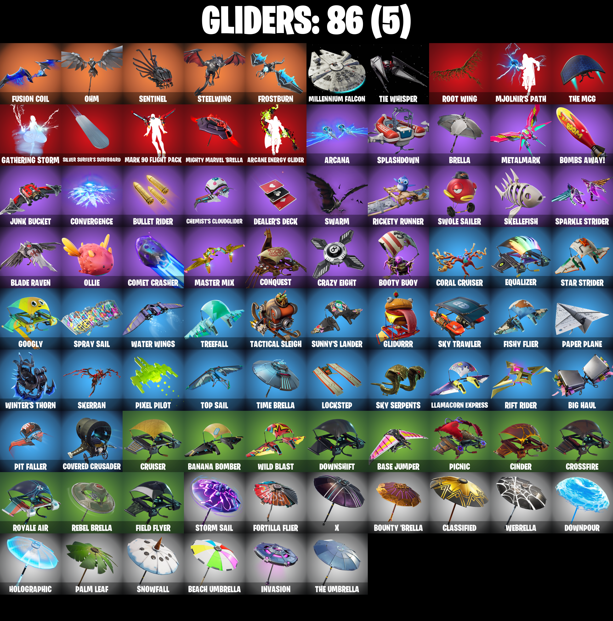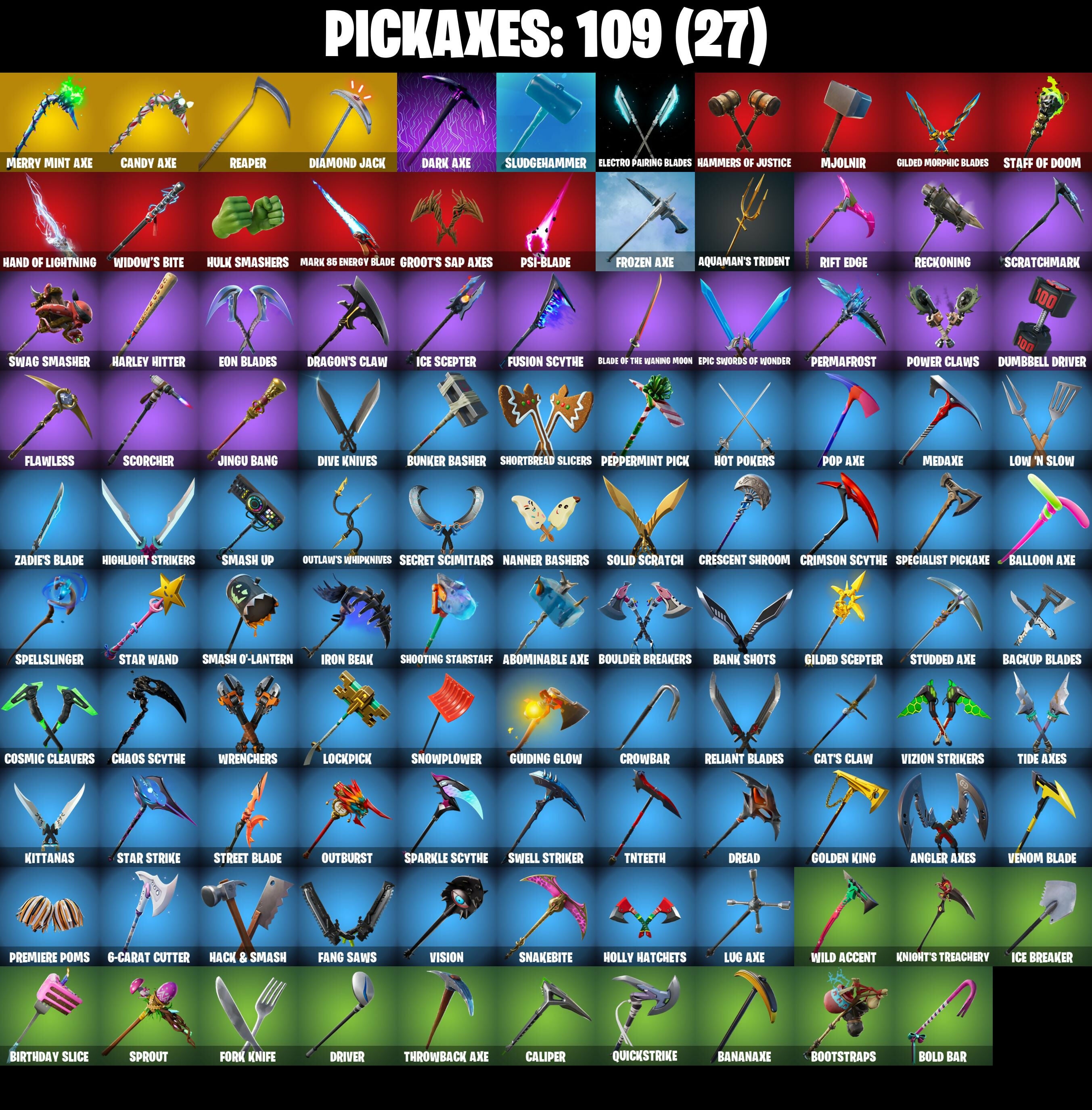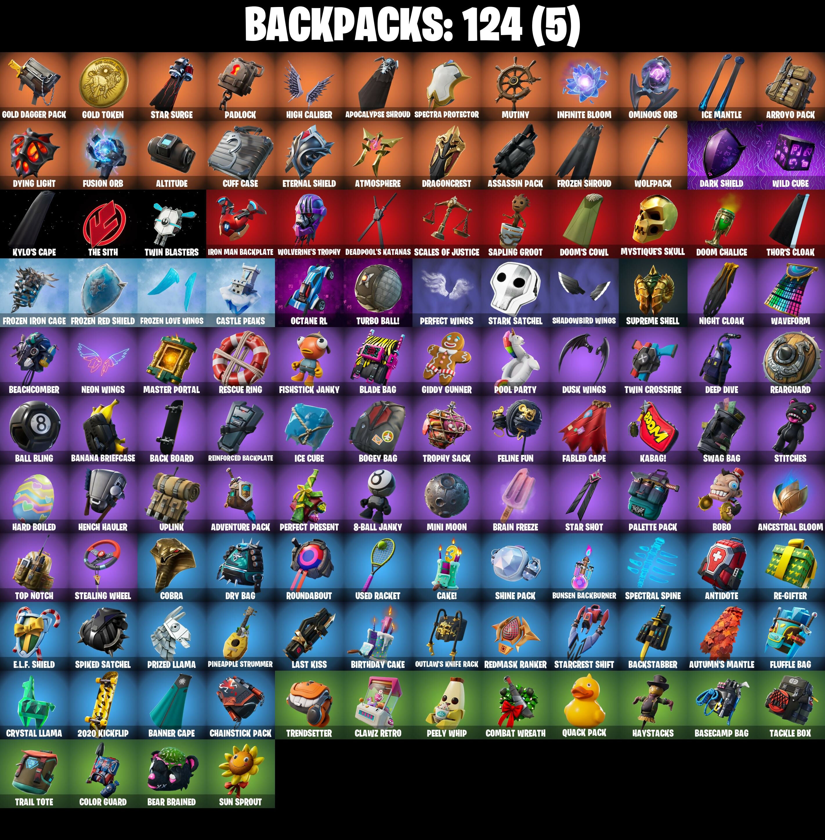 2020 Kickflip, 6-Carat Cutter, 8-Ball Janky, 8-Ball vs Scratch, Abominable Axe, Adventure Pack, Agent Peely, Air Shredder, Altitude, Ancestral Bloom, Angler Axes, Antidote, Apocalypse Shroud, Aquaman, Aquaman's Trident, Arcana, Arcane Energy Glider, Arctic Assassin, Around The Clock, Arroyo Pack, Arthur Curry, Assassin Pack, Atmosphere, Aura, Autumn's Mantle, Back Board, Backstabber, Backup Blades, Ball Bling, Balloon Axe, Banana Bomber, Banana Briefcase, Bananaxe, Bank Shots, Banner Cape, Base Jumper, Basecamp Bag, Beach Umbrella, Beachcomber, Bear Brained, Beep Beep, Big Haul, Billy Bounce, Birthday Cake, Birthday Slice, Black Werewolf, Blackheart, Blackheart (Stage 8), Blade Bag, Blade Of The Waning Moon, Blade Raven, Blowing Bubbles, Bobo, Bogey Bag, Boing!, Bold Bar, Bombs Away!, Boogie Down, Bootstraps, Booty Buoy, Boulder Breakers, Bounty 'Brella, Brain Freeze, Breakdown, Breakneck, Brella, Buckets, Bullet Rider, Bullseye, Bunker Basher, Bunsen Backburner, C'mere, Cake!, Calamity, Calamity Stage 5, Calculated, Caliper, Call Me, Cameo vs Chic, Candy Axe, Castaway Jonesy, Castle Peaks, Cat Flip, Cat's Claw, Catalyst, Catalyst (Overcharged), Chainstick Pack, Chaos Scythe, Chemist's Cloudglider, Choice Knit, Cinder, Classified, Clawz Retro, Clean Groove, Clinical Crosser, Cobalt, Cobra, Codename E.L.F., Coin Flip, Color Guard, Combat Wreath, Comet Crasher, Commando, Conga, Conquest, Convergence, Coral Cruiser, Cosmic Cleavers, Covered Crusader, Crabby, Crazy Eight, Crescent Shroom, Crimson Scythe, Crossfire, Crowbar, Crowning Achievement, Cruiser, Cryptic, Crystal, Crystal Llama, Cuff Case, DJ Yonder, Dabstand, Dark Axe, Dark Jonesy, Dark Red Knight, Dark Shield, Dark Wild Card, Deadpool, Deadpool Unmasked, Deadpool's Katanas, Dealer's Deck, Deep Dab, Deep Dive, Deep End, Diamond Diva, Diamond Jack, Dire, Dive Knives, Doctor Doom, Doom Chalice, Doom's Cowl, Downpour, Downshift, Doze Dab, Dragon Stance, Dragon's Claw, Dragoncrest, Dread, Drift, Drift Stage 5, Driver, Droop, Dry Bag, Dumbbell Driver, Dusk, Dusk Wings, Dying Light, Dynamo, E.L.F. Shield, Electro Pairing Blades, Ember, Envoy, Eon Blades, Epic Swords Of Wonder, Equalizer, Eternal Knight, Eternal Shield, Eternal Voyager, Eternal Voyager (Eternal), Fable, Fabled Cape, Fade, Fang Saws, Fate, Featherweight, Feelin' Jaunty, Feline Fun, Field Flyer, Fierce, Finger Guns, Fishstick Janky, Fishy Flier, Flamenco, Flawless, Flippin' Away, Flippin' Incredible, Flippin' Sexy, Fluffle Bag, Fork Knife, Fortilla Flier, Free Flow, Frostburn, Frozen Axe, Frozen Fishstick, Frozen Iron Cage, Frozen Love Ranger, Frozen Love Wings, Frozen Nog Ops, Frozen Raven, Frozen Red Knight, Frozen Red Shield, Frozen Shroud, Full Tilt, Fusion, Fusion Coil, Fusion Orb, Fusion Scythe, Gathering Storm, Gear Specialist Maya, Gentleman's Dab, Get Funky, Get Loose, Ghoul Trooper, Giddy Gunner, Giddy-Up, Gilded Morphic Blades, Gilded Scepter, Ginger Gunner, Glidurrr, Gold Brutos, Gold Brutus, Gold Dagger Pack, Gold Midas, Gold Token, Golden King, Golf Clap, Googly, Groot, Groot (Silver Foil), Groot's Sap Axes, Ground Pound, Guff, Guiding Glow, Hack & Smash, Hammers Of Justice, Hand Of Lightning, Hang Loose, Happy, Hard Boiled, Harley Hitter, Have A Seat, Haystacks, Hello Friend, Hench Hauler, High Caliber, High Five, Highlight Strikers, Holly Hatchets, Holographic, Hoop Master, Hot Marat, Hot Pokers, Howl, Hula Hoopin', Hulk Smashers, Huntress, Hybrid, Hybrid (Stage 4), I Declare!, Ice Breaker, Ice Cube, Ice King (Gold), Ice Mantle, Ice Scepter, Inferno, Infinite Bloom, Infinite Dab, Invasion, Iris, Iron Beak, Iron Man Backplate, It's Go Time!, Jaywalking, Jazz Hands, Jennifer Walters, Jingu Bang, Job Well Done, John Wick, Journey vs Hazard, Jubilation, Jules, Junk Bucket, Kabag!, Keyed Up, Kick Ups, Kit, Kittanas, Knight's Treachery, Kylo Ren, Kylo's Cape, Lace, Laguna, Last Forever, Last Kiss, Laugh It Up, Llamacorn Express, Lock It Up, Lockpick, Lockstep, Love It!, Low 'N Slow, Lt. Evergreen, Lug Axe, Luxe, Luxe (Gold Clothing), Lynx, Lynx (Stage 4 - No Ponytail), Manic, Mark 86 Energy Blade, Mark 90 Flight Pack, Marked Marauder, Masked, Master Key, Master Key (Masked), Master Mix, Master Portal, Medaxe, Meowscles, Merry Mint Axe, Metalmark, Mic Drop, Mighty Marvel 'Brella, Millennium Falcon, Mini Moon, Mjolnir, Mjolnir's Path, Mutiny, My Idol!, Mystique, Mystique's Skull, Nana Nana, Nanner Bashers, Neon Wings, Night Cloak, Nightshade, Nog Ops, Ocean, Octane RL, Ohm, Old School, Ollie, Ominous Orb, On The Hook, Onesie, Onesie (Winter), Out West, Out With The Old, Outburst, Outlaw's Knife Rack, Outlaw's Whipknives, PJ Patroller, Paddle Royale, Padlock, Palette Pack, Palm Leaf, Pandemonium, Paper Plane, Par Patroller, Party Hips, Paws & Claws, Peely, Peely Whip, Peppermint Pick, Perfect Present, Perfect Shadow, Perfect Wings, Permafrost, Phone It In, Picnic, Pineapple Strummer, Pit Faller, Pixel Pilot, Pizza Party, Planetary Vibe, Point It Out, Poised Playmaker, Polar Peely, Pool Party, Pop Axe, Powder, Powder (White), Power Claws, Premiere Poms, Prized Llama, Psi-Blade, Quack Pack, Quickstrike, Rabbit Raider, Rage Quit, Ragnarok, Ragnarok (No Shoulder Pad), Raise The Cup, Raise The Roof, Re-Gifter, Reaper, Rearguard, Rebel Brella, Reckoning, Recon Expert, Red Card, Red Jade, Redline, Redmask Ranker, Regal Wave, Reinforced Backplate, Reliant Blades, Remedy (Purple), Remedy vs Toxin, Rescue Ring, Respect The Peace, Revel, Rickety Runner, Rift Edge, Rift Rider, Rippley vs Sludge, Riptide, Rock Paper Scissors, Rollie, Rook, Root Wing, Roundabout, Royale Air, Ruin, Running Man, Sackin', Sad Trombone, Sapling Groot, Say So, Scales of Justice, Scarlet Defender, Scootin', Scorcher, Scratch (Virus), Scratchmark, Scuba Jonesy, Secret Scimitars, Seeker, Sentinel, Sgt. Winter, Sgt. Winter Headgear, Shadow Skully, Shadowbird, Shadowbird Wings, Shaolin Sip, Shaolin Sit-Up, Sharpshooter, Shimmer, Shine Pack, Shooting Starsstaff, Shortbread Slicers, Side Hustle, Sidewinder, Si