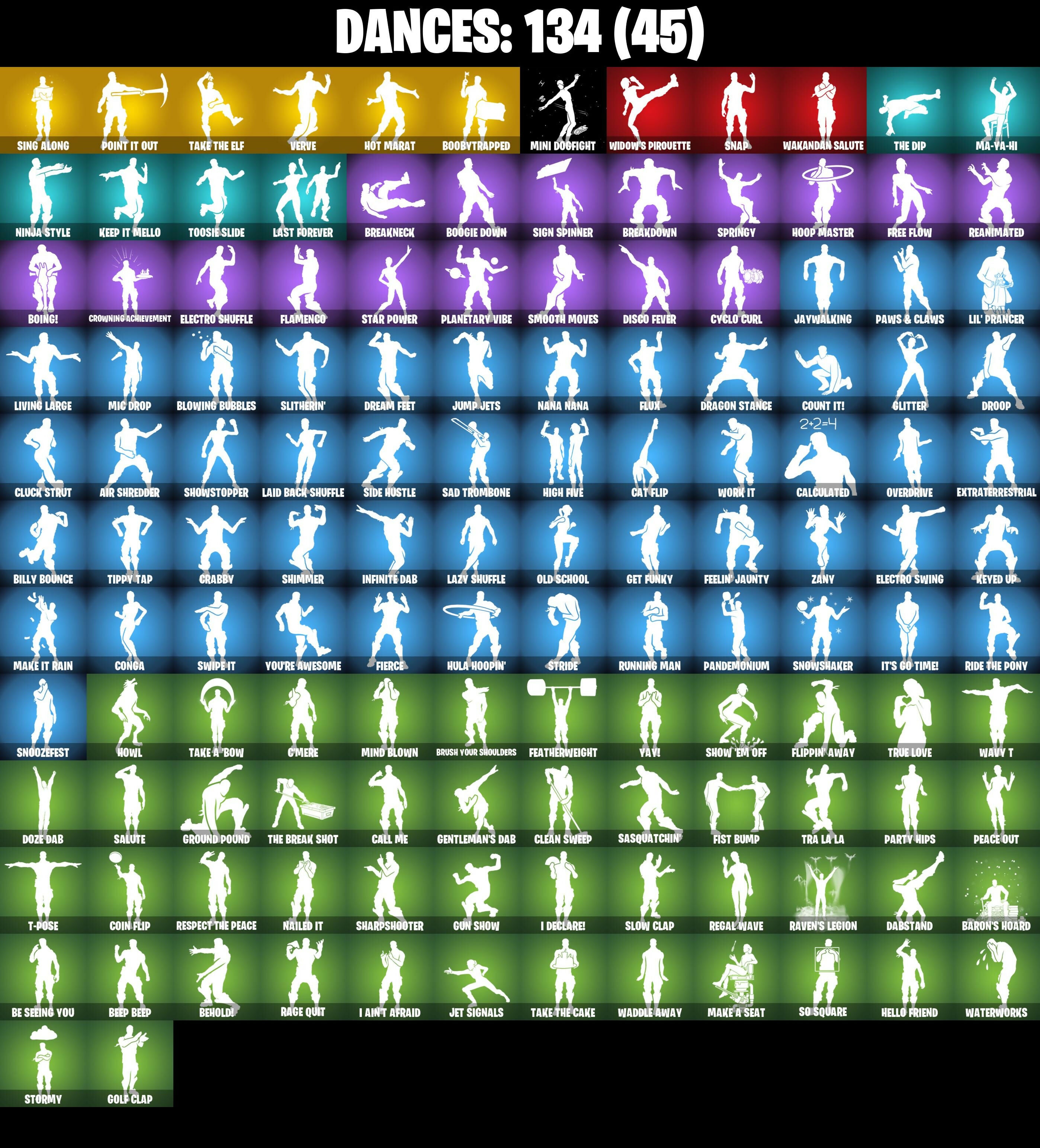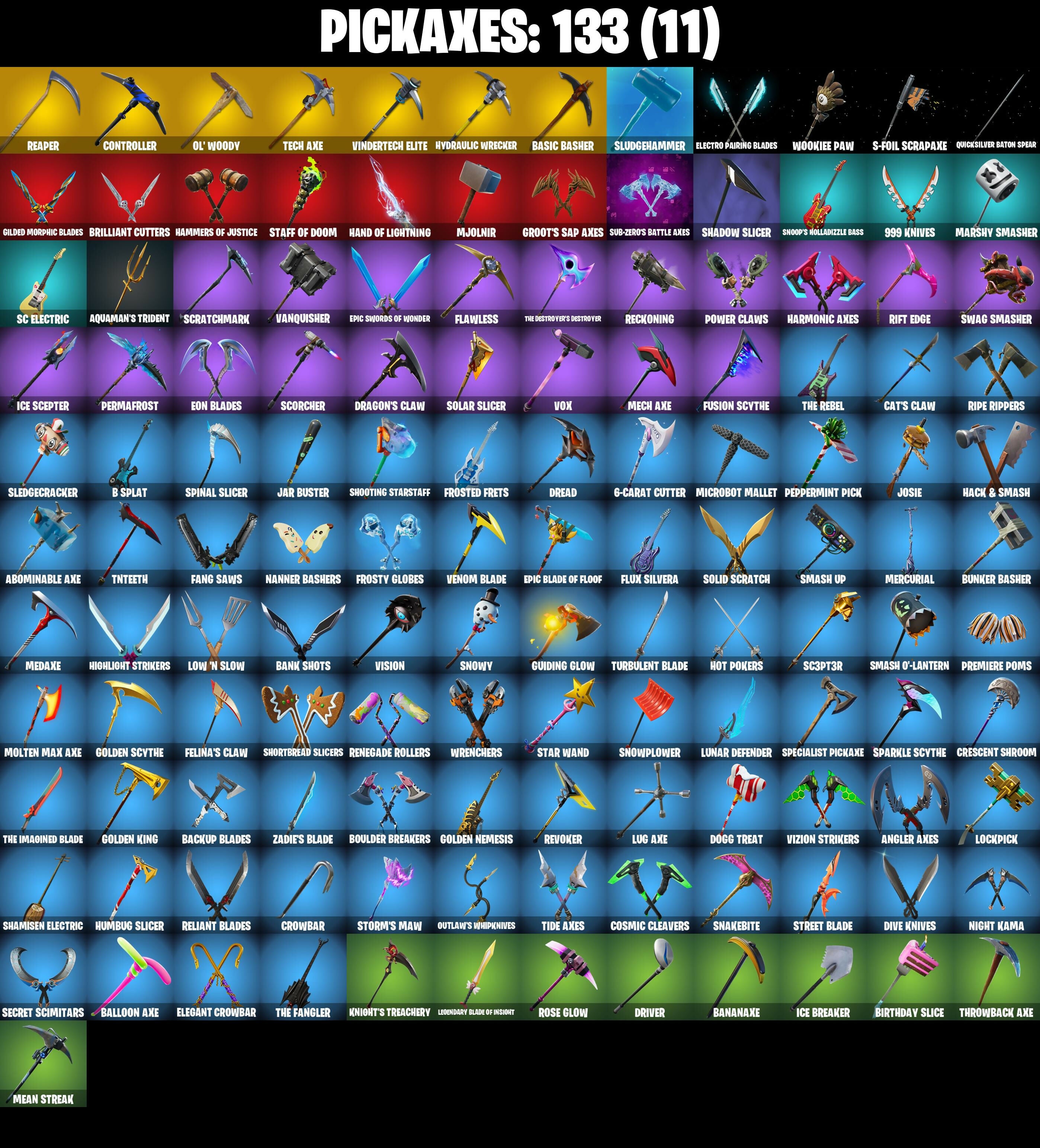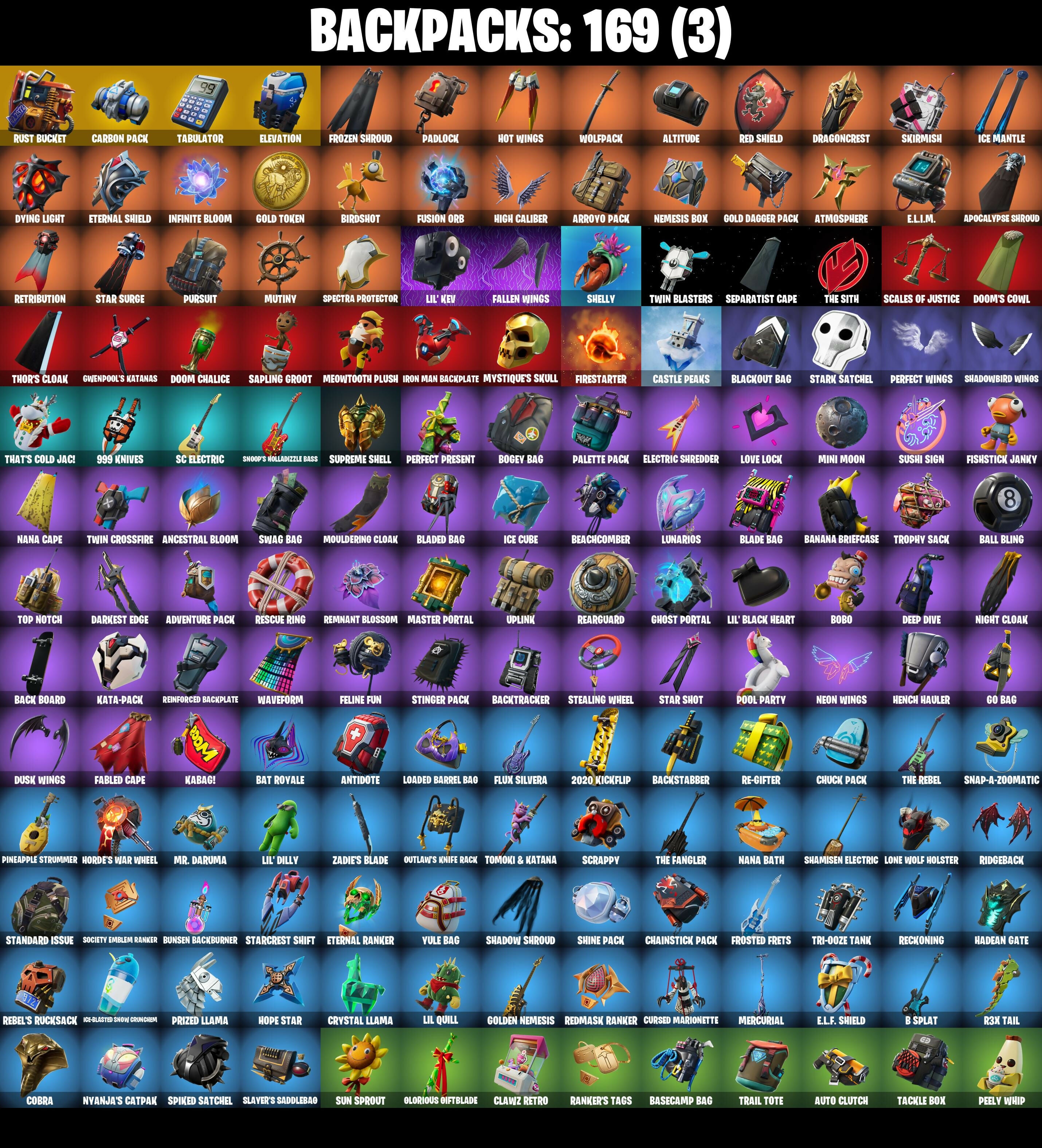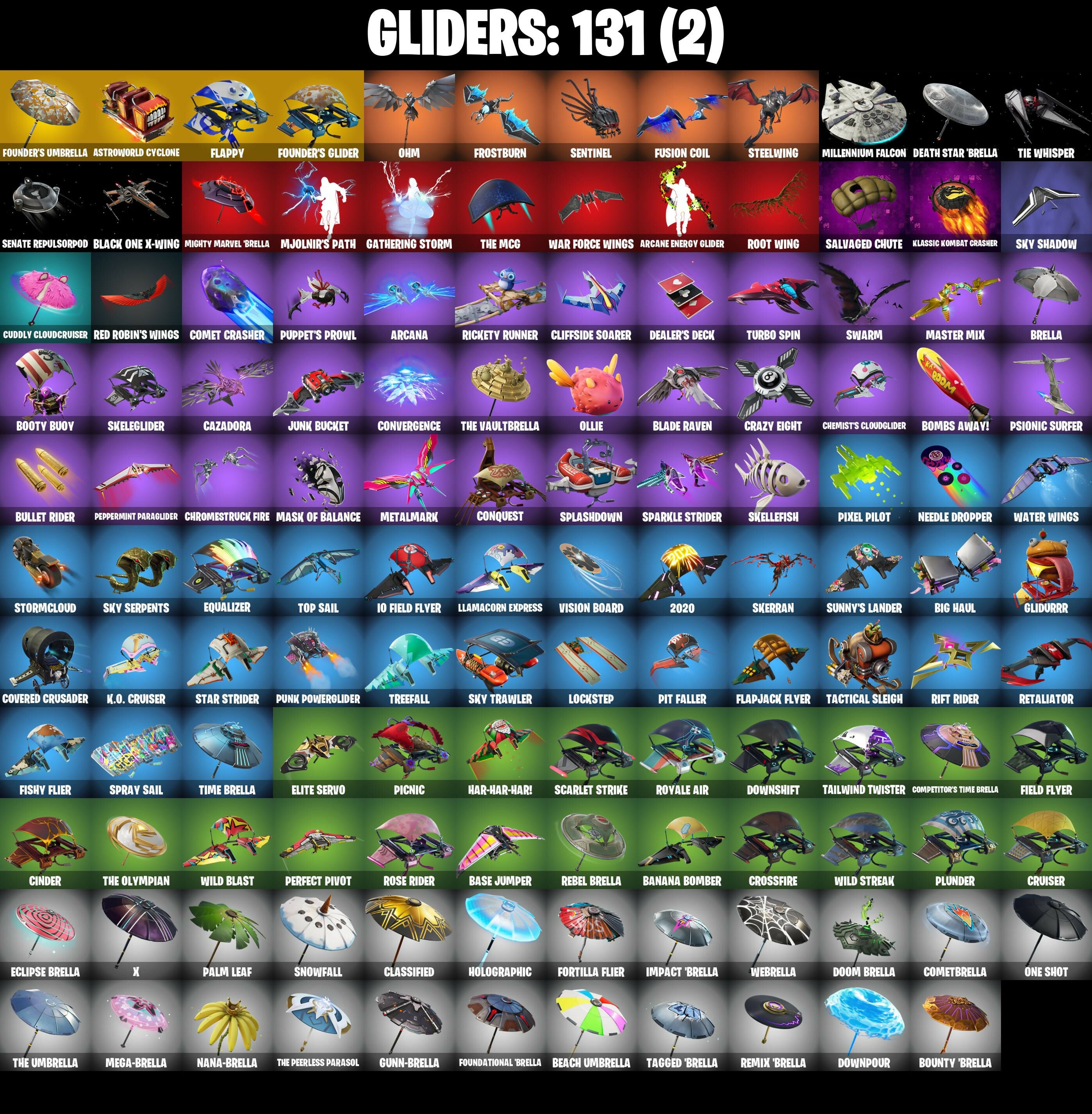 2020, 2020 Kickflip, 6-Carat Cutter, 8-Ball vs Scratch, 999 Knives, A.I.M., Abominable Axe, Adventure Pack, Agent Peely, Air Shredder, Altitude, Ancestral Bloom, Angler Axes, Antidote, Apocalypse Shroud, Aquaman, Aquaman's Trident, Arcana, Arcane Energy Glider, Arctic Adeline, Arroyo Pack, Arthur Curry, Astroworld Cyclone, Atmosphere, Aura, Auto Clutch, B Splat, Back Board, Backstabber, Backtracker, Backup Blades, Ball Bling, Balloon Axe, Banana Bomber, Banana Briefcase, Bananaxe, Bandolette, Bank Shots, Baron's Hoard, Base Jumper, Basecamp Bag, Basic Basher, Bat Royale, Be Seeing You, Beach Umbrella, Beachcomber, Beep Beep, Behold!, Big Haul, Billy Bounce, Birdshot, Birthday Slice, Black One X-Wing, Black Werewolf, Blackheart, Blackheart (Stage 8), Blackout Bag, Blade Bag, Blade Raven, Bladed Bag, Blaze, Blowing Bubbles, Bobo, Bogey Bag, Boing!, Bolt, Bombs Away!, Boobytrapped, Boogie Down, Booty Buoy, Boulder Breakers, Bounty 'Brella, Breakdown, Breakneck, Brella, Brilliant Cutters, Brite Bomber, Brush Your Shoulders, Brutus, Bullet Rider, Bullseye, Bunker Basher, Bunker Jonesy, Bunsen Backburner, Bytes, Bytes (Lone Traveler), C'Mere, Calamity, Calamity Stage 5, Calculated, Call Me, Cameo vs Chic, Carbon Commando, Carbon Pack, Castle Peaks, Cat Flip, Cat's Claw, Catalyst, Catalyst (Overcharged), Cazadora, Chainstick Pack, Chemist's Cloudglider, Chromestruck Fire, Chuck Pack, Cinder, Classified, Clawz Retro, Clean Sweep, Cliffside Soarer, Cloaked Star, Cloud Striker, Cluck Strut, Cobalt, Cobra, Codename E.L.F., Coin Flip, Comet Crasher, Cometbrella, Competitor's Time Brella, Conga, Conquest, Controller, Convergence, Cosmic Cleavers, Count It!, Covered Crusader, Crabby, Crackshot, Crazy Eight, Crescent Shroom, Crossfire, Crowbar, Crowning Achievement, Cruiser, Crystal, Crystal Llama, Cuddly Cloudcruiser, Cursed Marionette, Cyclo Curl, DJ Yonder, Dabstand, Darkest Edge, Deadpool, Dealer's Deck, Death Star 'Brella, Deep Dive, Demi, Diamond Diva, Dire, Disco Fever, Dive Knives, Doctor Doom, Dogg Treat, Doom Brella, Doom Chalice, Doom's Cowl, Downpour, Downshift, Doze Dab, Dragon Stance, Dragon's Claw, Dragoncrest, Dread, Dream Feet, Drift, Drift Stage 5, Driver, Droop, Dusk, Dusk Knight, Dusk Wings, Dying Light, Dynamo, E.L.F. Shield, E.L.I.M., Eclipse Brella, Electric Shredder, Electro Pairing Blades, Electro Shuffle, Electro Swing, Elegant Crowbar, Elevation, Elite Servo, Ember, Ember (Night), Eon Blades, Epic Blade of Floof, Epic Swords of Wonder, Equalizer, Eternal Knight, Eternal Ranker, Eternal Shield, Eternal Voyager, Eternal Voyager (Eternal), Extraterrestrial, Fable, Fabled Cape, Fade, Fallen Love Ranger, Fallen Wings, Fang Saws, Featherweight, Feelin' Jaunty, Felina, Felina's Claw, Feline Fun, Field Flyer, Fierce, Firestarter, Fishstick Janky, Fishy Flier, Fist Bump, Fixer, Flamenco, Flapjack Flyer, Flappy, Flawless, Flippin' Away, Flux, Flux Silvera, Focus, Fortilla Flier, Foundational 'Brella, Founder's Glider, Founder's Umbrella, Free Flow, Frostburn, Frosted Frets, Frosty Globes, Frozen Fishstick, Frozen Nog Ops, Frozen Shroud, Fusion, Fusion Coil, Fusion Orb, Fusion Scythe, Gathering Storm, Gear Specialist Maya, Gentleman's Dab, Get Funky, Ghost Portal, Giddy-Up, Gilded Morphic Blades, Glidorrr, Glitter, Glorious Giftblade, Go Bag, Gold Dagger Pack, Gold Midas, Gold Token, Golden King, Golden Nemesis, Golden Scythe, Golf Clap, Groot, Groot's Sap Axes, Ground Pound, Guiding Glow, Gun Show, Gunn-Brella, Gwenpool's Katanas, Hack & Smash, Hadean Gate, Hammers of Justice, Hand of Lightning, Happy, Har-Har-Har!, Harmonic Axes, Haze, Hello Friend, Hench Hauler, High Caliber, High Five, Highlight Strikers, Holiday Boxy, Hollowhead, Holographic, Hoop Master, Hope Star, Horde's War Wheel, Hot Marat, Hot Pokers, Hot Wings, Howl, Hula Hoopin', Humbug Slicer, Huntress, Hybrid, Hybrid (Stage 4), Hydraulic Wrecker, I Ain't Afraid, I Declare!, IO Field Flyer, Ice Breaker, Ice Cube, Ice King (Gold), Ice Mantle, Ice Scepter, Ice-Blasted Snow Cruncher, Impact 'Brella, Infinite Bloom, Infinite Dab, Iron Man Backplate, It's Go Time!, Jar Buster, Jaywalking, Jennifer Walters, Jet Signals, Josie, Journey vs Hazard, Jules, Jump Jets, Junk Bucket, K.O. Cruiser, Kabag!, Kata-Pack, Keep It Mello, Keyed Up, Kit, Klassic Kombat Crasher, Knight's Treachery, Laguna, Laid Back Shuffle, Last Forever, Lazy Shuffle, Legendary Blade of Insight, Lil Quill, Lil' Black Heart, Lil' Dilly, Lil' Kev, Lil' Prancer, Living Large, Llamacorn Express, Loaded Barrel Bag, Lockpick, Lockstep, Lone Wolf Holster, Love Lock, Low 'N Slow, Lt. Evergreen, Lug Axe, Lunar Defender, Lunarios, Luxe, Luxe (Gold Clothing), Lynx, Lynx (Stage 4 - No Ponytail), Ma-Ya-Hi, Make A Seat, Make It Rain, Marshy Smasher, Mask of Balance, Masked, Master Key, Master Key (Masked), Master Mix, Master Portal, Mean Streak, Mech Axe, Medaxe, Mega-Brella, Meowscles, Meowtooth Plush, Mercurial, Metalmark, Mic Drop, Microbot Mallet, Mighty Marvel 'Brella, Millennium Falcon, Mind Blown, Mini Dogfight, Mini Moon, Mjolnir, Mjolnir's Path, Molten Max Axe, Mouldering Cloak, Mr. Daruma, Mutiny, Mystique, Mystiques Skull, Nailed It, Nana Bath, Nana Cape, Nana Nana, Nana-Brella, Nanner Bashers, Needle Dropper, Nemesis Box, Neon Wings, Night Cloak, Night Kama, Nightshade, Ninja Style, Nyanja's Catpak, Ocean, Ohm, Ol' Woody, Old School, Ollie, One Shot, Onesie, Onesie (Winter), Outlaw's Knife Rack, Outlaw's Whipknives, Overdrive, Padlock, Palette Pack, Palm Leaf, Pandemonium, Paradigm (Reality-659), Party Hips, Paws & Claws, Peace Out, Peely, Peely Whip, Peppermint Paraglider, Peppermint Pick, Perfect Pivot, Perfect Present, Perfect Shadow, Perfect Wings, Permafrost, Picnic, Pineapple Strummer, Pit Faller, Pitch Patroller, Pixel Pilot, Planetary Vibe, Plunder, Point It Out, Poised Playmaker, Pool Party, Powder, Powder (White), Power Claws, Premiere Poms, Prized Llama, Prodigy, Psionic Surfer, Punk Powerglider, Puppet's Prowl, Pursuit, Quicksilver Baton Spear, R3X Tai