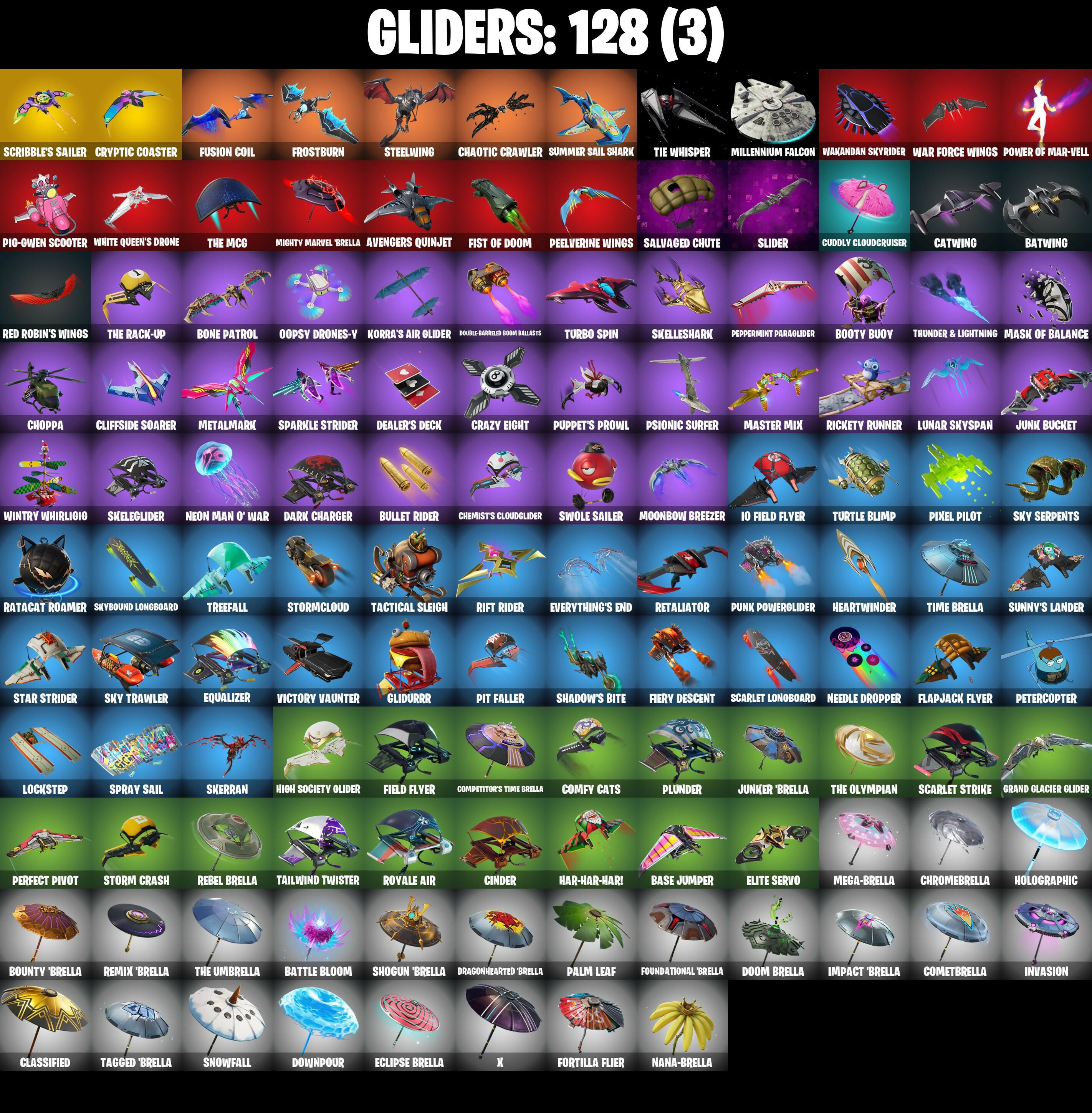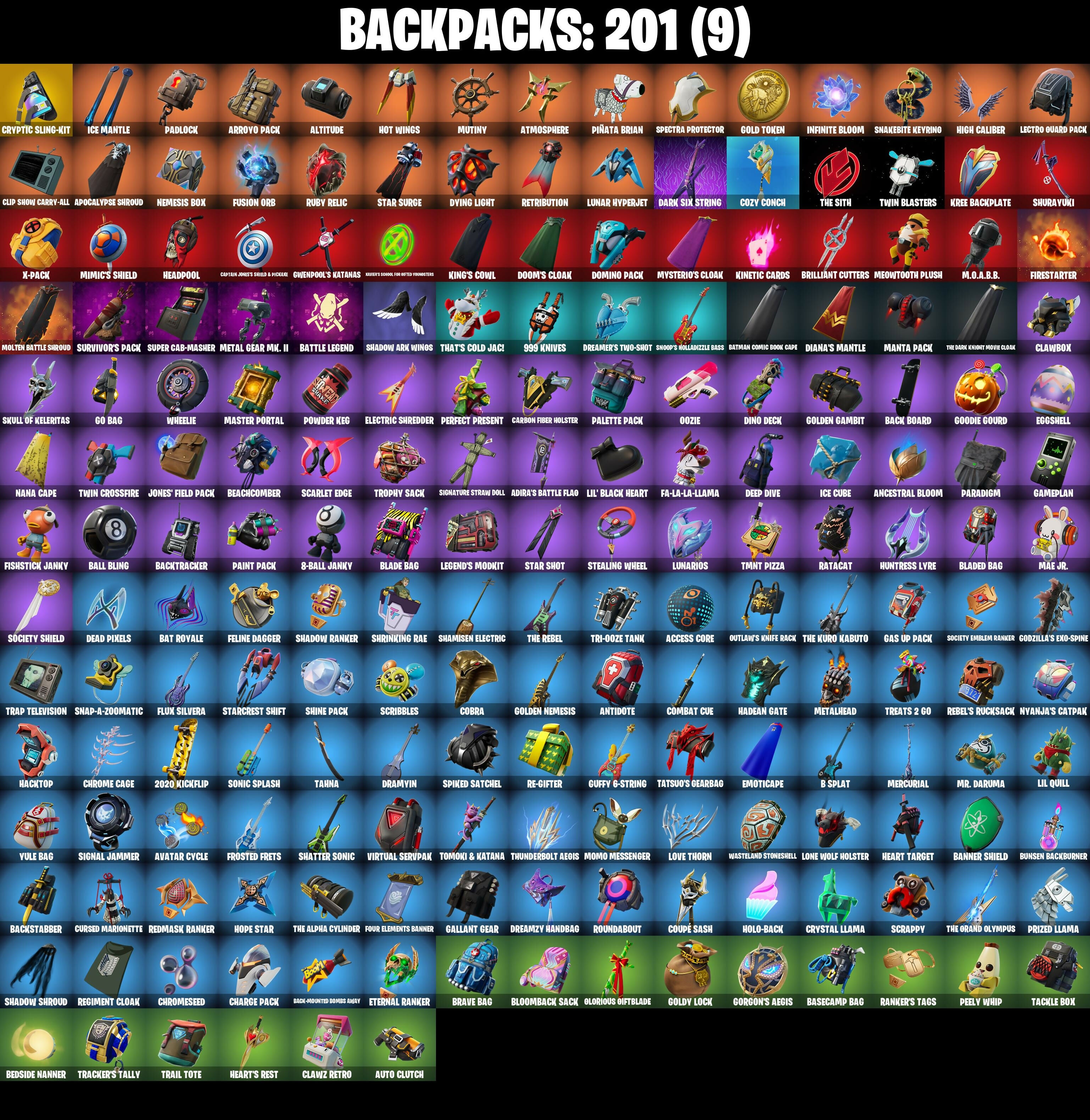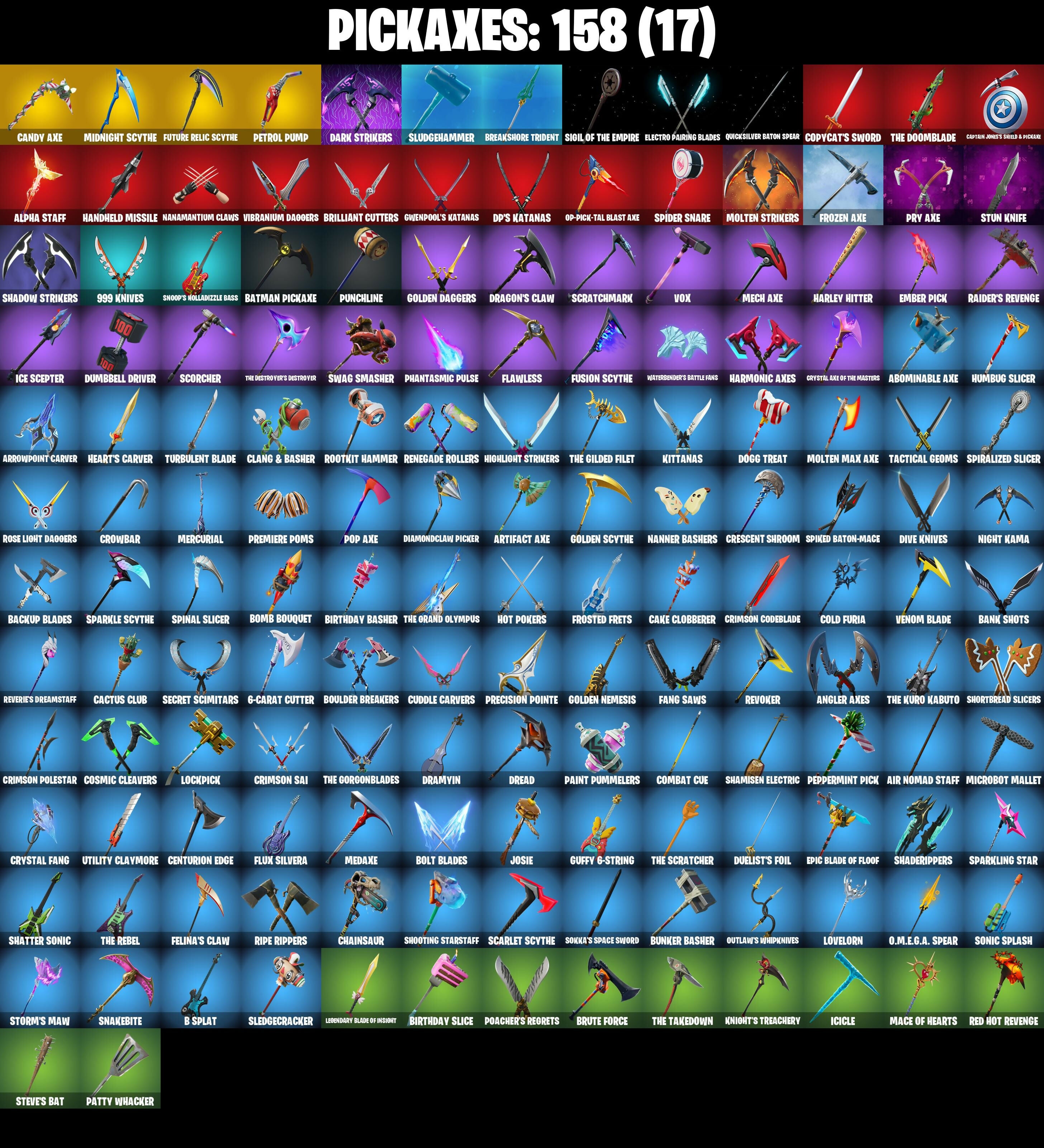 (Snikt!), 1-Ball, 10 Field Flyer, 2020 Kickflip, 6-Carat Cutter, 8-Ball Janky, 8-Ball vs Scratch, 999 Knives, Aang, Aang's Air Sphere, Abominable Axe, Access Core, Adira's Battle Flag, Agent Jones, Air Nomad Staff, Alpha Staff, Altitude, Ancestral Bloom, Angler Axes, Antidote, Aphrodite, Apocalypse Shroud, Archetype, Arctic Adeline, Arrowpoint Carver, Arroyo Pack, Artifact Axe, Atmosphere, Auto Clutch, Avatar Cycle, Avatar State Aang, Avatar's Flourish, Avengers Quinjet, B Splat, Back Board, Back-Mounted Bombs Away, Backstabber, Backtracker, Backup Blades, Balanced, Ball Bling, Bank Shots, Banner Shield, Base Jumper, Basecamp Bag, Bat Royale, Batman Comic Book Cape, Batman Comic Book Outfit, Batman Pickaxe, Battle Bloom, Battle Legend, Batwing, Beachcomber, Bear Hug, Bedside Nanner, Billy, Billy Bounce, Billy's Tricycle, Birthday Basher, Birthday Slice, Black Manta, Black Panther, Blackheart, Blackheart (Stage 8), Blade Bag, Bladed Bag, Blaze, Bloomback Sack, Blowing Bubbles, Boing!, Bolt Blades, Bomb Bouquet, Bone Patrol, Booby Trapped, Booty Buoy, Boulder Breakers, Bounty 'Brella, Brave Bag, Breaking Point, Breakneck, Breakpoint, Breakshore Trident, Brilliant Cutters, Brute Force, Bullet Rider, Bulletproof, Bullseye, Bunker Basher, Bunker Jonesy, Bunny Brawler, Bunsen Backburner, Burning Ambition Valeria, Burnout, Cactus Club, Cake Clobberer, Call Me, Cameo vs Chic, Candy Axe, Cap Kick, Caper, Caper (Bunny), Captain America's Shield & Pickax, Captain Jones's Shield & Pickaxe, Captain Marvel, Carbon Fiber Holster, Card Drop, Cardistry, Cat Flip, Catalyst, Catalyst (Overcharged), Catwing, Centurion, Centurion Edge, Cerberus, Chainsaur, Chalked Up 1-Ball, Chaos Director, Chaotic Crawler, Charge Pack, Chemist's Cloudglider, Choppa, Chrome Cage, Chrome Punk, Chromebrella, Chromeseed, Chun-Li, Cinder, Clang & Basher, Clara, Classified, Clawbox, Clawz Retro, Clean Sweep, Cliffside Soarer, Clip Show Carry-All, Cluck Strut, Cobra, Cold Furia, Combat Cue, Cometbrella, Comfy Cats, Competitor's Time Brella, Conch Call, Conga, Controller Crew, Copycat's Sword, Cosmic Cleavers, Coupe Sash, Cozy Conch, Crazy Eight, Crescent Shroom, Crimson Coderblade, Crimson Polestar, Crimson Sai, Crowbar, Crowning Achievement, Cryptic Coaster, Cryptic Sling-Kit, Crystal Axe Of The Masters, Crystal Fang, Crystal Llama, Cuddle Carvers, Cuddly Cloudcruiser, Cursed Marionette, Cyclops, DP's Katanas, Dabstand, Dance Off, Dark Charger, Dark Power Chord, Dark Six String, Dark Strikers, Dawn Duelist Nisha, Dead Pixels, Deadpool (Pen & Ink), Dealer's Deck, Deep Dab, Deep Dive, Demi, Diamond Diva, Diamond Throne, Diamondclaw Picker, Diana's Mantle, Dino Deck, Dive Knives, Dogg Treat, Domino, Domino Pack, Doom, Doom Brella, Doom's Cloak, Doom's Domain, Double Up, Double-Barreled Boom Ballasts, Downpour, Doze Dab, Dragon Stance, Dragon's Claw, Dragonhearted 'Brella, Dramyin, Dread, Dream Feet, Dreamer's Two-Shot, Dreamzy Handbag, Droop, Duelist's Foil, Dumbbell Driver, Dusk Knight, Dying Light, Dynamo TNTina, Dynamo Tntoon-A, Eclipse Brella, Eggshell, Electric Shredder, Electro Pairing Blades, Elite Servo, Ember, Ember (Night), Ember Pick, Emma Frost, Emoticape, Empty Out Your Pockets, Epic Blade Of Floof, Equalizer, Eternal Ranker, Eternal Voyager, Eternal Voyager (Eternal), Evasive Maneuvers, Everything's End, Extraterrestrial, Fa-La-La-Llama, Face Palm, Fancy Peter Griffin, Fang Saws, Featherweight, Felina, Felina's Claw, Feline Dagger, Field Flyer, Fierce, Fiery Descent, Finger Guns, Firestarter, Fishstick Janky, Fist Bump, Fist Of Doom, Flapjack Flyer, Flawless, Flippin' Away, Flux Silvera, Foil Flex, Formation Fighter, Fortilla Flier, Foundational 'Brella, Four Elements Banner, Free Flow, Frostburn, Frosted Frets, Frozen Axe, Fusion, Fusion Coil, Fusion Orb, Fusion Scythe, Fusion! Hah!!, Future Relic Scythe, Gallant Gear, Gambit, Gameplan, Gas Up Pack, Get Funky, Get Griddy, Glidurrr, Glorious Giftblade, Go Bag, Godzilla's Exo-Spine, Gold Token, Golden Daggers, Golden Gambit, Golden Nemesis, Golden Scythe, Goldy Lock, Golf Clap, Good Game, Well Played, Goodie Gourd, Gorgon's Aegis, Grand Glacier Glider, Ground Pound, Guffy 6-String, Gwen-Step, Gwenpool, Gwenpool's Katanas, Hacktop, Hadean Gate, Hana, Handheld Missile, Har-Har-Har!, Harley (Always Fantabulous), Harley Hitter, Harley Quinn, Harmonic Axes, Have A Seat, Haxsaúr, Headpool, Heart Target, Heart's Carver, Heart's Rest, Heart-Stopper, Heartwinder, Hellfire Dance, Hello Friend, High Caliber, High Five, High Society Glider, Highlight Strikers, Holiday Boxy, Holo-Back, Holographic, Hoop Master, Hope, Hope Star, Hot Pokers, Hot Wings, Hula Hoopin', Humbug Slicer, Huntress Lyre, Hybrid, Hybrid (Stage 4), I'm A Mystery, Ice Cube, Ice King (Gold), Ice Mantle, Ice Scepter, Icicle, Impact 'Brella, Imperial March, Infinite Bloom, Invasion, Iris, It Is Finished, Jaywalking, Jet Signals, Jones' Field Pack, Josie, Journey vs Hazard, Jump Jets, Jungle Scout, Junk Bucket, Junker 'Brella, Keep It Mello, Kinetic Cards, King's Cowl, Kittanas, Knife Sharpener, Knight's Treachery, Korra, Korra's Air Glider, Kree Backplate, Laid Back Shuffle, Lara Croft, Lectro Guard Pack, Legend's Modkit, Legendary Blade Of Insight, Lil Quill, Lil' Black Heart, Lil' Prancer, Lina Scorch, Lock It Up, Lockpick, Lockstep, Lone Wolf Holster, Love Thorn, Lovelorn, Lt. Evergreen, Lunar Hyperjet, Lunar Skyspan, Lunarios, Luxe, Luxe (Gold Clothing), Lynx, Lynx (Stage 4 - No Ponytail), M.O.A.B.B., Mace Of Hearts, Mae Jr., Make A Seat, Manta Pack, Marigold, Marsh Walk, Mask Of Balance, Master Chief (Matte Black), Master Key, Master Key (Masked), Master Mix, Master Portal, Mech Axe, Medaxe, Medusa, Mega-Brella, Meowdas, Meowtooth Plush, Mercurial, Metal Gear Mk. II, Metalhead, Metalmark, Mic Drop, Microbot Mallet, Midfield Maestro, Midnight Scythe, Midnight Skye, Mighty Marvel 'Brella, Millennium Falcon, Mimic's Shield, Min-Joon, Molten Battle Shroud, Molten Max Axe, Molten Omen, Molten Strikers, Momo Messeng