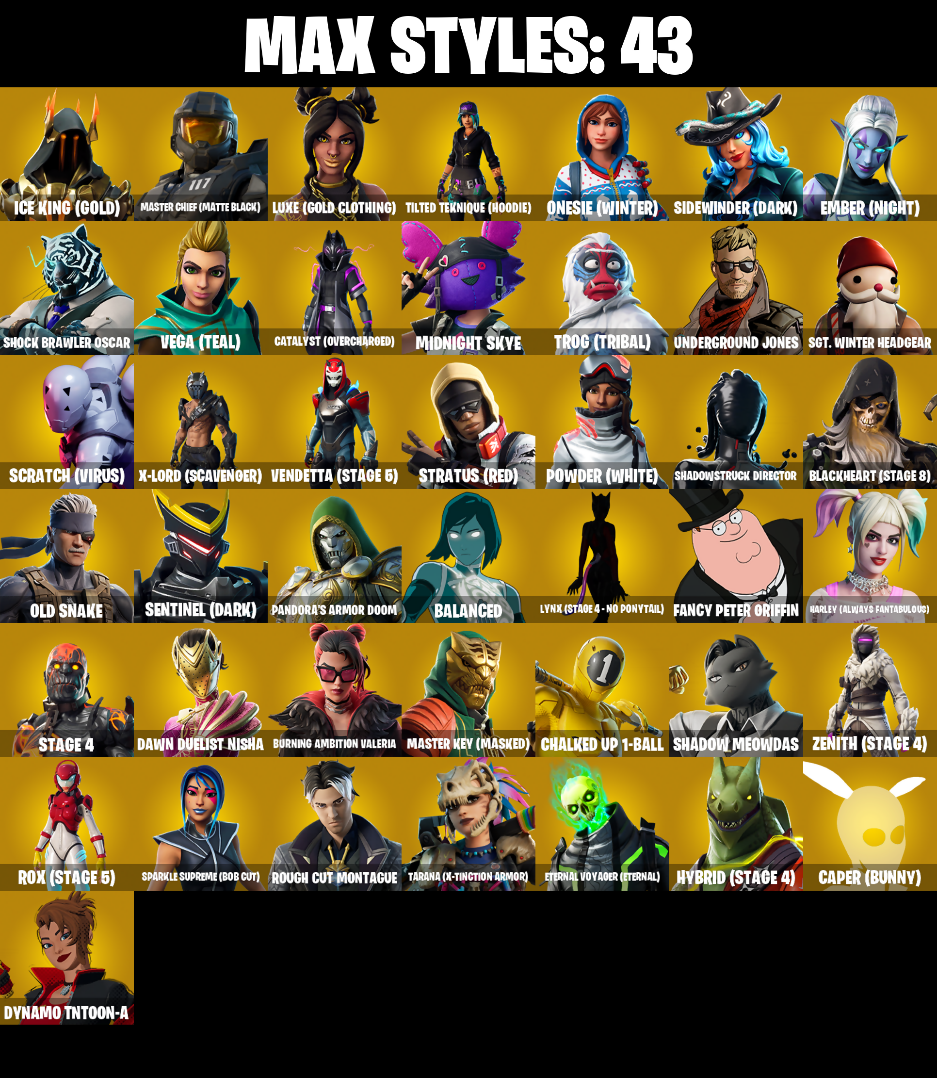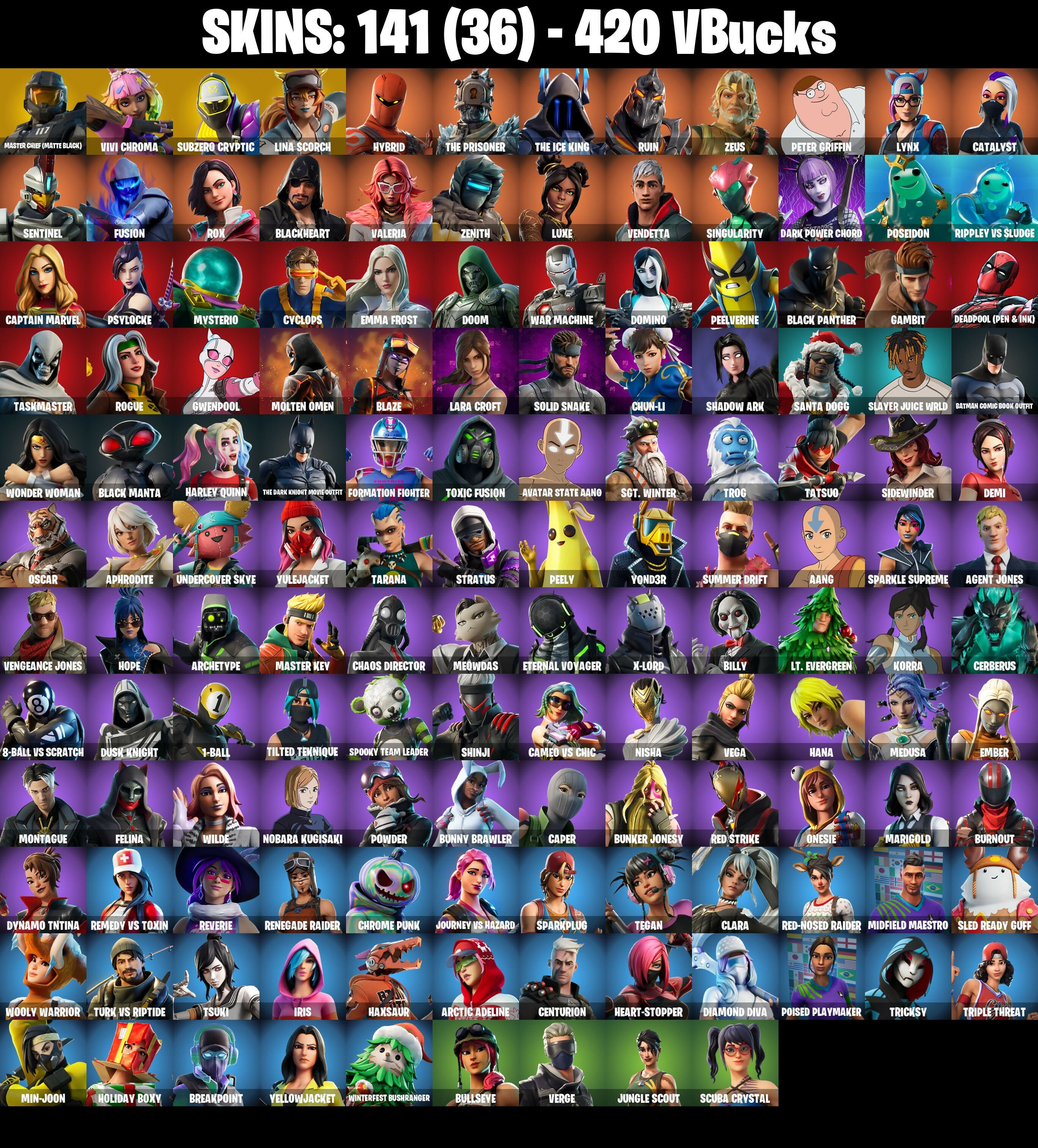 PC/PSN/XBOX |141 skins | Chun-Li | Lara Croft | Master Chief (Matte Black) | Candy Axe | The Ice King | Luxe | Peely | Vendetta | Fusion | #B880
