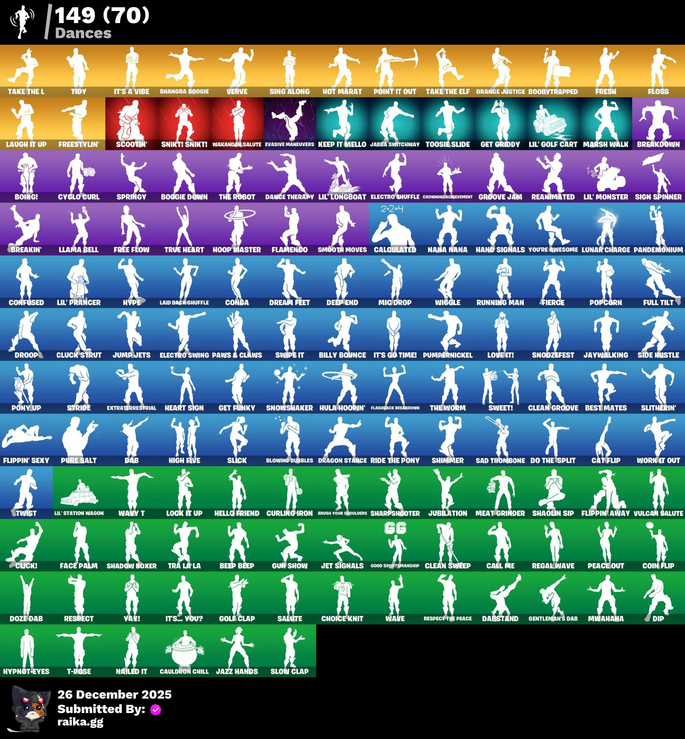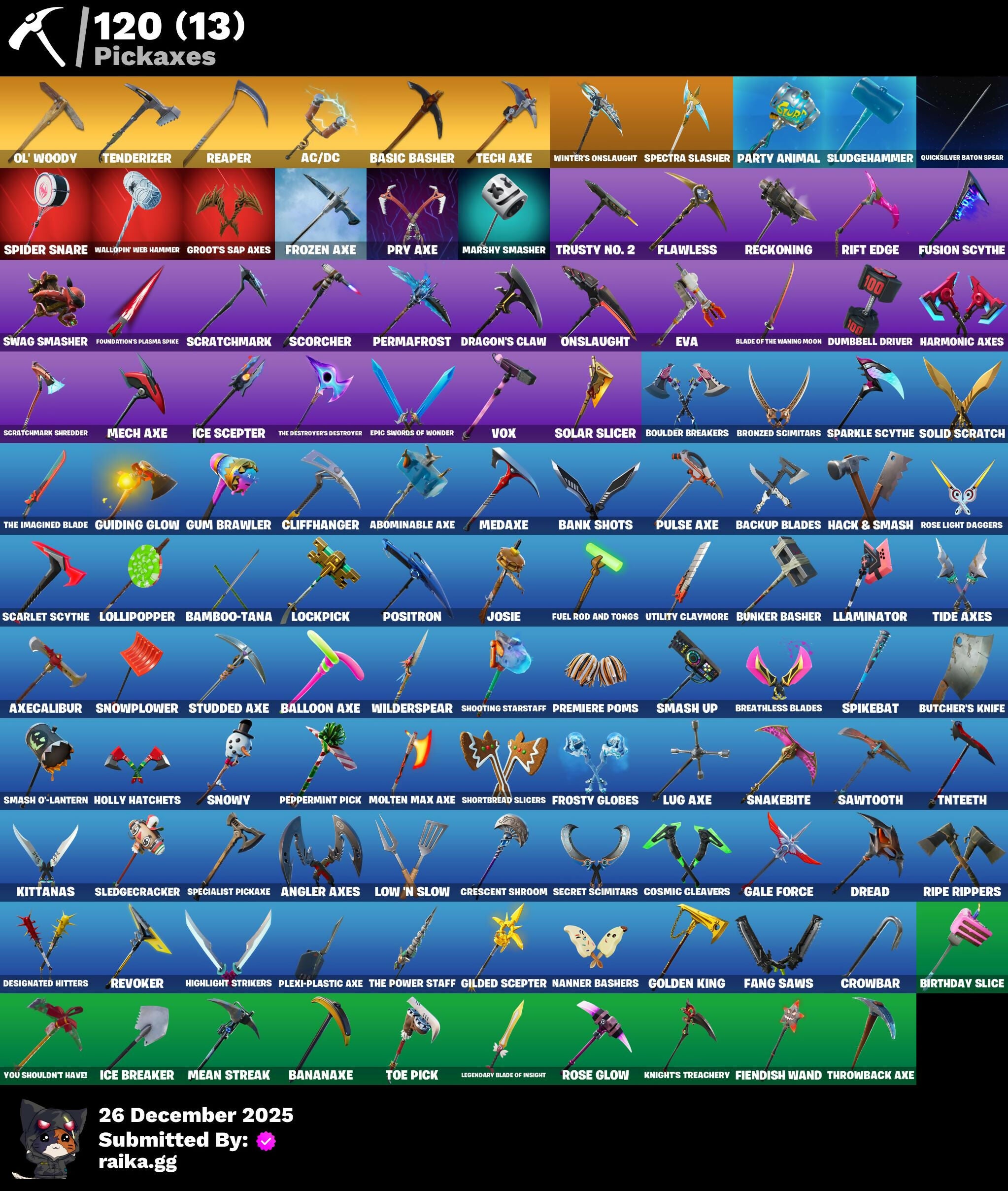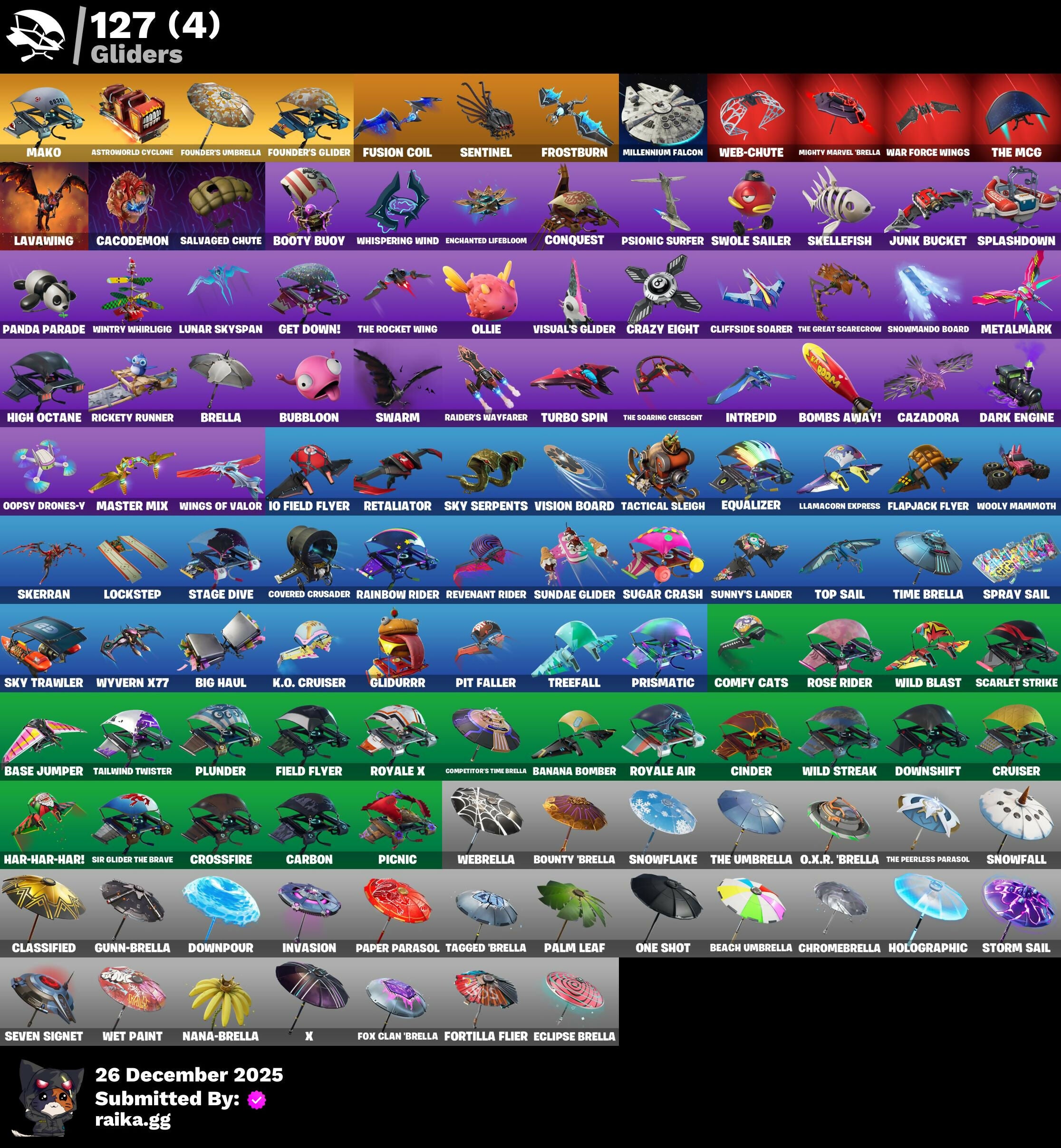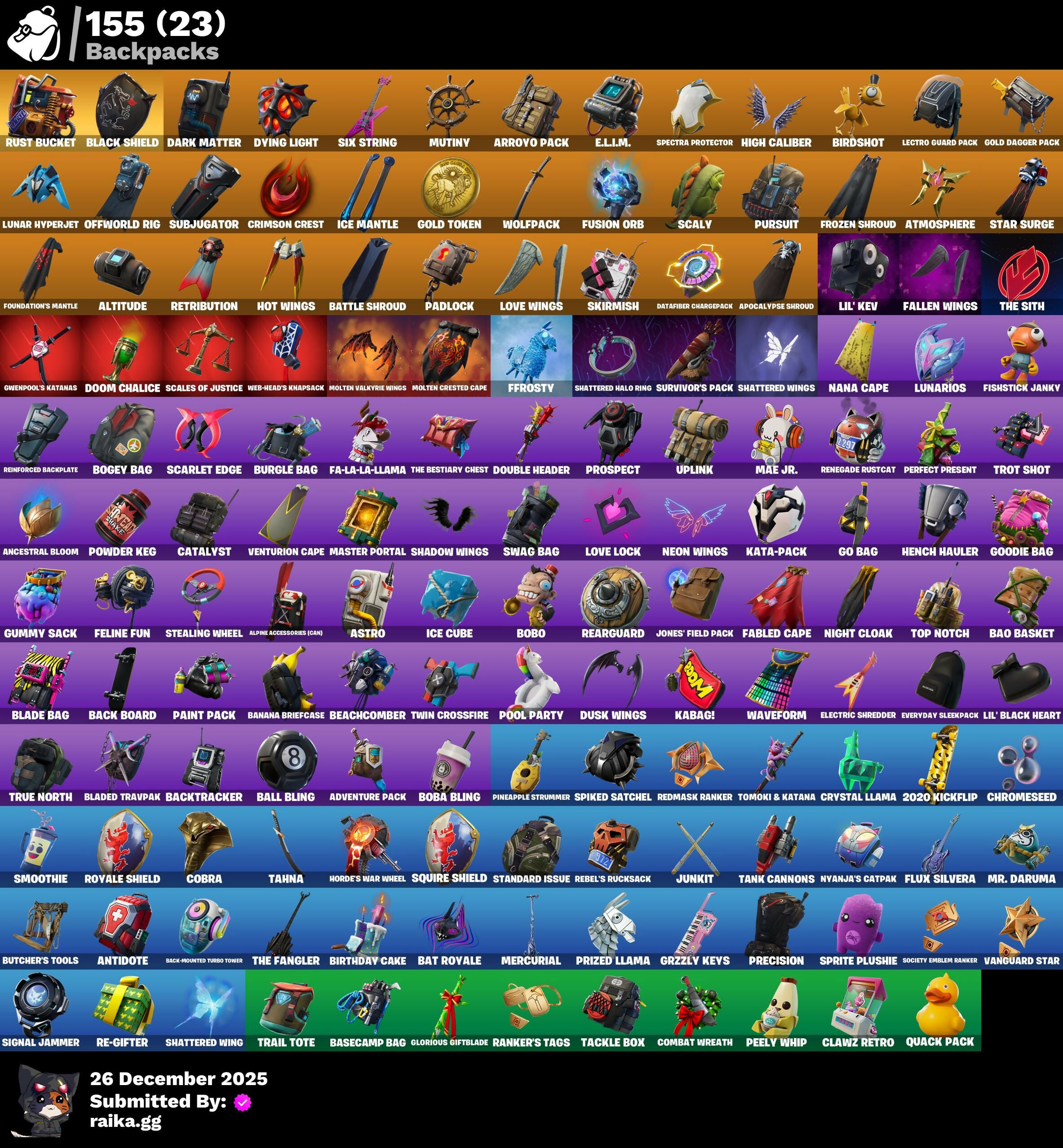 2020 Kickflip, 8-Ball vs Scratch, A.I.M., AC/DC, Abominable Axe, Adventure Pack, Agent Jones, Agent Peely, Alpine Accessories (Can), Alpine Ace (Can), Altitude, Ancestral Bloom, Angler Axes, Antidote, Apocalypse Shroud, Arctic Adeline, Arroyo Pack, Astro, Astroworld Cyclone, Atmosphere, Axecalibur, Back Board, Back-Mounted Turbo Tower, Backtracker, Backup Blades, Ball Bling, Balloon Axe, Bamboo-Tana, Banana Bomber, Banana Briefcase, Bananaxe, Bank Shots, Bao Basket, Bao Bros, Base Jumper, Basecamp Bag, Basic Basher, Bat Royale, Battle Shroud, Battlehawk, Beach Umbrella, Beachcomber, Beep Beep, Best Mates, Bhangra Boogie, Big Haul, Billy Bounce, Birdshot, Birthday Cake, Birthday Slice, Black Knight, Black Shield, Blackheart, Blade Bag, Blade of the Waning Moon, Bladed Travpak, Blowing Bubbles, Blue Squire, Boba Bling, Bobo, Bogey Bag, Boing!, Bombs Away!, Boobytrapped, Boogie Down, Booty Buoy, Boulder Breakers, Bounty 'Brella, Brawler, Breakdown, Breakin', Breakpoint, Breathless Blades, Brella, Brite Bomber, Bronzed Scimitars, Brush Your Shoulders, Brutus, Bubbloon, Bunker Basher, Bunker Jonesy, Burgle Bag, Butcher's Knife, Butcher's Tools, Cacodemon, Calamity, Calculated, Call Me, Cameo vs Chic, Carbide, Carbon, Cat Flip, Catalyst, Cauldron Chill, Cazadora, Choice Knit, Chrome Punk, Chromebrella, Chromeseed, Cinder, Classified, Clawz Retro, Clean Groove, Clean Sweep, Click!, Cliffhanger, Cliffside Soarer, Cloaked Shadow, Cluck Strut, Cobalt, Cobra, Coin Flip, Combat Wreath, Comfy Cats, Commando, Competitor's Time Brella, Confused, Conga, Conquest, Cosmic Cleavers, Covered Crusader, Crackshot, Crazy Eight, Crescent Shroom, Crimson Crest, Crossfire, Crowbar, Cruiser, Crystal Llama, Curling Iron, Cyclo Curl, DJ Yonder, Dab, Dabstand, Dance Therapy, Dark Engine, Dark Matter, Dark Voyager, Datafiber Chargepack, Deadpool, Deep End, Demi, Designated Hitters, Dip, Dire, Do The Split, Doom Chalice, Double Header, Downpour, Downshift, Doze Dab, Dragon Stance, Dragon's Claw, Dread, Dream, Dream Feet, Drift, Droop, Dumbbell Driver, Dusk, Dusk Wings, Dying Light, E.L.I.M., Eclipse Brella, Electric Shredder, Electro Shuffle, Electro Swing, Elite Agent, Ember, Enchanted Lifebloom, Enforcer, Epic Swords of Wonder, Equalizer, Eva, Evasive Maneuvers, Everyday Sleekpack, Extraterrestrial, Fa-La-La-Llama, Fable, Fabled Cape, Face Palm, Fade, Fallen Love Ranger, Fallen Wings, Fang Saws, Fashion Banshee, Feline Fun, Ffrosty, Field Flyer, Fiendish Wand, Fierce, Finesse Finisher, Fishstick Janky, Flamenco, Flapjack Flyer, Flawless, Flippin' Away, Flippin' Sexy, Floss, Flux Silvera, Fortilla Flier, Foundation's Mantle, Foundation's Plasma Spike, Founder's Glider, Founder's Umbrella, Fox Clan 'Brella, Free Flow, Freestylin', Fresh, Frostburn, Frosty Globes, Frozen Axe, Frozen Shroud, Fuel Rod and Tongs, Full Tilt, Fusion, Fusion Coil, Fusion Orb, Fusion Scythe, Gale Force, Gear Specialist Maya, Gentleman's Dab, Get Down!, Get Funky, Get Griddy, Giddy-Up, Gilded Scepter, Glidurrr, Glorious Giftblade, Go Bag, Gold Dagger Pack, Gold Midas, Gold Token, Golden King, Golf Clap, Good Sportsmanship, Goodie Bag, Groot's Sap Axes, Groove Jam, Grzzly Keys, Guiding Glow, Gum Brawler, Gumbo, Gummy Sack, Gun Show, Gunn-'Brella, Gwenpool's Katanas, Hack & Smash, Hand Signals, Har-Har-Har!, Harlowe, Harmonic Axes, Haven, Heart Sign, Hello Friend, Hench Hauler, High Caliber, High Five, High Octane, Highlight Strikers, Holly Hatchets, Holographic, Hoop Master, Horde's War Wheel, Hot Marat, Hot Wings, Hula Hoopin', Huntress, Hybrid, Hype, Hypnot-Eyes, IO Field Flyer, Ice Breaker, Ice Cube, Ice Mantle, Ice Scepter, Intrepid, Invasion, It's A Vibe, It's Go Time!, It's... You?, Jabba Switchway, Jaywalking, Jazz Hands, Jet Signals, Jolly Jammer, Jones' Field Pack, Josie, Journey vs Hazard, Jubilation, Jump Jets, Jumpshot, Jungle Scout, Junk Bucket, Junkit, K.O. Cruiser, Kabag!, Kata-Pack, Keep It Mello, Kittanas, Knight's Treachery, Krisabelle, Laguna, Laid Back Shuffle, Lara Croft, Laugh It Up, Lavawing, Lectro Guard Pack, Legendary Blade of Insight, Lil Split, Lil' Black Heart, Lil' Golf Cart, Lil' Kev, Lil' Longboat, Lil' Monster, Lil' Prancer, Lil' Station Wagon, Llama Bell, Llamacorn Express, Llaminator, Lock It Up, Lockpick, Lockstep, Lollipopper, Love It!, Love Lock, Love Ranger, Love Wings, Low 'n Slow, Lt. Evergreen, Lt. John Llama, Lug Axe, Lunar Charge, Lunar Hyperjet, Lunar Skyspan, Lunarios, Luxe, Lynx, Mae Jr., Mako, Marsh Walk, Marshy Smasher, Master Key, Master Mix, Master Portal, Mean Streak, Meat Grinder, Mech Axe, Medaxe, Meowscles, Mercurial, Metalmark, Mic Drop, Mighty Marvel 'Brella, Millennium Falcon, Mission Specialist, Molten Battle Hound, Molten Crested Cape, Molten Max Axe, Molten Valkyrie, Molten Valkyrie Wings, Monarch, Moonwalker, Mr. Daruma, Munitions Expert, Munitions Major, Mutiny, Mwahaha, Nailed It, Nana Cape, Nana Nana, Nana-Brella, Nanner Bashers, Neon Wings, Night Cloak, Nightshade, Nog Ops, Nyanja's Catpak, O.X.R. 'Brella, Ocean, Offworld Rig, Ol' Woody, Ollie, Omega (Stage 5), Omegarok, Omen, One Shot, Onesie, Onslaught, Oopsy Drones-V, Orange Justice, Padlock, Paint Pack, Palm Leaf, Panda Parade, Pandemonium, Paper Parasol, Party Animal, Paws & Claws, Peace Out, Peely, Peely Whip, Peppermint Pick, Perfect Present, Permafrost, Picnic, Pig The Butcher, Pineapple Strummer, Pit Faller, Plexi-Plastic Axe, Plunder, Point It Out, Poised Playmaker, Polar Peely, Pony Up, Pool Party, Popcorn, Positron, Powder, Powder Keg, Power Chord, Precision, Premiere Poms, Prismatic, Prized Llama, Prospect, Pry Axe, Psionic Surfer, Pulse Axe, Pumpernickel, Pure Salt, Pursuit, Quack Pack, Quicksilver Baton Spear, Ragnarok, Raider's Wayfarer, Rainbow Rider, Ranker's Tags, Rapscallion, Re-Gifter, Reanimated, Reaper, Rearguard, Rebel's Rucksack, Reckoning, Recon Specialist, Redline, Redmask Ranker, Regal Wave, Reinforced Backplate, Remedy vs Toxin, Renegade Lynx, Renegade Rustcat, Respect, Respect The Peace, Retaliator, R
