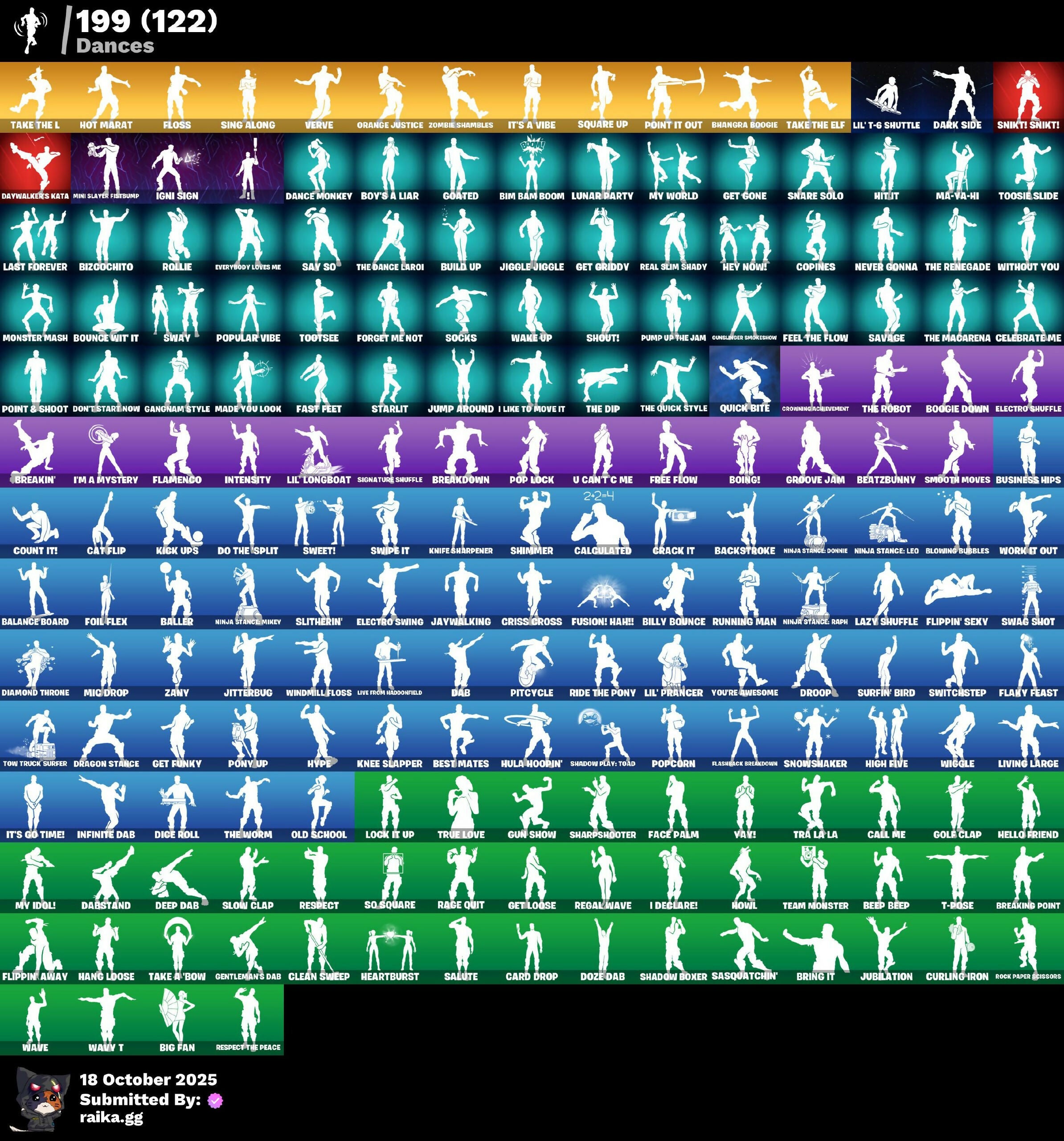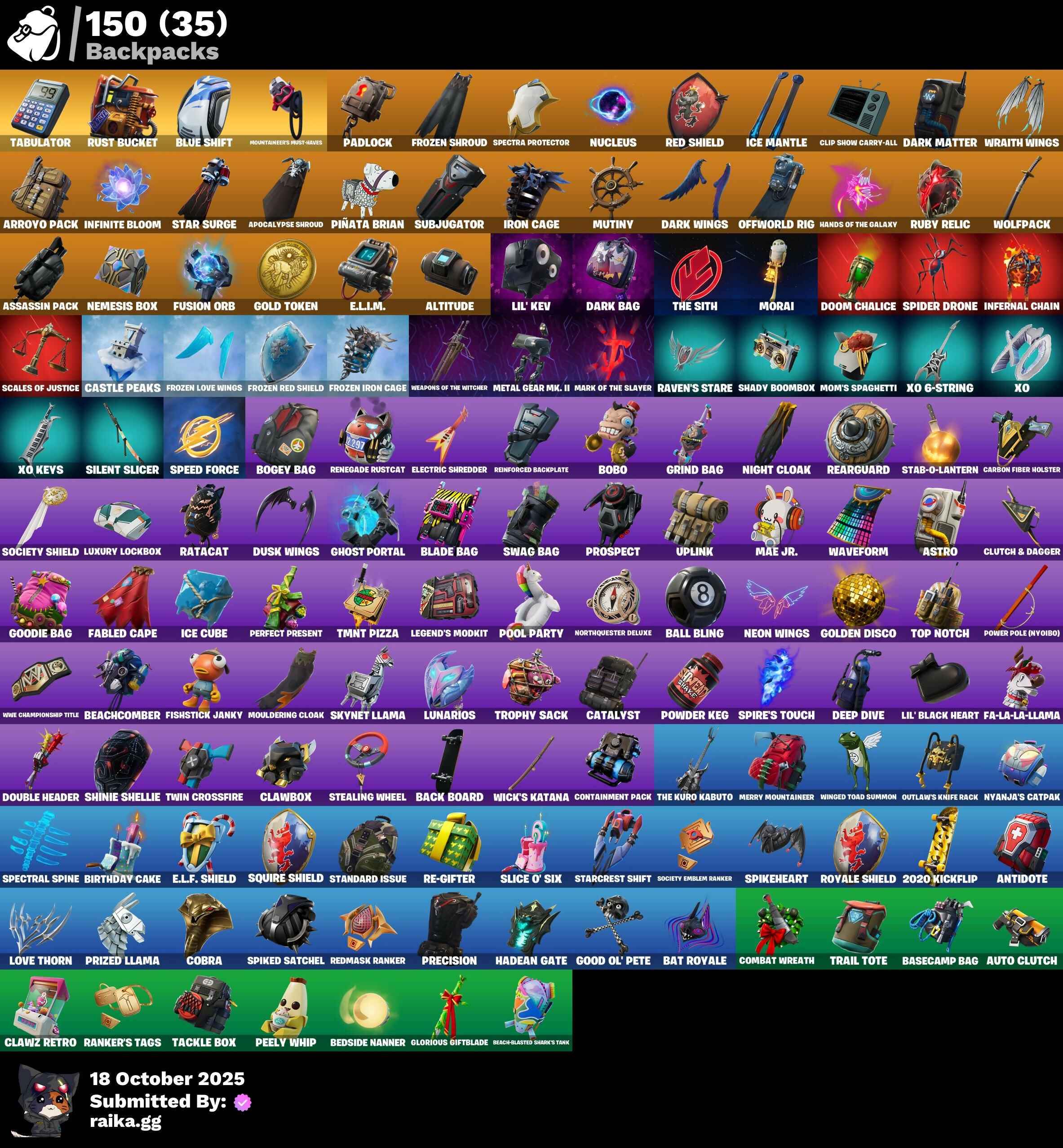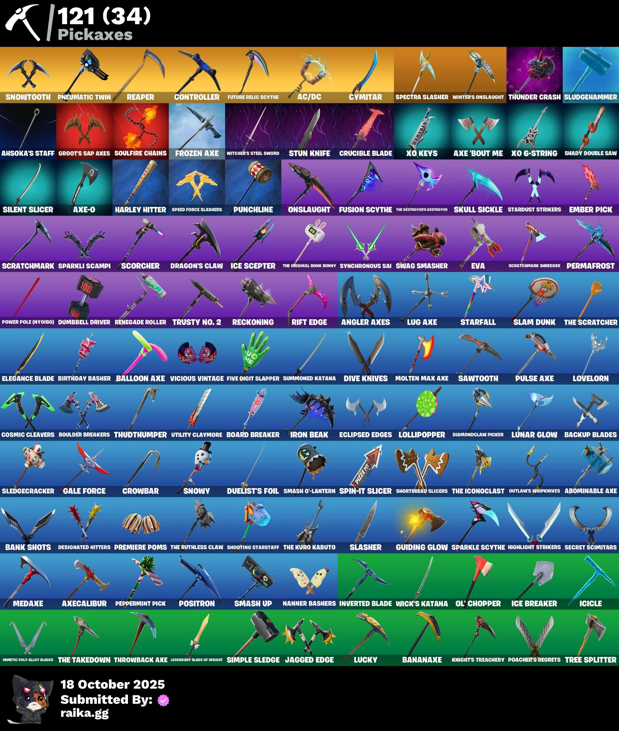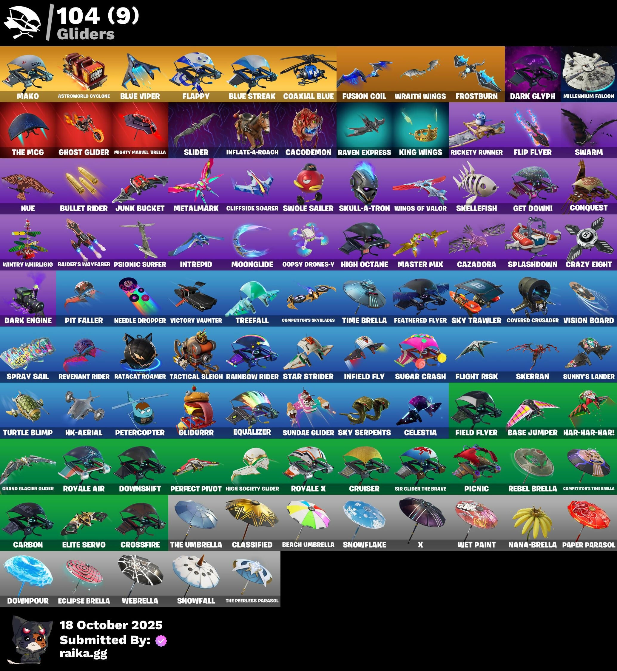 2020 Kickflip, 8-Ball Vs Scratch, A.I.M., Abominable Axe, Ac/Dc, Ahsoka Tano, Ahsoka's Staff, Altitude, Angler Axes, Antidote, Antonia, Apocalypse Shroud, Arctic Adeline, Arroyo Pack, Assassin Pack, Astro, Astroworld Cyclone, Auto Clutch, Axe 'Bout Me, Axe-O, Axecalibur, Back Board, Backstroke, Backup Blades, Balance Board, Ball Bling, Baller, Balloon Axe, Bananaxe, Bank Shots, Base Jumper, Basecamp Bag, Bat Royale, Battlehawk, Beach Umbrella, Beach-Blasted Shark's Tank, Beachcomber, Beatzbunny, Bedside Nanner, Beep Beep, Best Mates, Bhangra Boogie, Big Fan, Billy Bounce, Bim Bam Boom, Birthday Basher, Birthday Cake, Bizcochito, Blackheart, Blade Bag, Blizzard Bomber, Blowing Bubbles, Blue Shift, Blue Squire, Blue Streak, Blue Striker, Blue Team Leader, Blue Viper, Board Breaker, Bobo, Bogey Bag, Boing!, Boogie Down, Boulder Breakers, Bounce Wit It, Boy's A Liar, Breakdown, Breakin', Breaking Point, Brilliant Striker, Bring It, Brite Bomber, Build Up, Bullet Rider, Business Hips, Cacodemon, Calamity, Calculated, Call Me, Cameo Vs Chic, Carbide, Carbon, Carbon Fiber Holster, Card Drop, Castle Peaks, Cat Flip, Catalyst, Cazadora, Celebrate Me, Celestia, Clash, Classified, Clawbox, Clawz Retro, Clean Sweep, Cliffside Soarer, Clip Show Carry-All, Clutch & Dagger, Coaxial Blue, Cobalt, Cobra, Codename E.L.F., Combat Wreath, Competitor's Skyblades, Competitor's Time Brella, Conquest, Containment Pack, Controller, Copines, Cosmic Cleavers, Counselor Smokeshow, Count It!, Covered Crusader, Crack It, Crazy Eight, Crimson Elite, Criss Cross, Crossfire, Crowbar, Crowning Achievement, Crucible Blade, Cruiser, Cryptic, Curling Iron, Cymitar, DJ Yonder, Dab, Dabstand, Dance Monkey, Dark Bag, Dark Bomber, Dark Engine, Dark Glyph, Dark Matter, Dark Side, Dark Voyager, Dark Wings, Daywalkers' Kata, Deep Dab, Deep Dive, Designated Hitters, Diamond Throne, Diamondclaw Picker, Dice Roll, Dire, Dive Knives, Do The 'Split, Don't Start Now, Doom Chalice, Doom Slayer, Double Header, Downpour, Downshift, Doze Dab, Dragon Stance, Dragon's Claw, Drift, Droop, Duelist's Foil, Dumbbell Driver, Dusk, Dusk Wings, Dusty, E.L.F. Shield, E.L.I.M., Eclipse Brella, Eclipsed Edges, Electric Shredder, Electro Shuffle, Electro Swing, Elegance Blade, Elite Agent, Elite Servo, Ember Pick, Enforcer, Equalizer, Eva, Everybody Loves Me, Fa-La-La-Llama, Fable, Fabled Cape, Face Palm, Fast Feet, Feathered Flyer, Feel The Flow, Field Flyer, Fish Thicc, Fishstick Janky, Five Digit Slapper, Flaky Feast, Flamenco, Flappy, Flashback Breakdown, Flight Risk, Flip Flyer, Flippin' Away, Flippin' Sexy, Floss, Foil Flex, Forget Me Not, Free Flow, Frostburn, Frozen Axe, Frozen Fishstick, Frozen Iron Cage, Frozen Love Ranger, Frozen Love Wings, Frozen Nog Ops, Frozen Raven, Frozen Red Knight, Frozen Red Shield, Frozen Shroud, Funk Ops, Fusion, Fusion Coil, Fusion Orb, Fusion Scythe, Fusion! Hah!, Future Relic Scythe, Galaxy Grappler, Galaxy Scout, Gale Force, Gangnam Style, Gentleman's Dab, Geralt Of Rivia, Get Down!, Get Funky, Get Gone, Get Griddy, Get Loose, Ghost Glider, Ghost Portal, Ghost Rider, Giddy-Up, Glidurrr, Glorious Giftblade, Goated, Gold Token, Golden Disco, Golf Clap, Good Ol' Pete, Goodie Bag, Grand Glacier Glider, Grind Bag, Groot's Sap Axes, Groove Jam, Guff Gringle, Guiding Glow, Gun Show, HK-Aerial, Hadean Gate, Hands Of The Galaxy, Hang Loose, Har-Har-Har!, Harley Hitter, Harley Quinn, Heartburst, Hello Friend, Hey Now!, High Five, High Octane, High Society Glider, Highlight Strikers, Hit It, Holiday Boxy, Hollowhead, Hope, Hot Marat, Howl, Hula Hoopin', Huntress, Hybrid, Hype, I Declare!, I Like To Move It, I'm A Mystery, Ice Breaker, Ice Cube, Ice Mantle, Ice Scepter, Icicle, Igni Sign, Infernal Chain, Infield Fly, Infinite Bloom, Infinite Dab, Inflate-A-Roach, Intensity, Intrepid, Inverted Blade, Iron Beak, Iron Cage, It's A Vibe, It's Go Time!, Jagged Edge, Jaywalking, Jiggle Jiggle, Jitterbug, John Cena, John Wick, Journey Vs Hazard, Jubilation, Jump Around, Jumpshot, Junk Bucket, Kado Thorne, Karve, Khaby Lame, Kick Ups, King Wings, Knee Slapper, Knife Sharpener, Knight's Treachery, Last Forever, Lazy Shuffle, Legend's Modkit, Legendary Blade Of Insight, Lil Split, Lil' Black Heart, Lil' Kev, Lil' Longboat, Lil' Prancer, Lil' T-6 Shuttle, Live From Madisonfield, Living Large, Lock It Up, Lollipopper, Love Thorn, Lovelorn, Lt. Evergreen, Lucky, Lug Axe, Lumi Jellie, Lunar Glow, Lunar Party, Lunarios, Luxury Lockbox, Lynx, Ma-Va-Hi, Made You Look, Mae, Mae Jr., Mako, Marius, Mark Of The Slayer, Marshall Never More, Massai, Master Mix, Medaxe, Merry Mountaineer, Metal Gear Mk. II, Metalmark, Mic Drop, Michael Myers, Mighty Marvel 'Brella, Millennium Falcon, Mina Park, Mini Slayer Fistbump, Mission Specialist, Molten Max Axe, Mom's Spaghetti, Monster Mash, Montague, Moonglide, Moonwalker, Morai, Mouldering Cloak, MrBeast, Mutiny, My Idol, My World, Nana-Brella, Nanner Bashers, Needle Dropper, Nemesis Box, Neon Wings, Never Gonna, Night Cloak, Nightshade, Ninja Stance: Donnie, Ninja Stance: Leo, Ninja Stance: Mikey, Ninja Stance: Raph, Nisha, Nitelite, Nog Ops, Nolan Chance, Northquester Deluxe, Nucleus, Nue, Nyanja's Catpak, Offworld Rig, Ol' Chopper, Old School, Omega, Omegarok, Onesie, Onslaught, Oopsy Drones-V, Orange Justice, Oscar, Outlaw's Knife Rack, Outlaw's Whipknives, Padlock, Paper Parasol, Peely Whip, Peppermint Pick, Perfect Pivot, Perfect Present, Permafrost, Peter Griffin, Petercopter, Picnic, Piper Pace, Pit Faller, Pitcycle, Piñata Brian, Pneumatic Twin, Poacher's Regrets, Point & Shoot, Point It Out, Pony Up, Pool Party, Pop Lock, Popcorn, Popular Vibe, Positron, Powder, Powder Keg, Power Pole (Nyoibo), Precision, Premiere Poms, Prized Llama, Prodigy, Prospect, Psionic Surfer, Pulse Axe, Pump Up The Jam, Punchline, Quick Bite, Rage Quit, Ragnarok, Raider's Wayfarer, Rainbow Rider, Ranker's Tags, Rap Boy, Ratacat, Ratacat Roamer, Ravage, Raven, Raven Express, Raven's Stare, Re-Gifter, Real Slim Shady, R